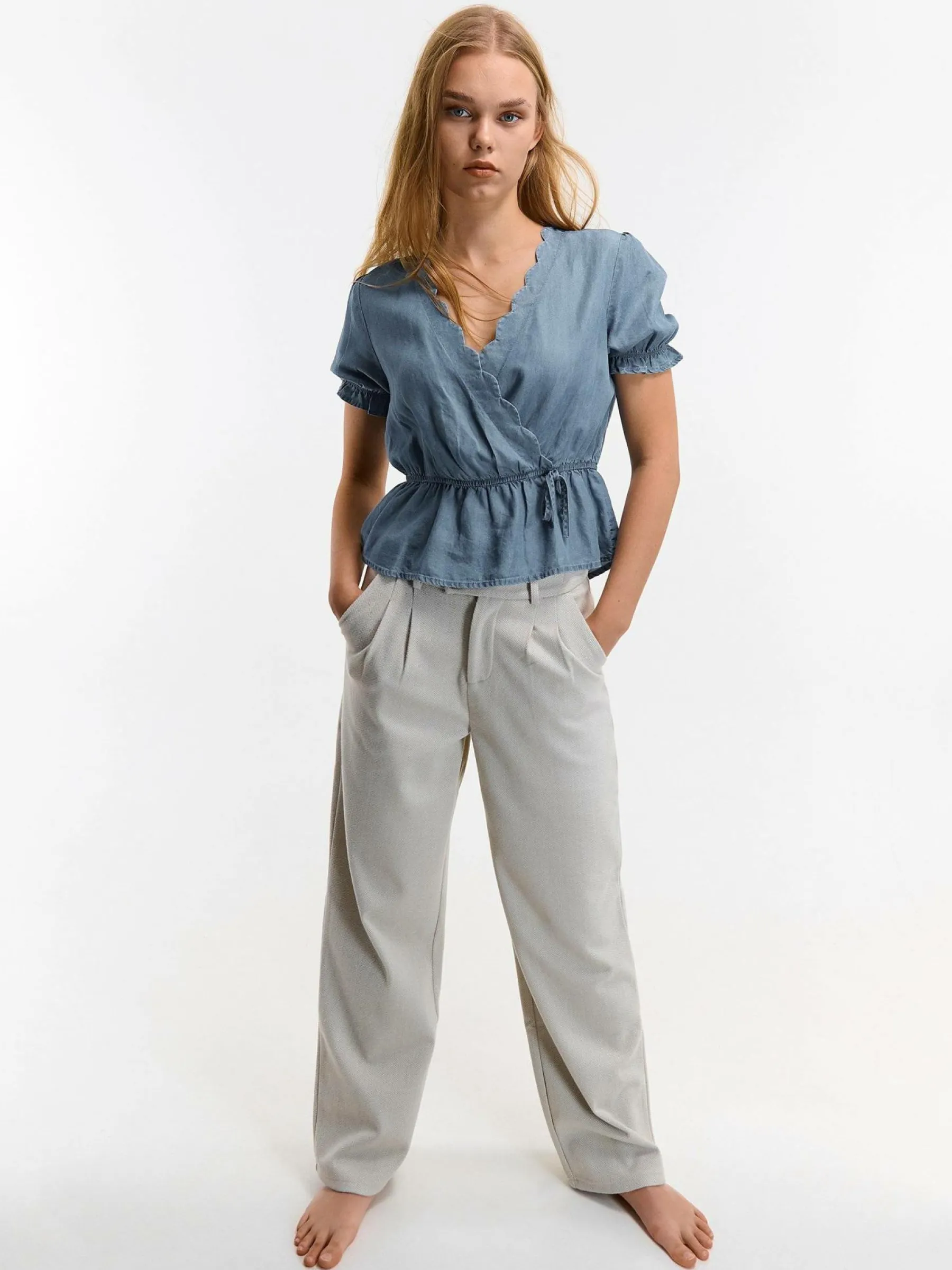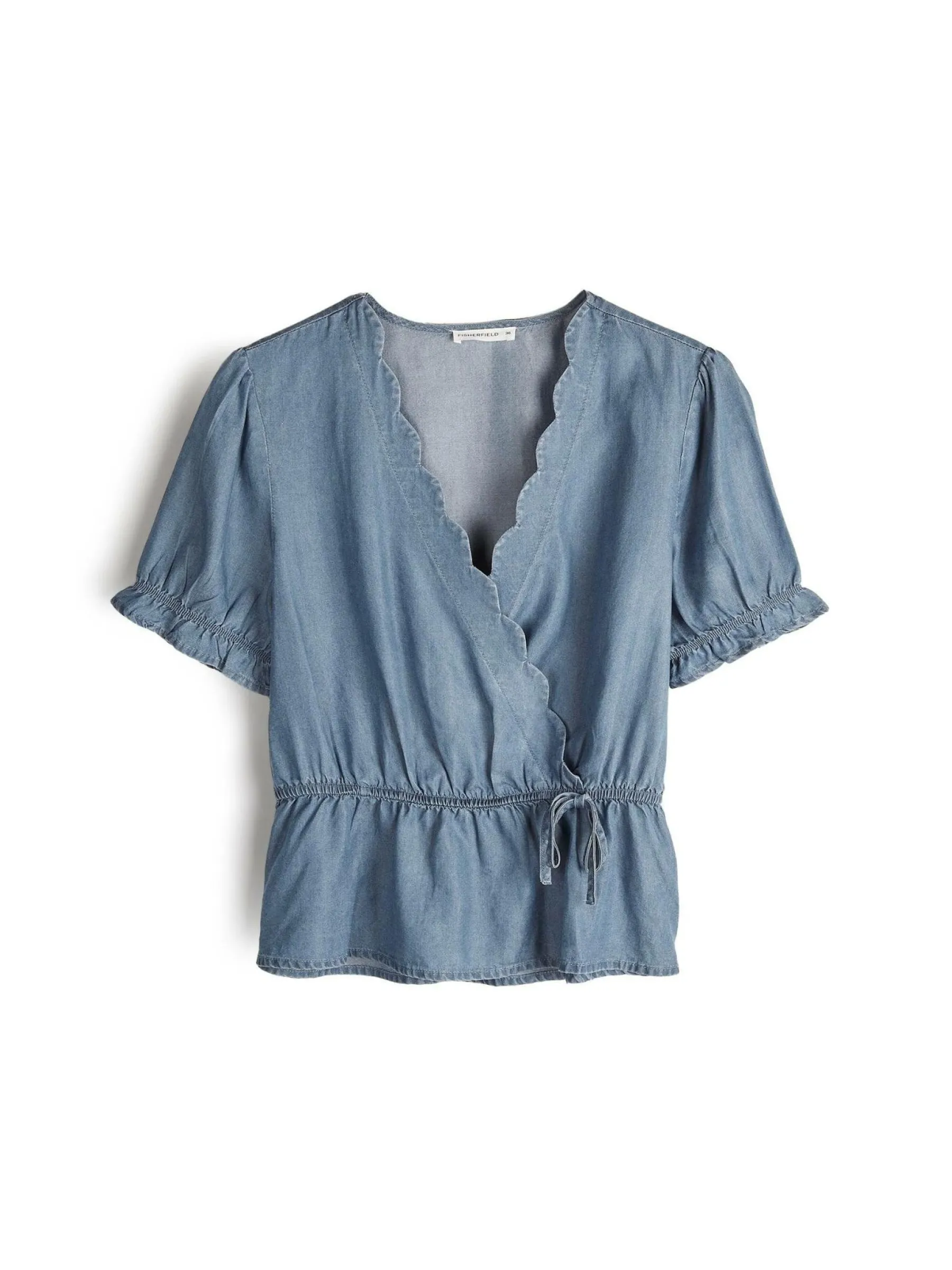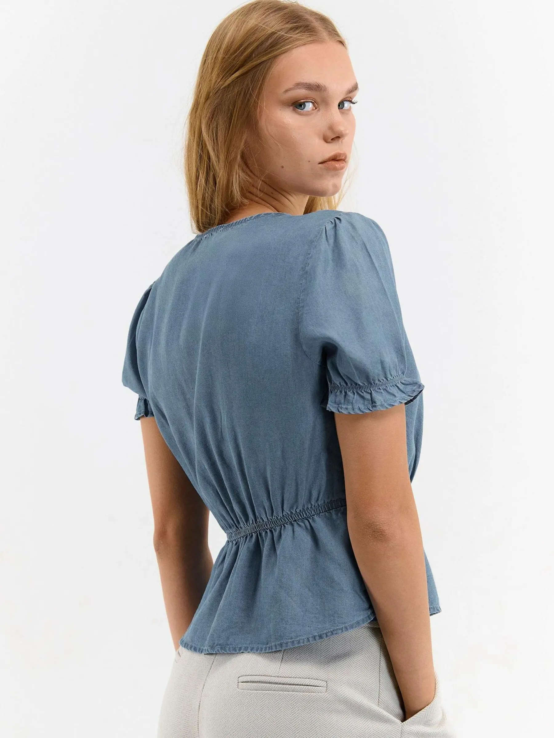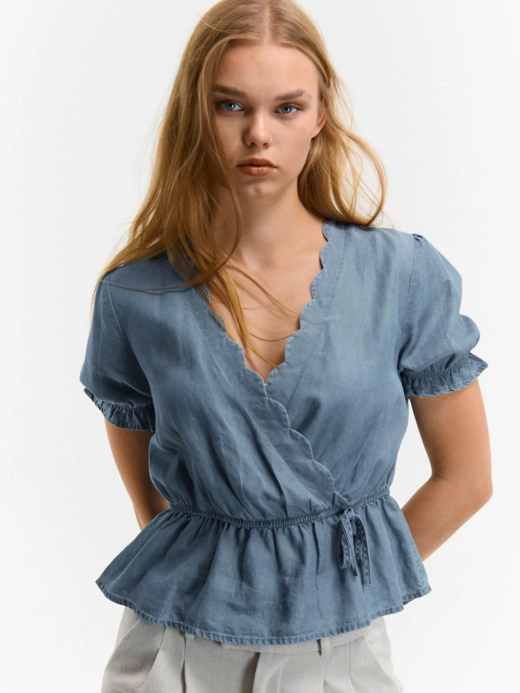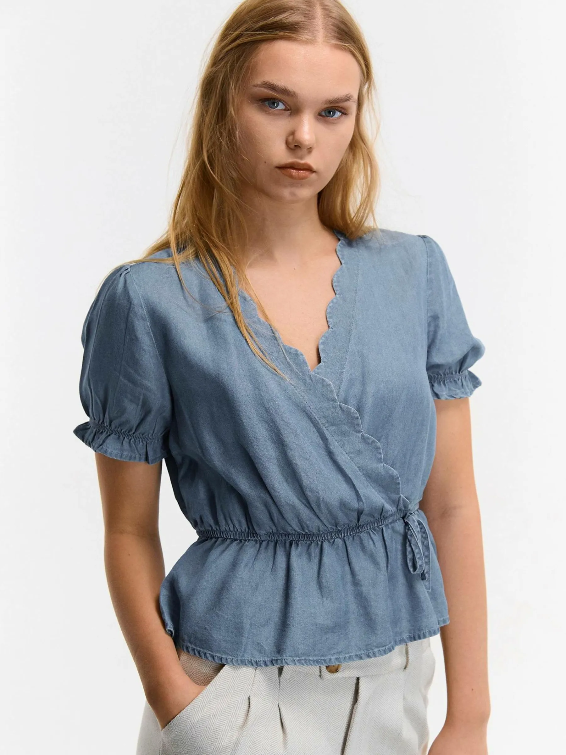 Kolor: niebieskiKrój: kopertówkiTyp: bluzka, topRekaw: krótki rękawDługość: krótkiPattern style: pojedynczy kolo…