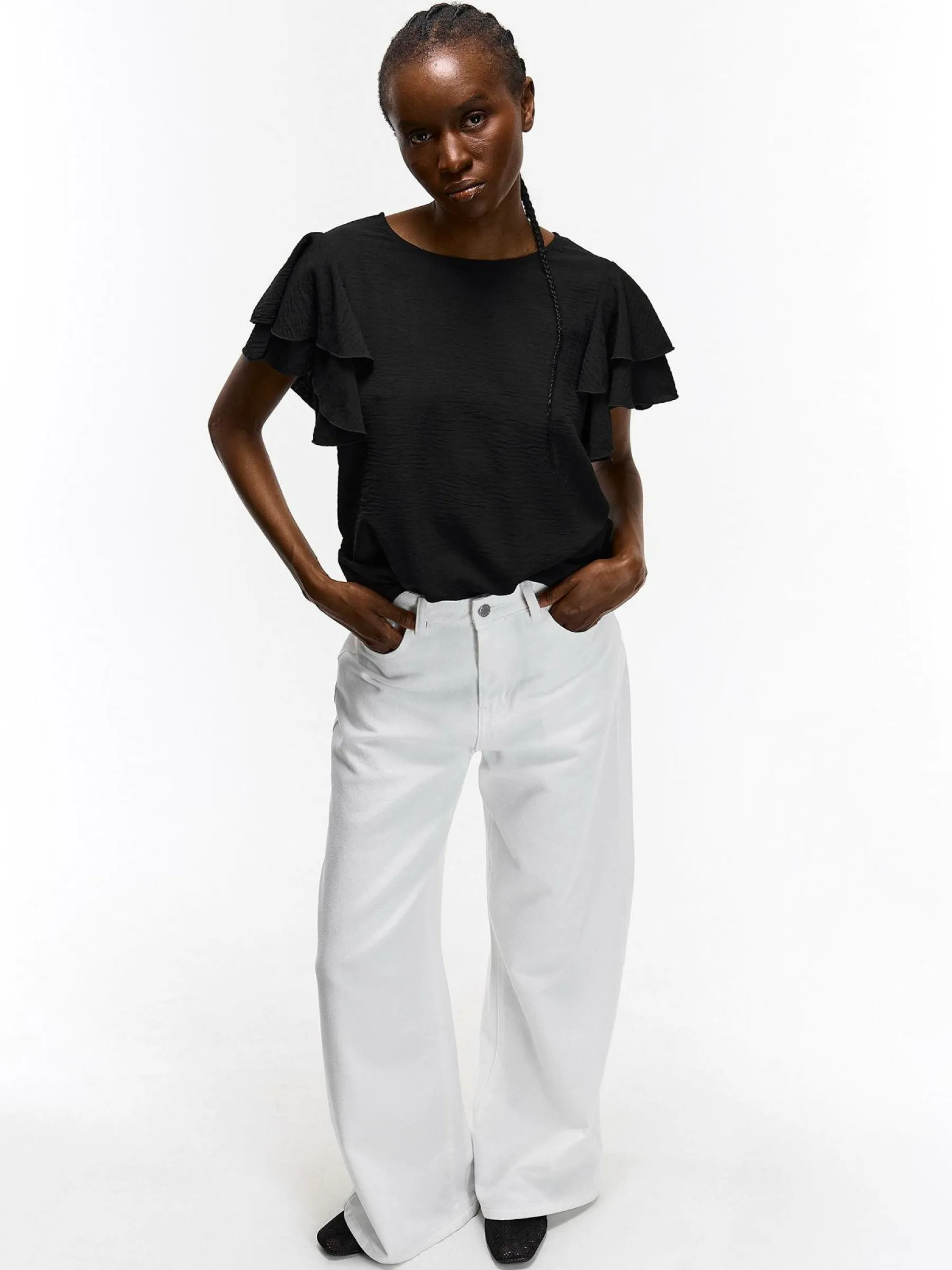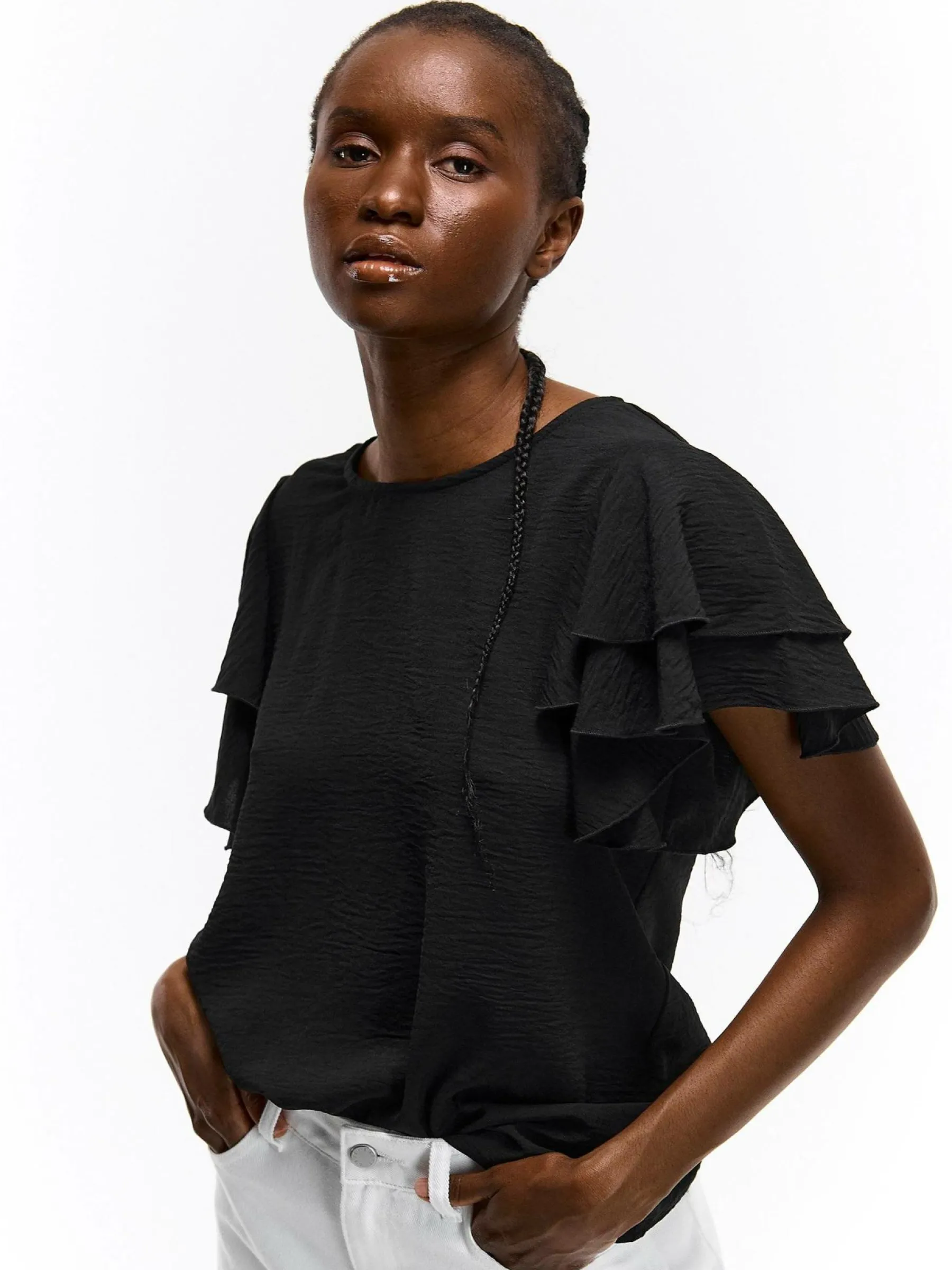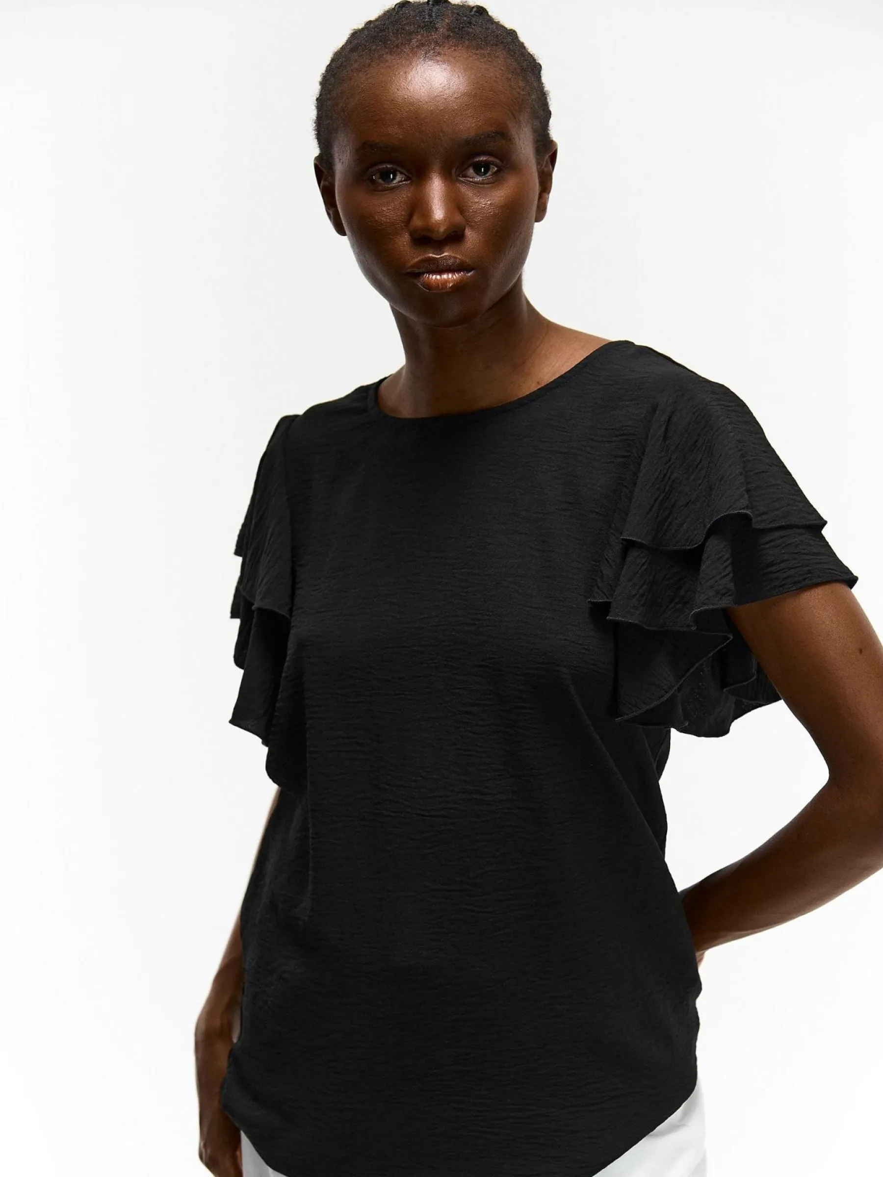 Kolor: czarnyKrój: z falbanąTyp: top, bluzkaRekaw: krótki rękawDługość: krótkiPattern style: pojedynczy kolorDet…
