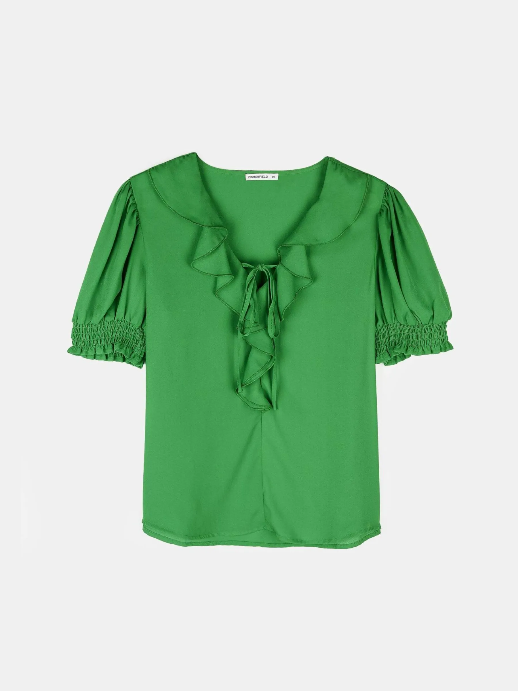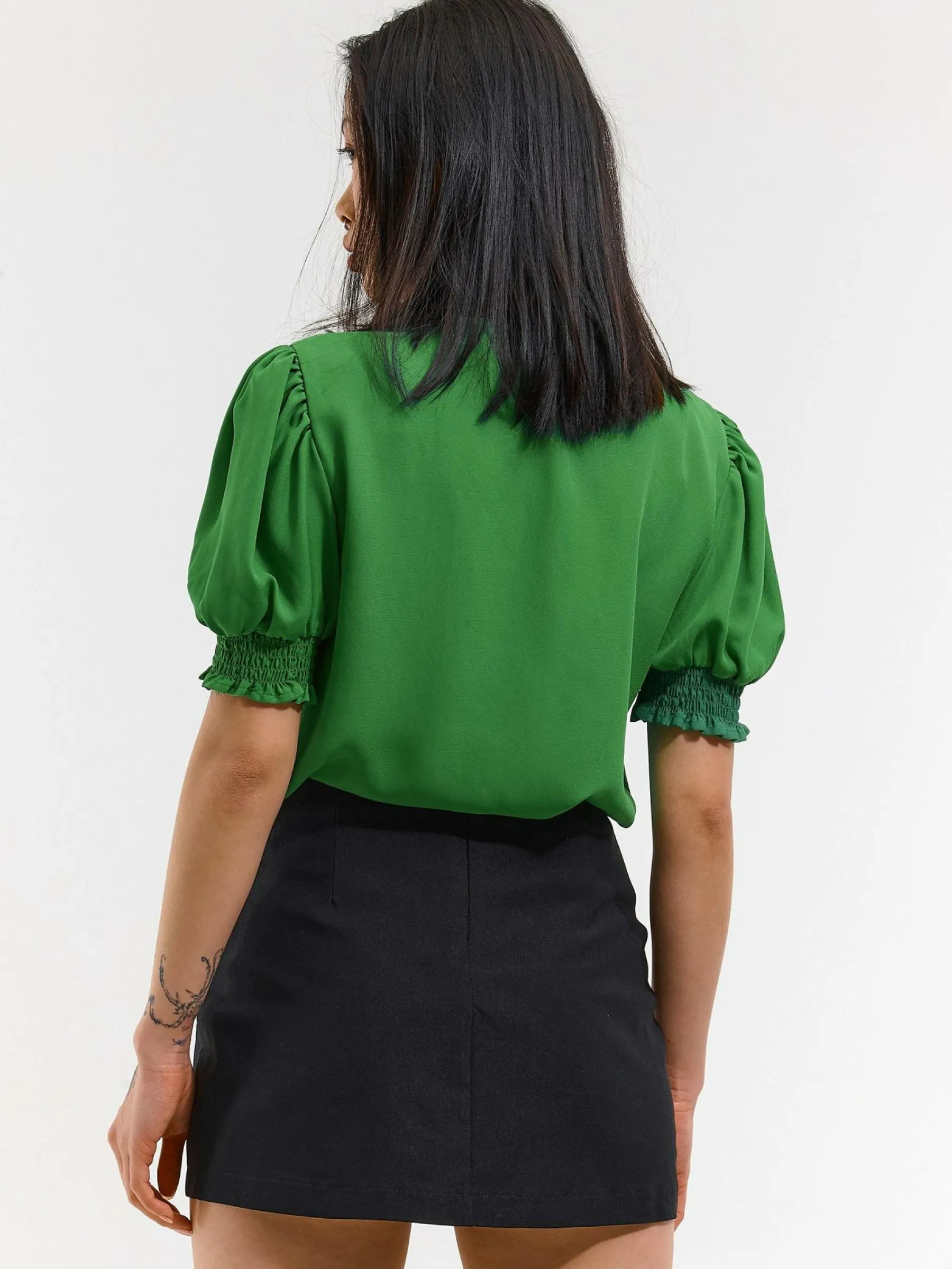 Kolor: zielonyKrój: z falbanąTyp: bluzkaRekaw: krótki rękawDługość: krótkiPattern style: pojedynczy kolorDetal: …