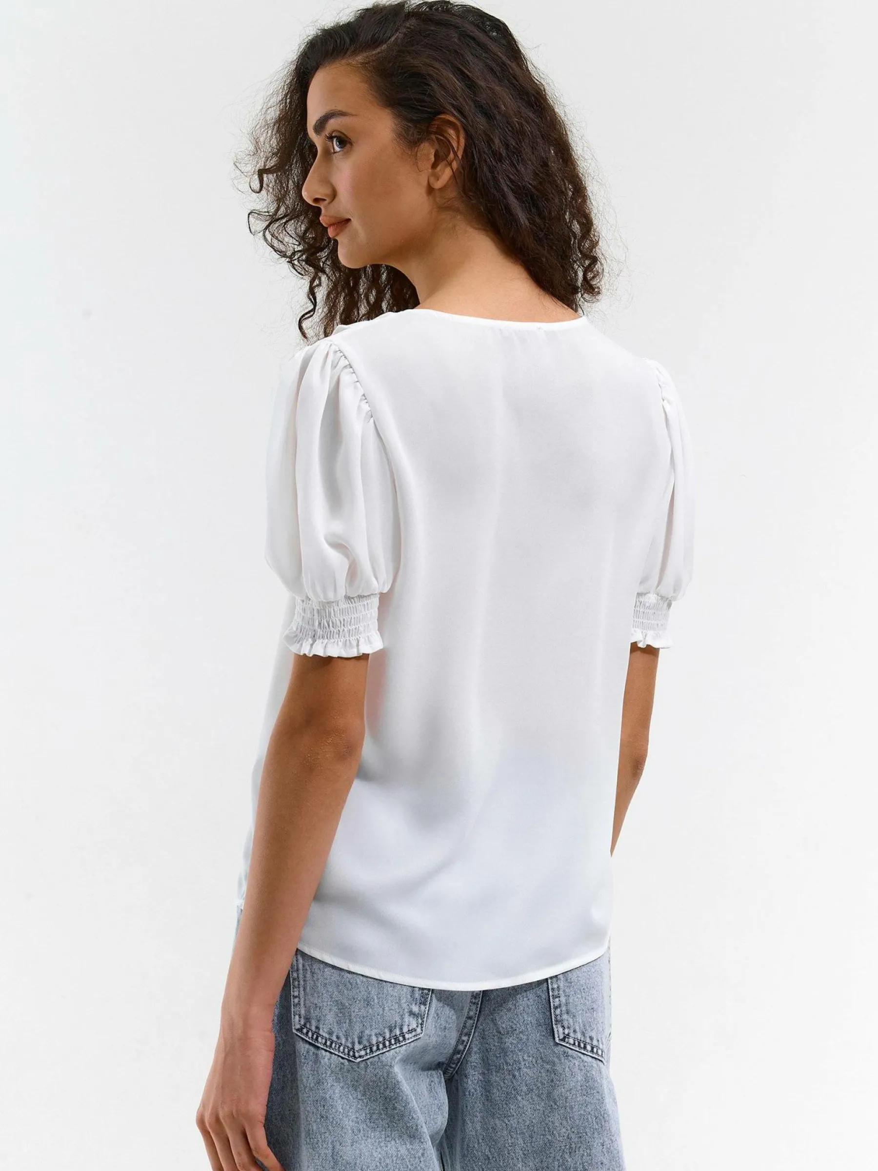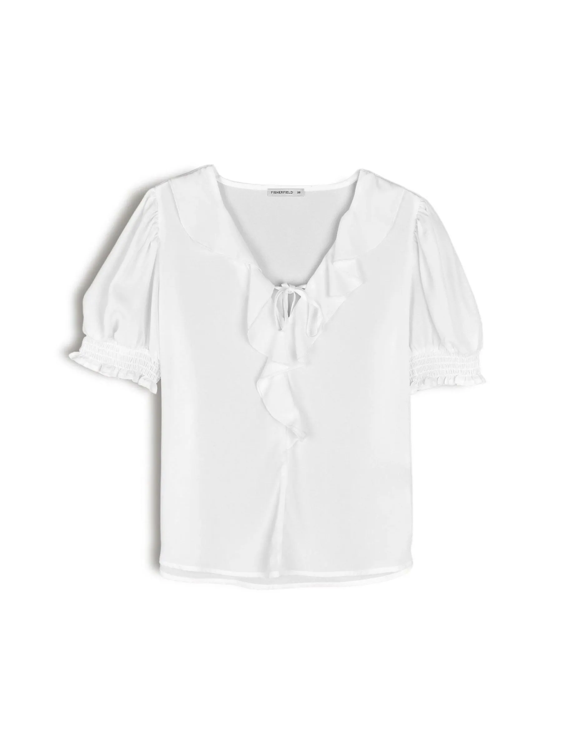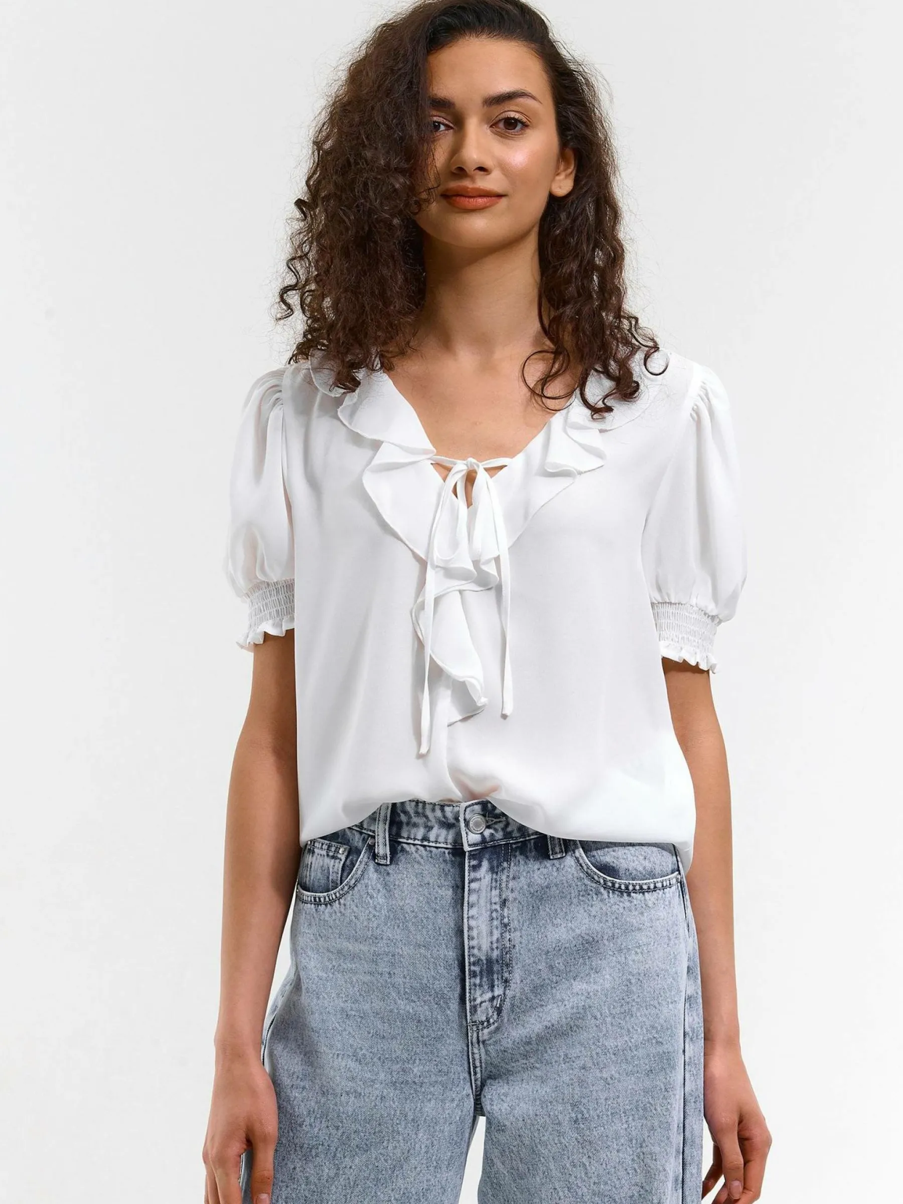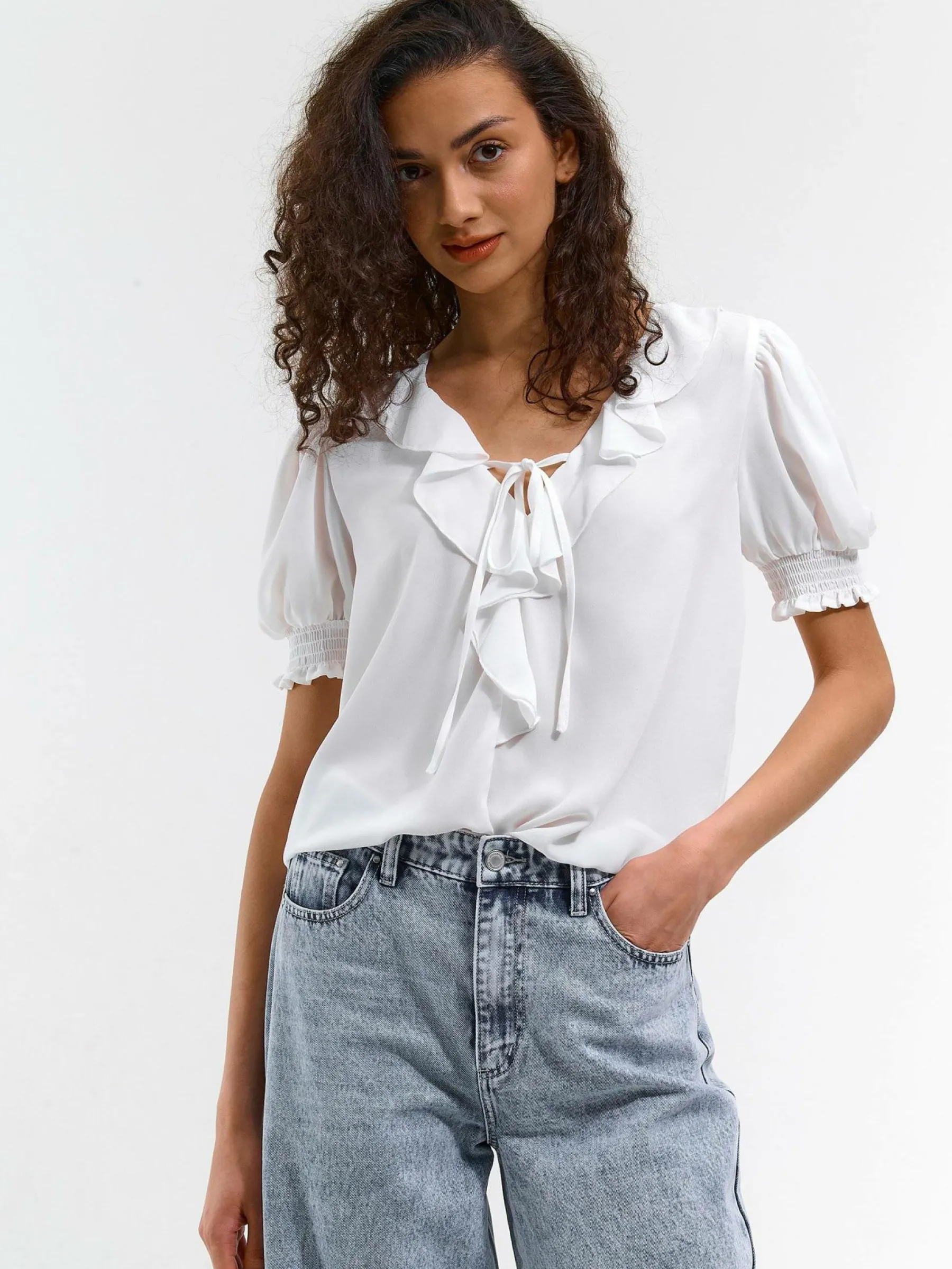 Kolor: białyKrój: z falbanąTyp: bluzkaRekaw: krótki rękawDługość: krótkiPattern style: pojedynczy kolorDetal: v…