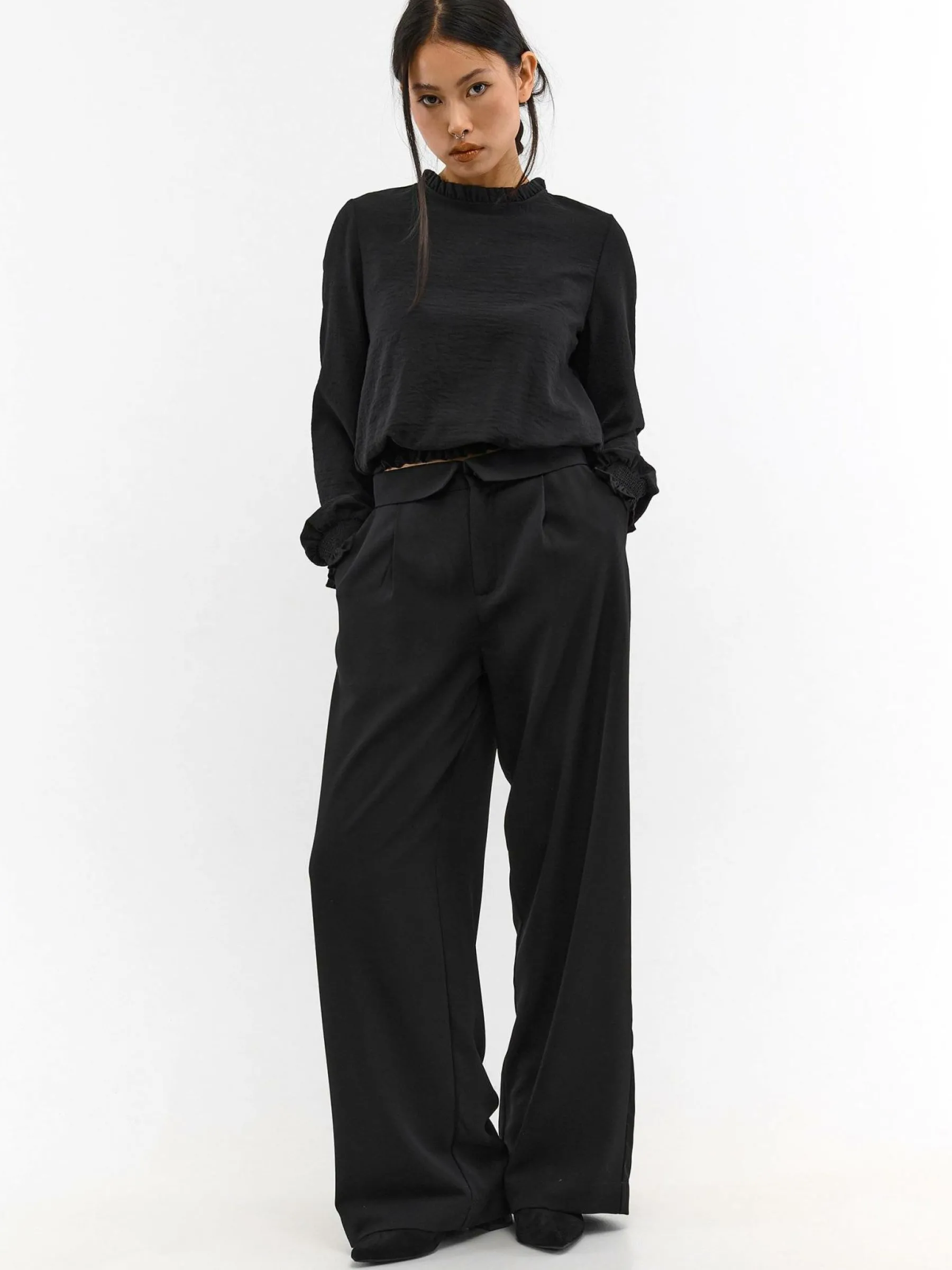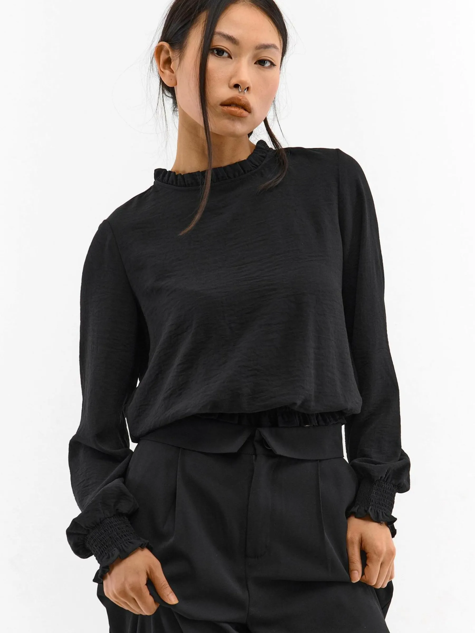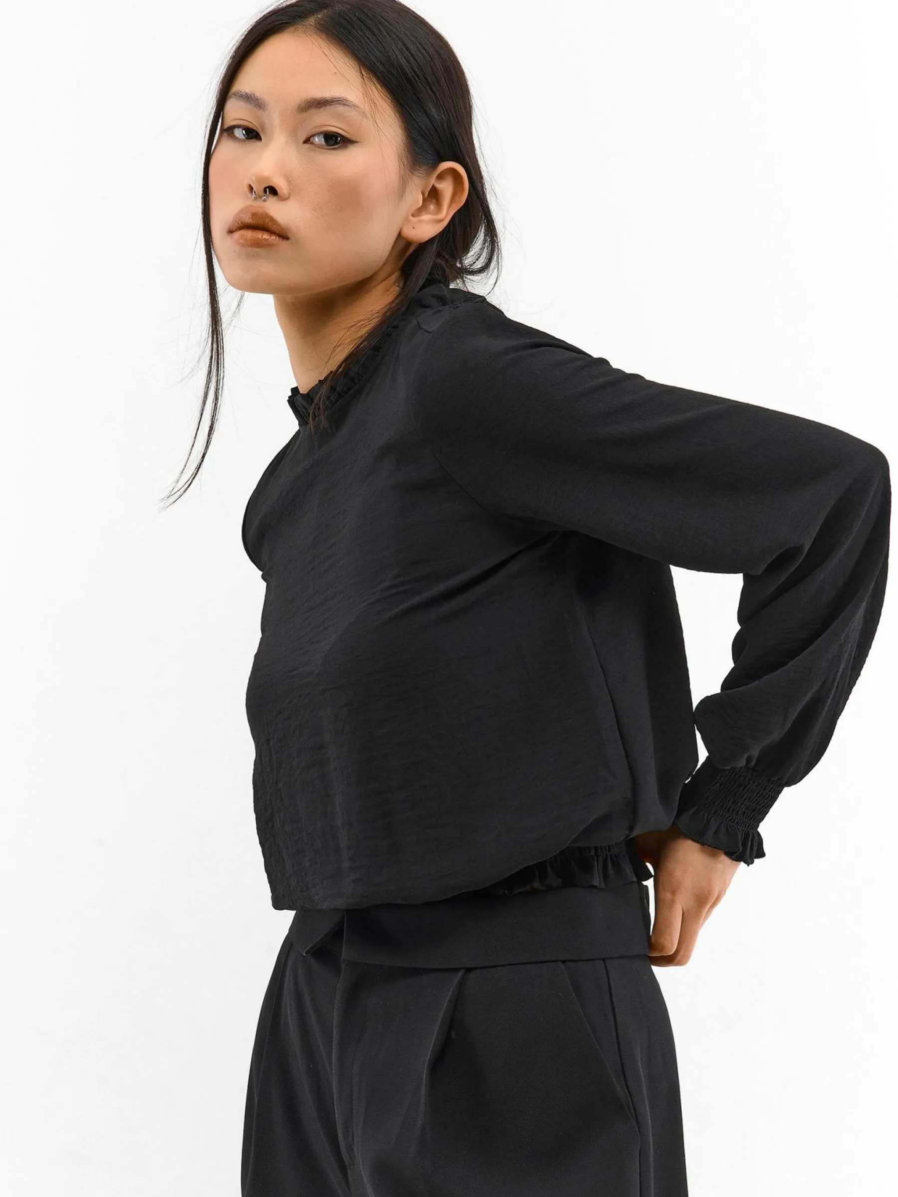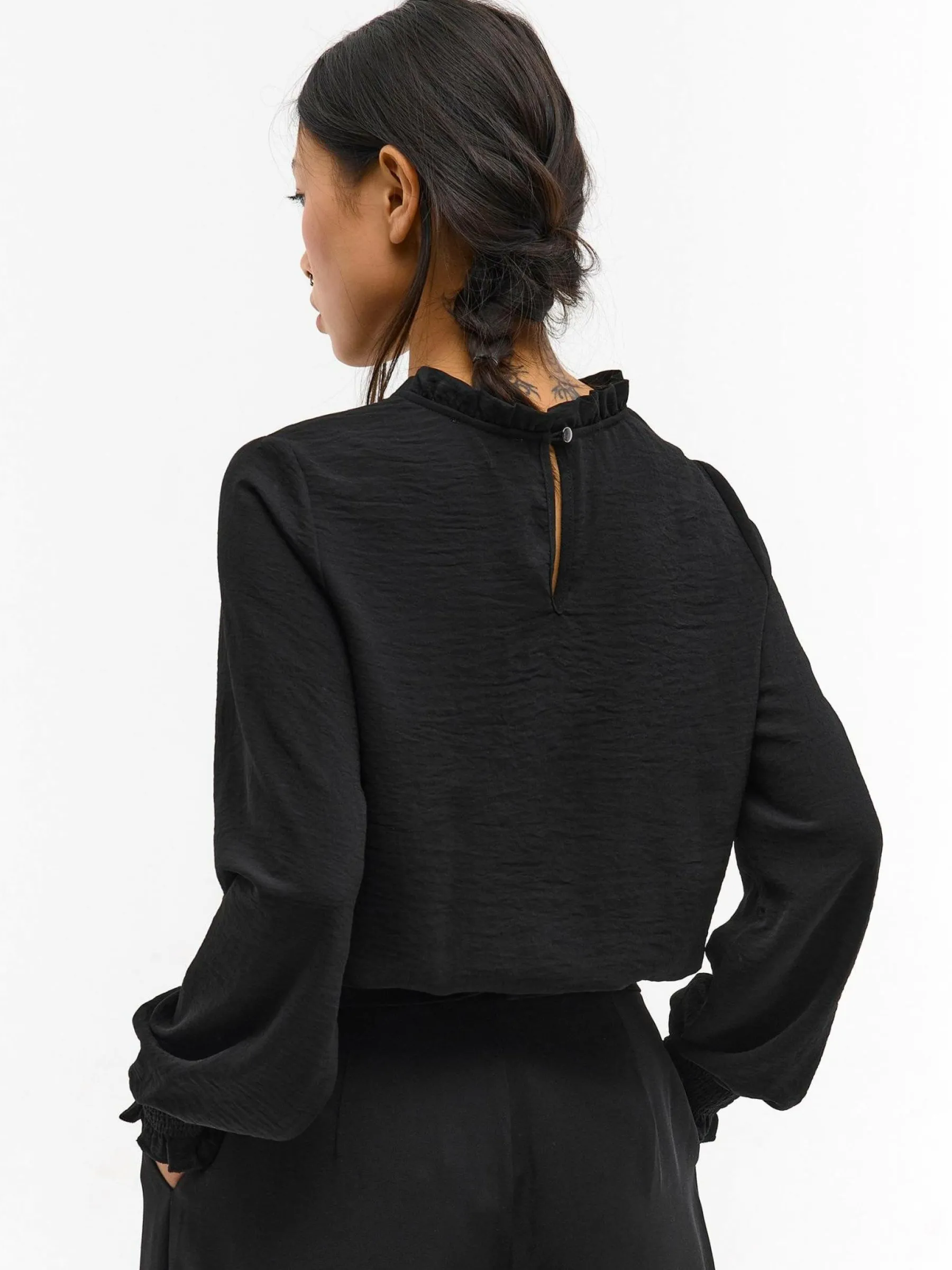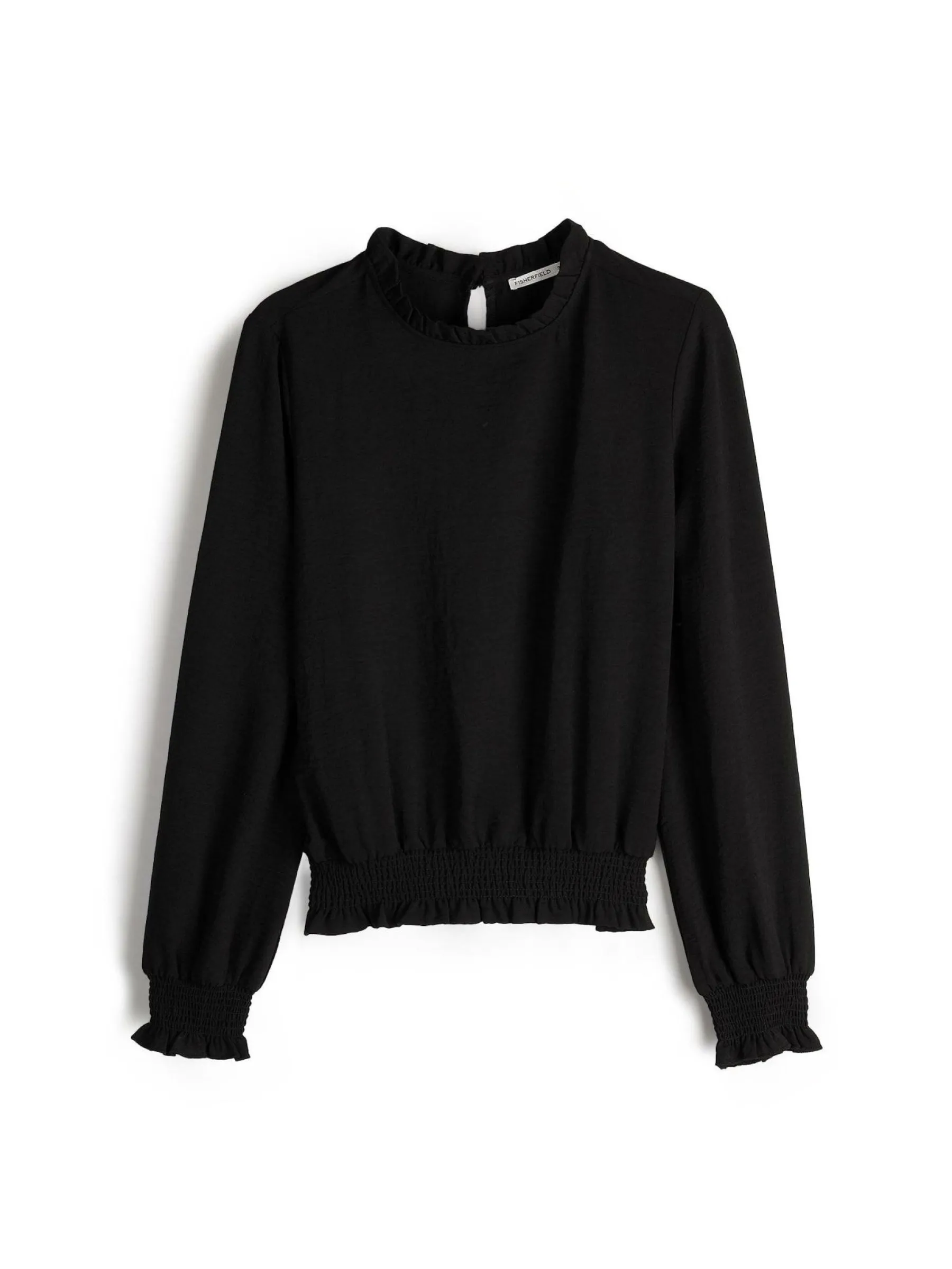 Kolor: czarnyKrój: z marszczeniemTyp: bluzka, topRekaw: długi rękawDługość: krótkiPattern style: pojedynczy kolor…
