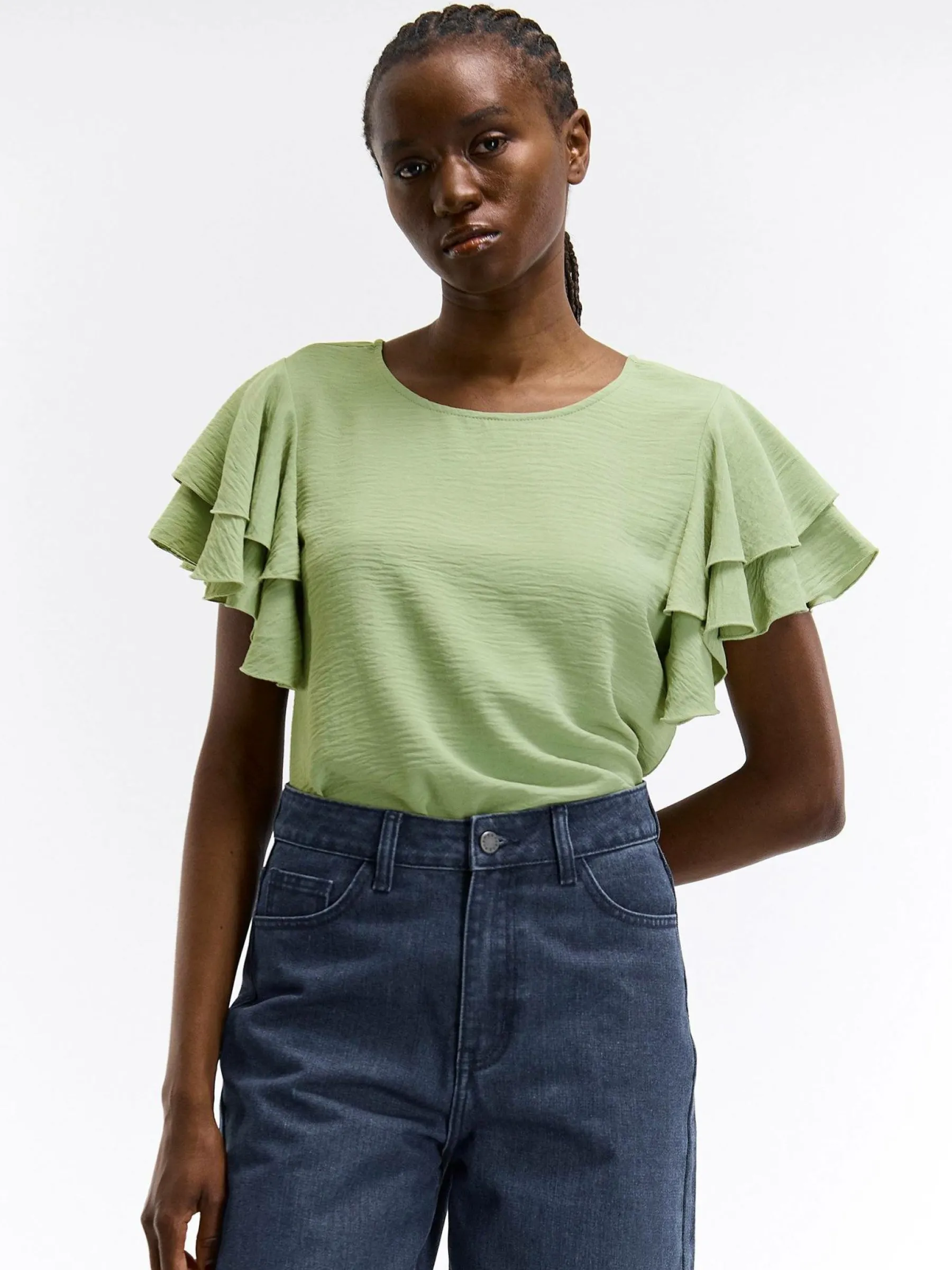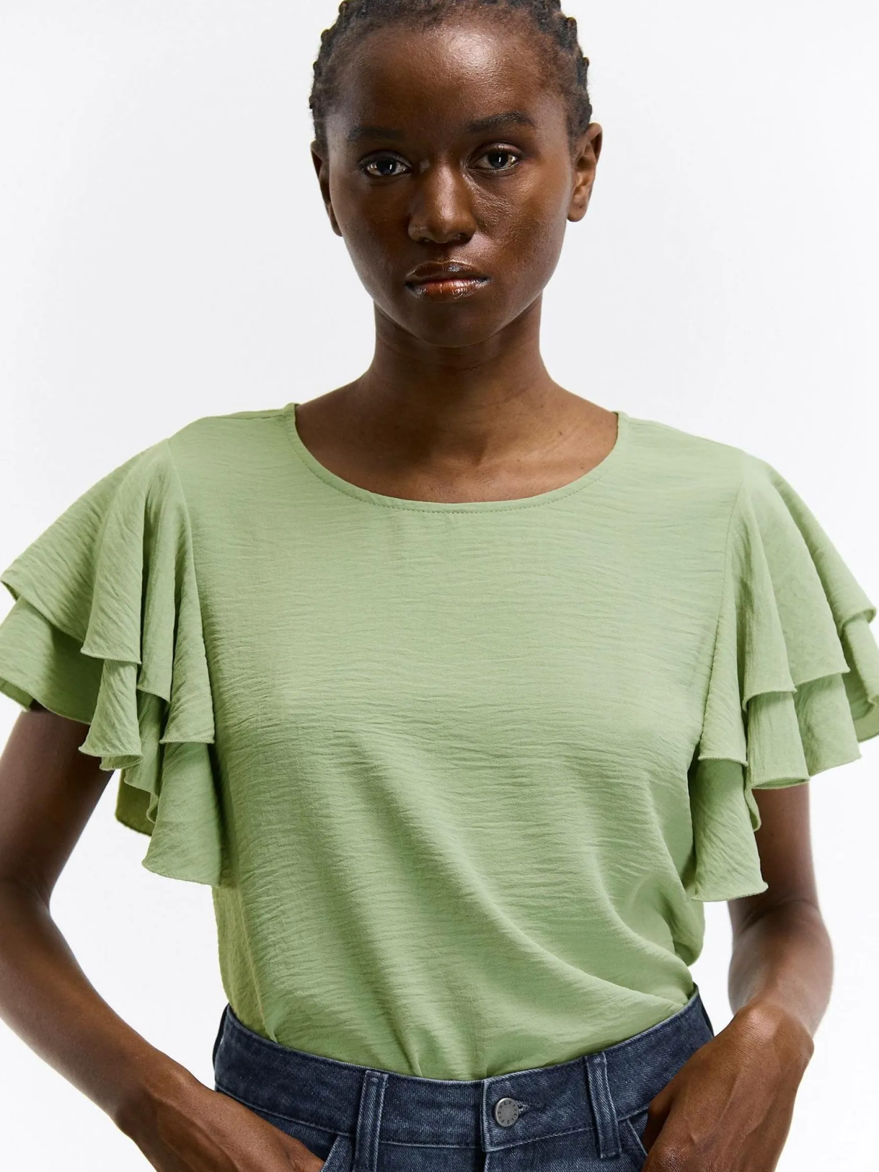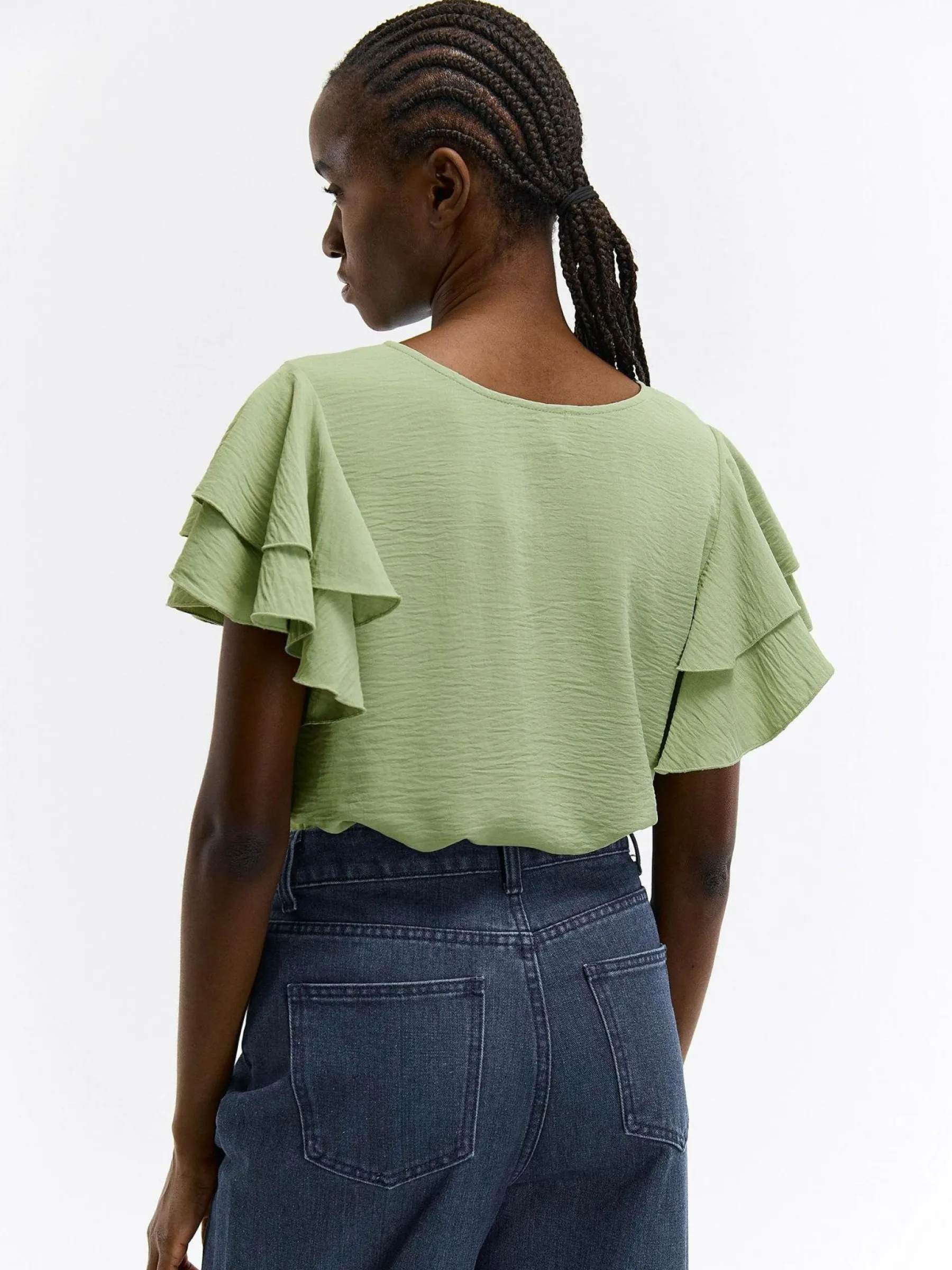 Zdjęcia z modelką mogą nie odpowiadać rzeczywistemu kolorowi produktu.Kolor: zielonyKrój: z falbanąTyp: topRekaw: …