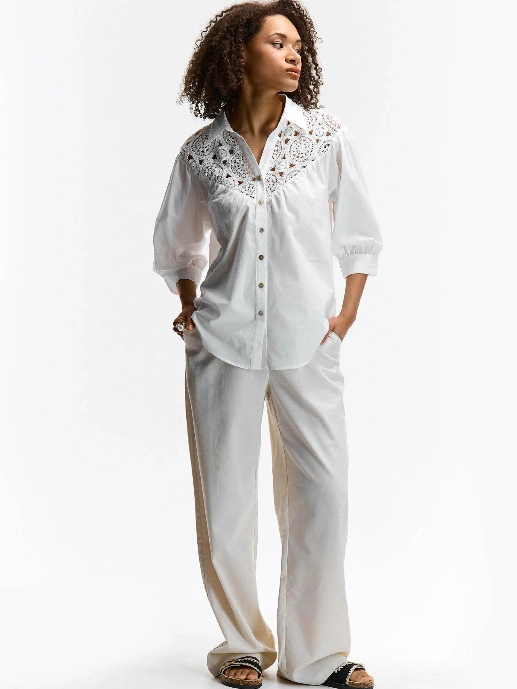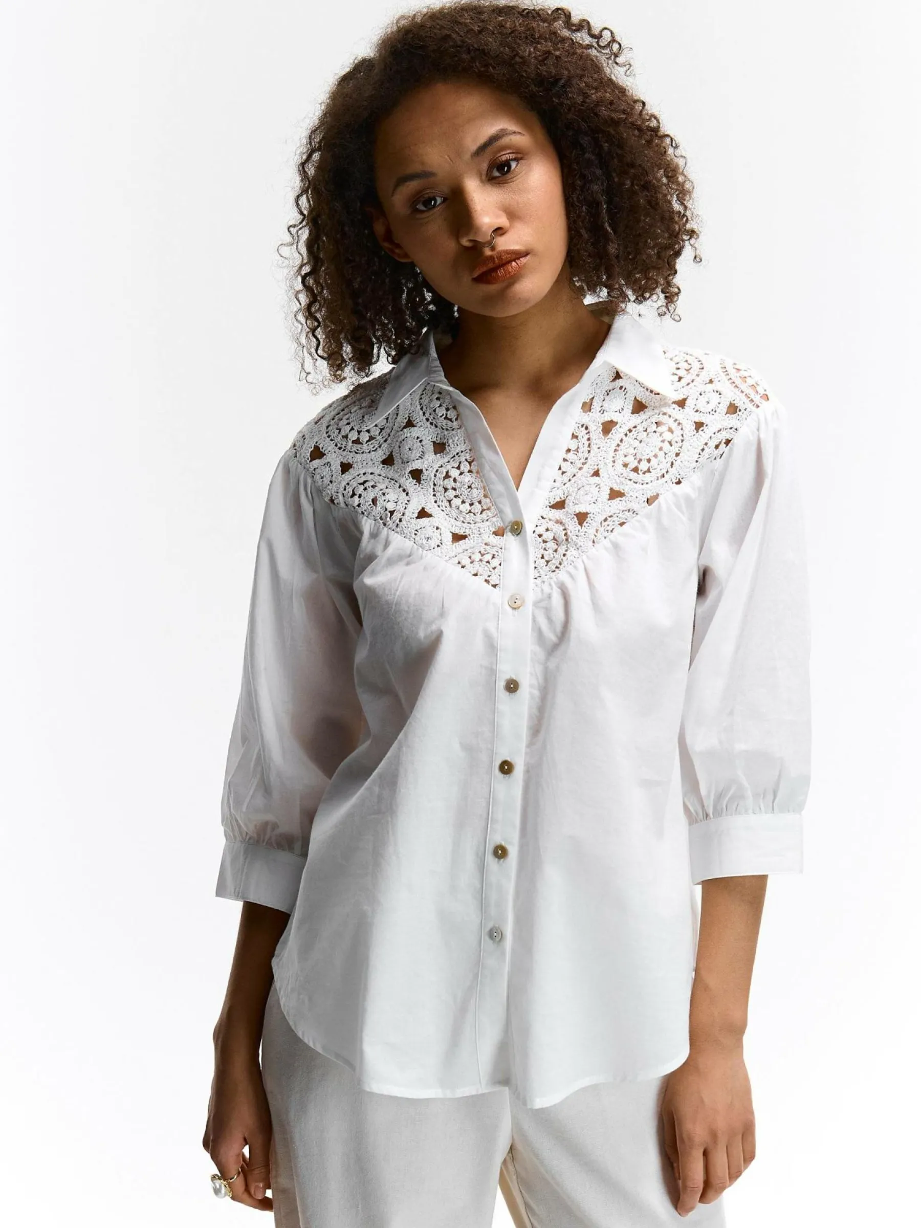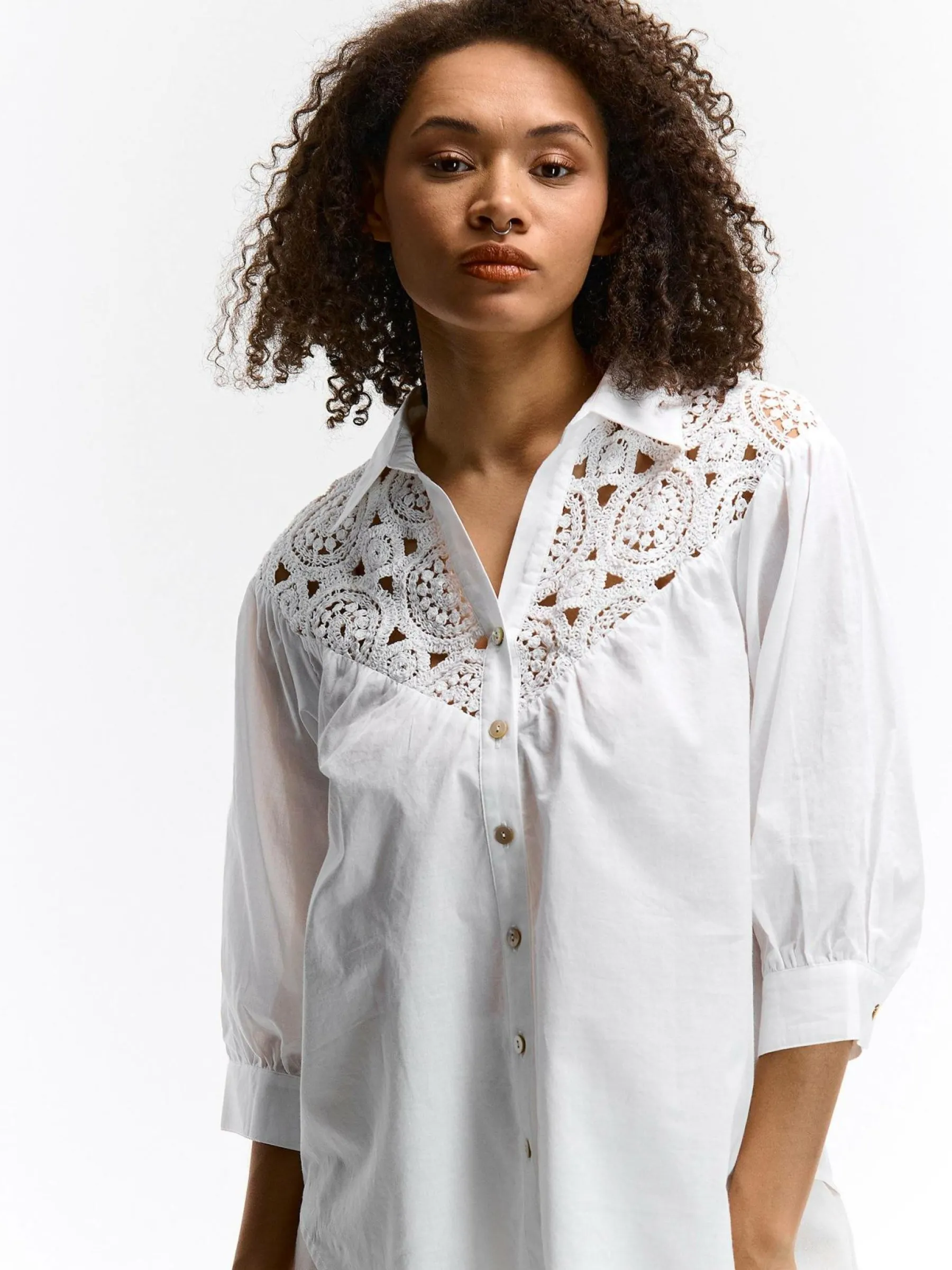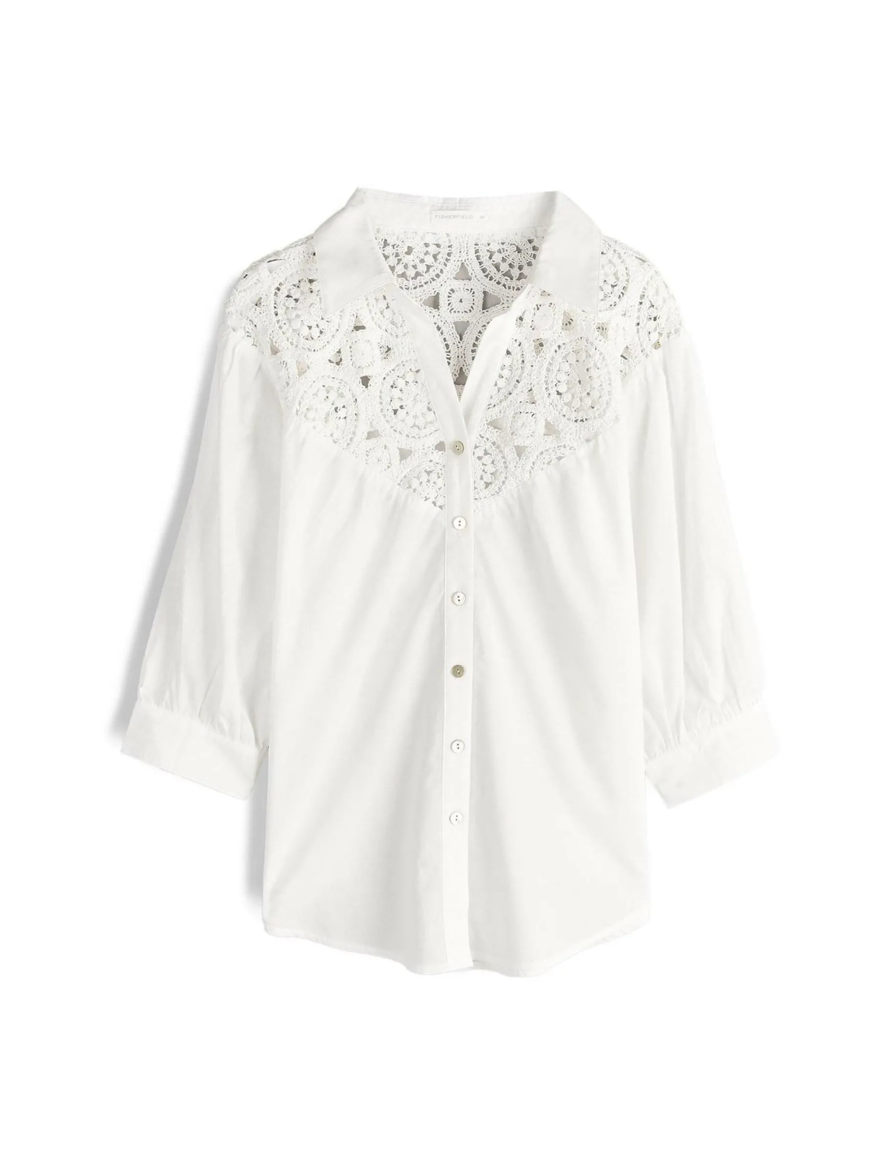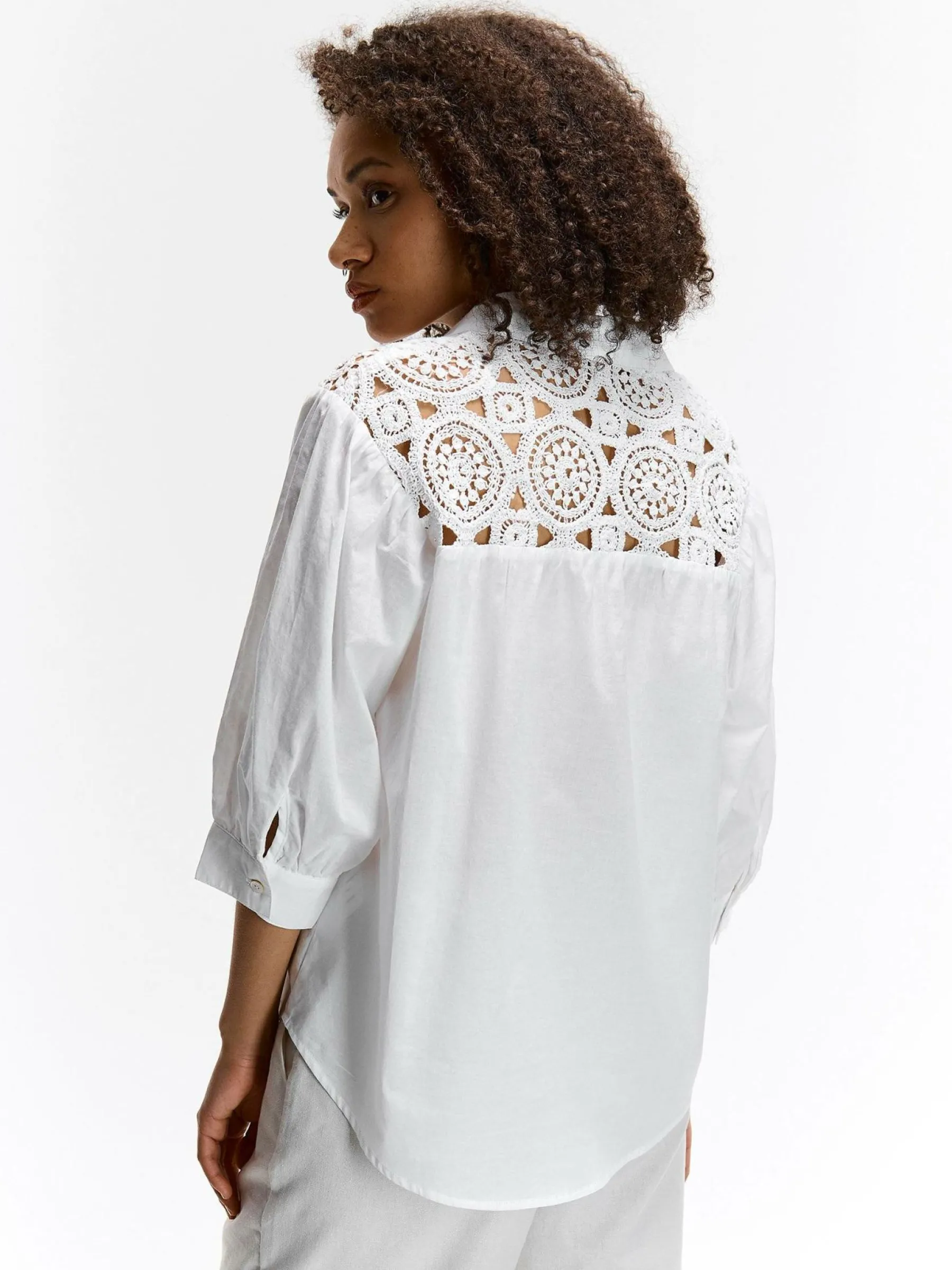 Kolor: białyKrój: podstawowyTyp: bluzkaRekaw: rękaw 3/4Długość: krótkiPattern style: szydełkowaneDetal: na guzik…