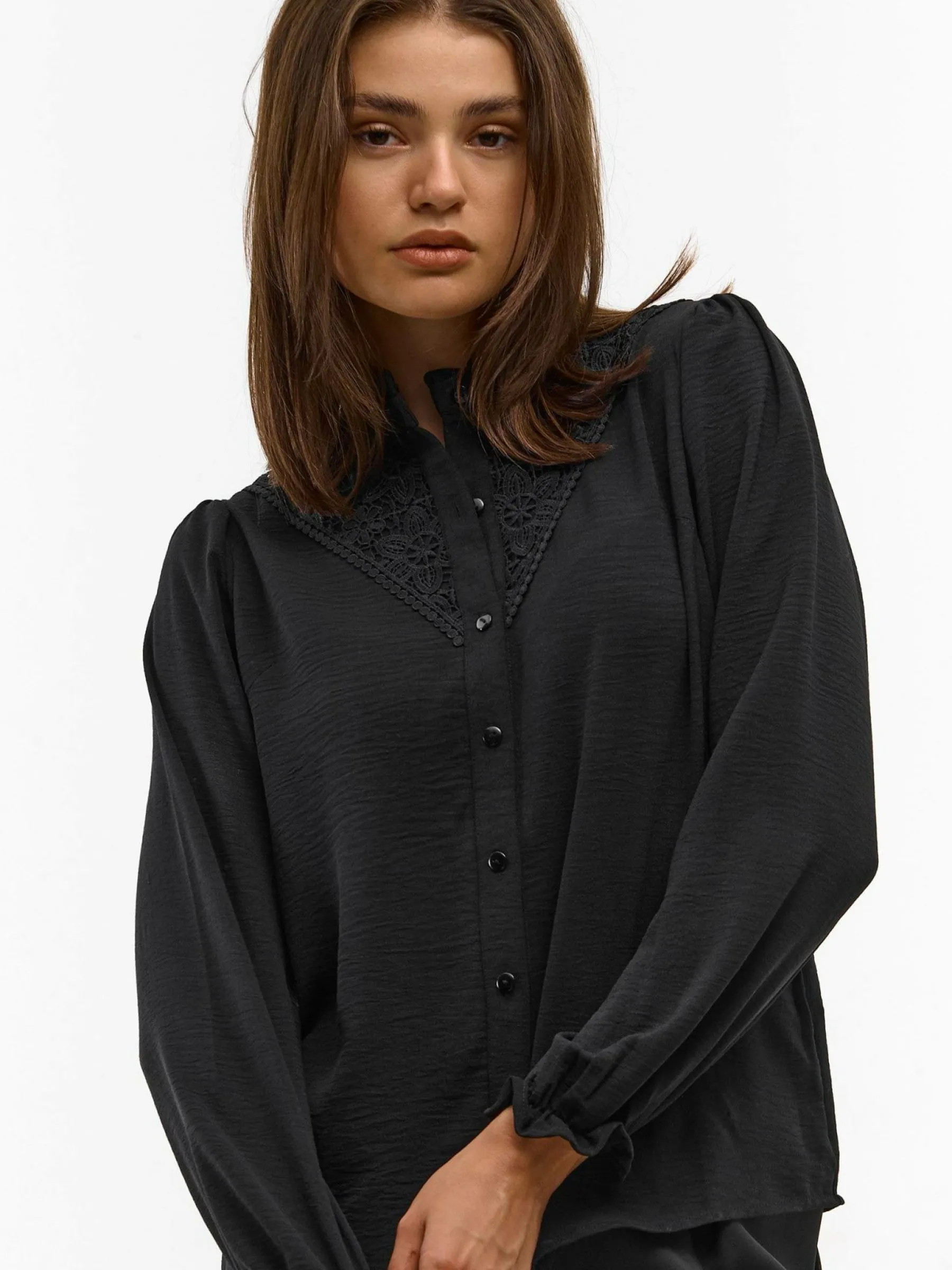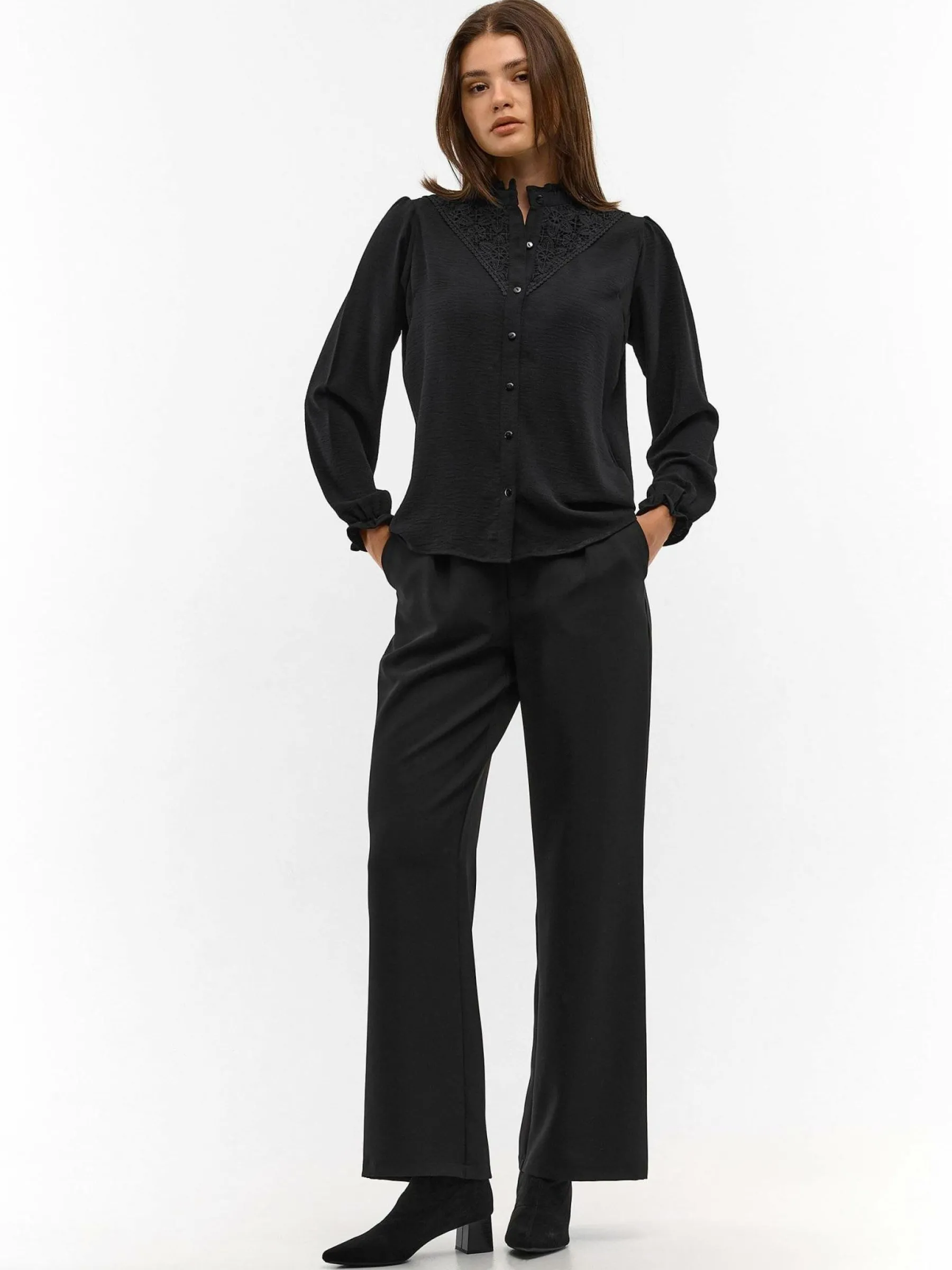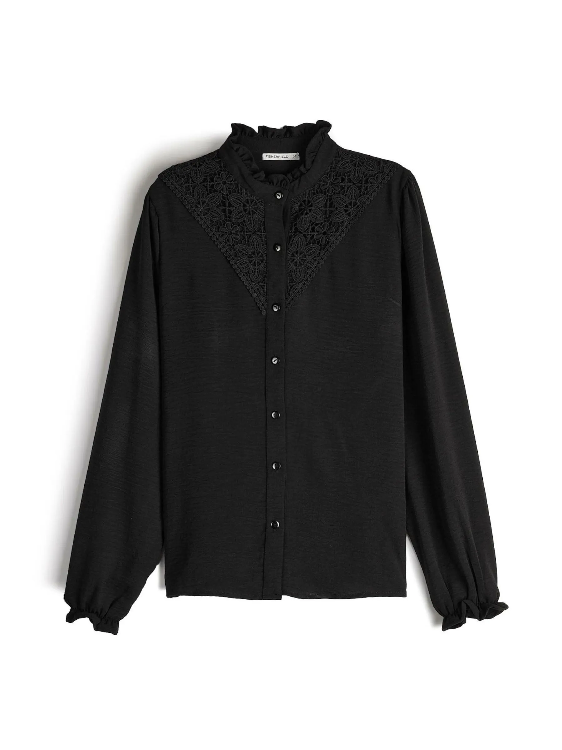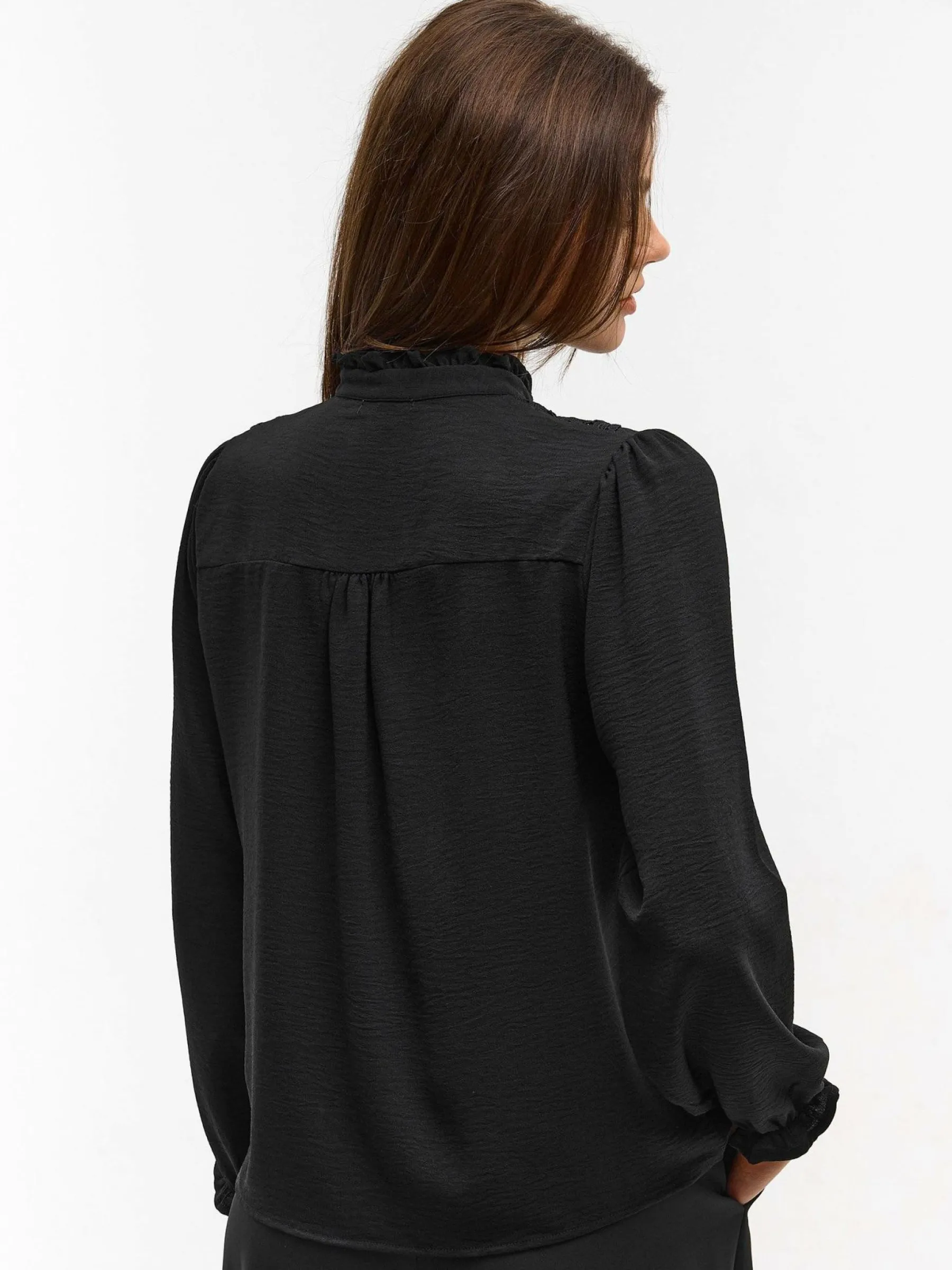Kolor: czarnyKrój: z falbanąTyp: bluzkaRekaw: długi rękawDługość: krótkiPattern style: pojedynczy kolorDetal: na…