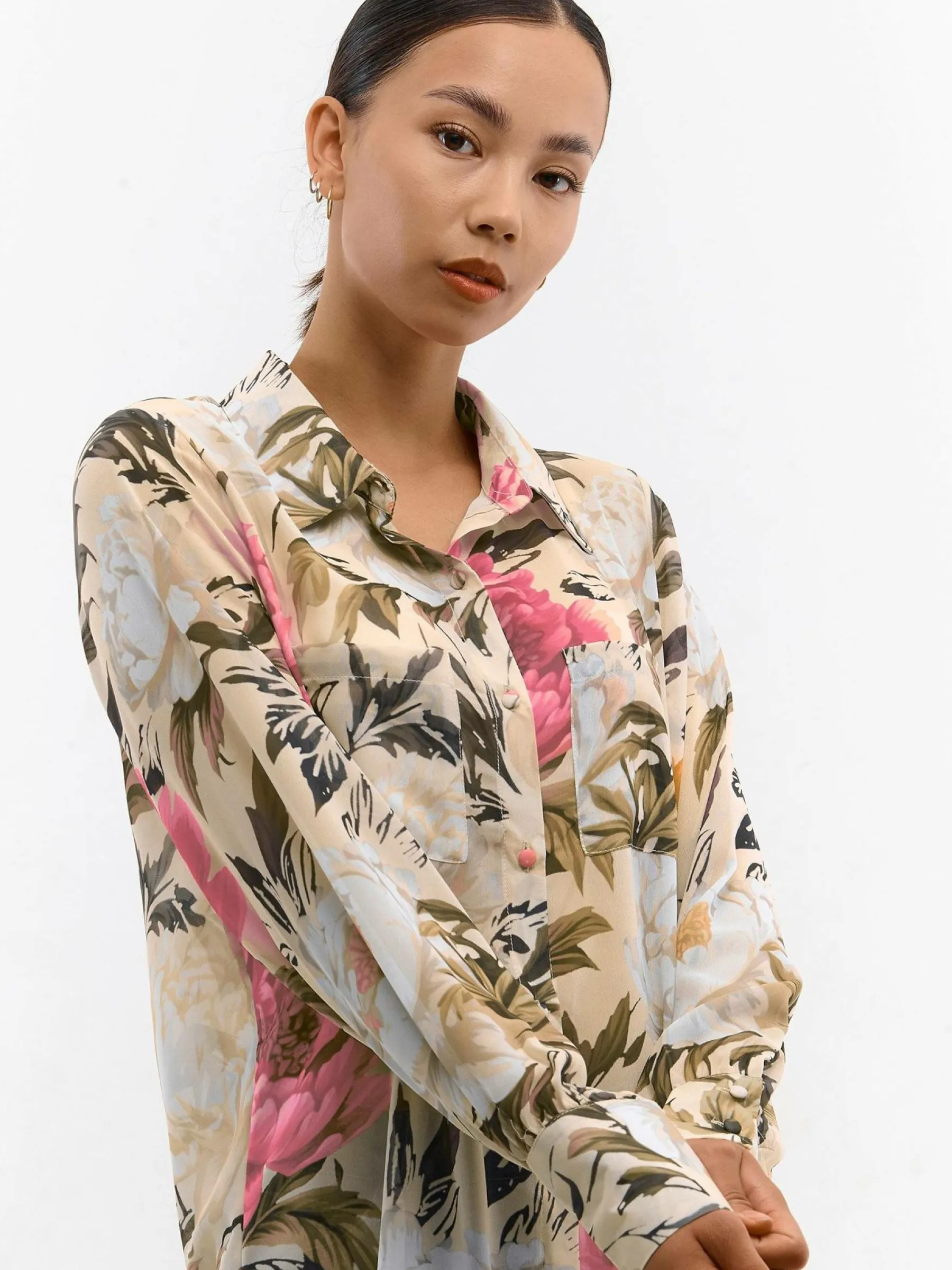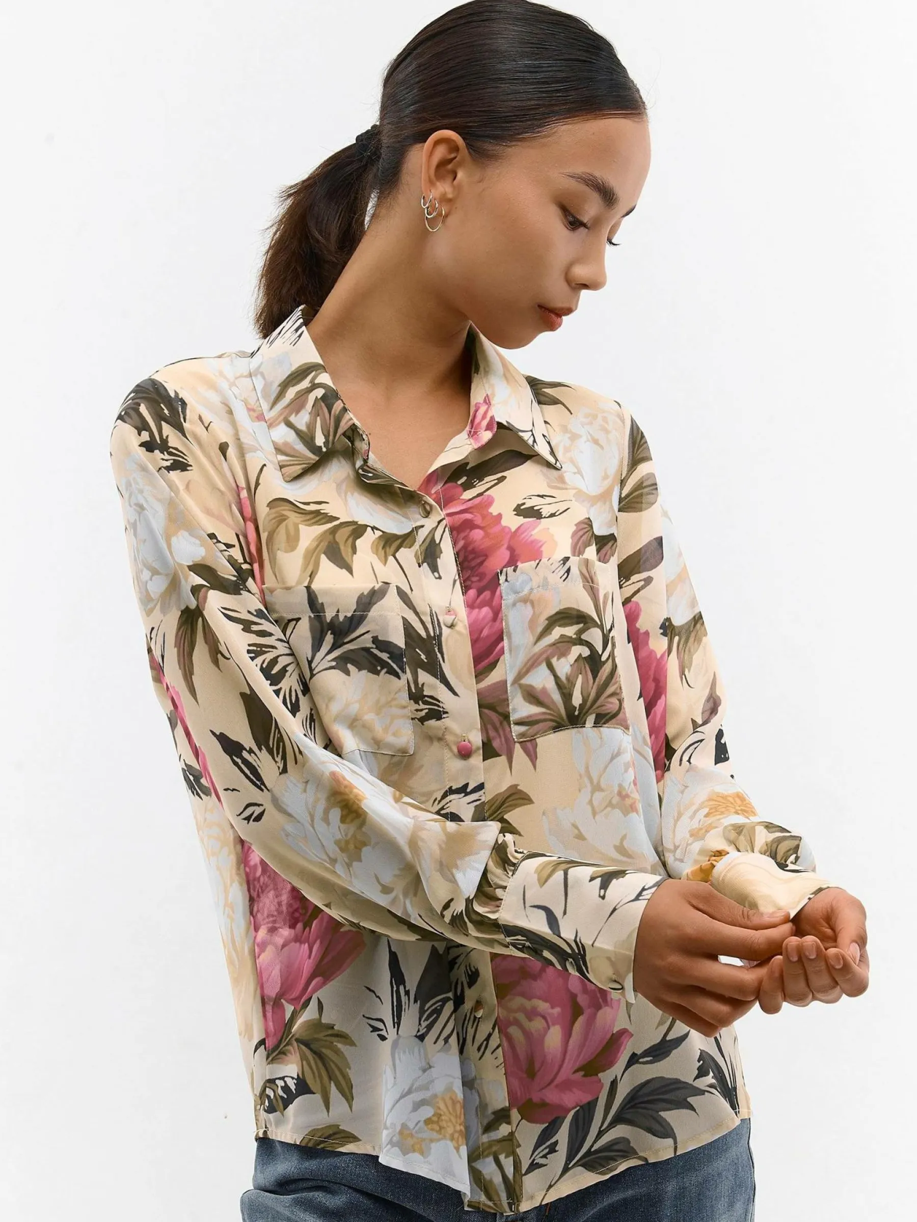 Kolor: beżowyKrój: podstawowyTyp: bluzkaRekaw: krótki rękawDługość: krótkiPattern style: kwiatowe, z nadrukiemDe…