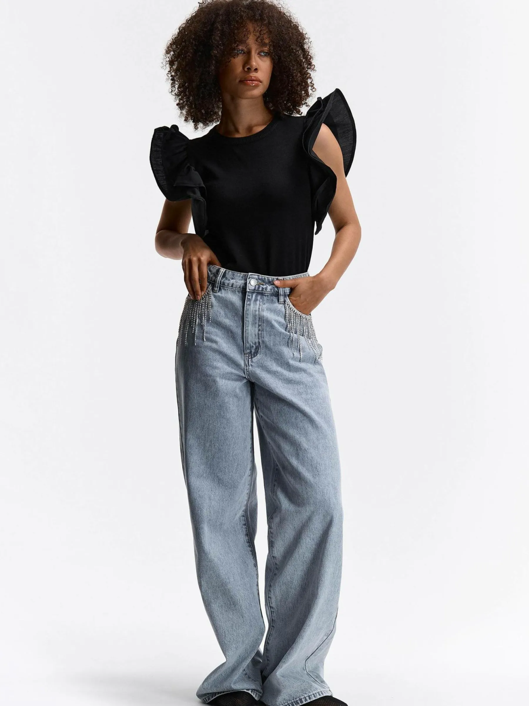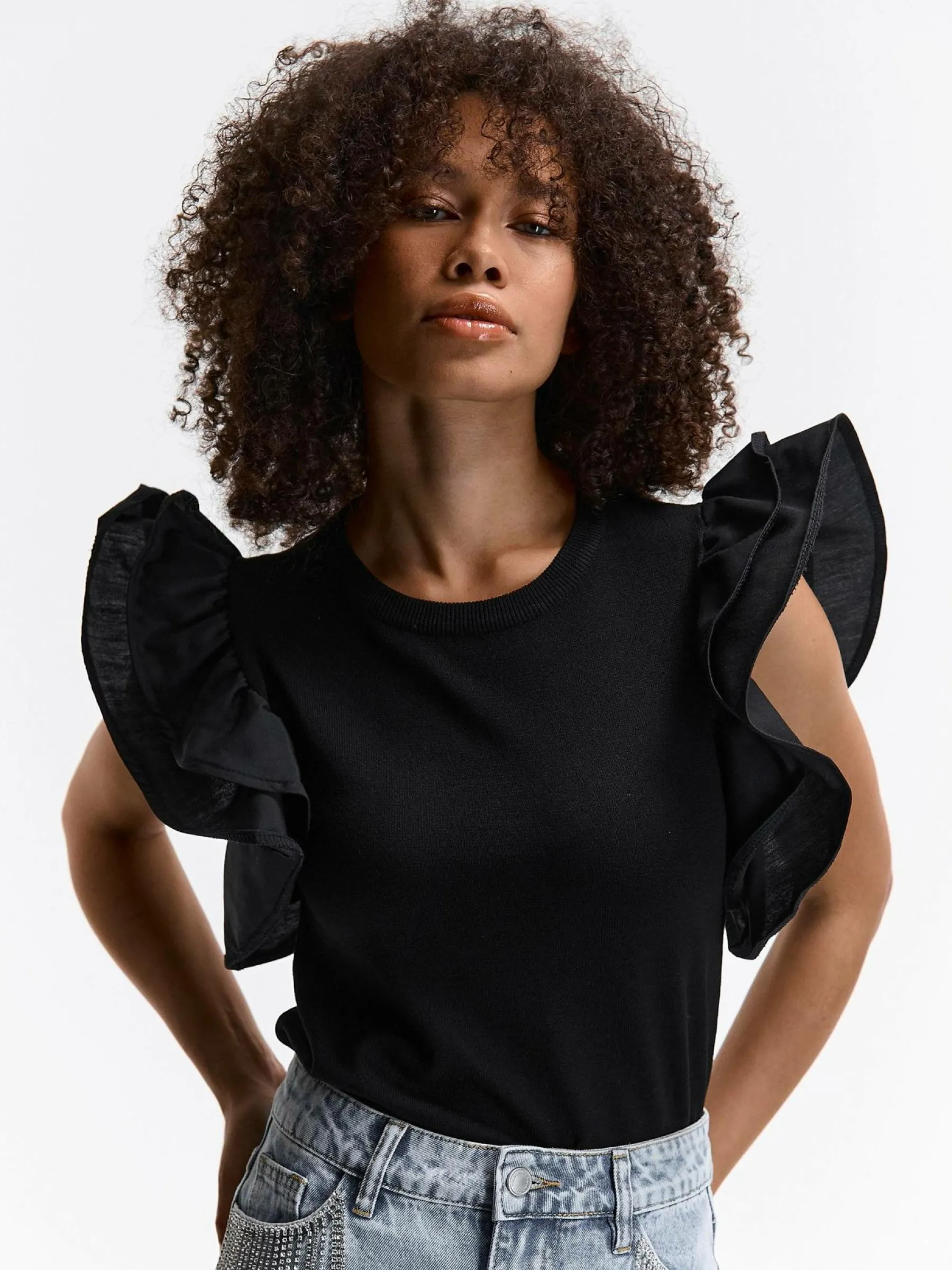 Kolor: czarnyKrój: z falbanąTyp: top, swetryRekaw: krótki rękawDługość: krótkiPattern style: pojedynczy kolorDet…