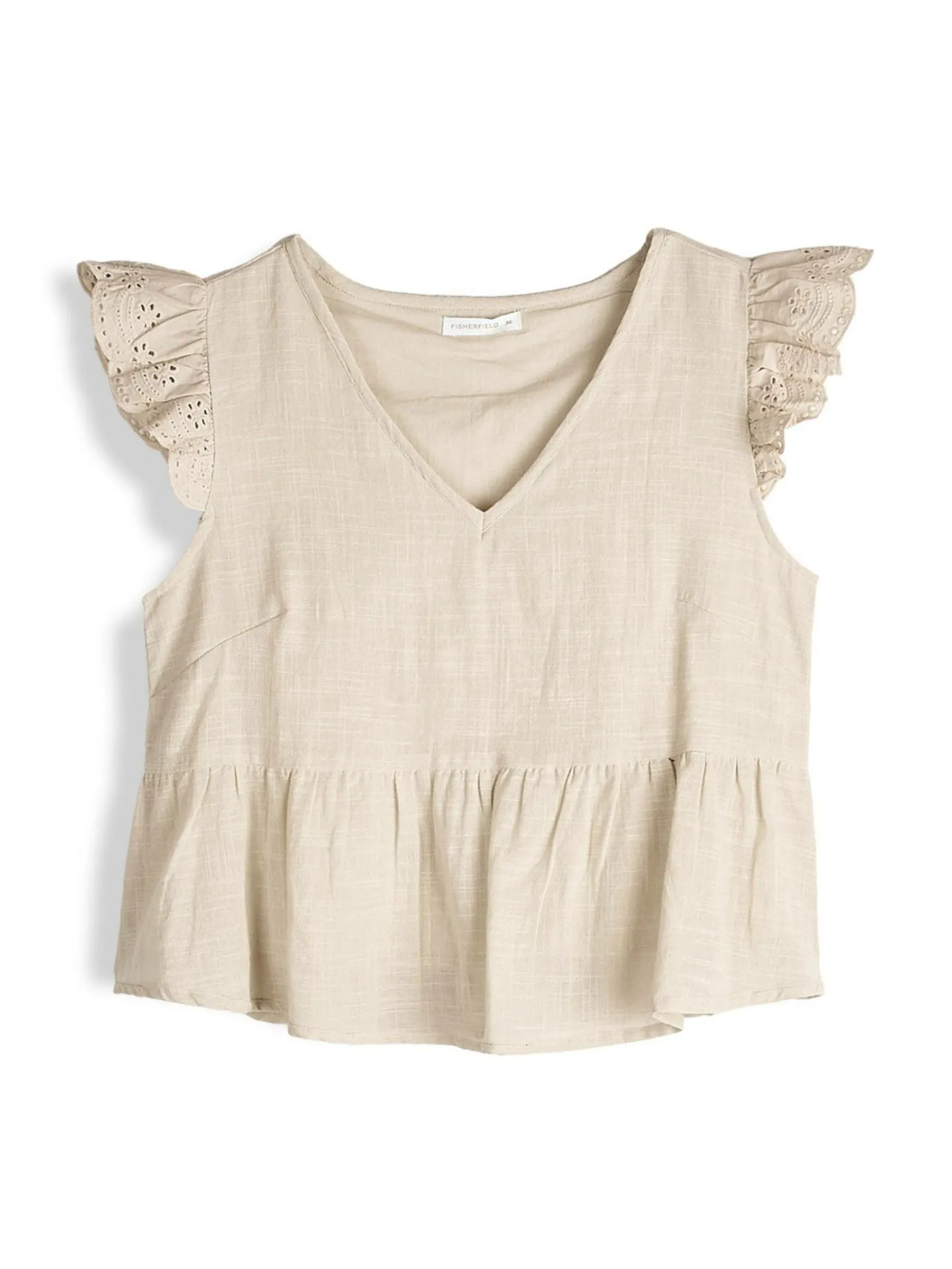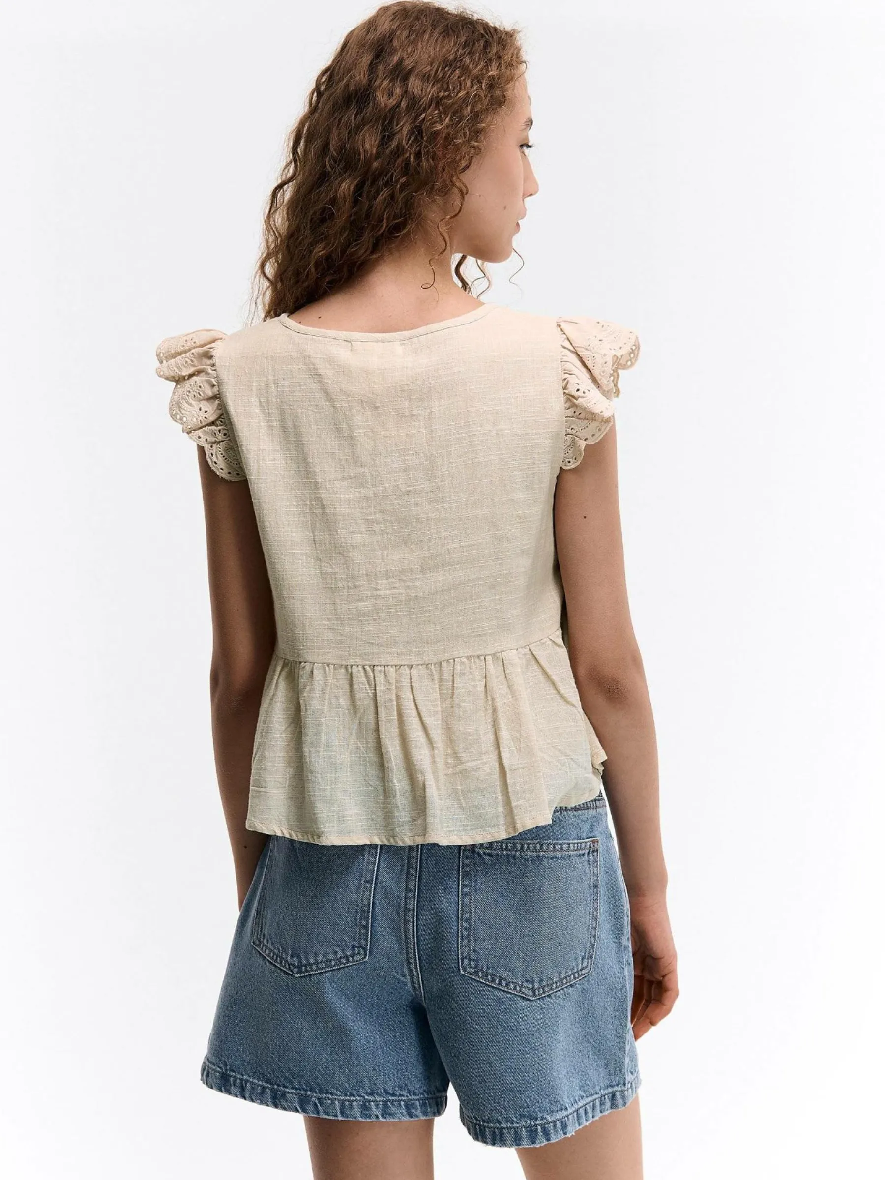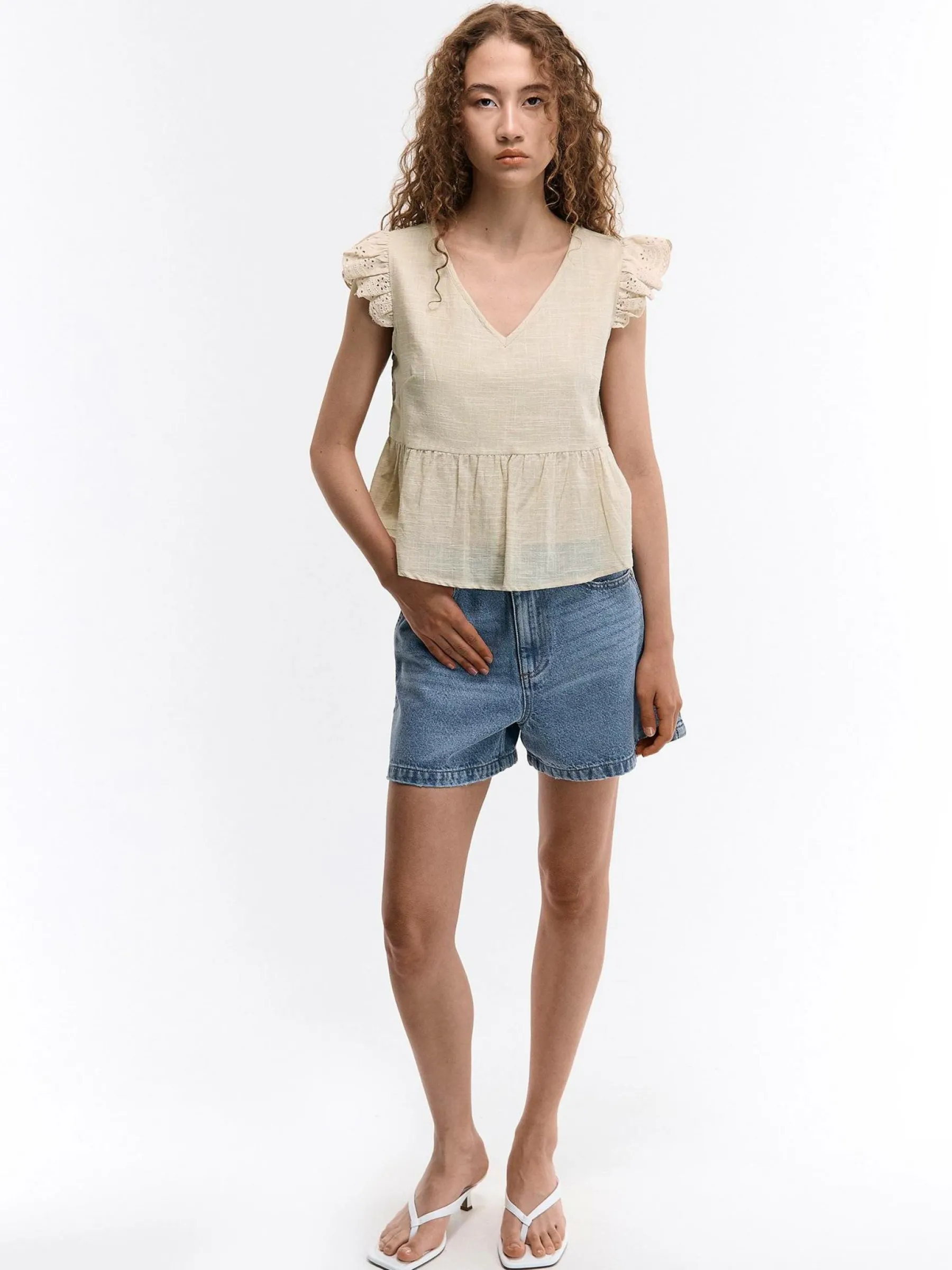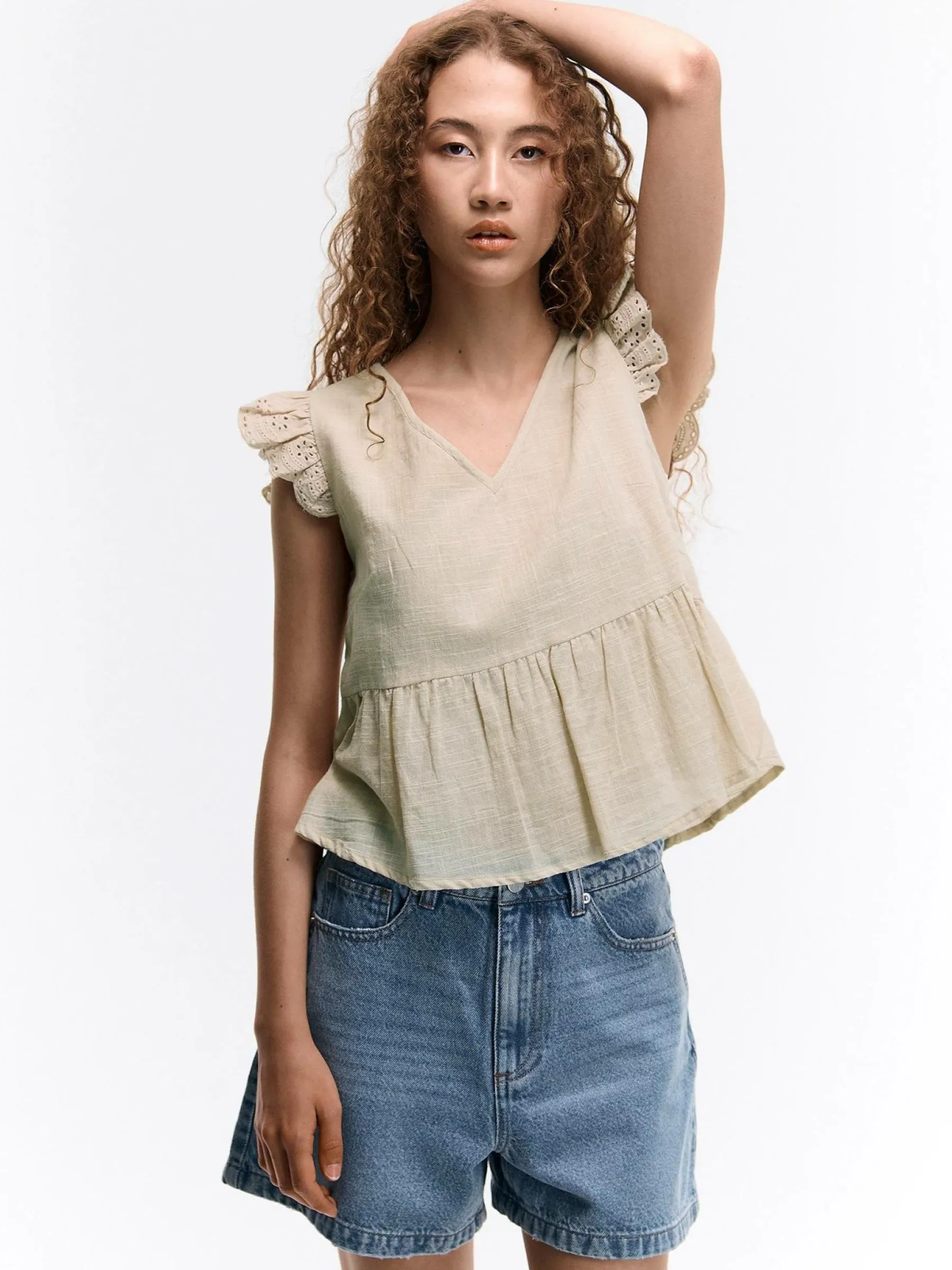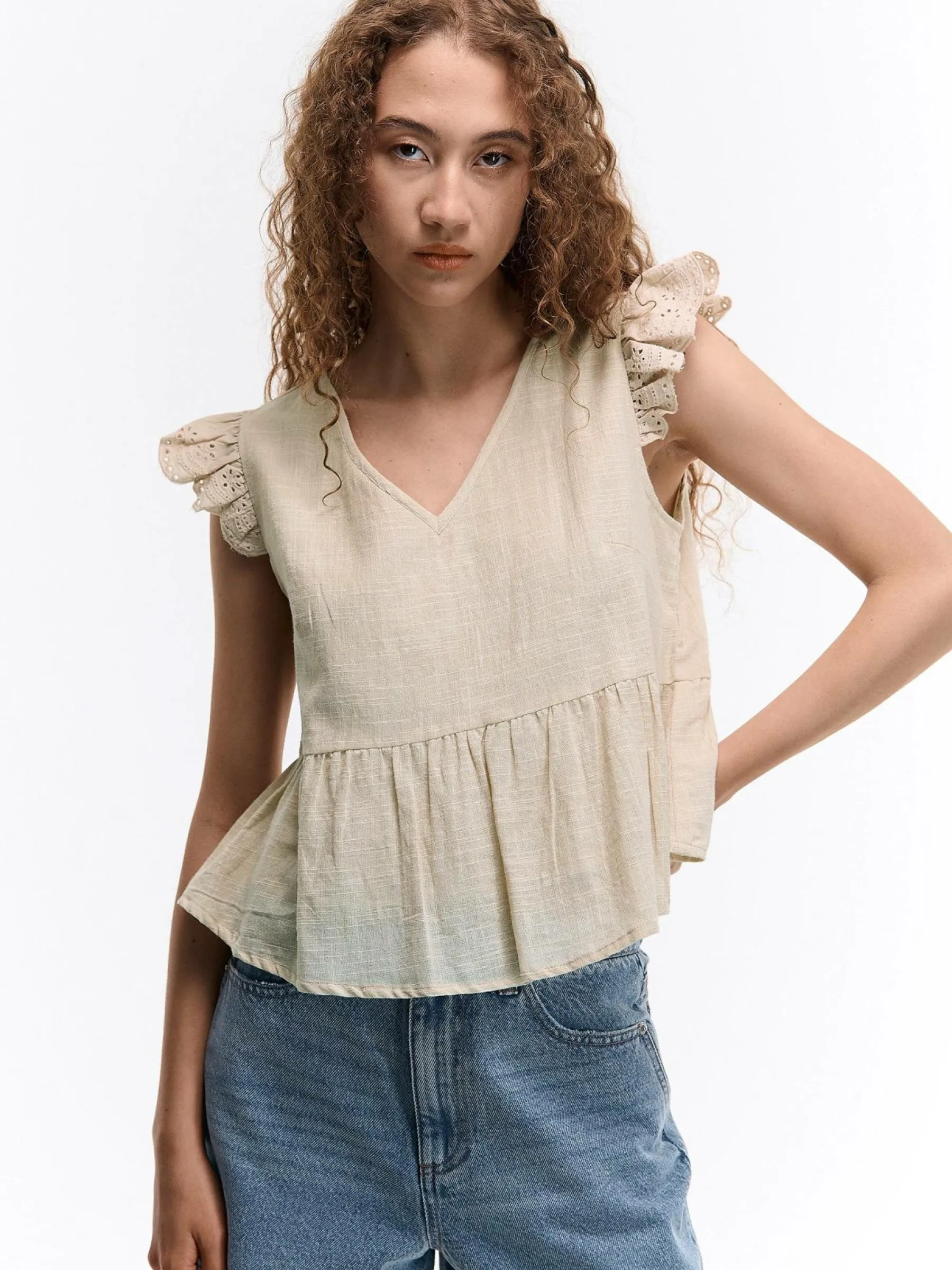 Kolor: beżowyKrój: z falbanąTyp: bluzkaRekaw: bez rękawówDługość: krótkiPattern style: pojedynczy kolorDetal: v…