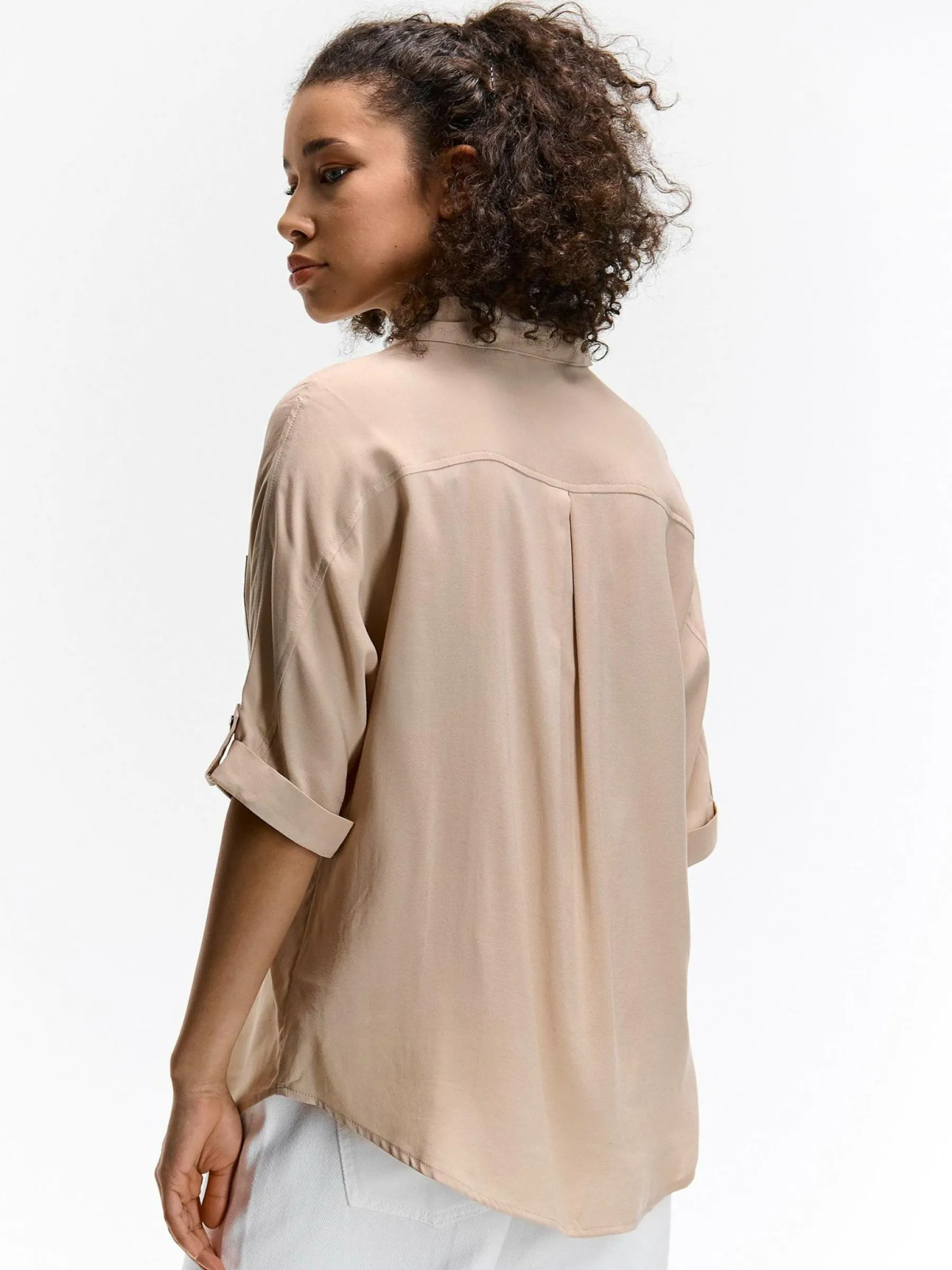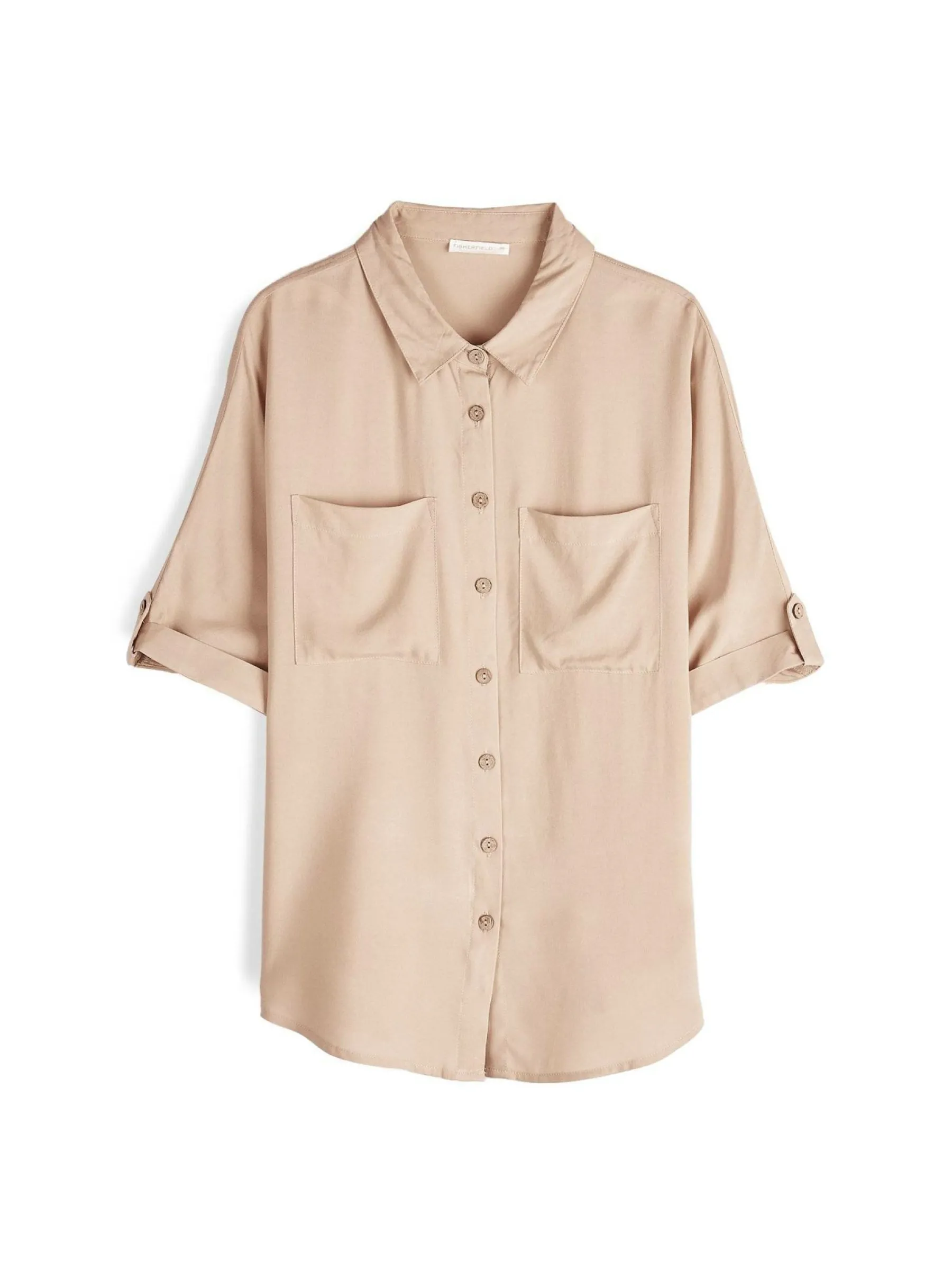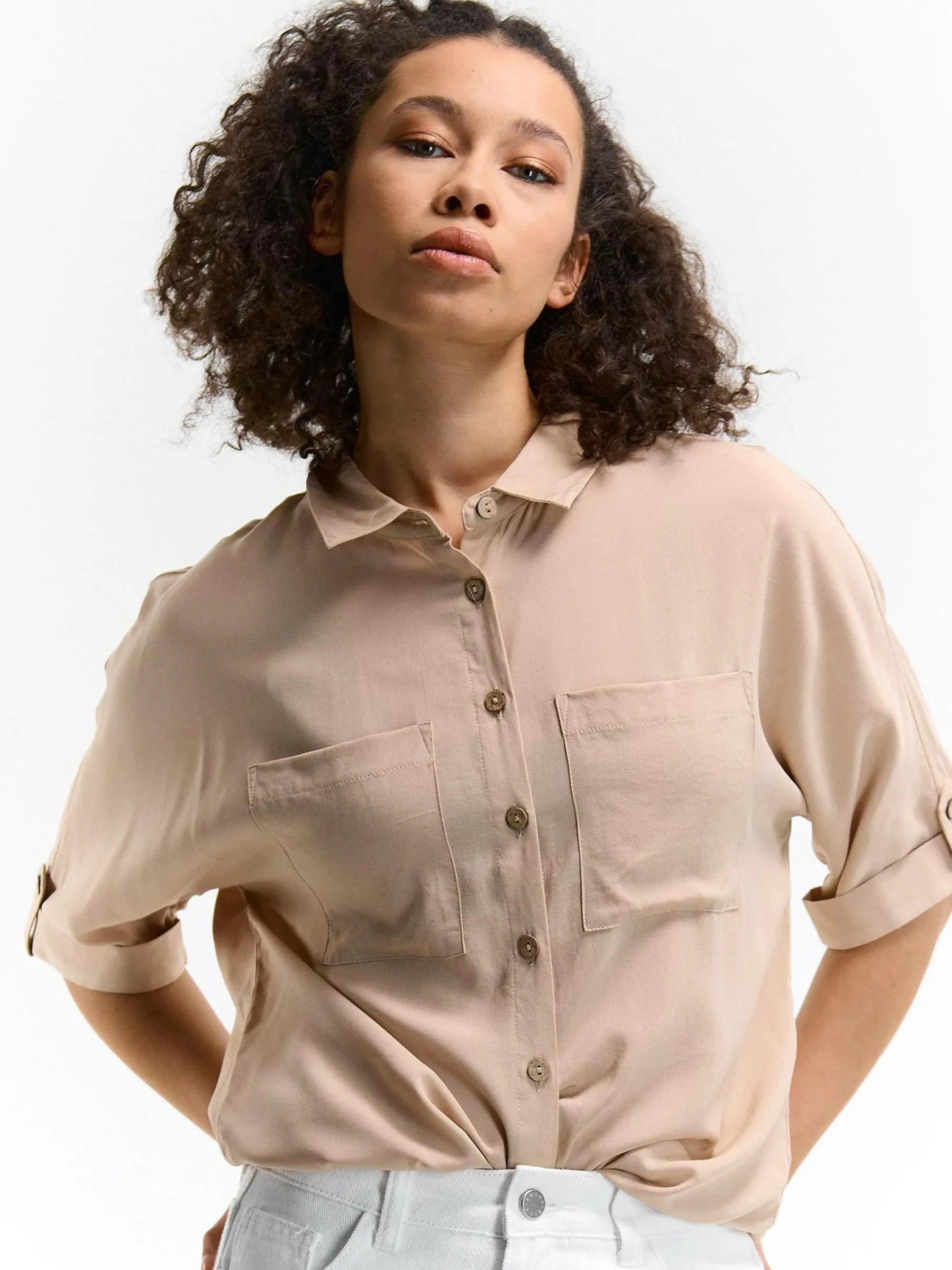 Kolor: beżowyKrój: regularTyp: bluzkaRekaw: krótki rękawDługość: dlugiePattern style: pojedynczy kolorDetal: na g…