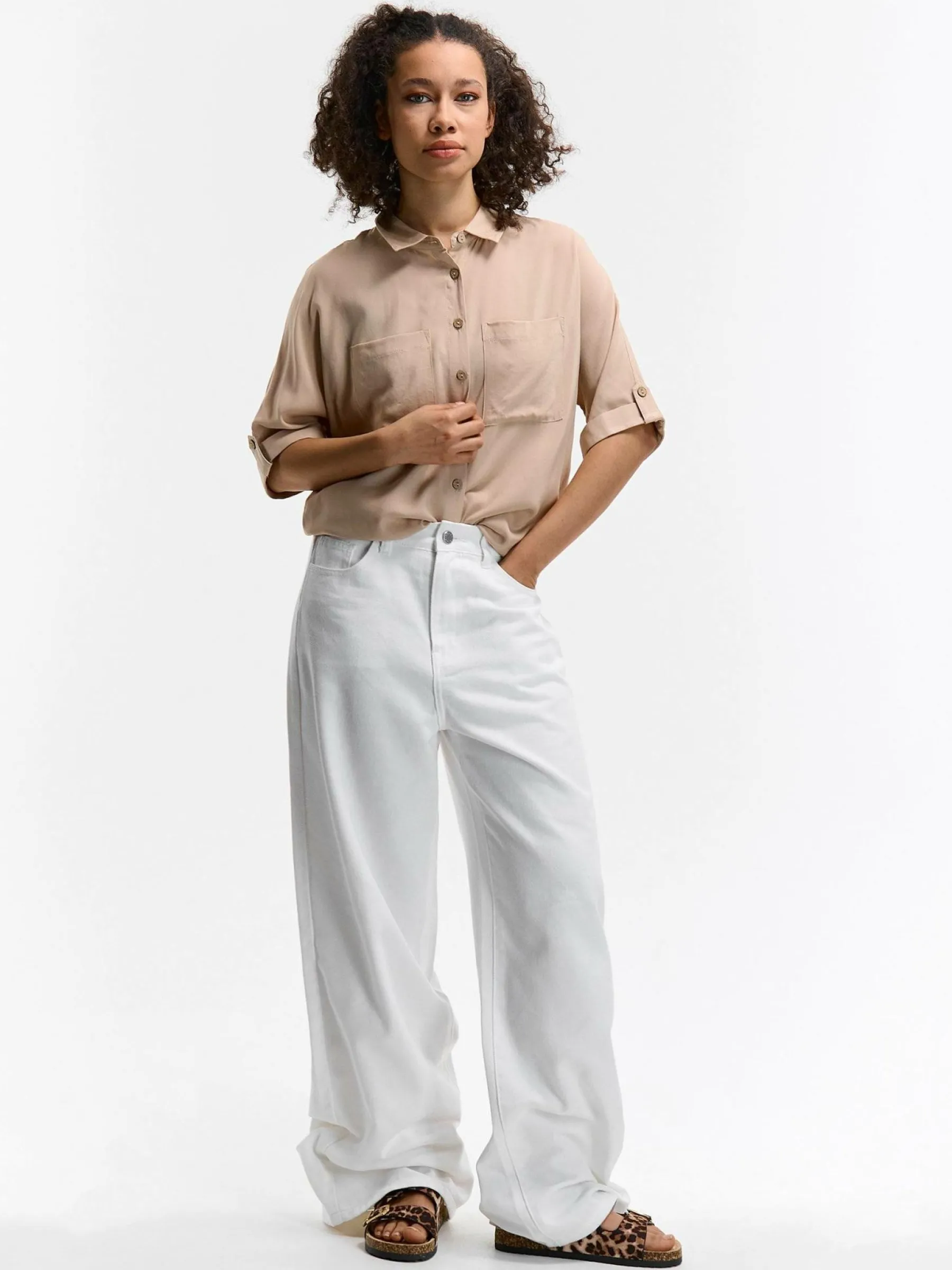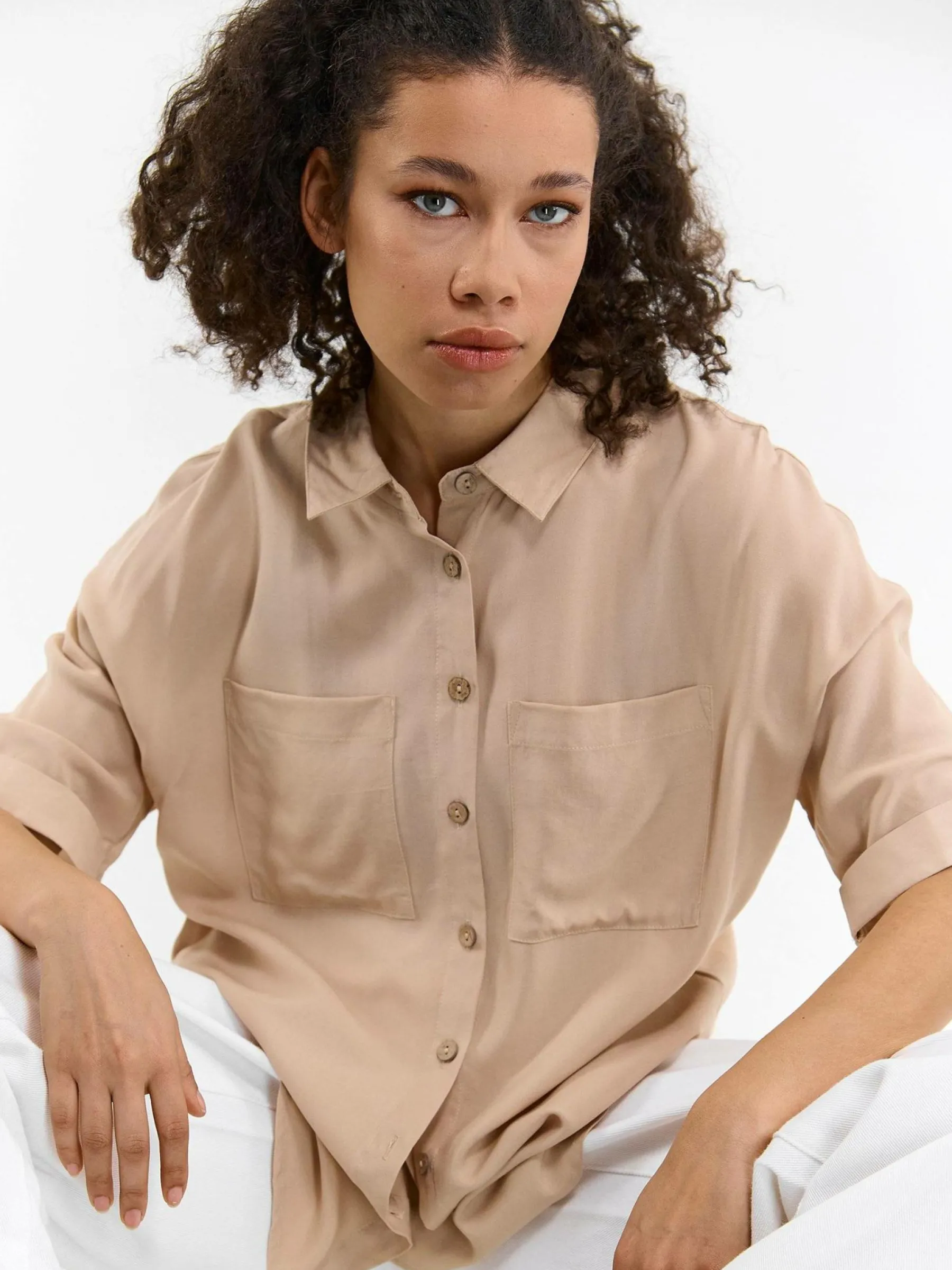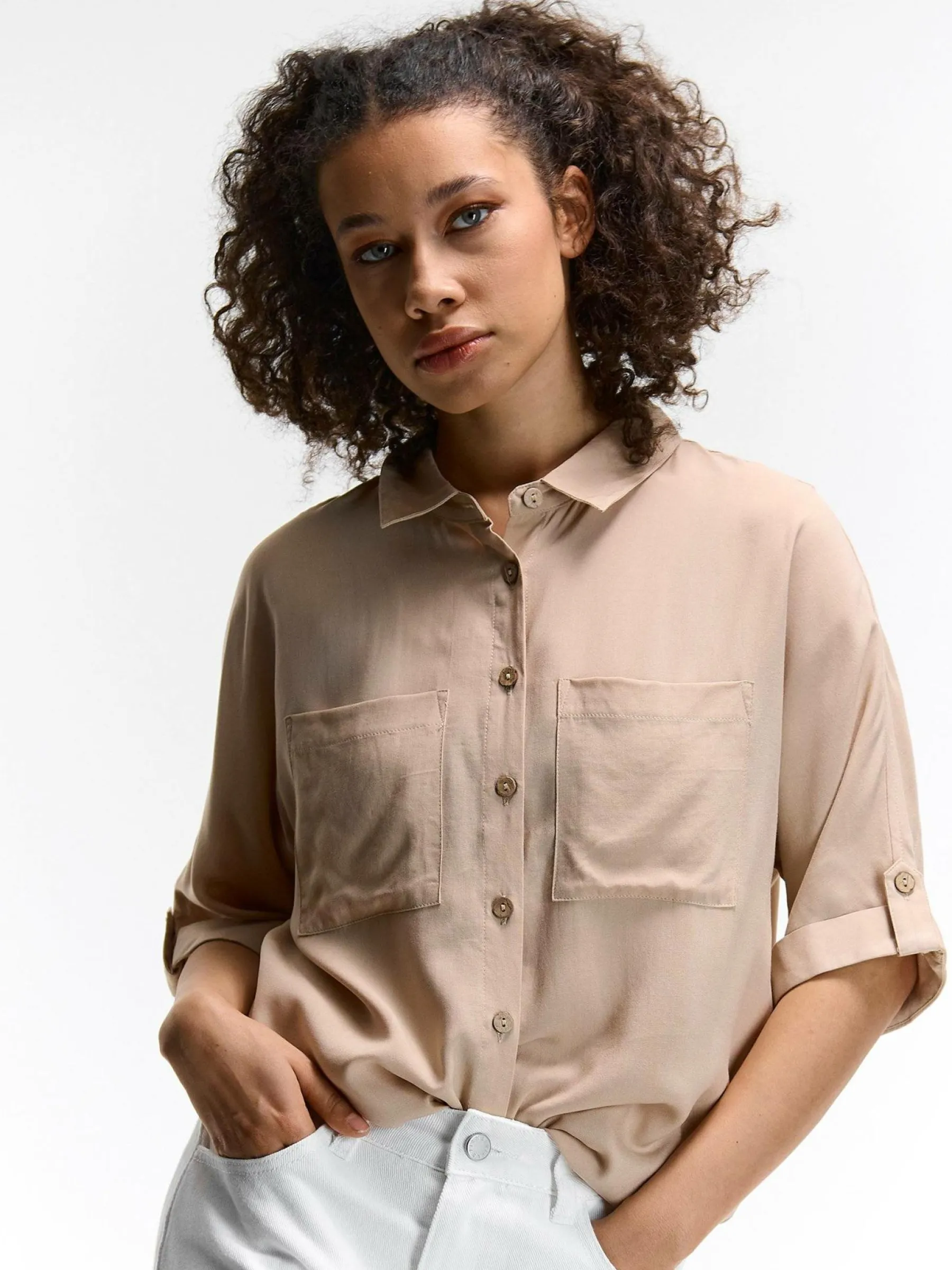Kolor: beżowyKrój: regularTyp: bluzkaRekaw: krótki rękawDługość: dlugiePattern style: pojedynczy kolorDetal: na g…