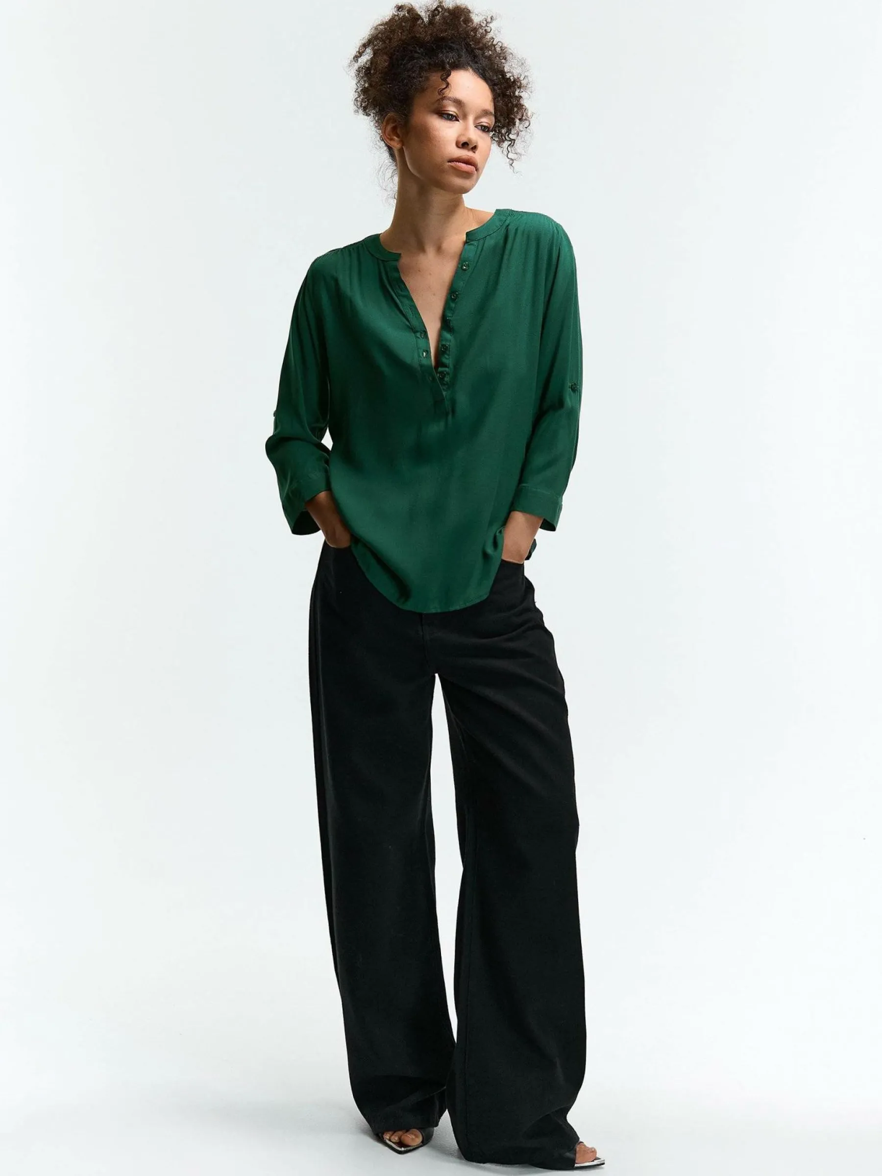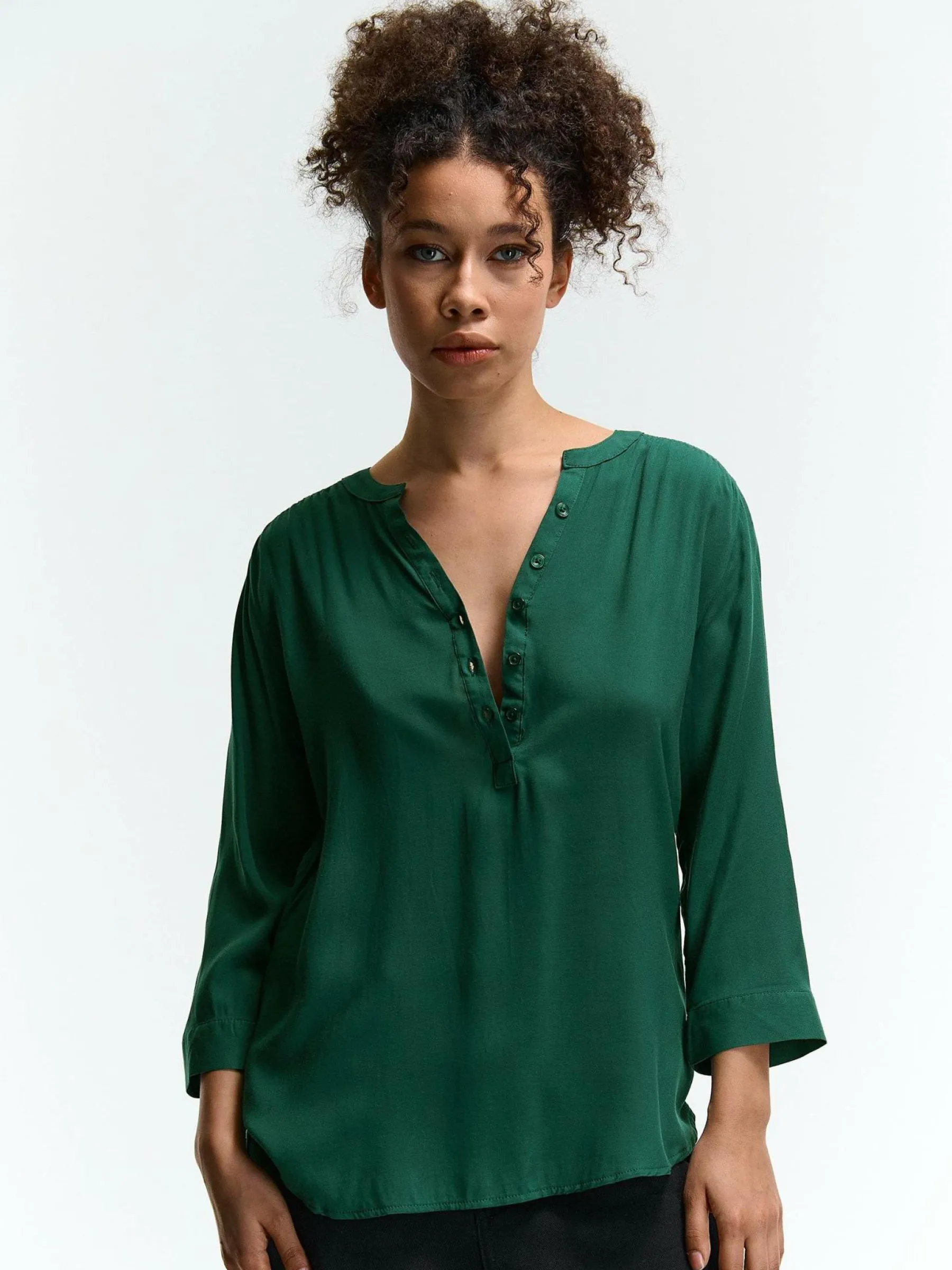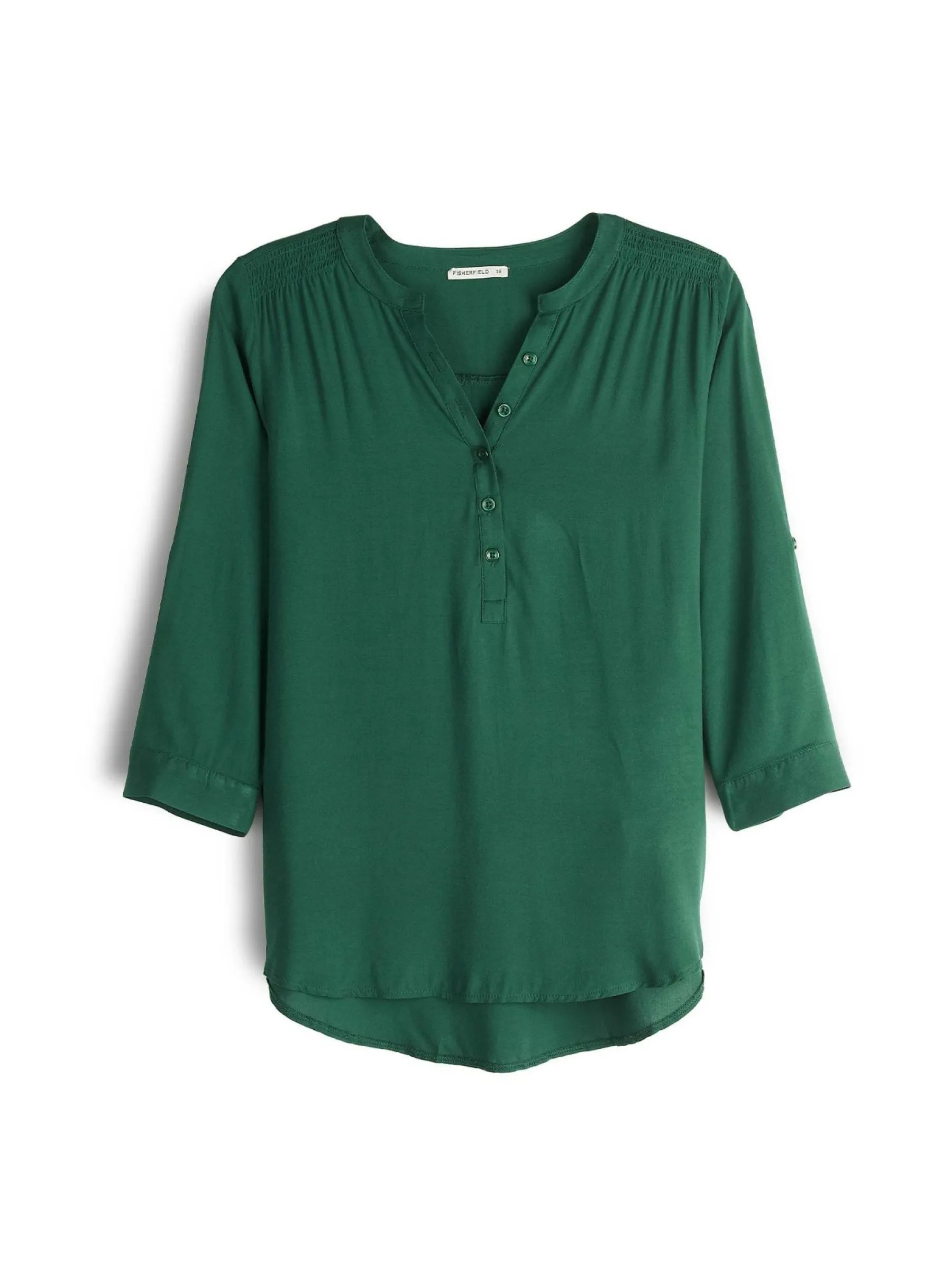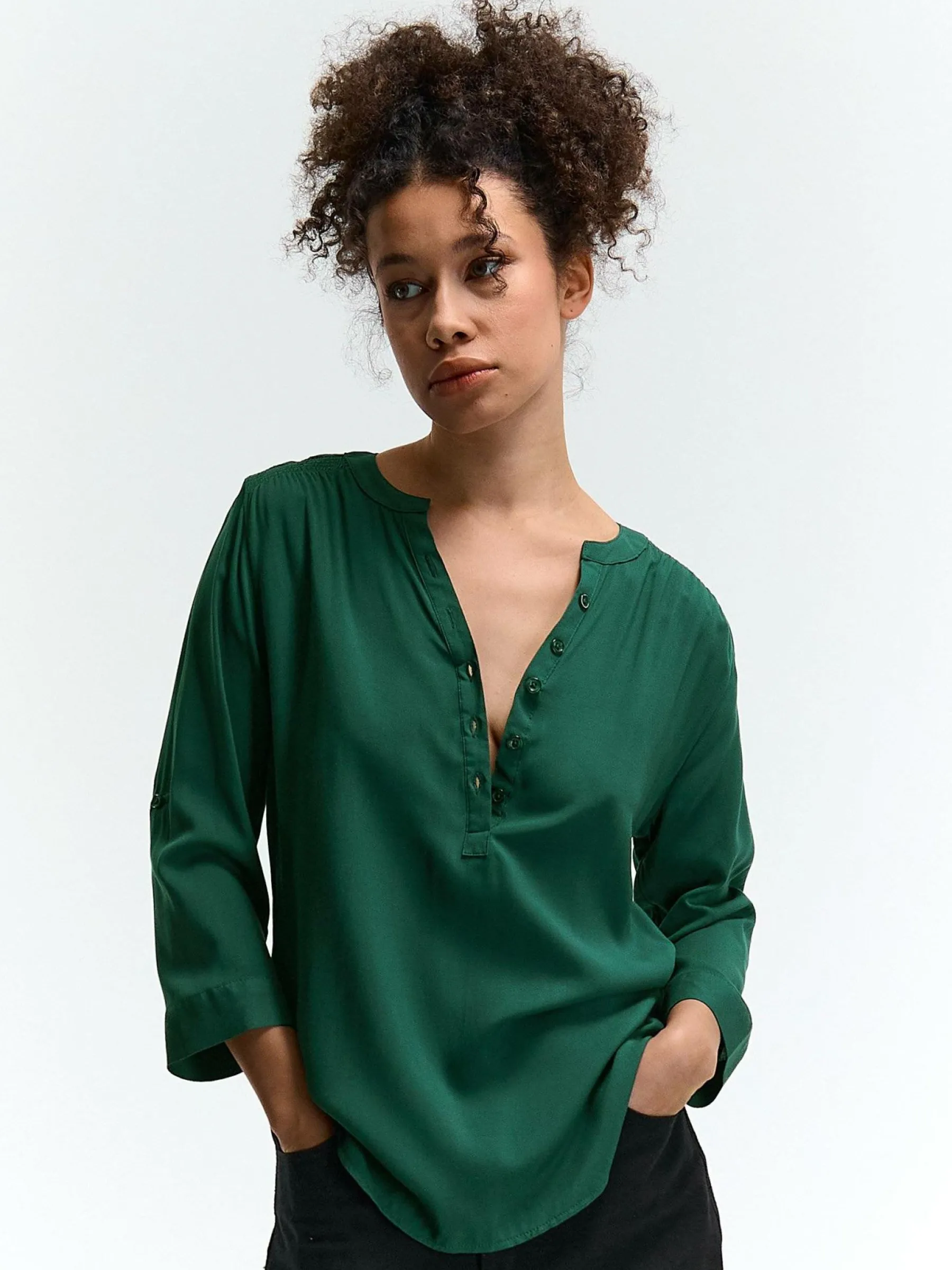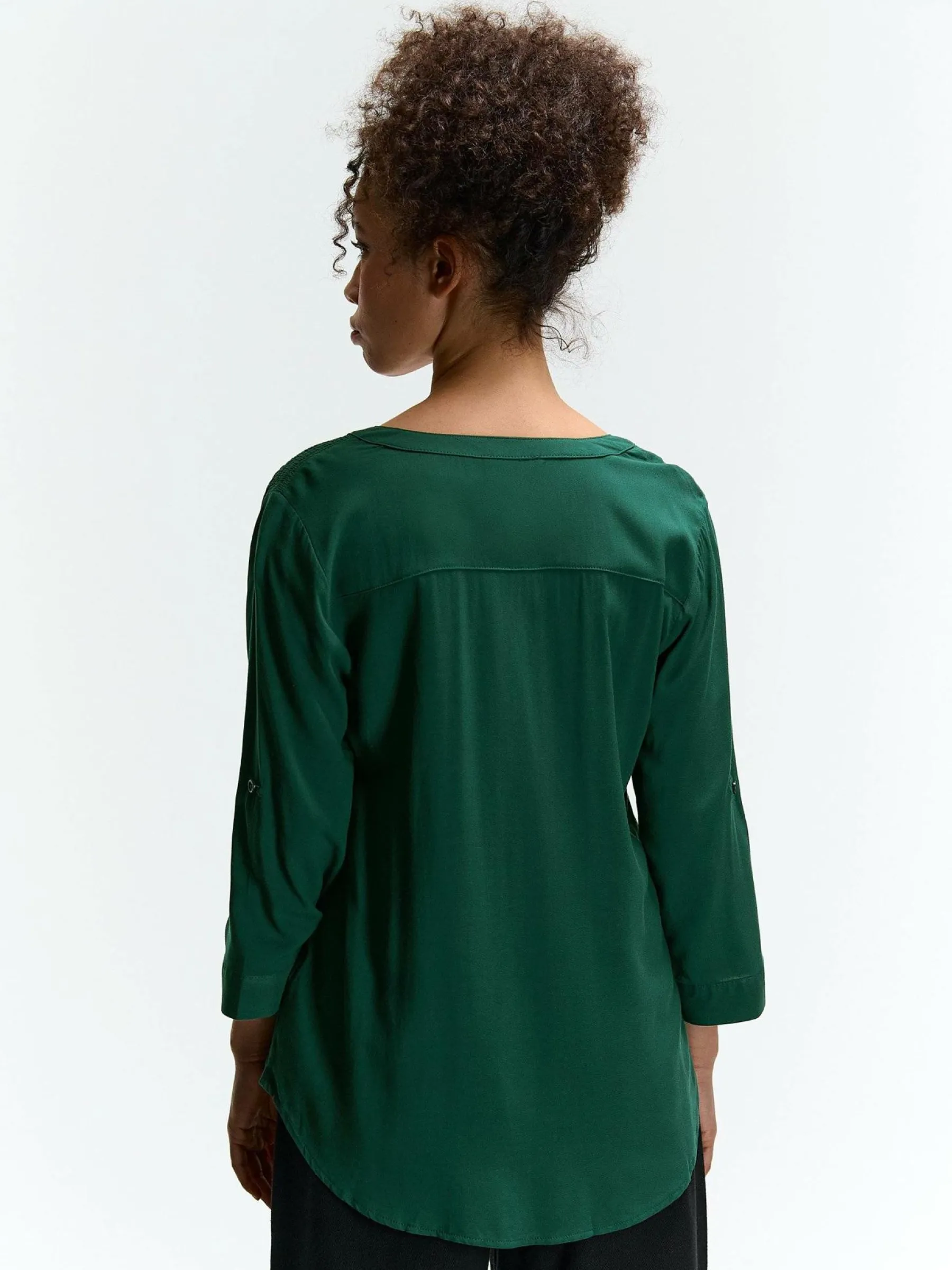 Kolor: zielonyKrój: regularTyp: bluzkaRekaw: rękaw 3/4Długość: krótkiPattern style: pojedynczy kolorDetal: z falba…