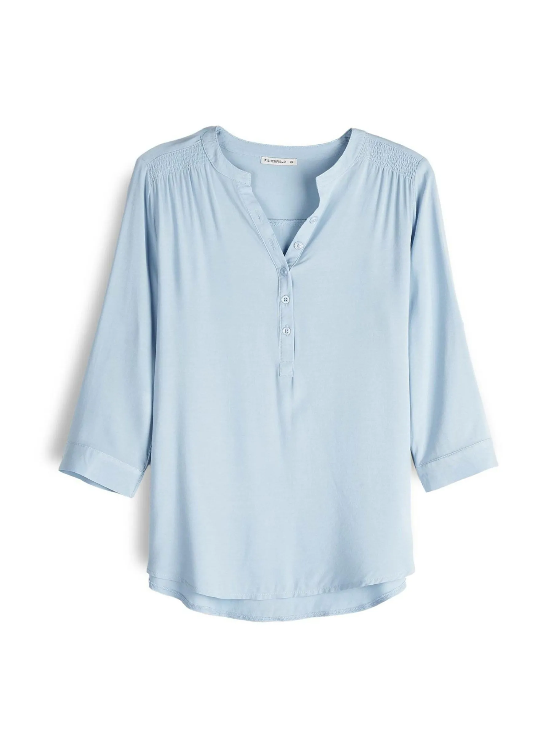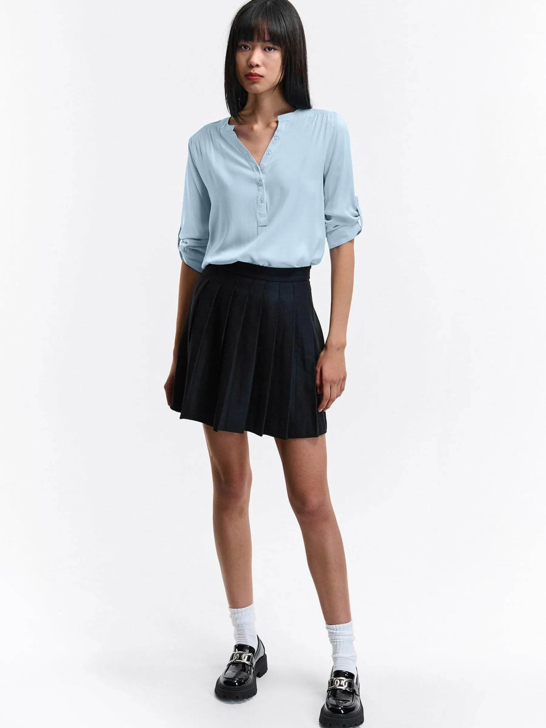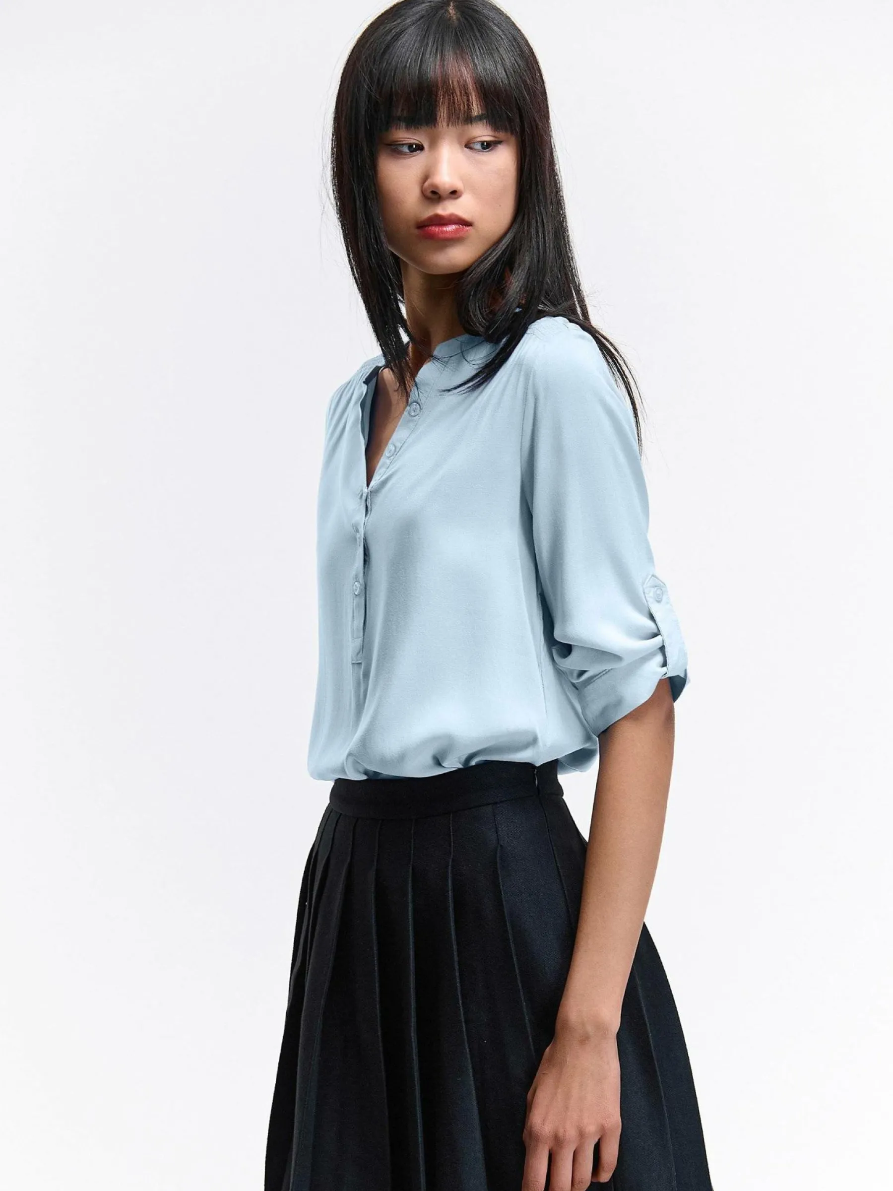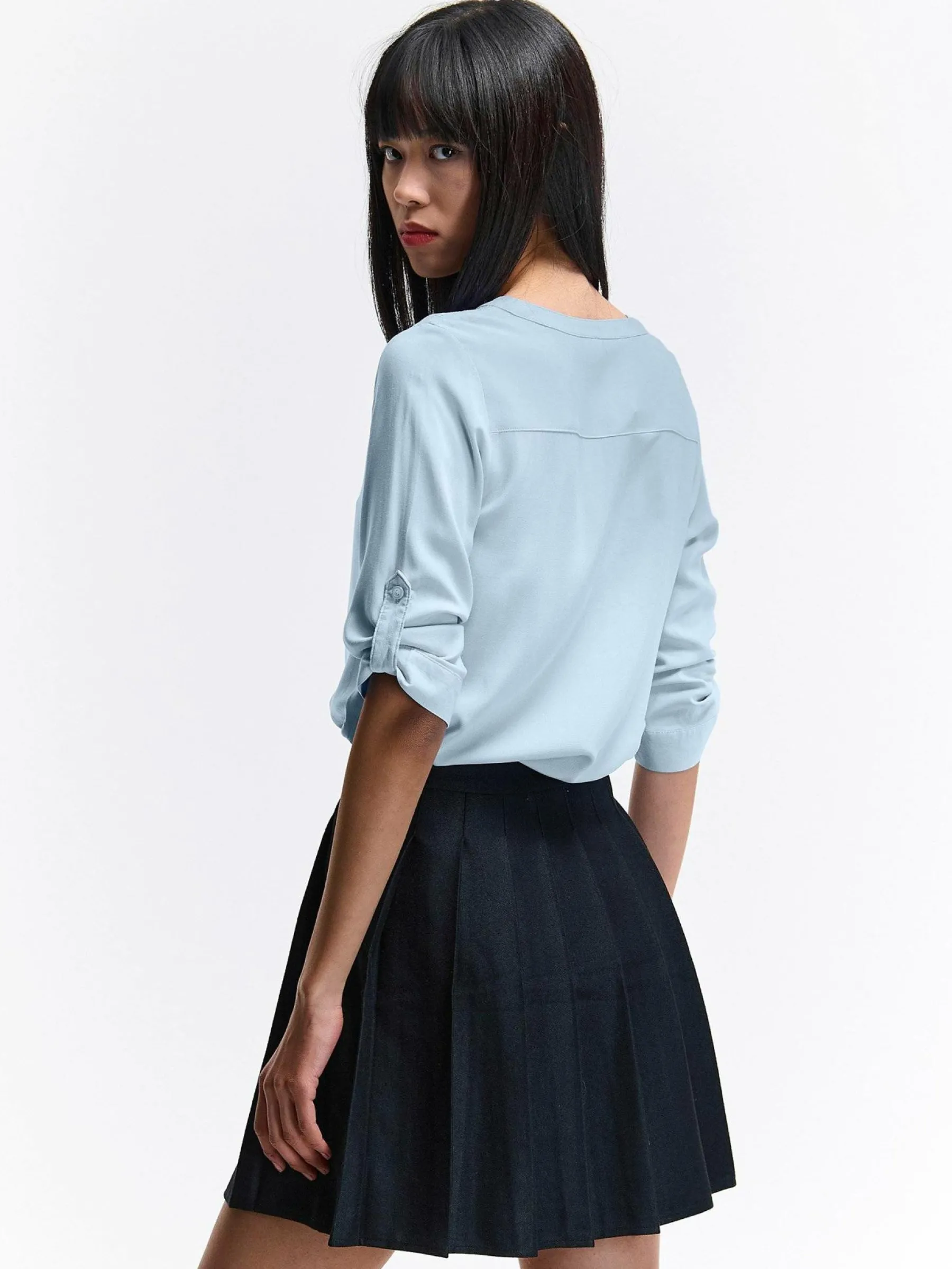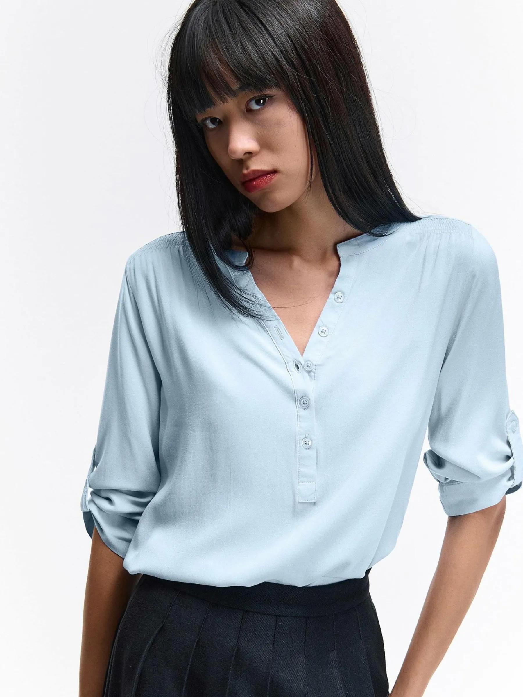 Kolor: niebieskiKrój: regularTyp: bluzkaRekaw: rękaw 3/4Długość: krótkiPattern style: pojedynczy kolorDetal: na gu…