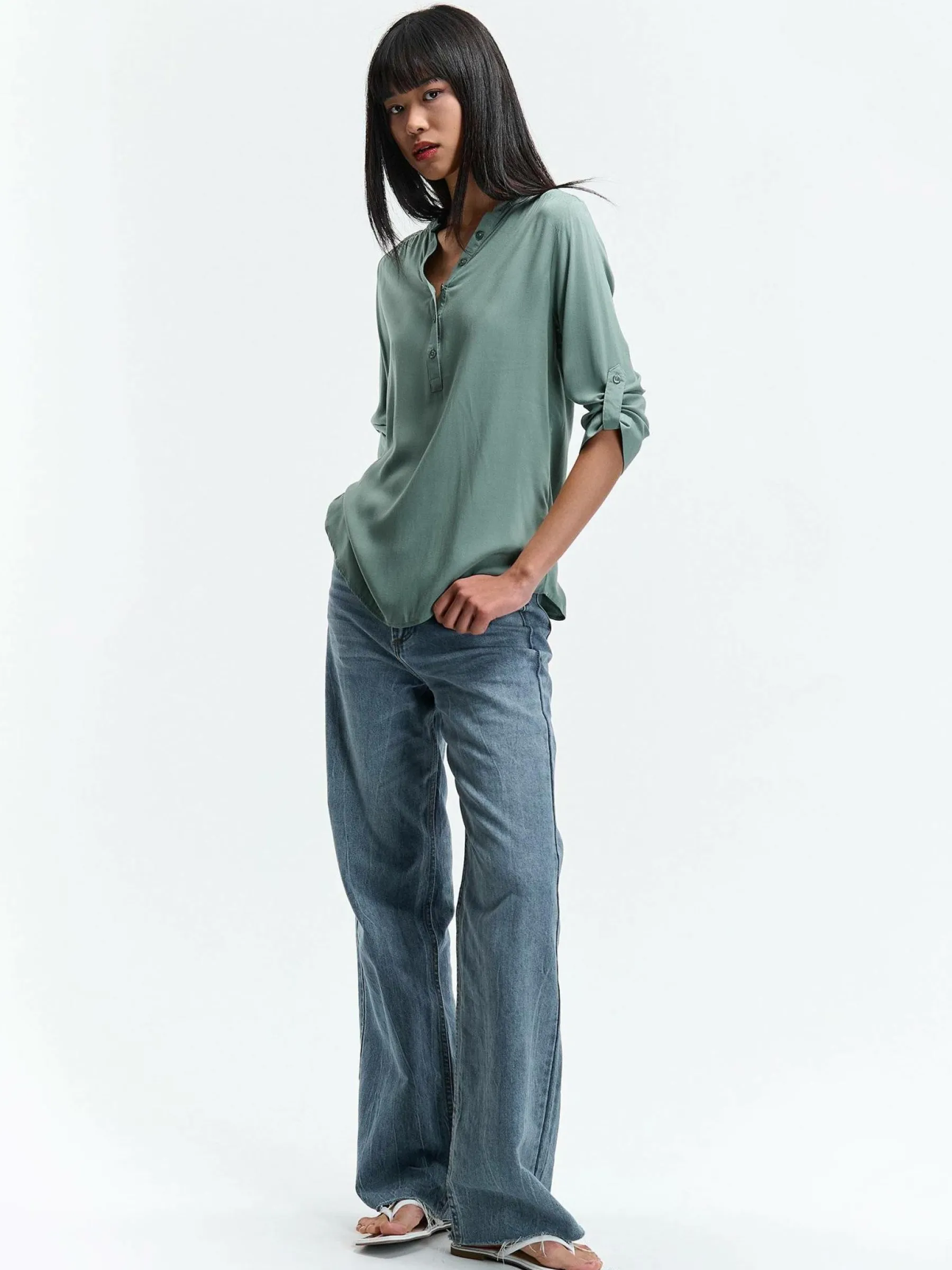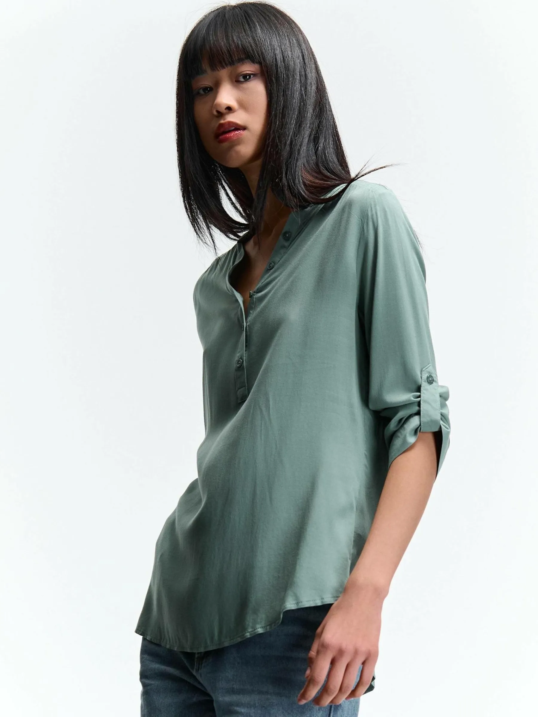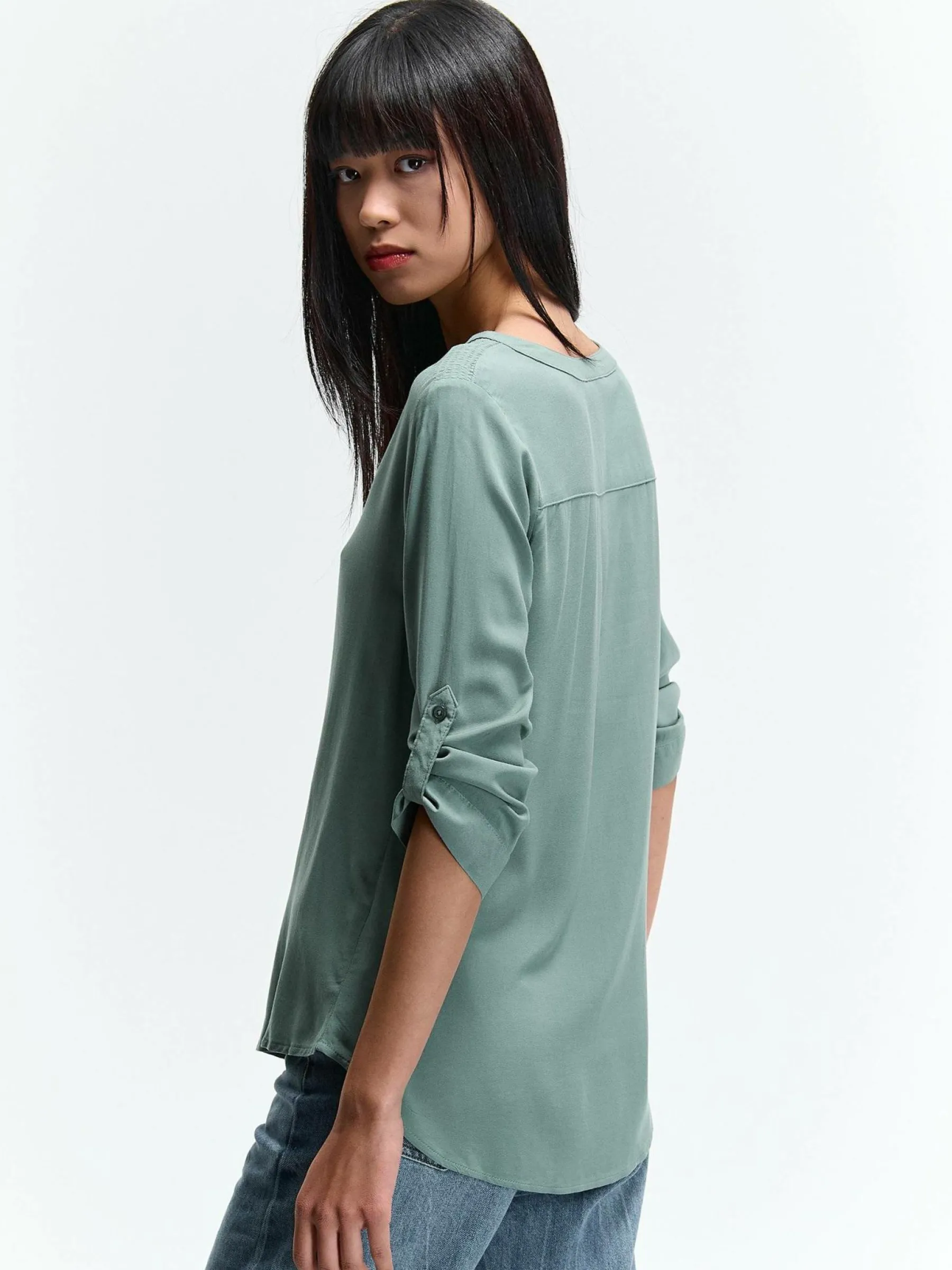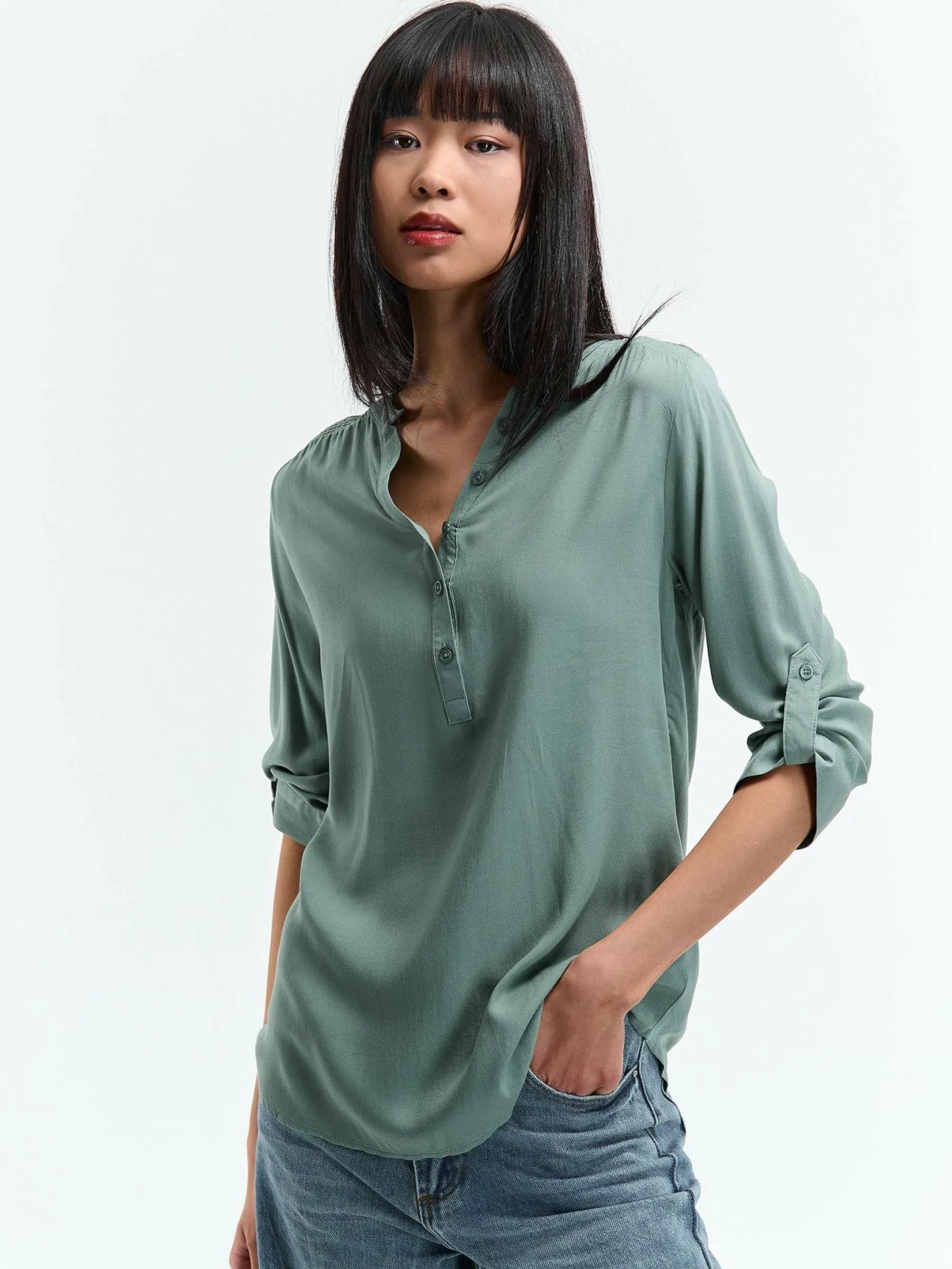Kolor: zielonyKrój: regularTyp: bluzkaRekaw: rękaw 3/4Długość: krótkiPattern style: pojedynczy kolorDetal: nad gł…
