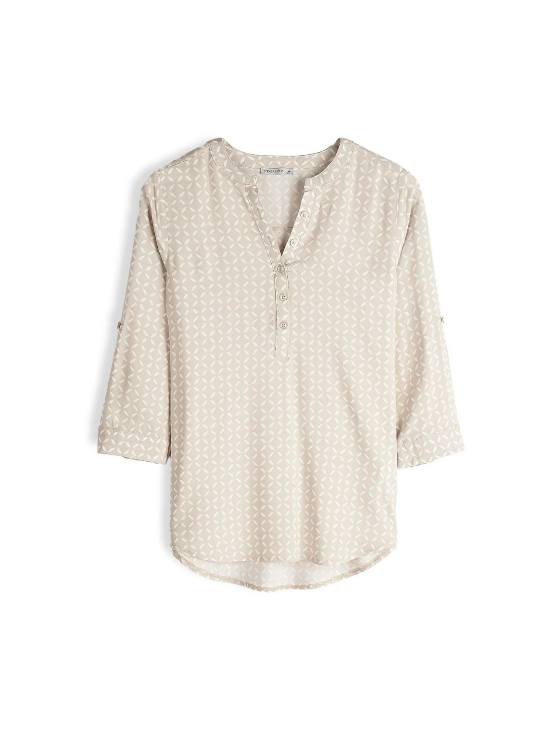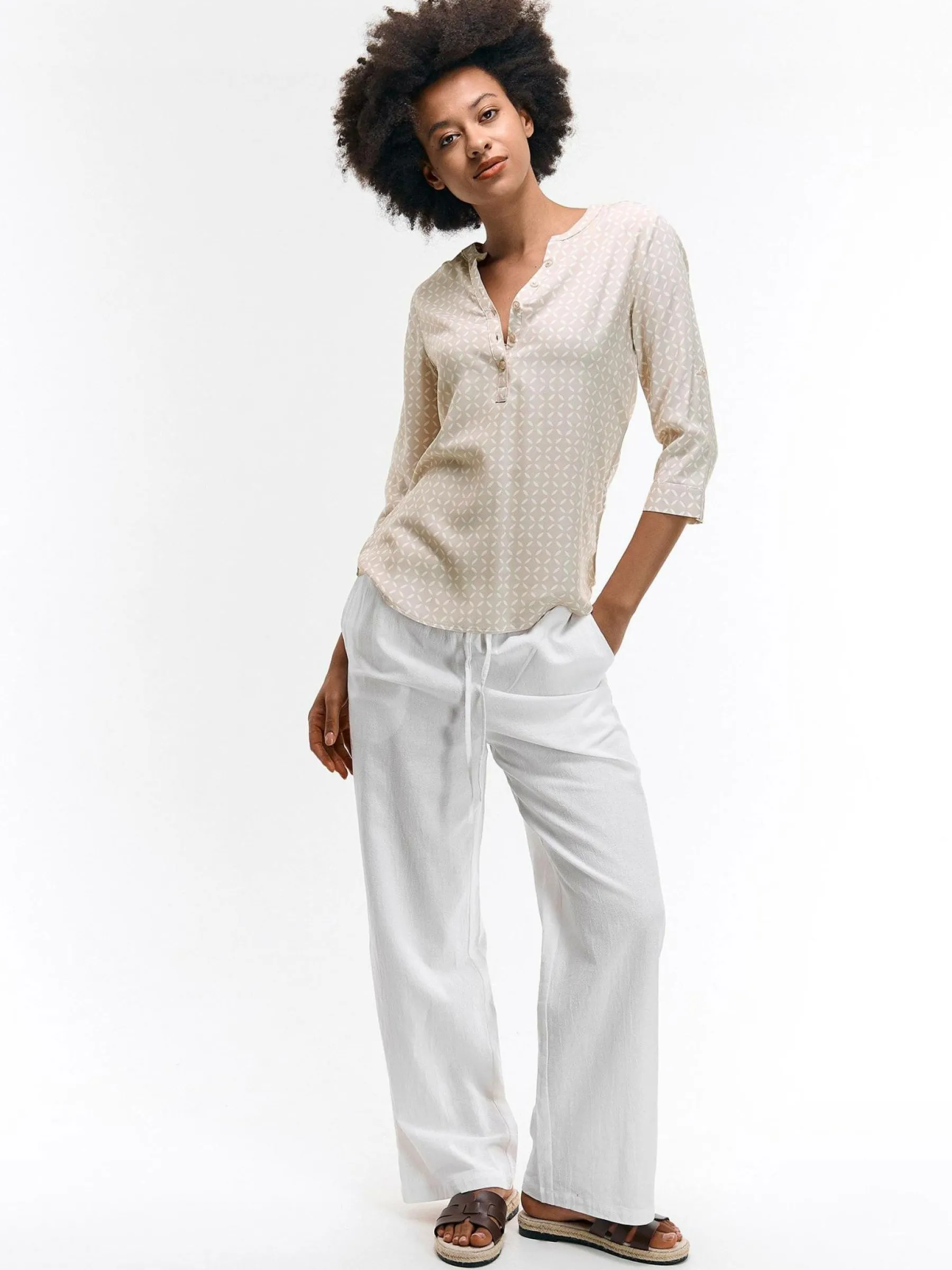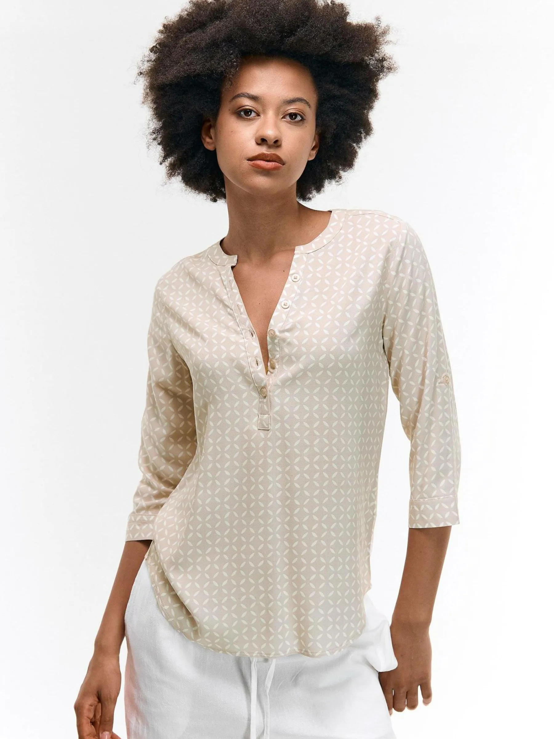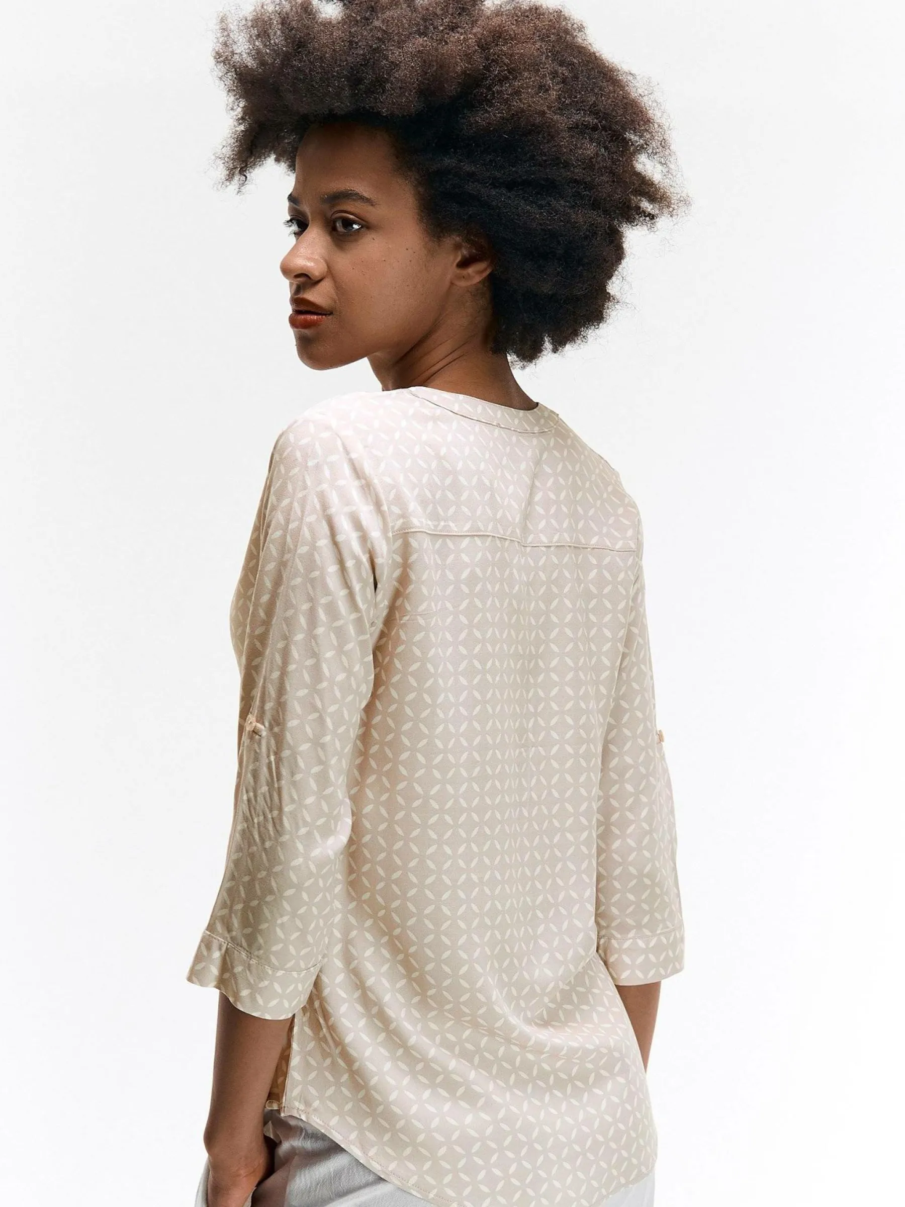 Kolor: beżowyKrój: regularTyp: bluzkaRekaw: rękaw 3/4Długość: krótkiPattern style: wzorzysteDetal: nad głową, n…