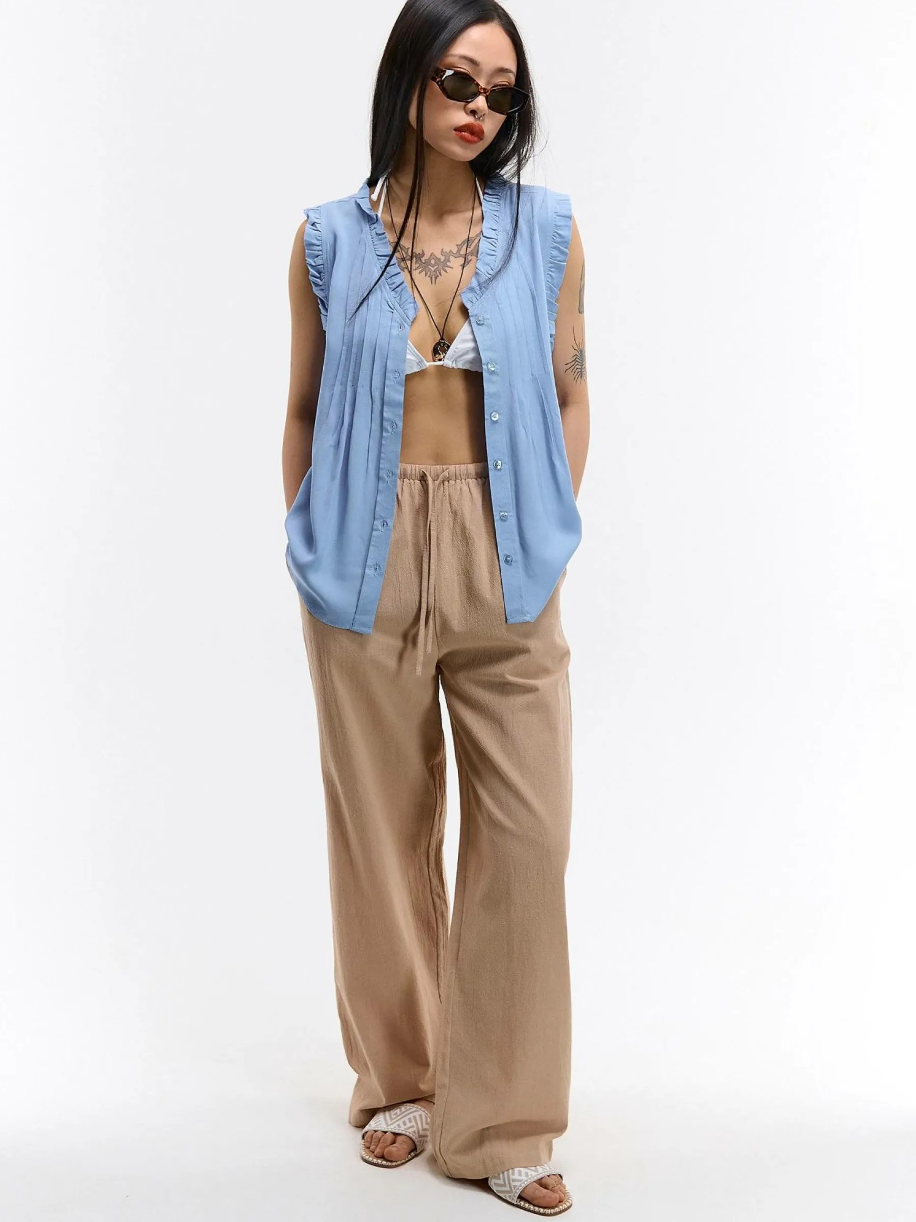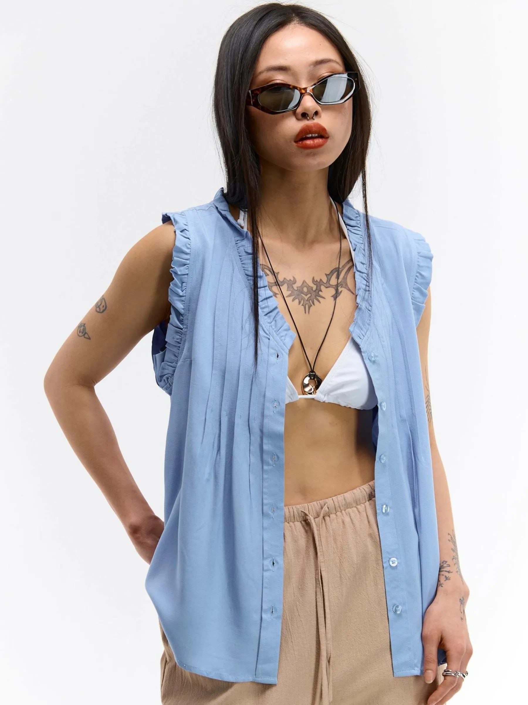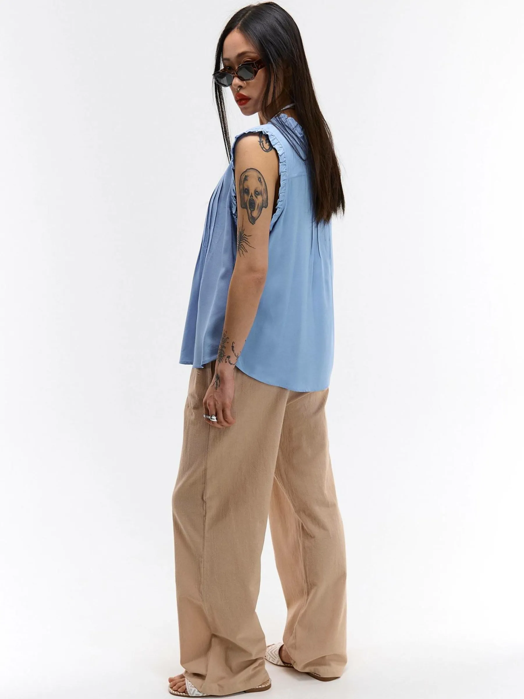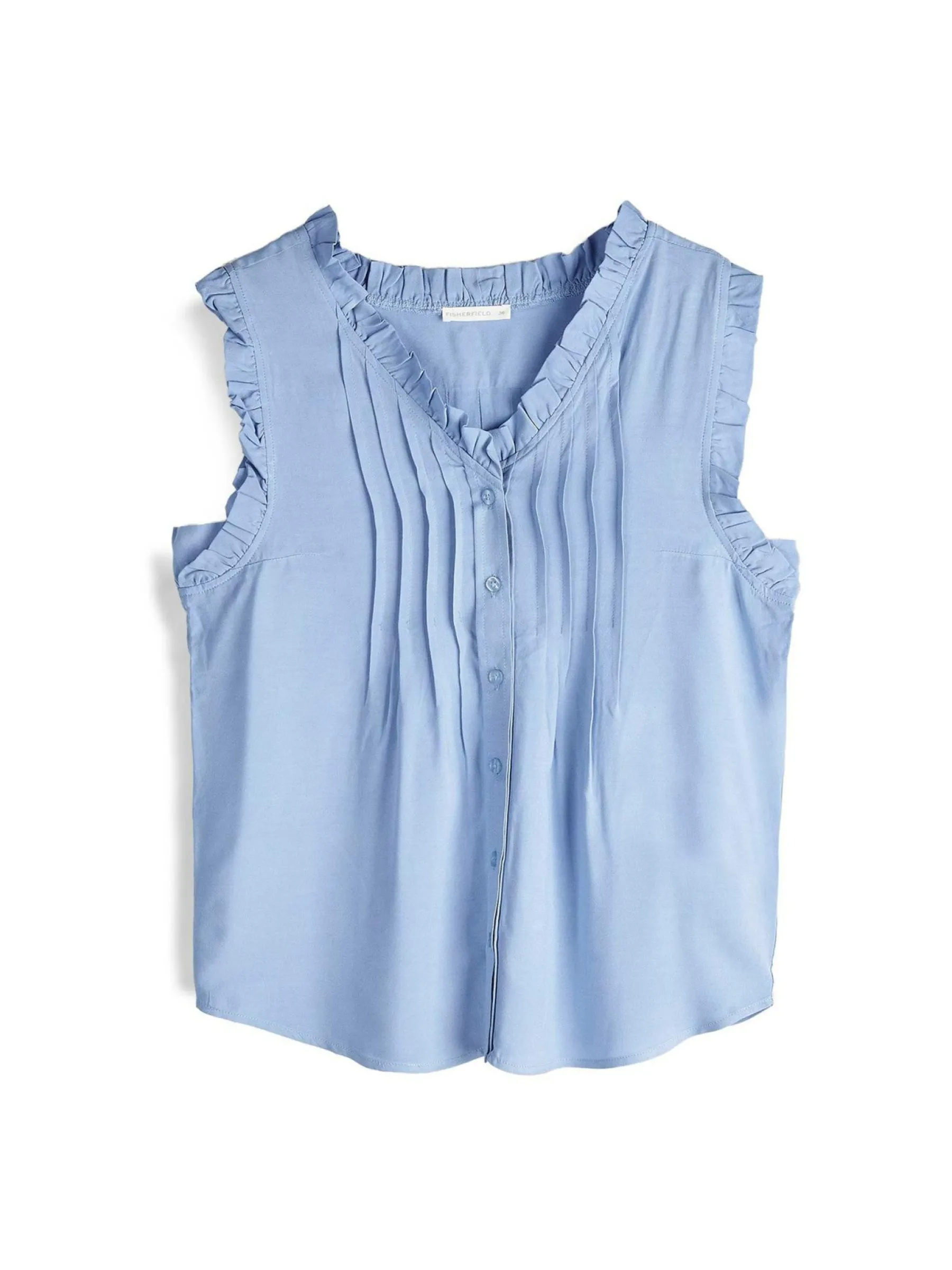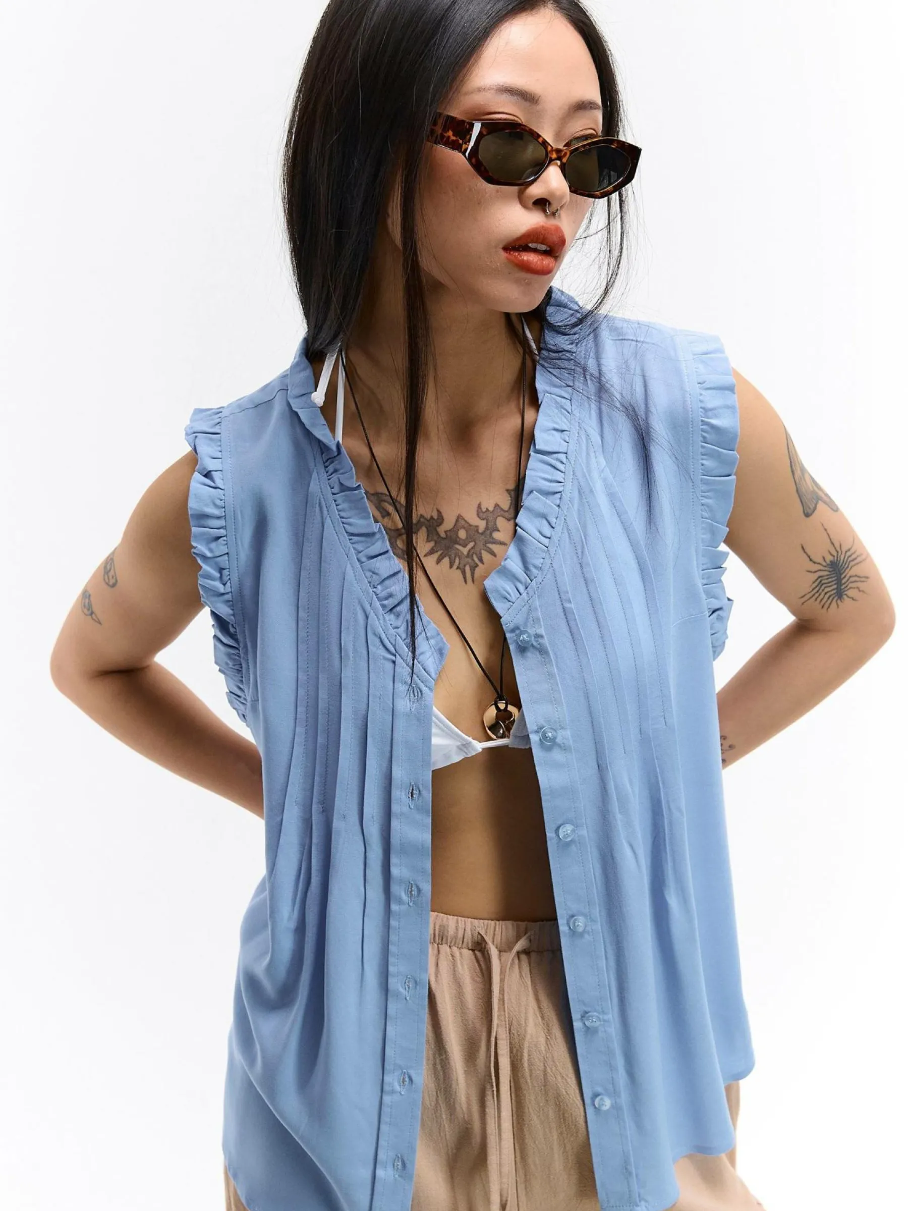 Kolor: niebieskiKrój: z marszczeniemTyp: top, bluzkaRekaw: bez rękawówDługość: krótkiPattern style: pojedynczy ko…