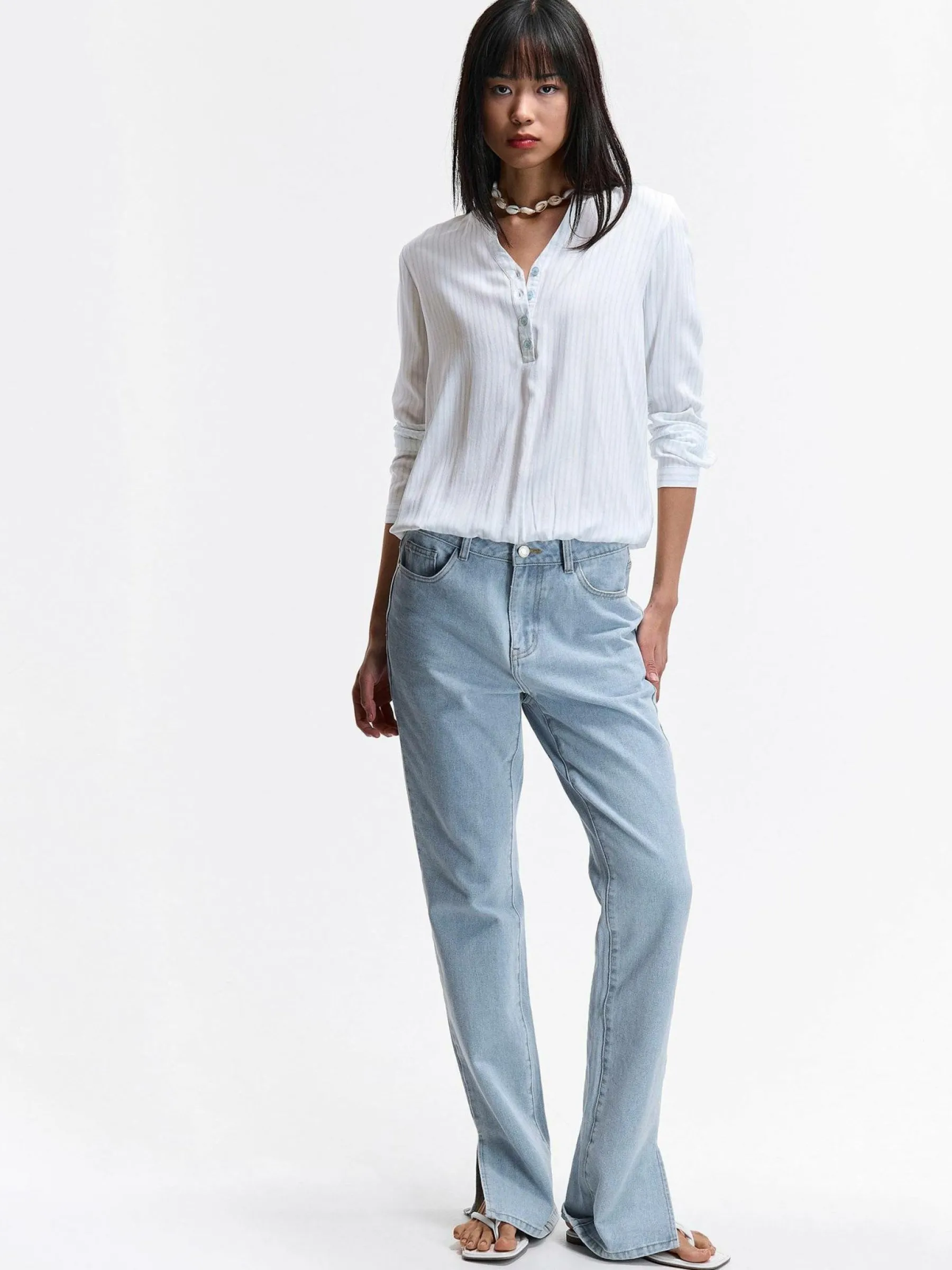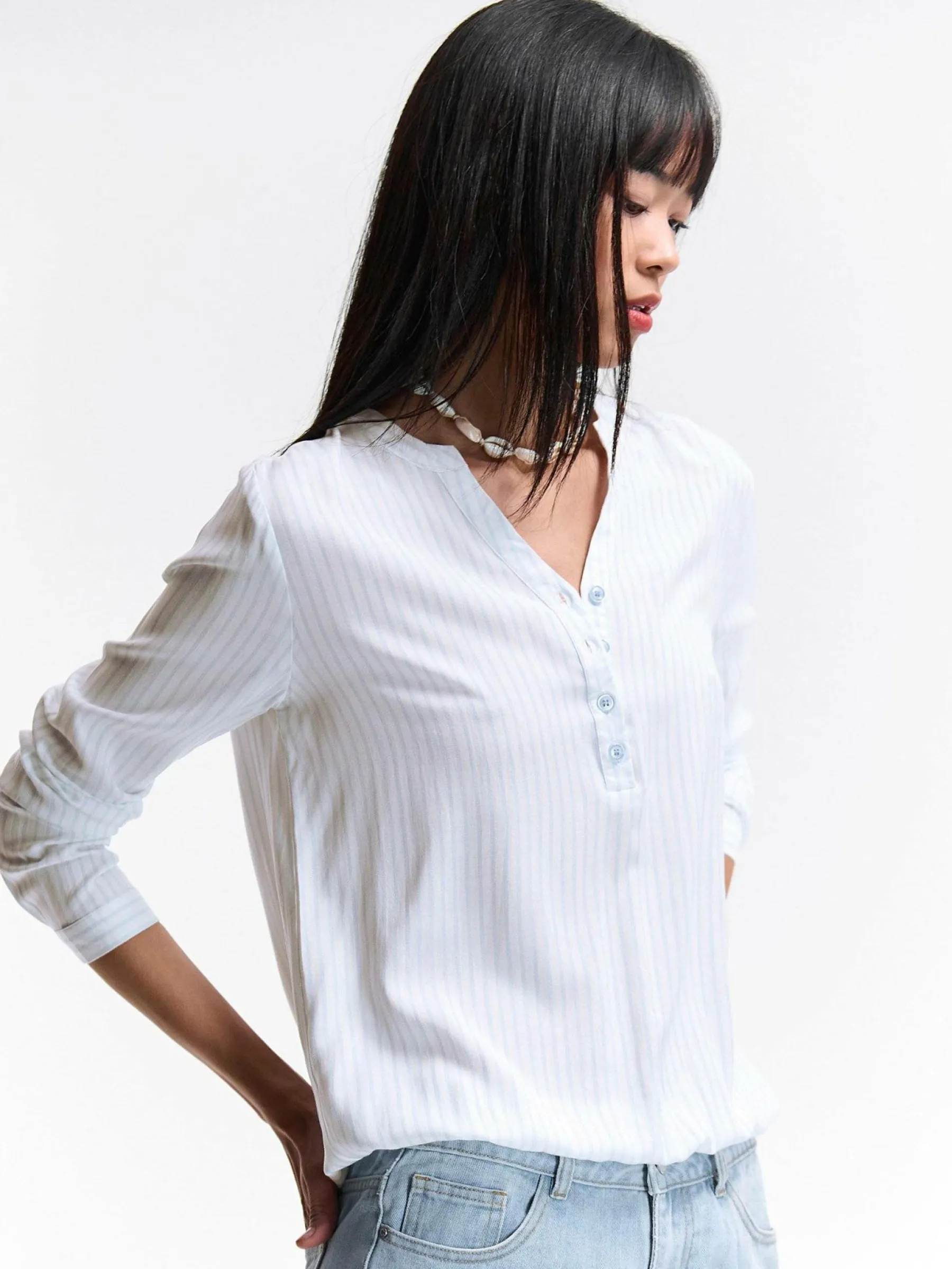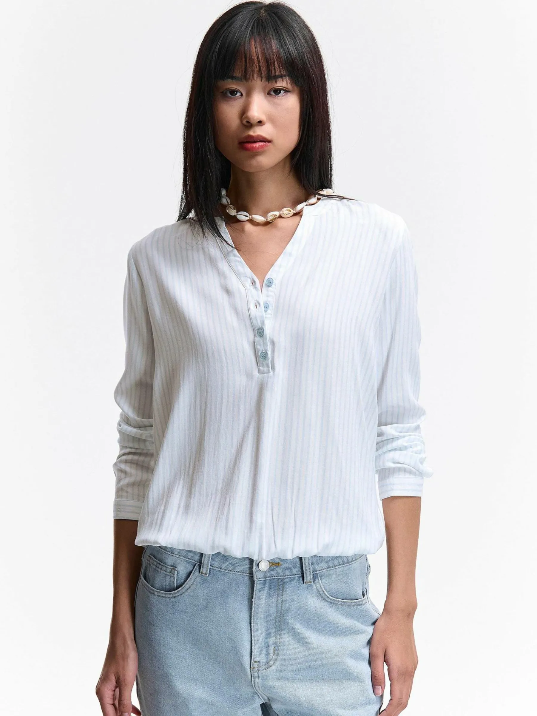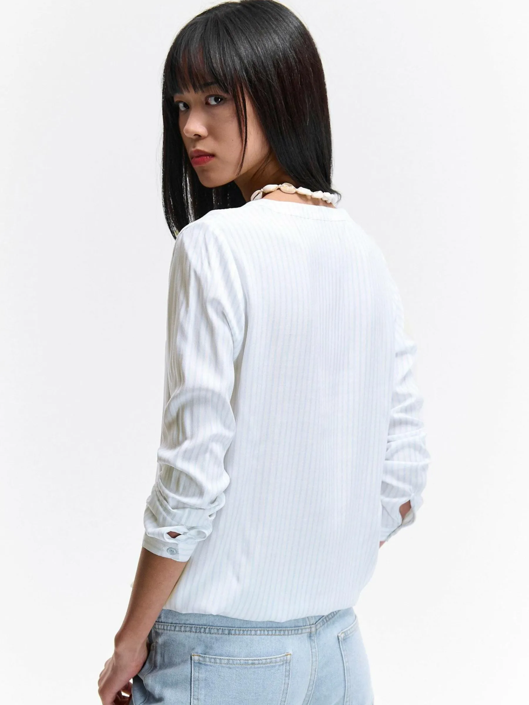 Kolor: niebieski, białyKrój: regularTyp: bluzkaRekaw: długi rękawDługość: krótkiPattern style: w prążkiDetal: …