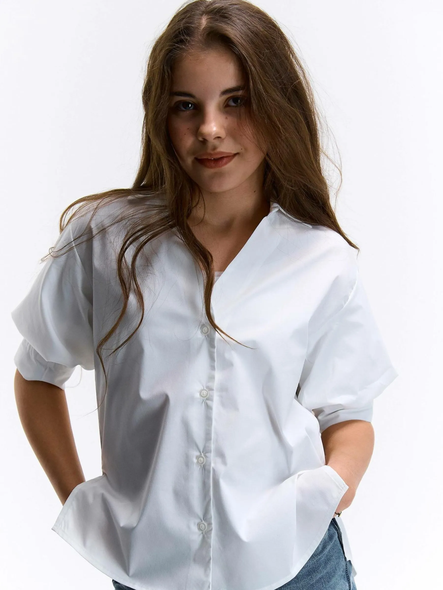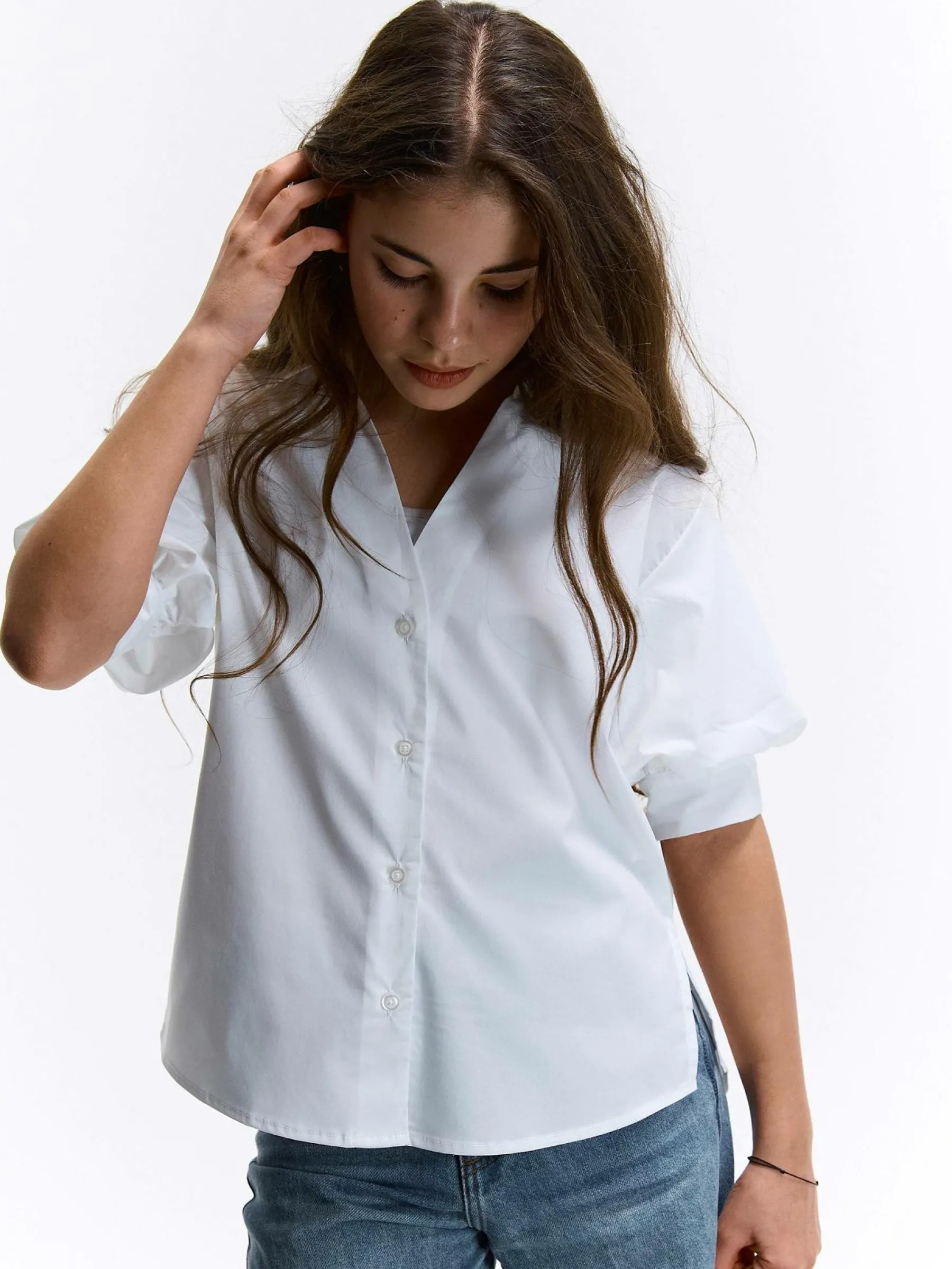 Kolor: białyKrój: podstawowyTyp: bluzkaRekaw: krótki rękawDługość: krótkiPattern style: pojedynczy kolorDetal: n…