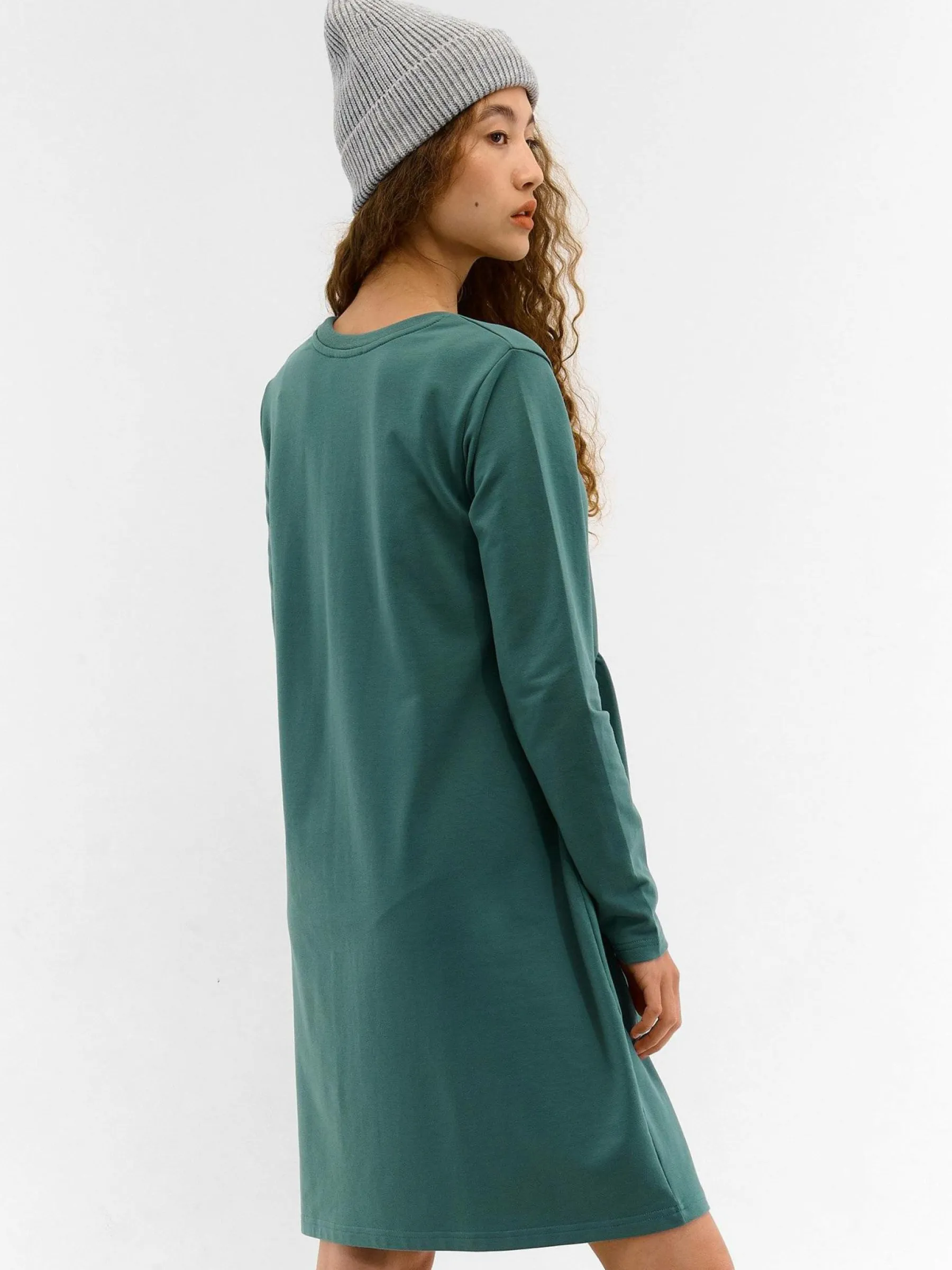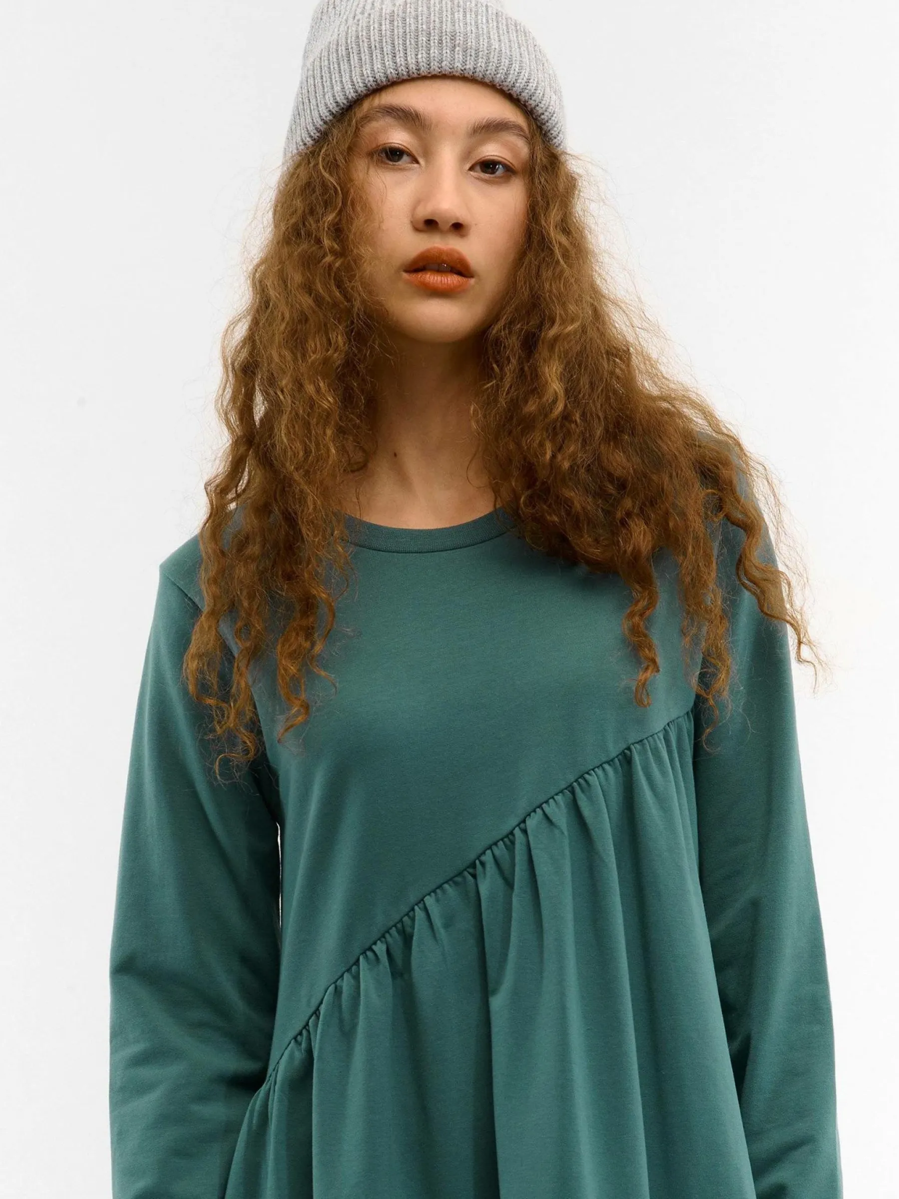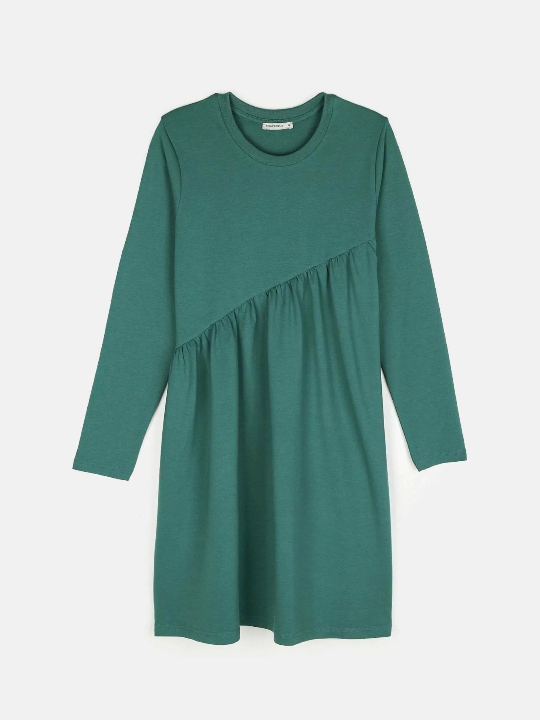 Kolor: zielonyKrój: z marszczeniemTyp: sukienkaRekaw: długi rękawDługość: miniPattern style: pojedynczy kolorDetal…