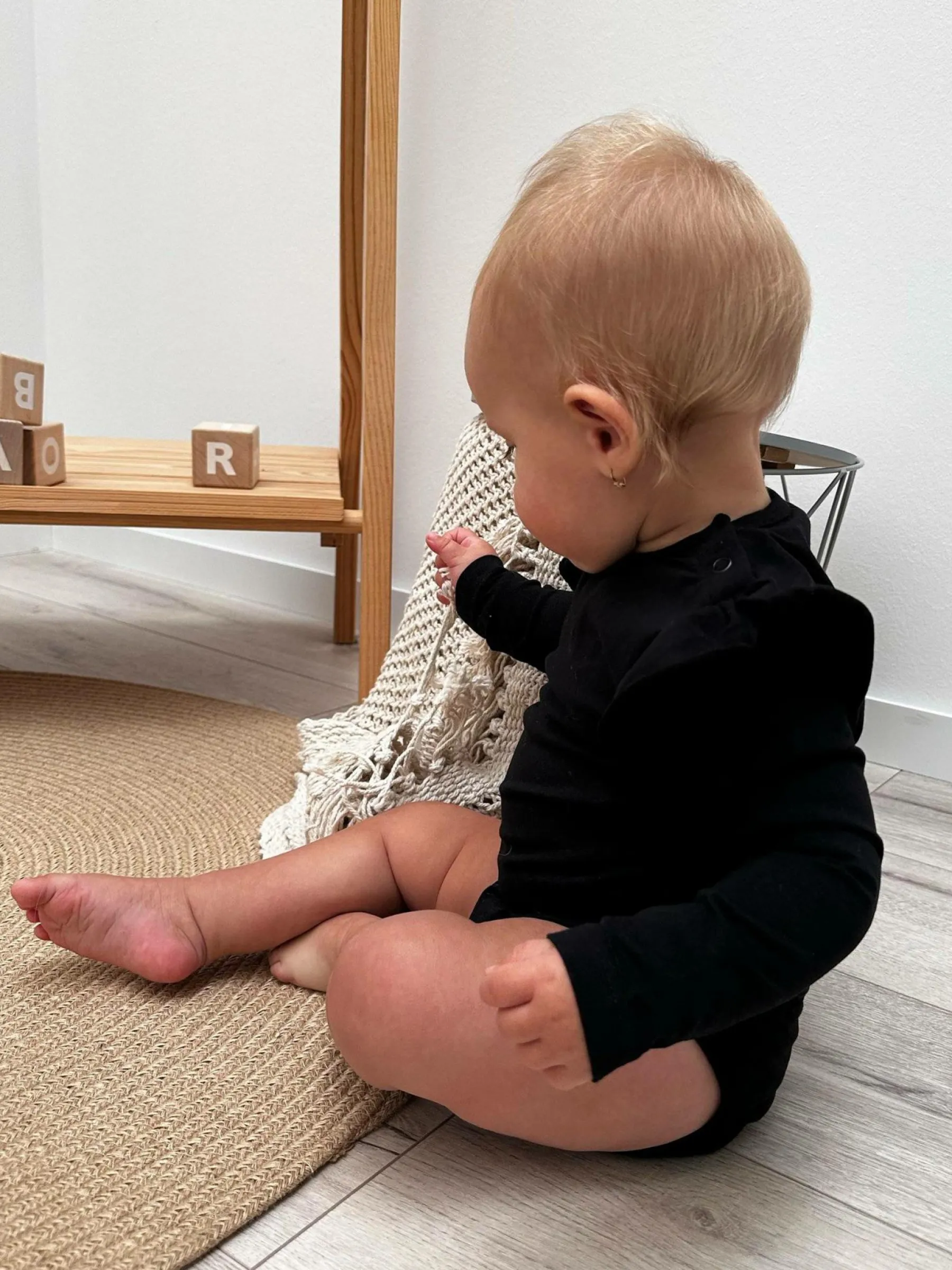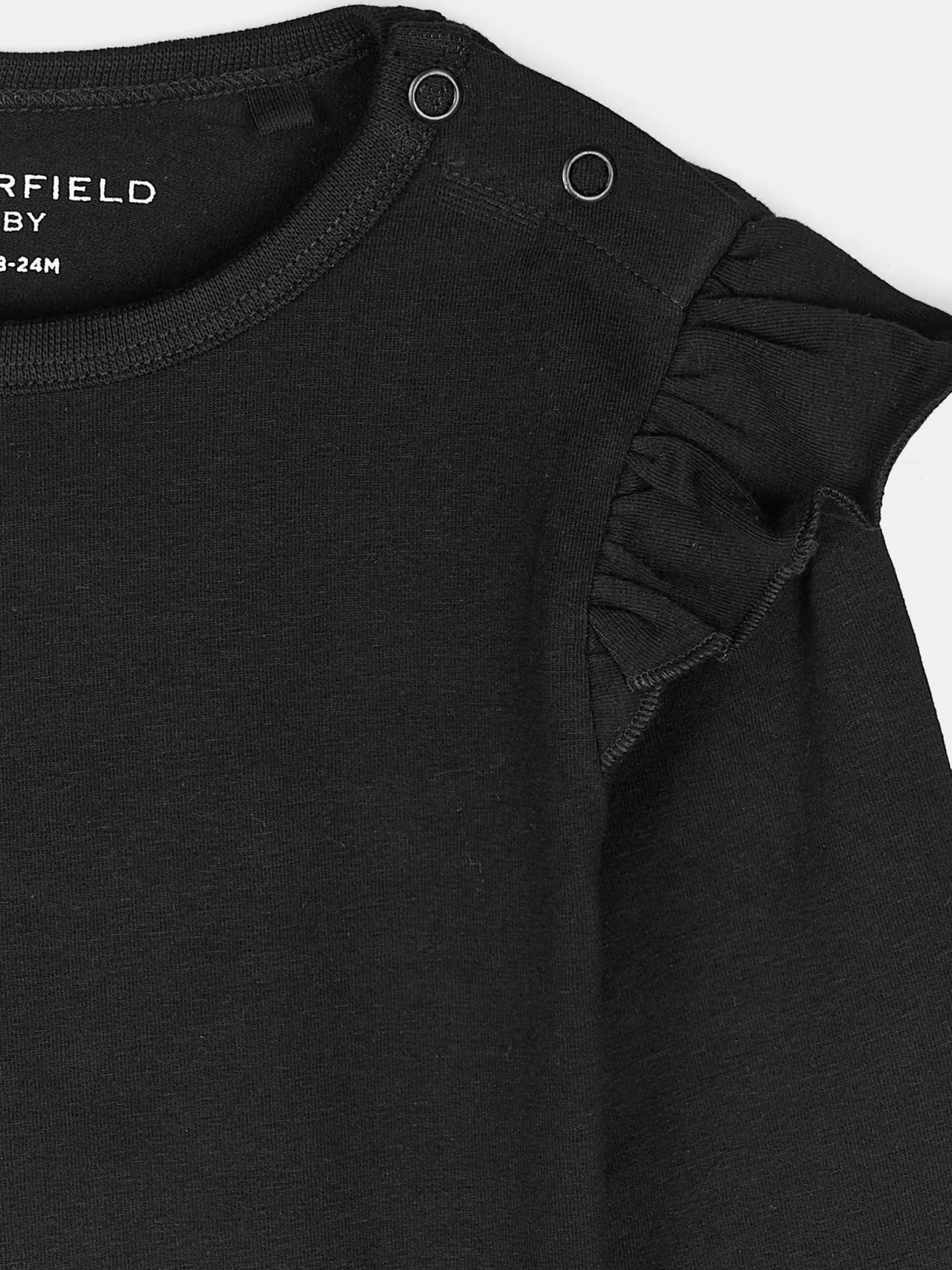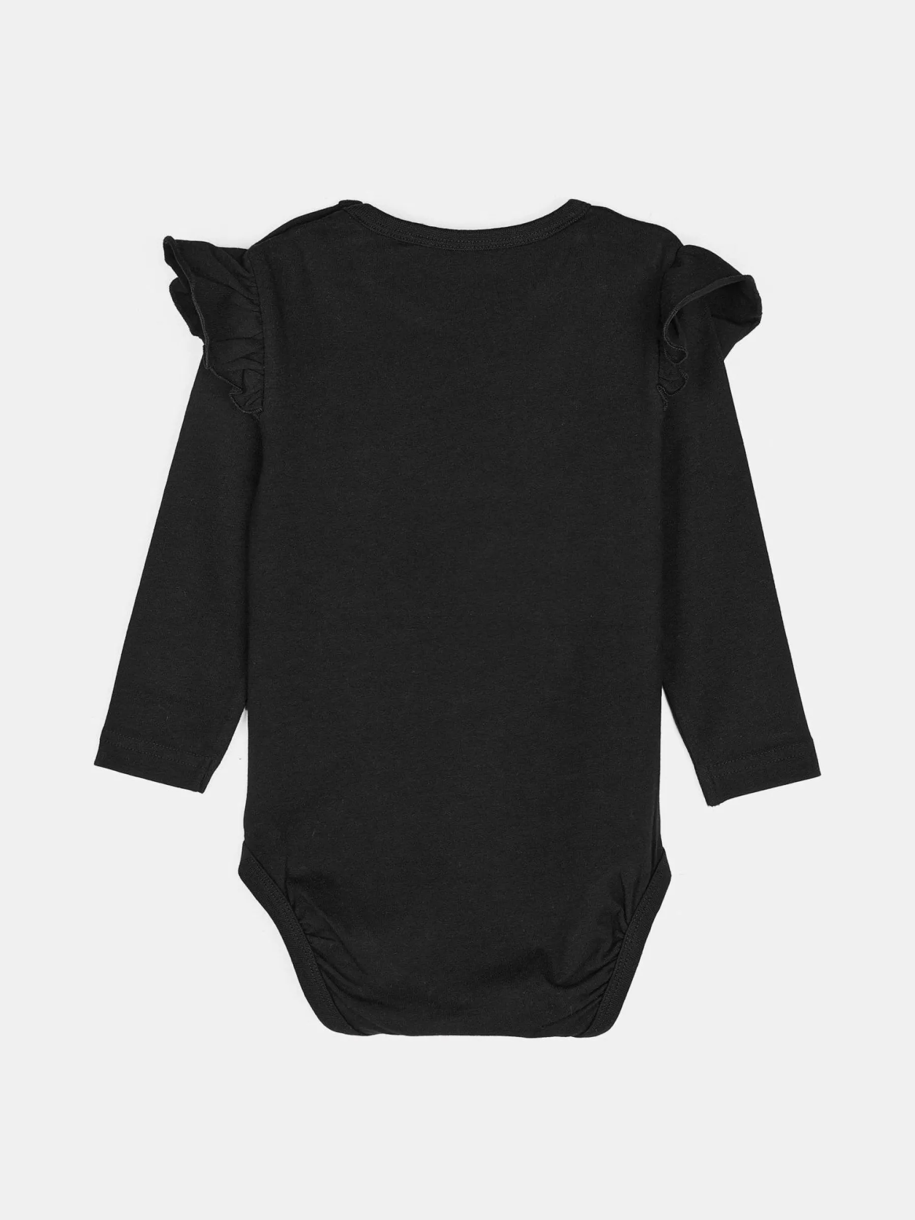 Kolor: czarnyKrój: z falbanąTyp: bodyRekaw: długi rękawDługość: krótkiPattern style: pojedynczy kolorDetal: nad …