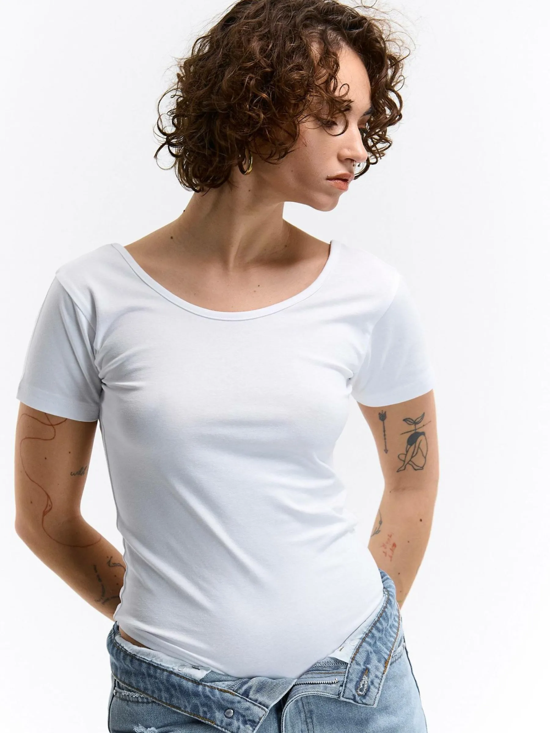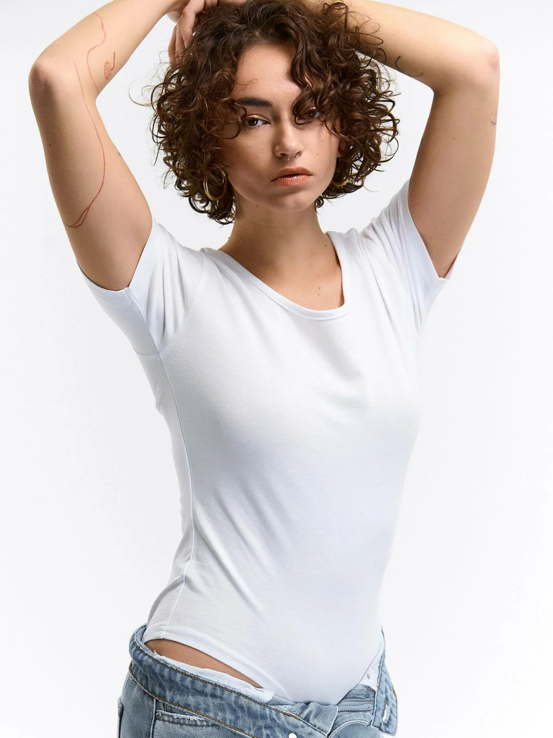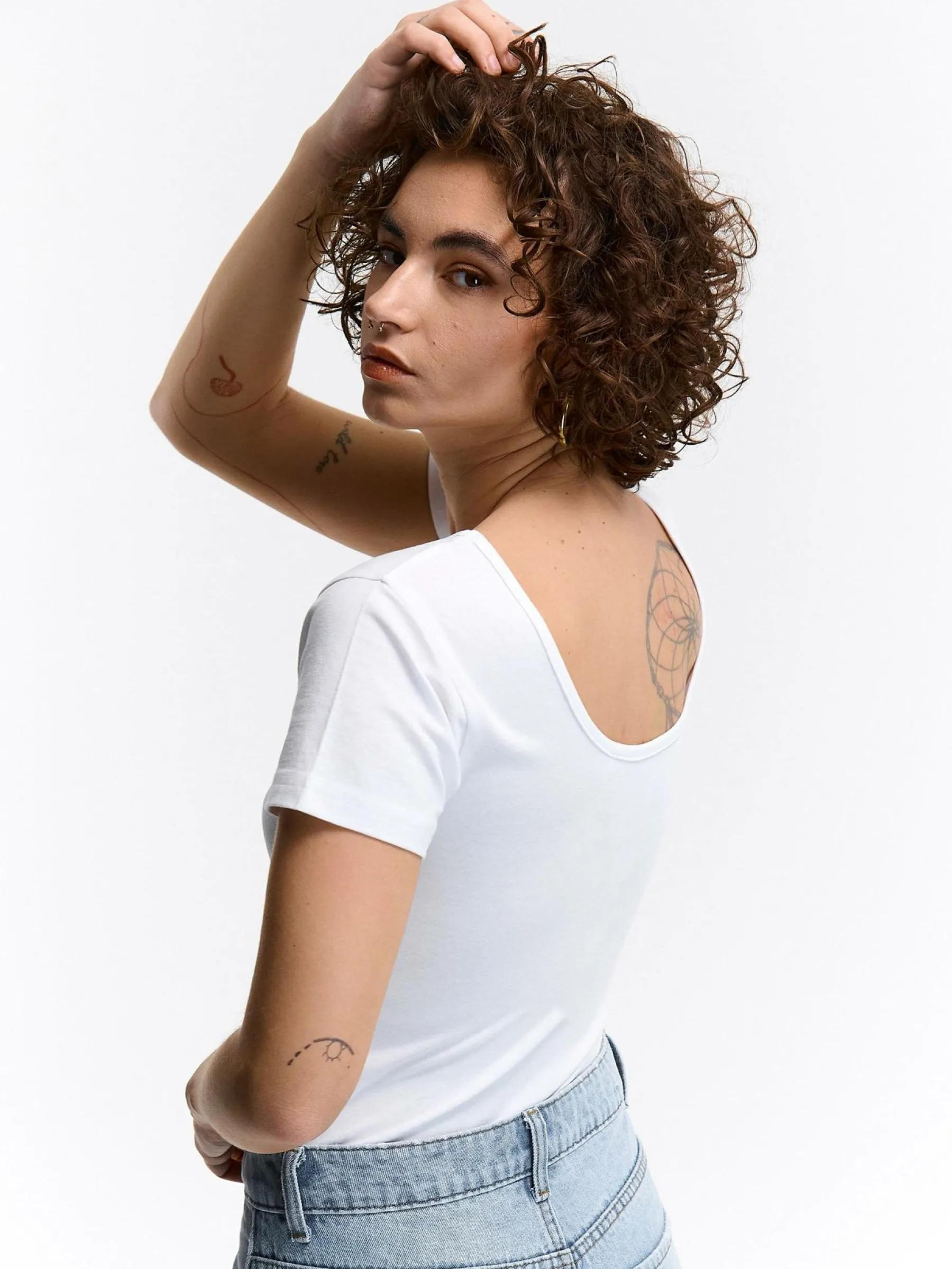 Kolor: białyKrój: slimTyp: bodyRekaw: krótki rękawDługość: krótkiPattern style: pojedynczy kolorDetal: na snapyM…