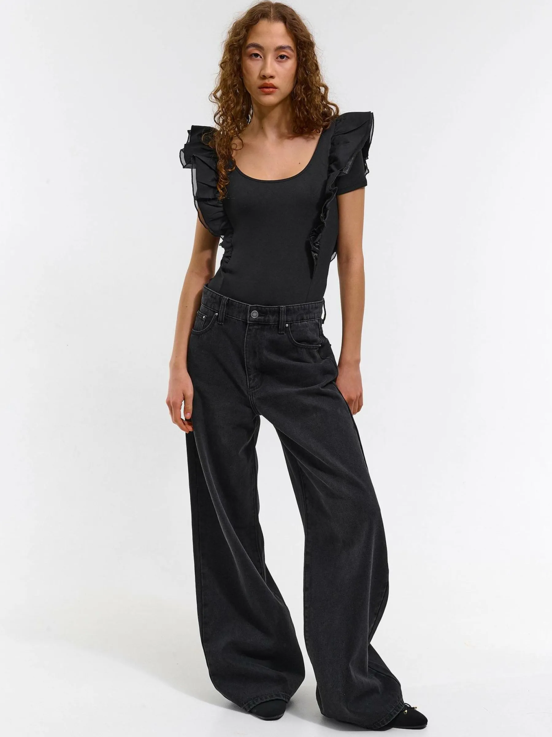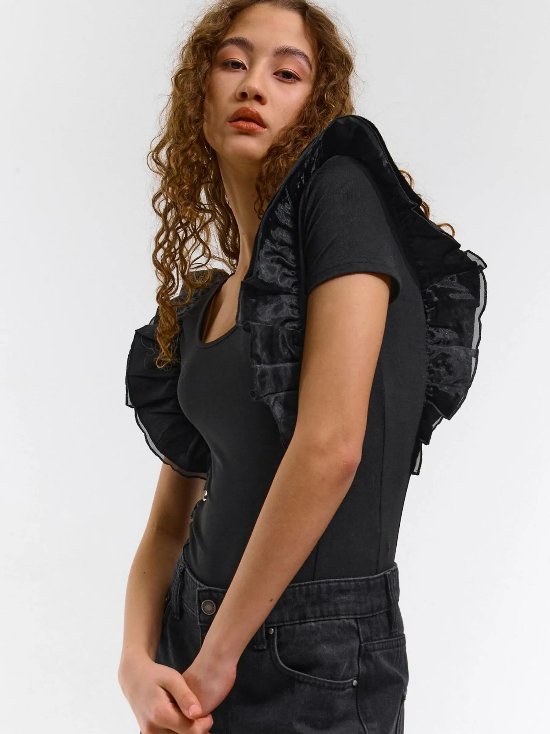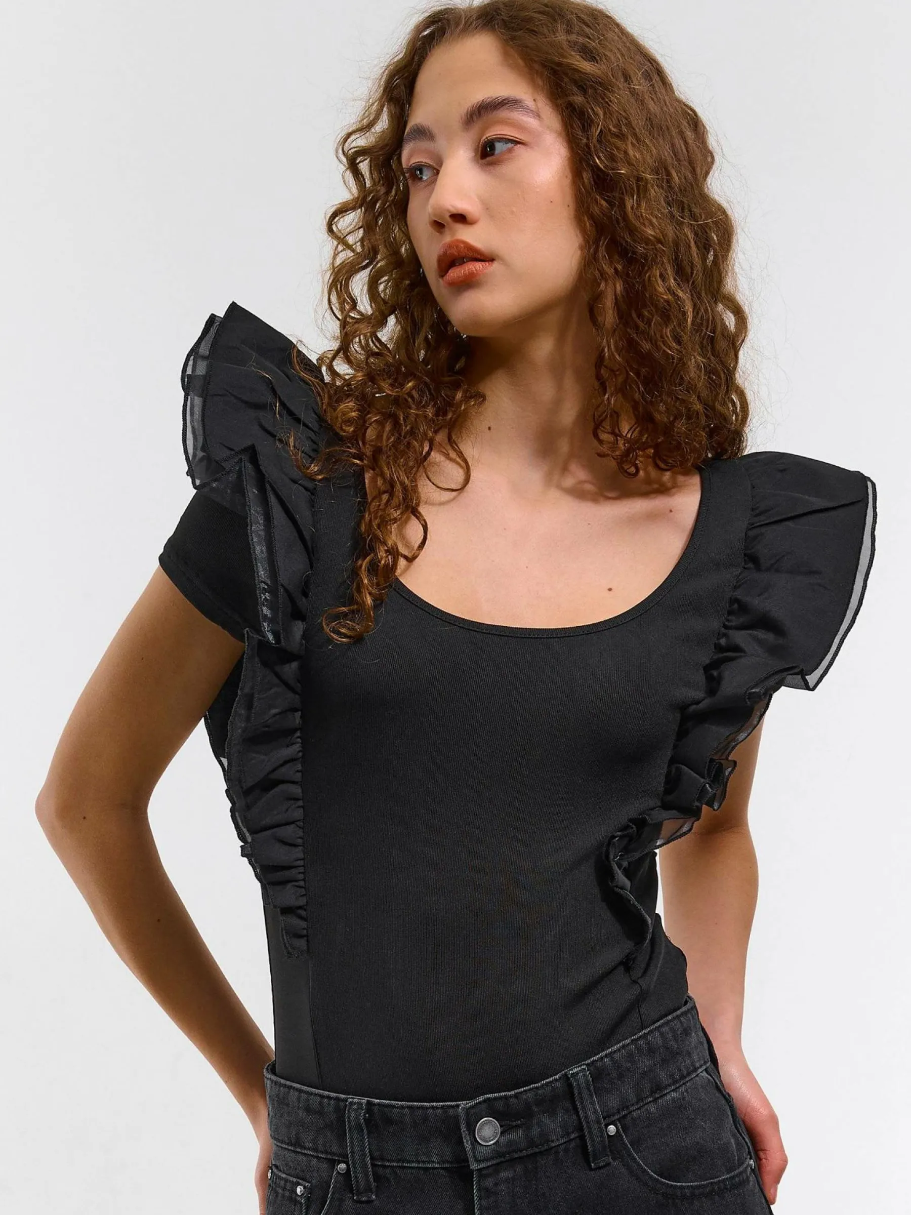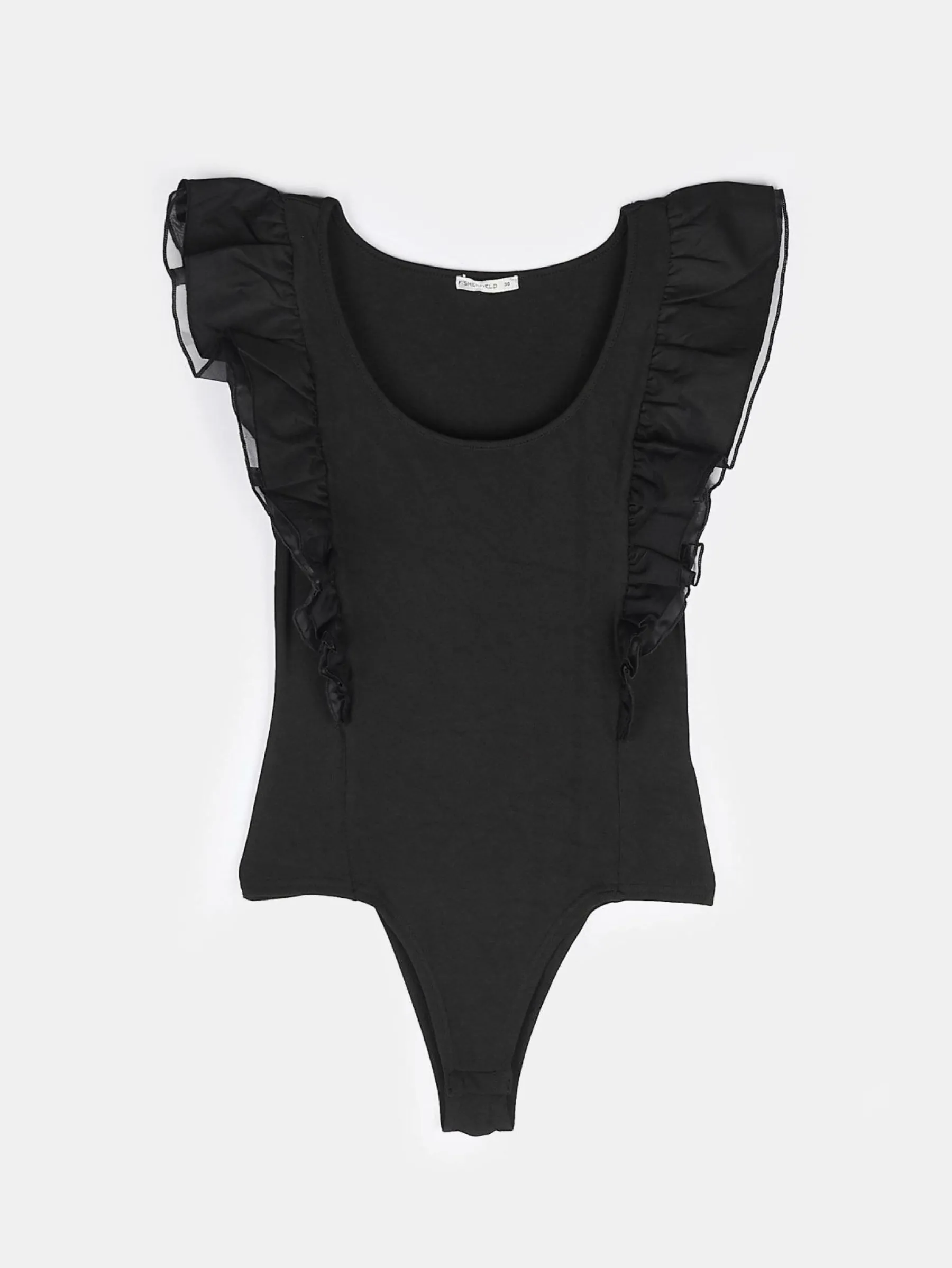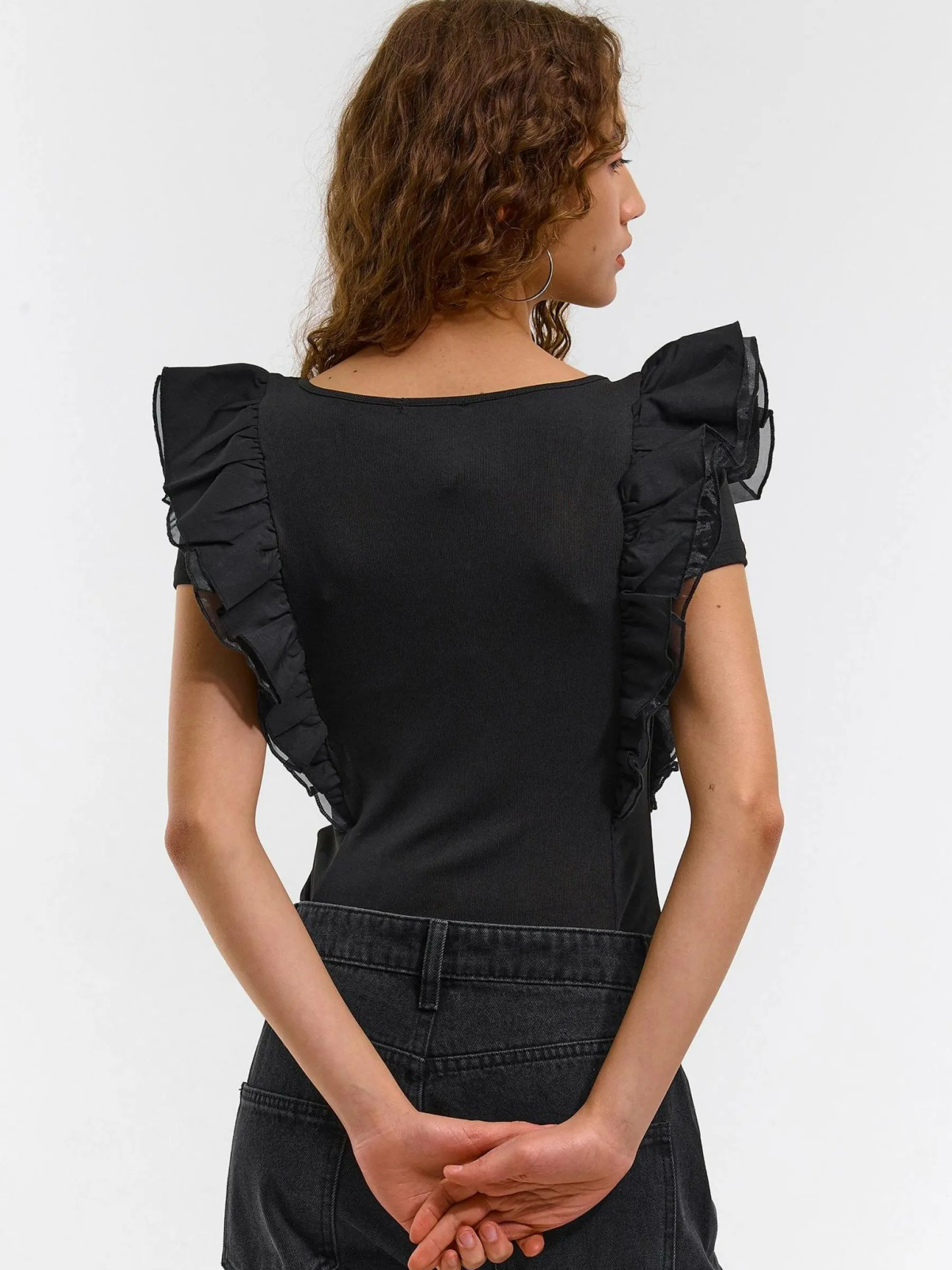 Kolor: czarnyKrój: z falbaną, slimTyp: bodyRekaw: bez rękawówDługość: krótkiPattern style: pojedynczy kolorDetal…
