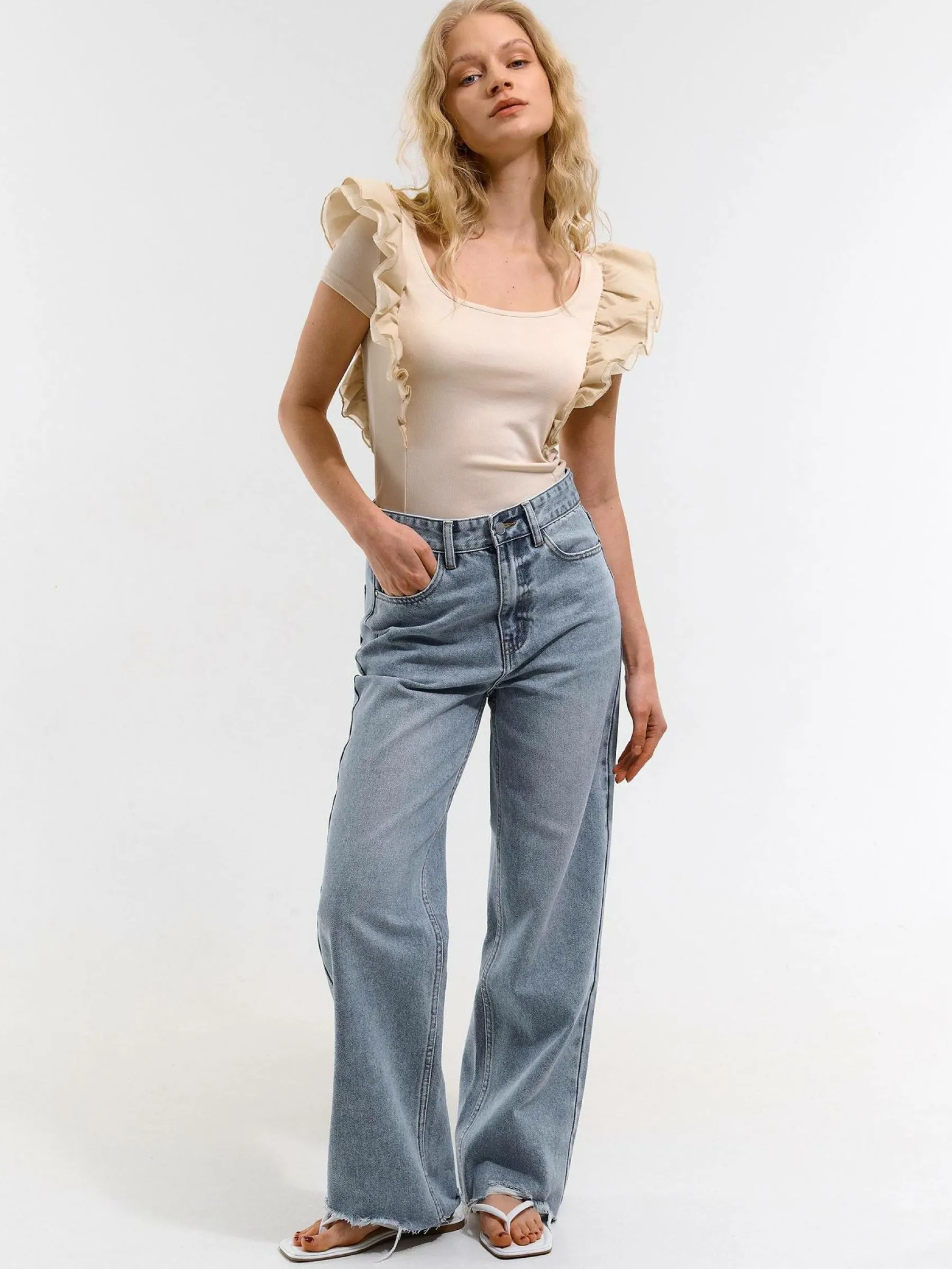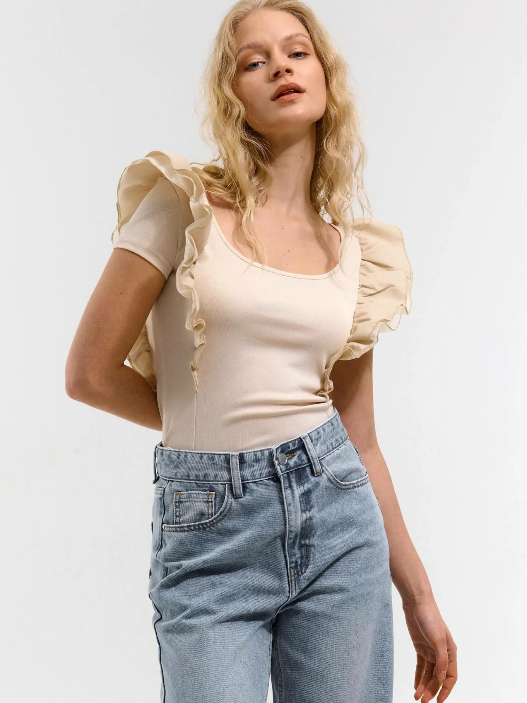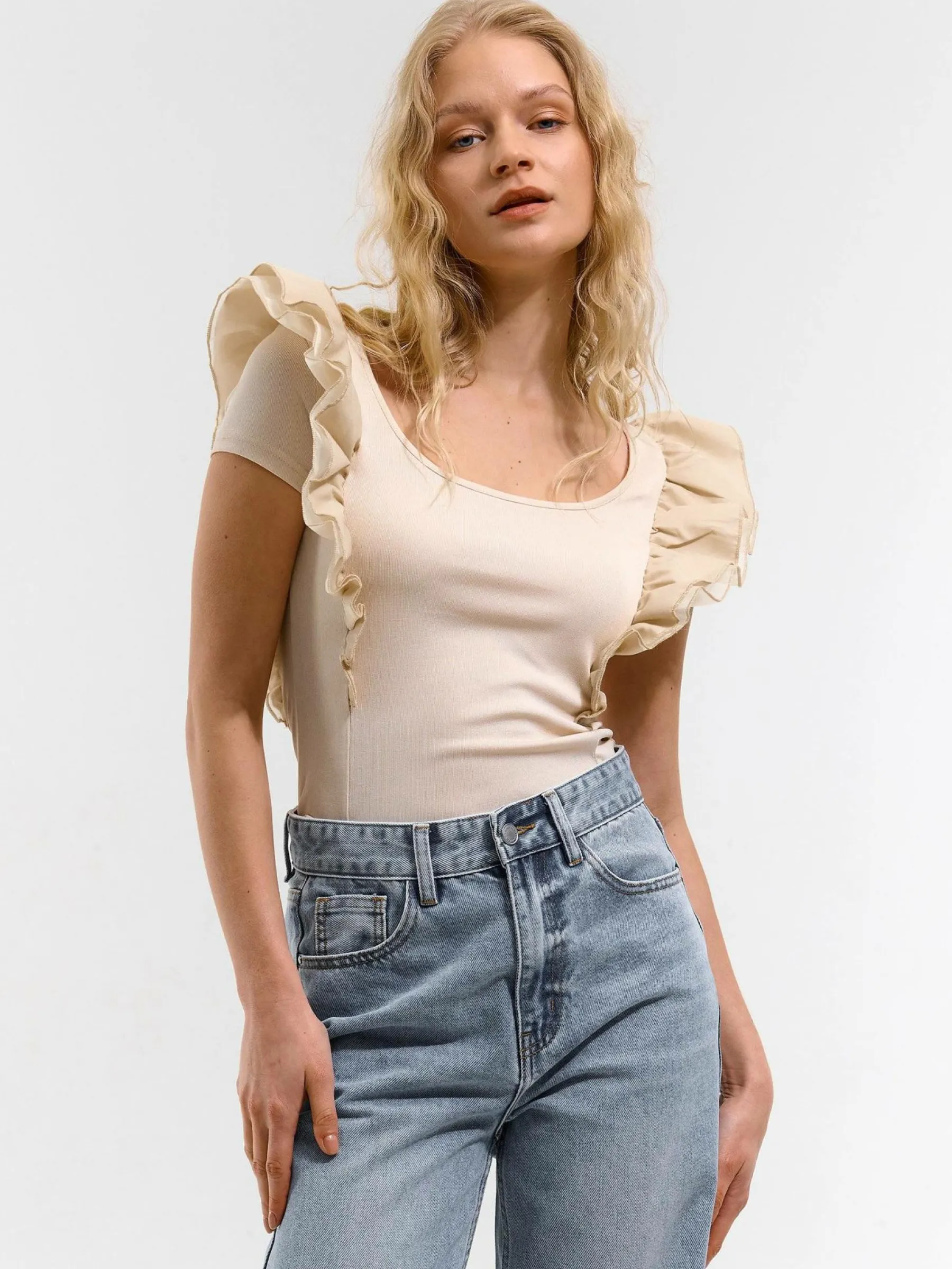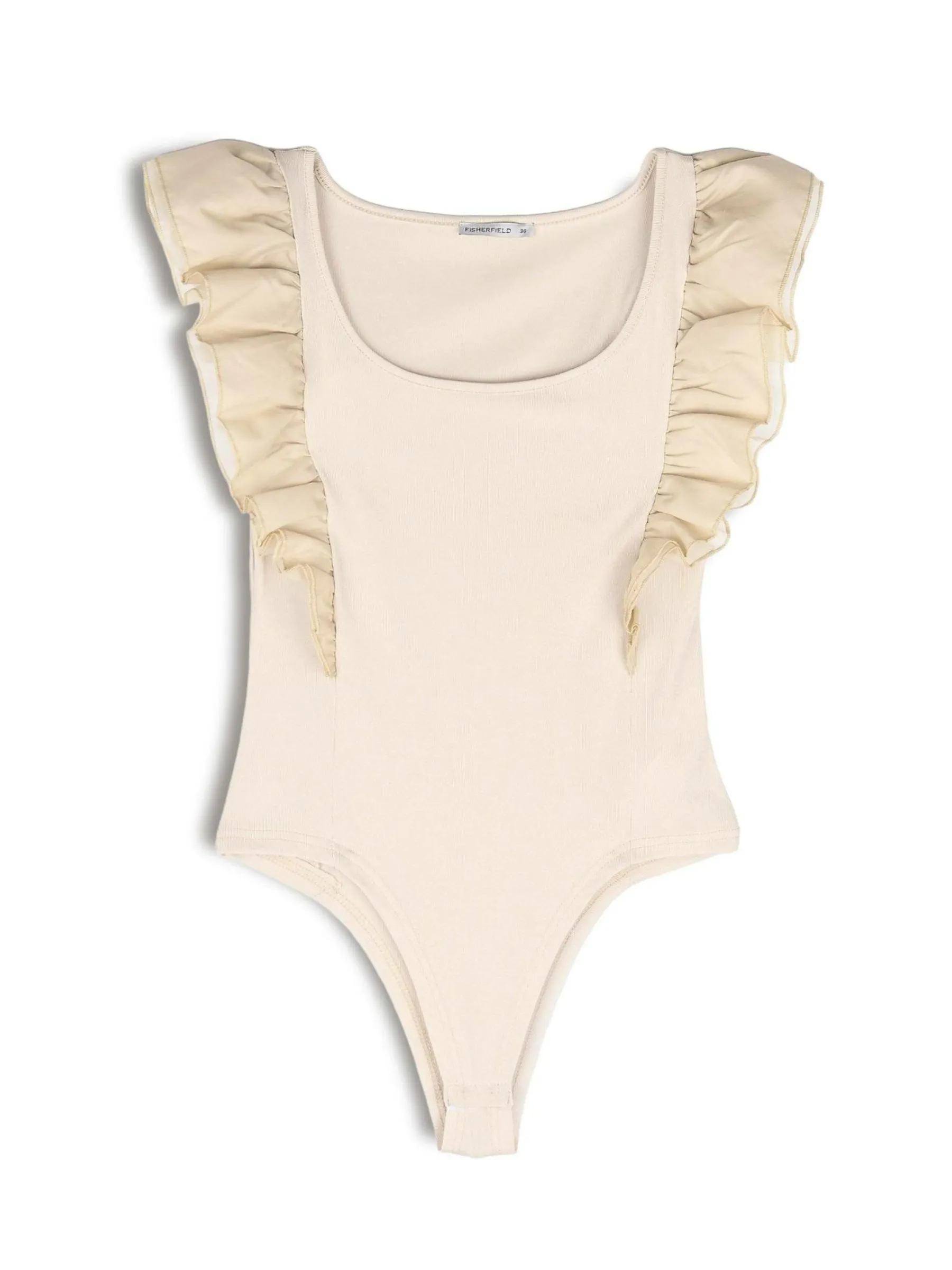 Zdjęcia z modelką mogą nie odpowiadać rzeczywistemu kolorowi produktu.Kolor: beżowyKrój: z falbaną, slimTyp: body…
