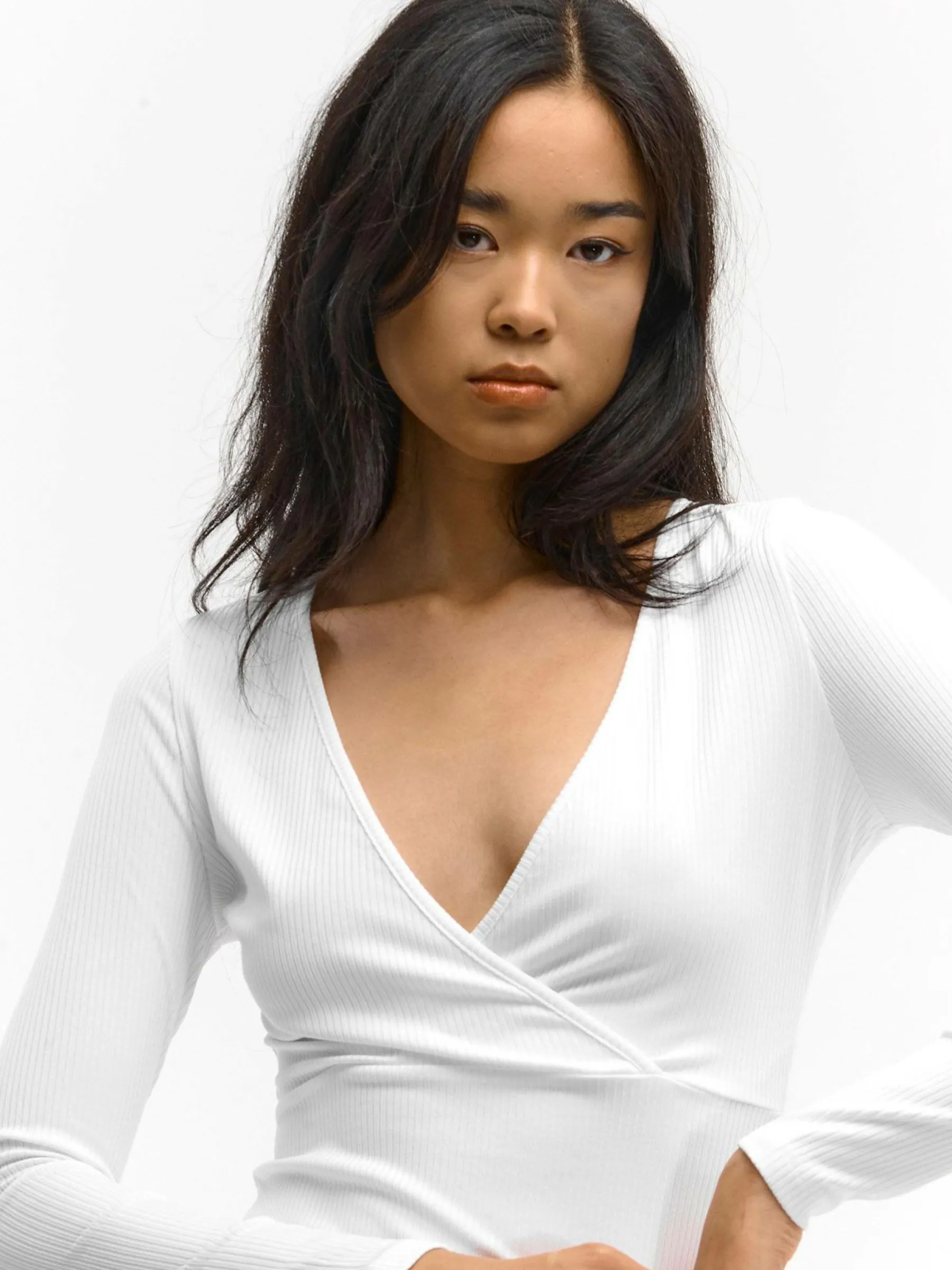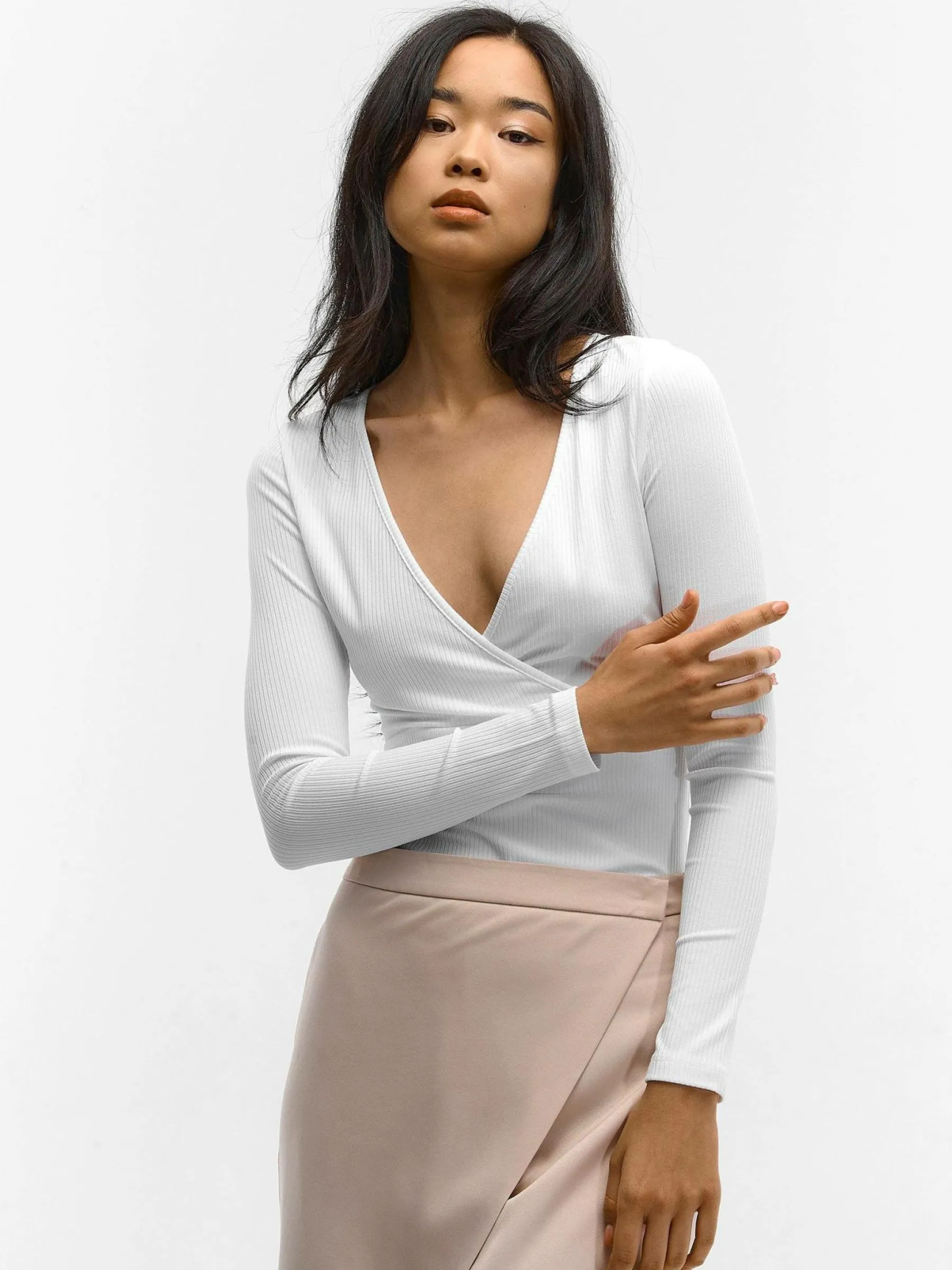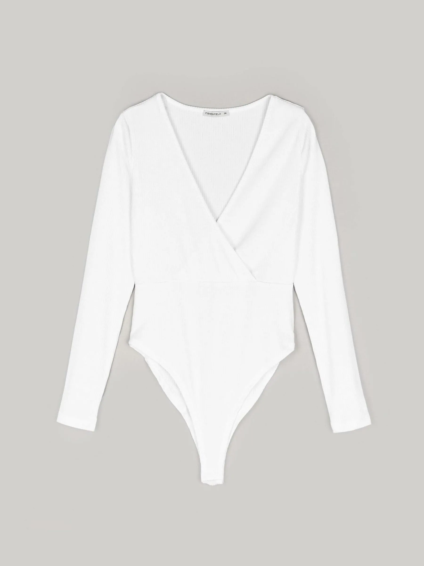Kolor: białyKrój: slim, kopertówkiTyp: bodyRekaw: długi rękawDługość: krótkiPattern style: pojedynczy kolor, ż…