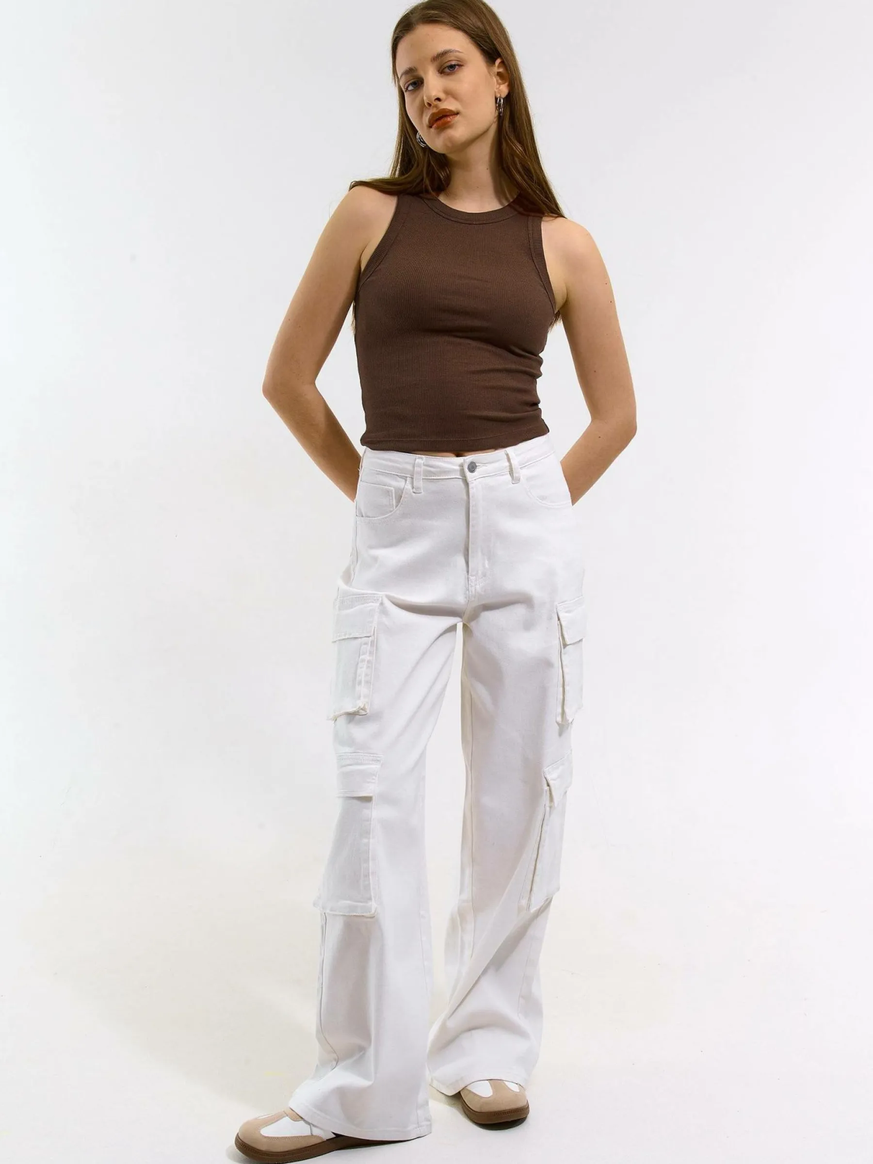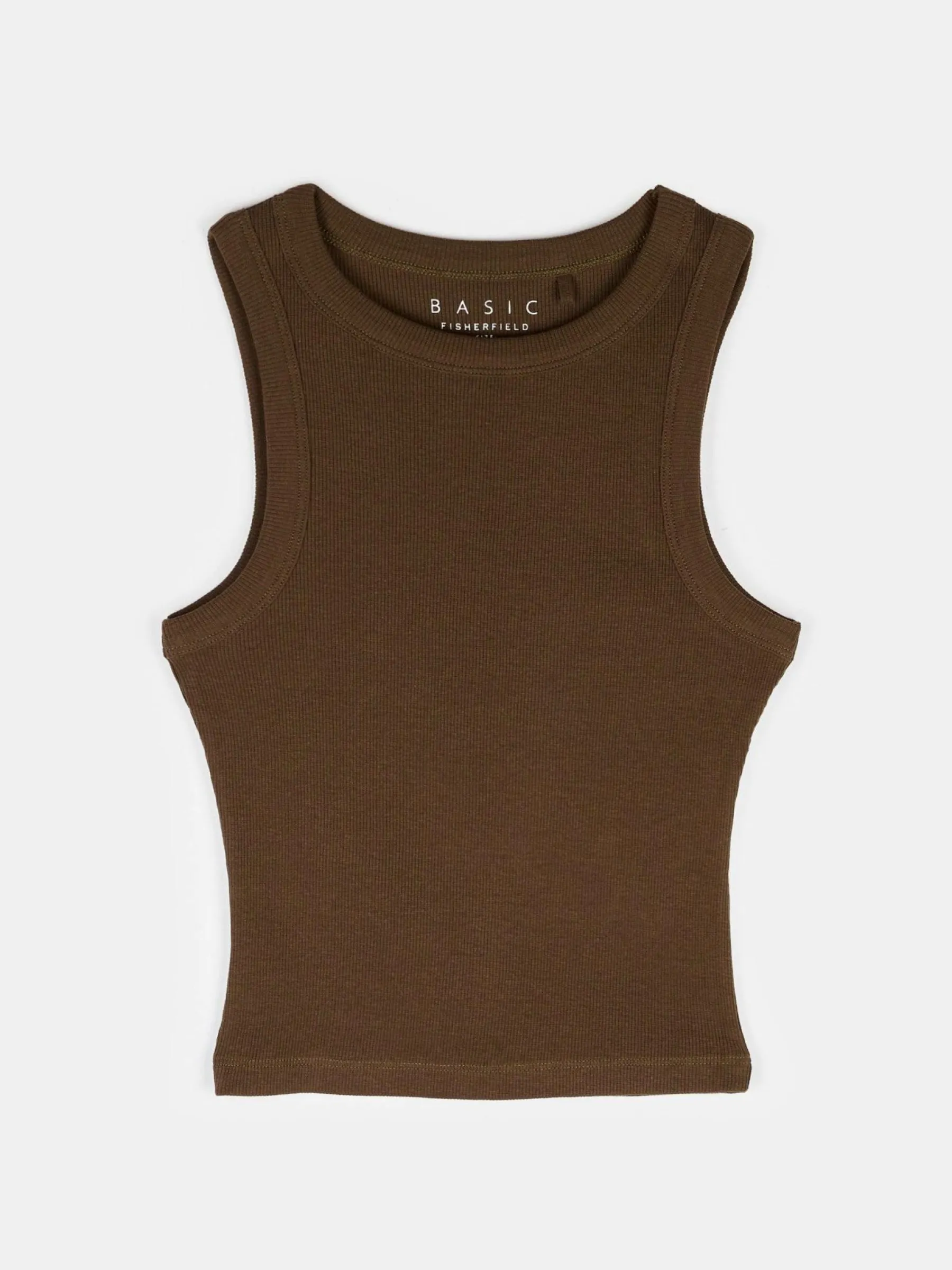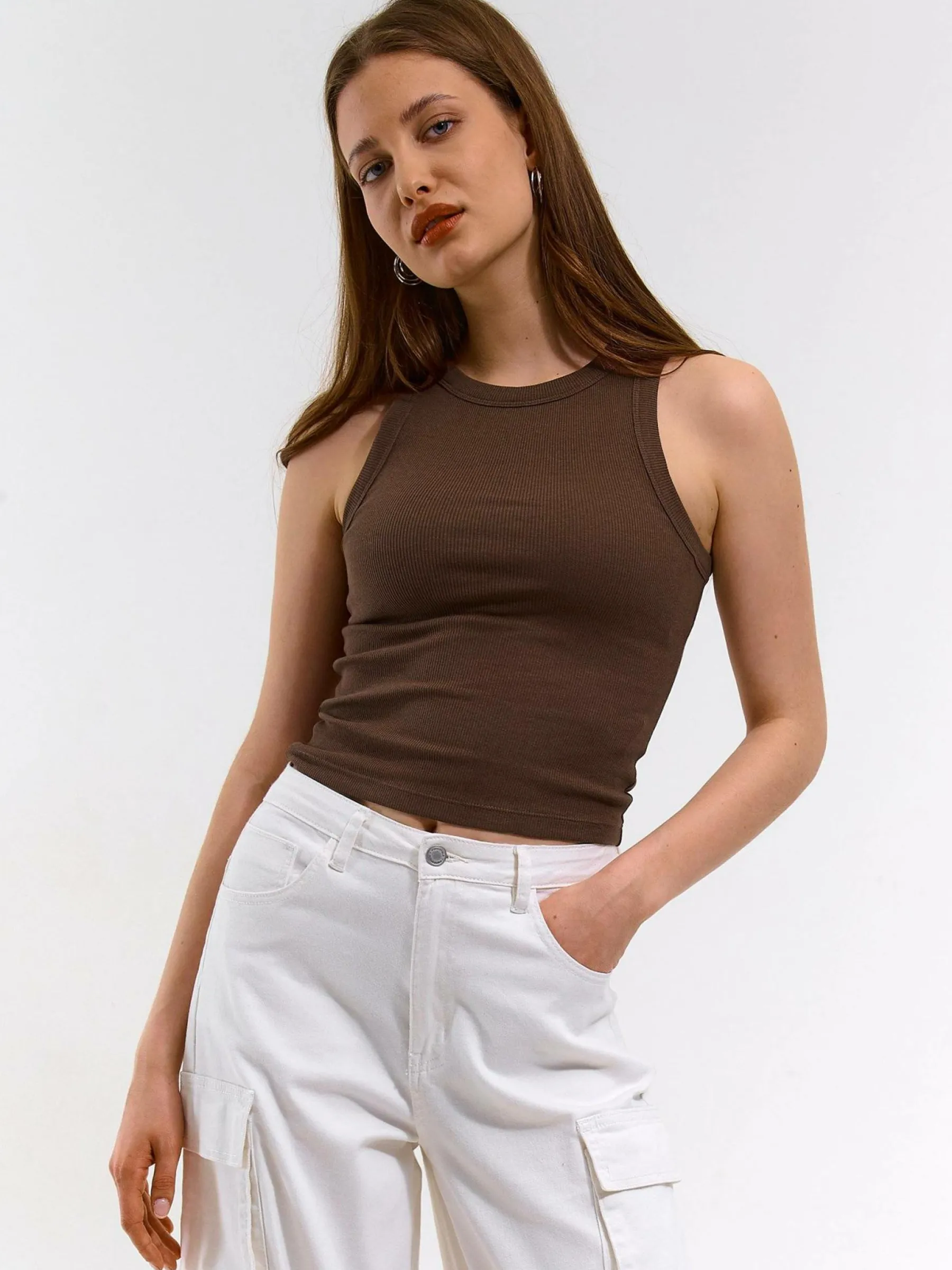 Kolor: brązowyKrój: regularTyp: podkoszulekRekaw: bez rękawówDługość: krótkiPattern style: pojedynczy kolor, że…