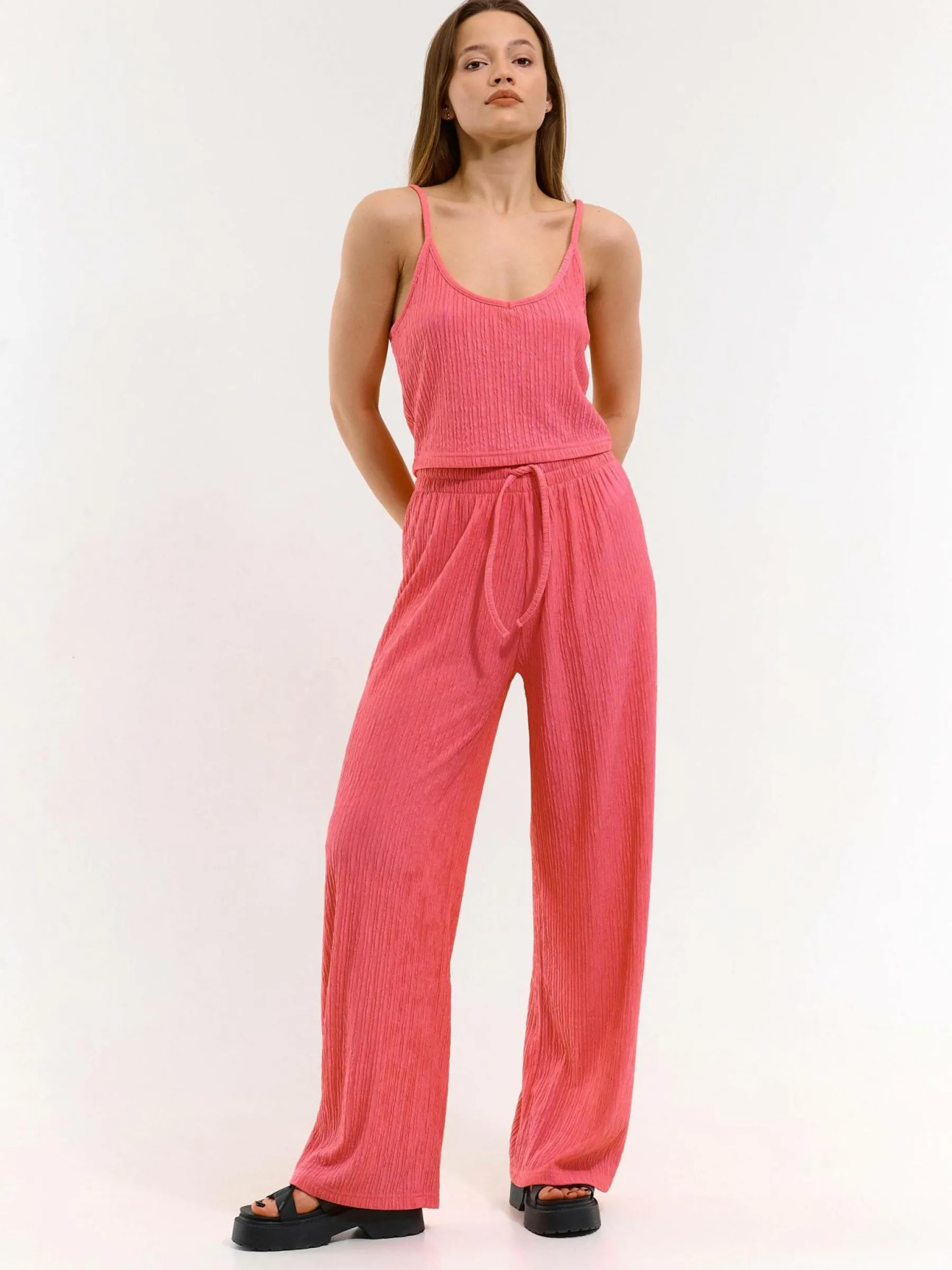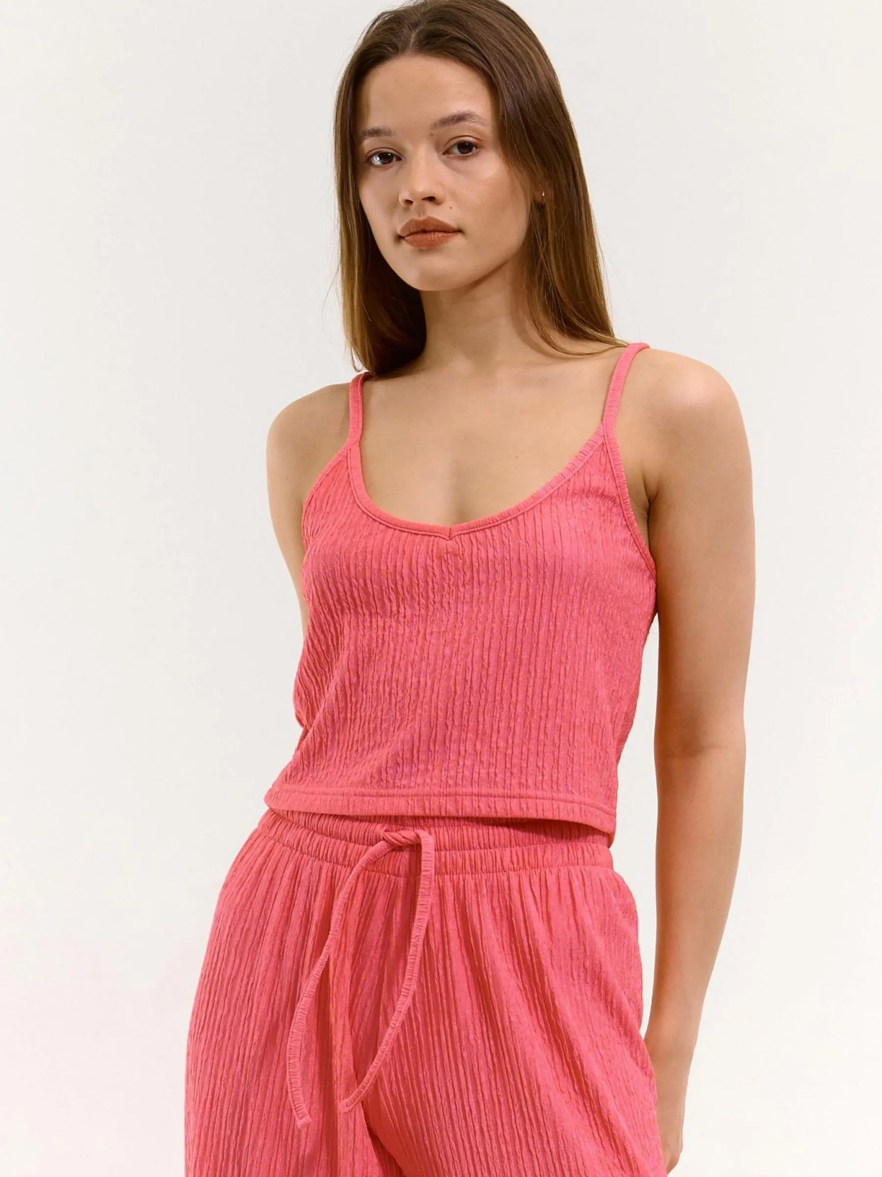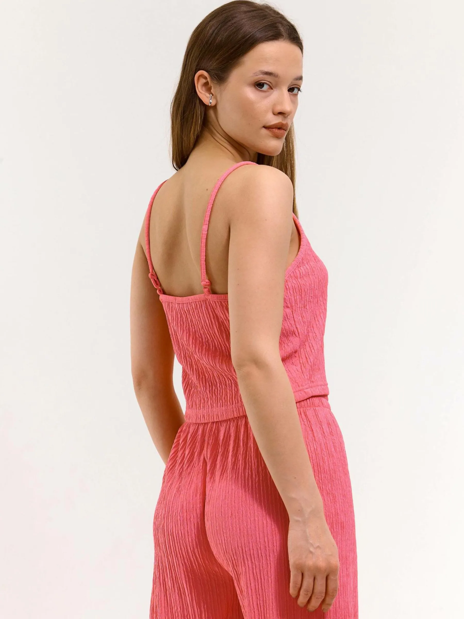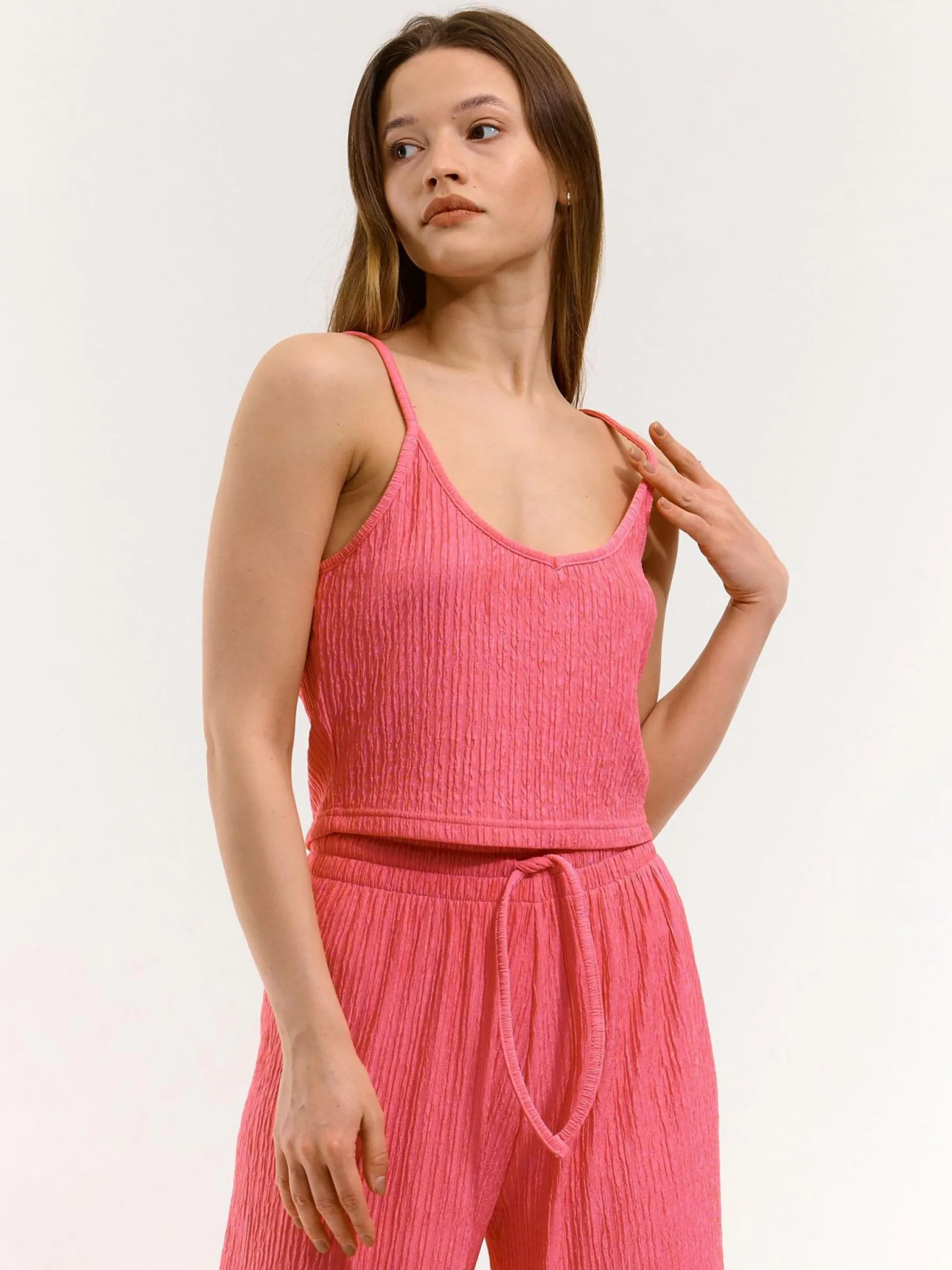 Kolor: różowyKrój: regularTyp: podkoszulekRekaw: bez rękawówDługość: krótki topPattern style: strukturowane, po…
