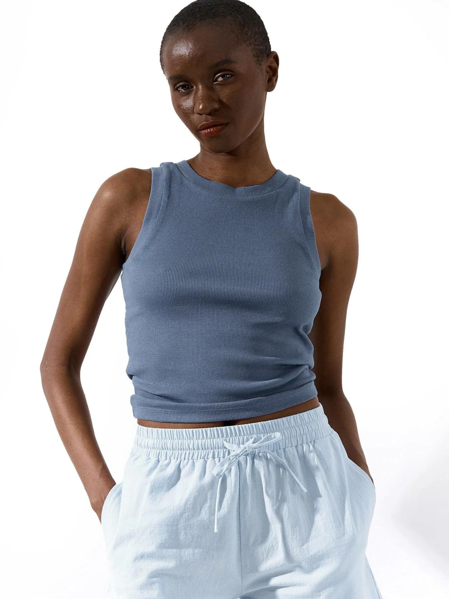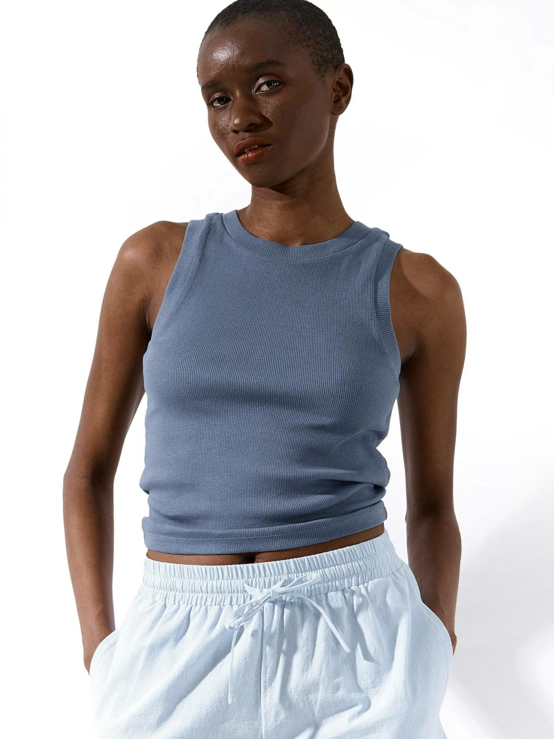 Kolor: niebieskiKrój: regularTyp: podkoszulekRekaw: bez rękawówDługość: krótkiPattern style: pojedynczy kolor, ż…