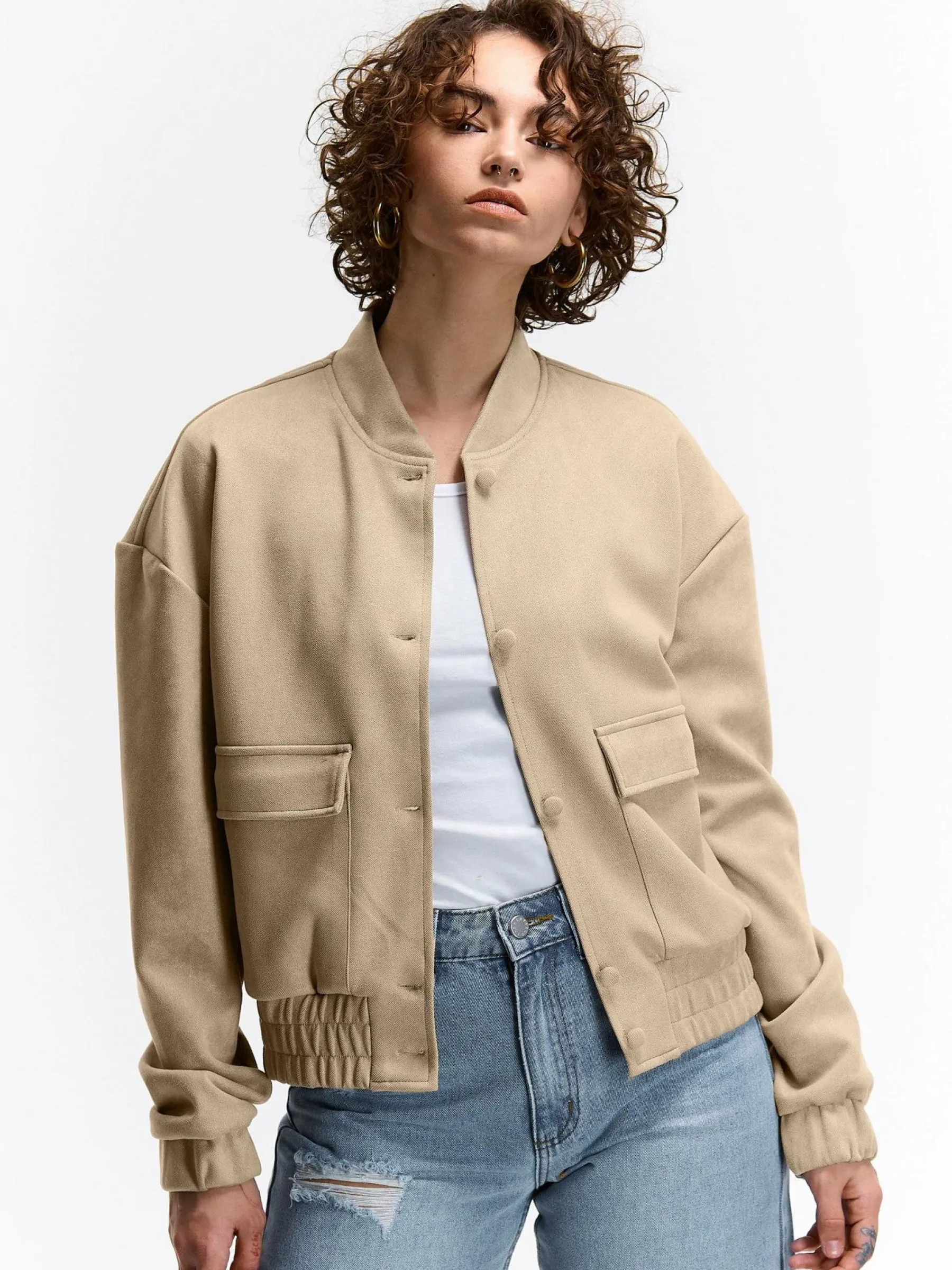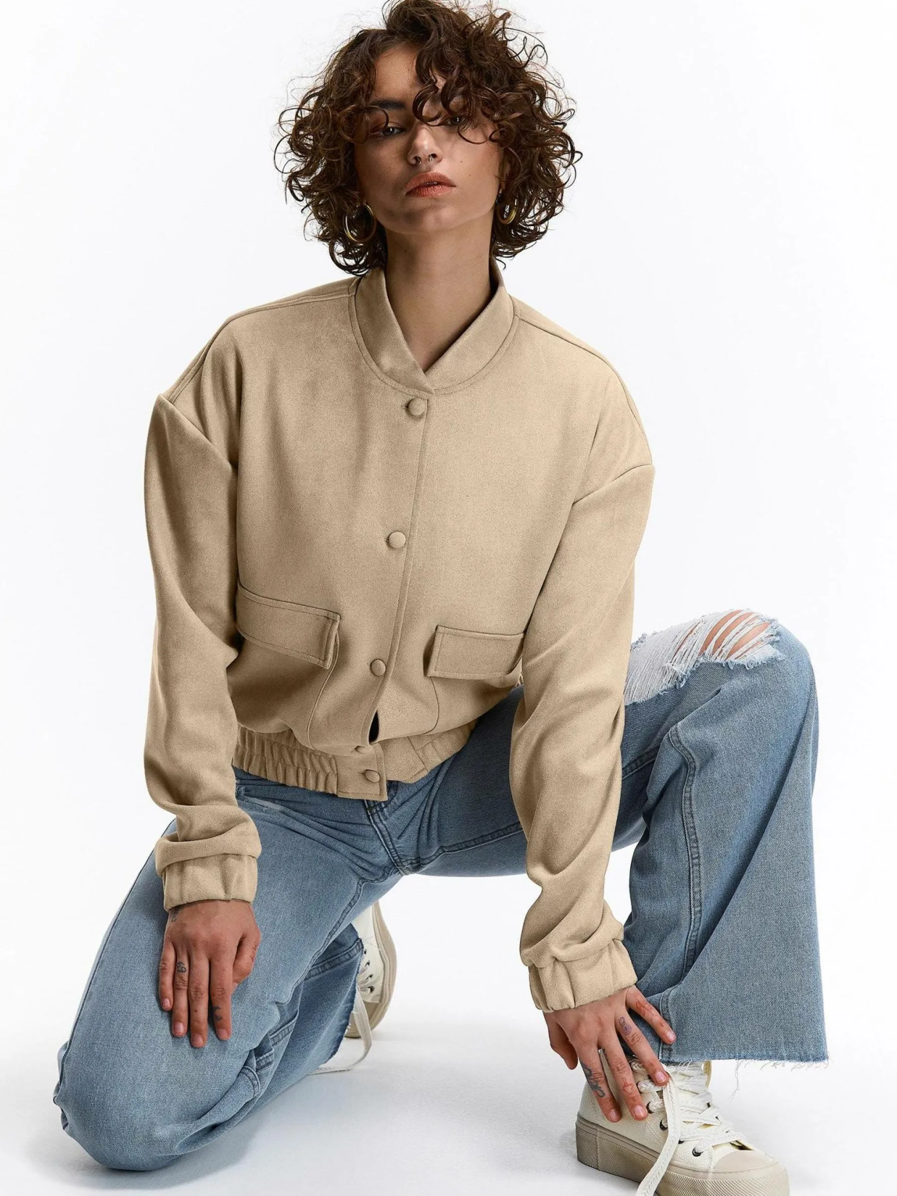 Kolor: beżowyKrój: bomberTyp: kurtka przejściowaRekaw: długi rękawDługość: krótkiPattern style: pojedynczy kolo…