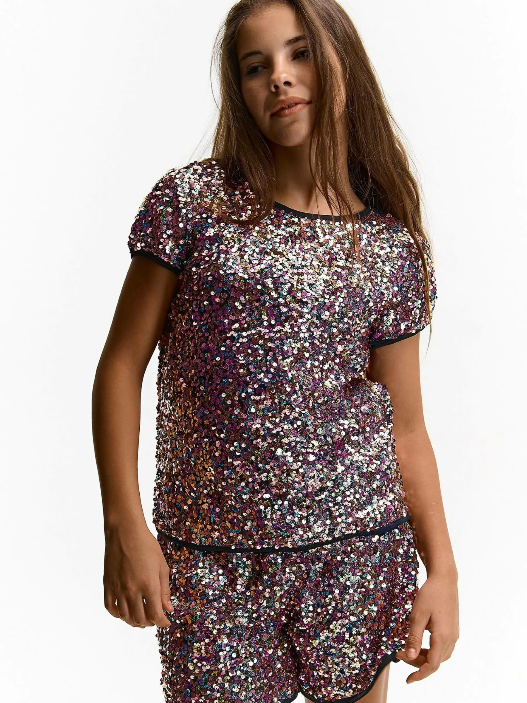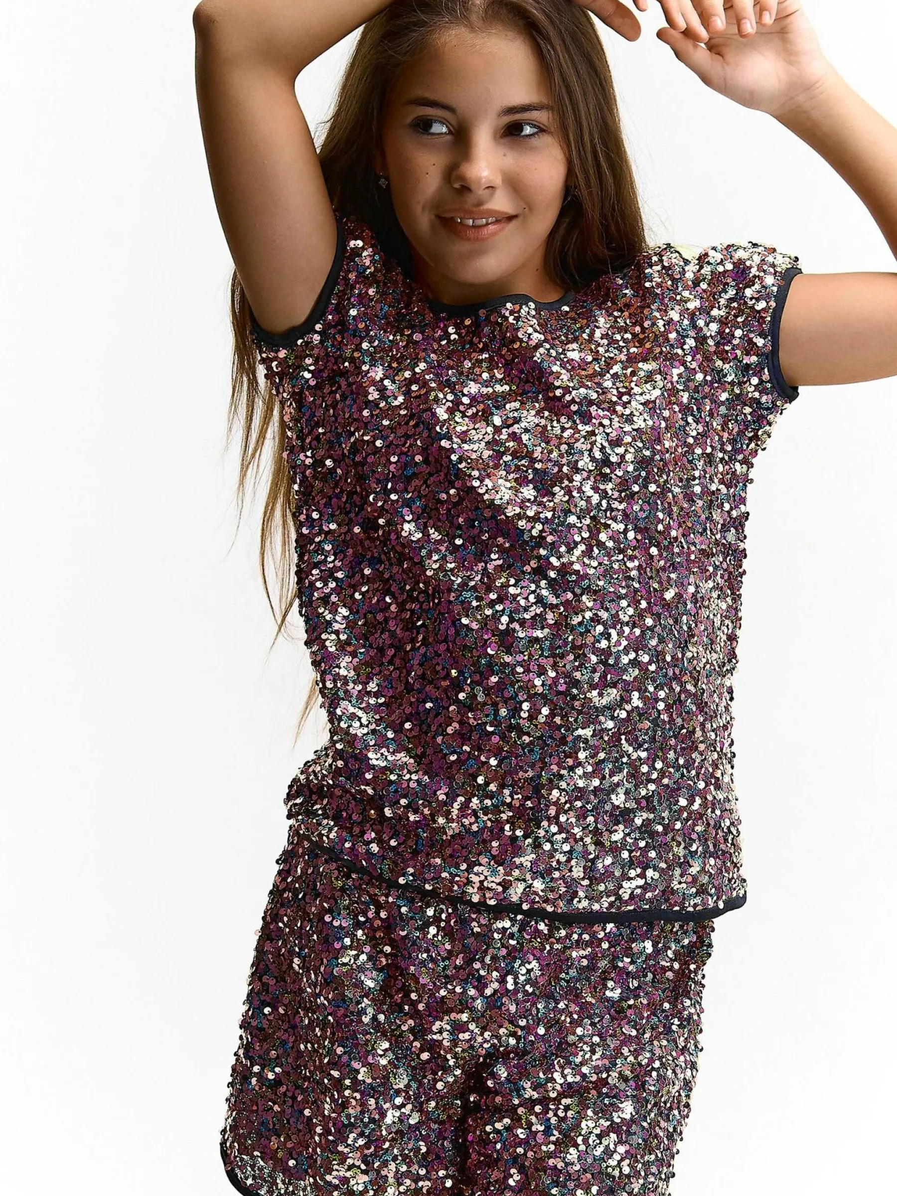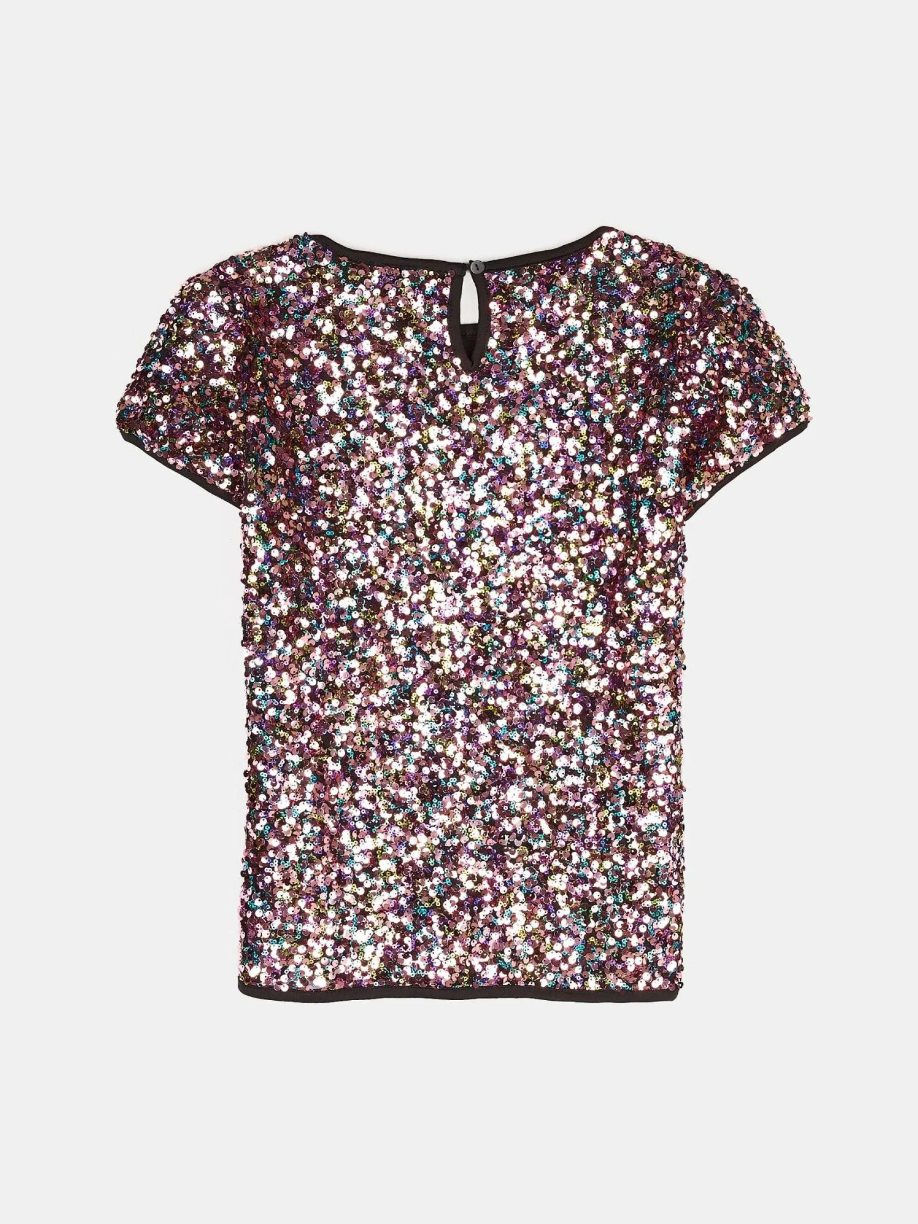 Kolor: czarnyKrój: regularTyp: koszulkaRekaw: krótki rękawDługość: krótkiPattern style: z cekinamiDetal: nad gło…
