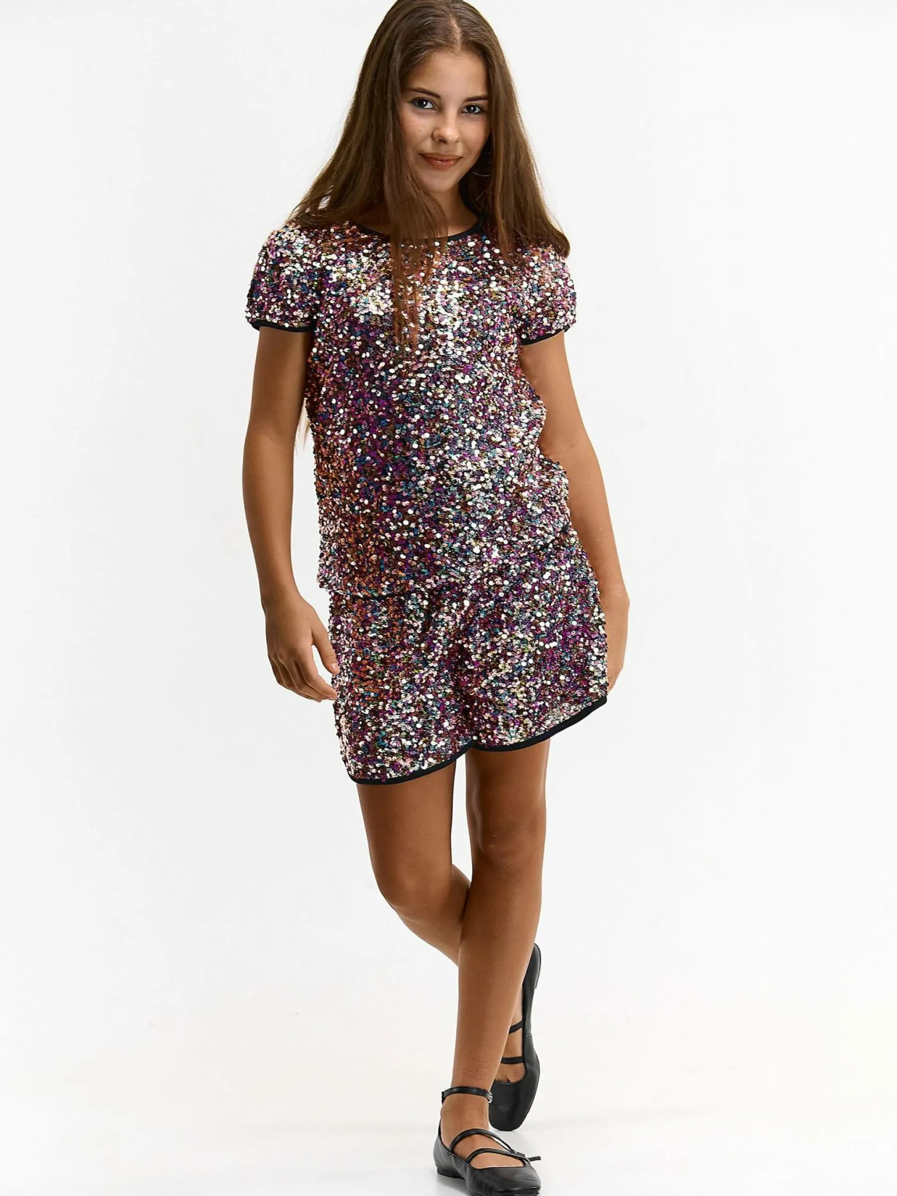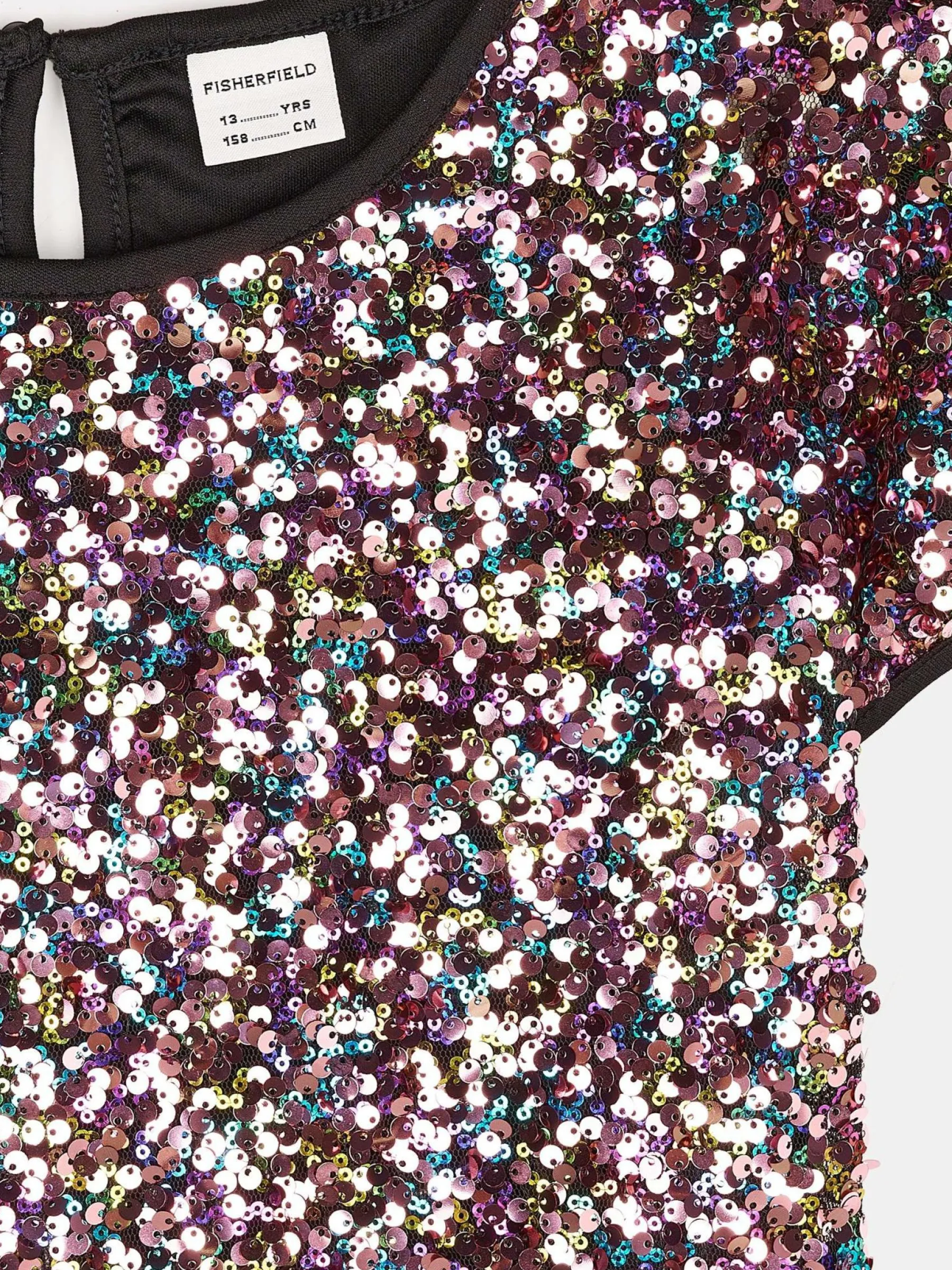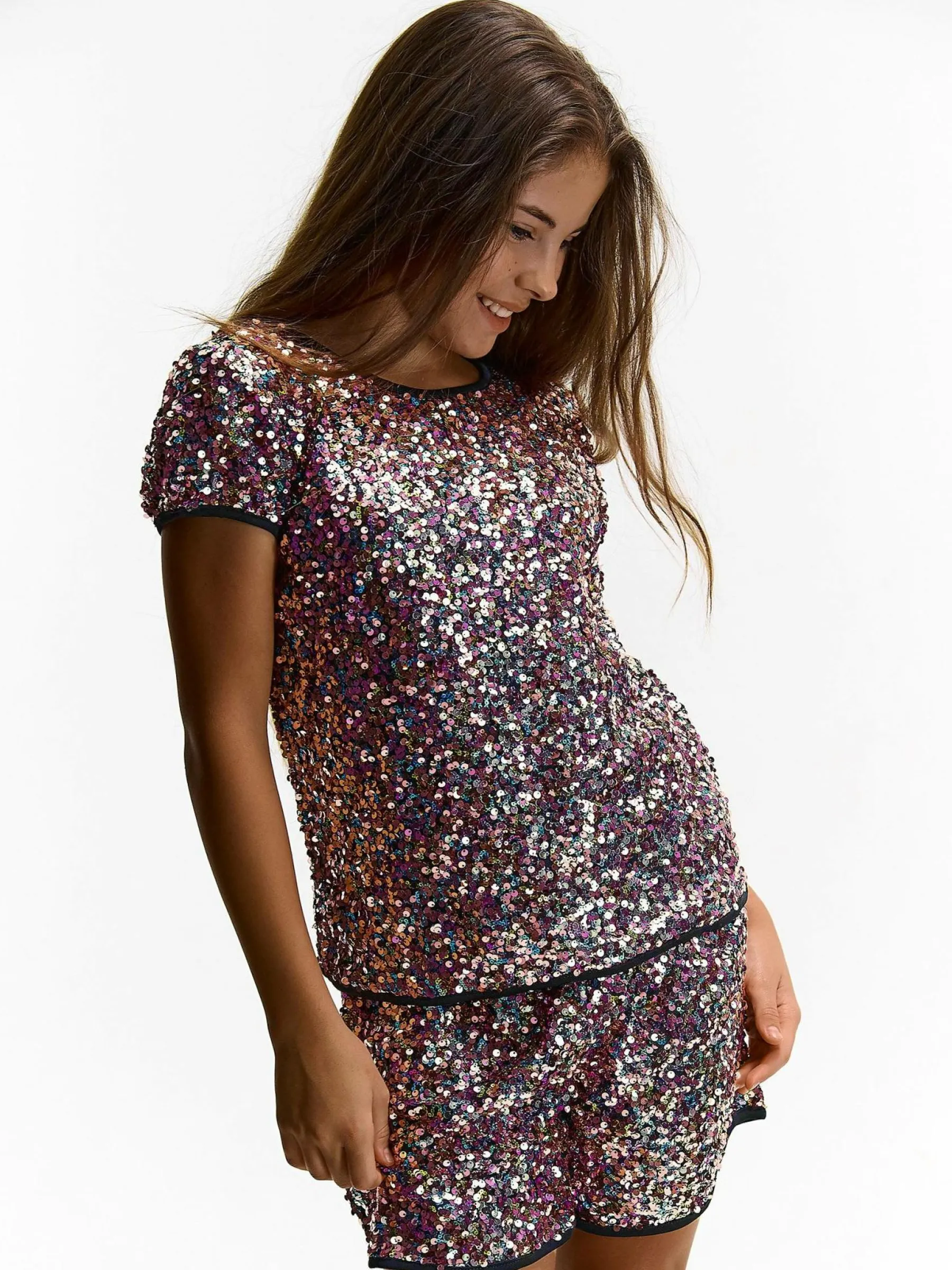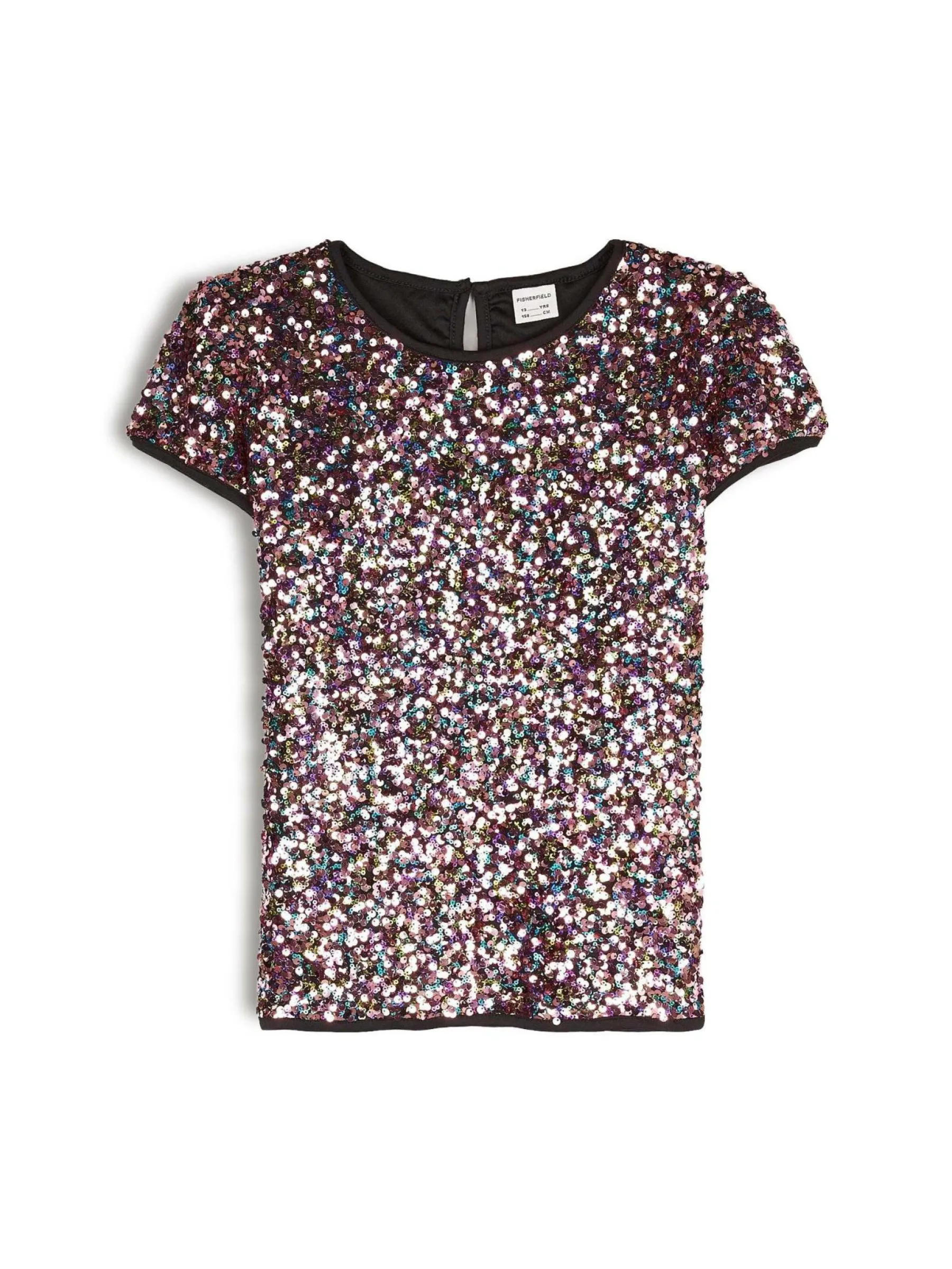 Kolor: czarnyKrój: regularTyp: koszulkaRekaw: krótki rękawDługość: krótkiPattern style: z cekinamiDetal: nad gło…