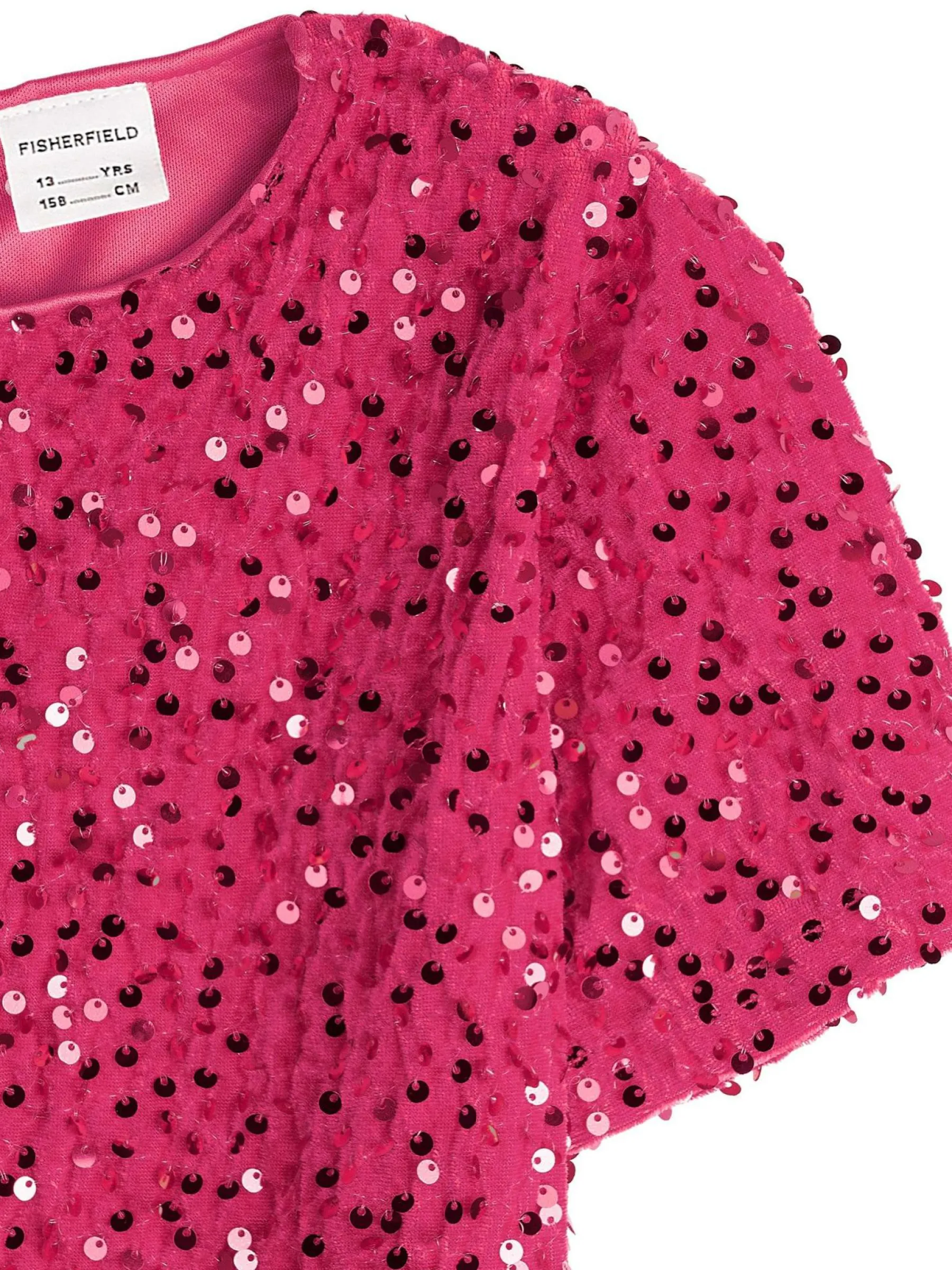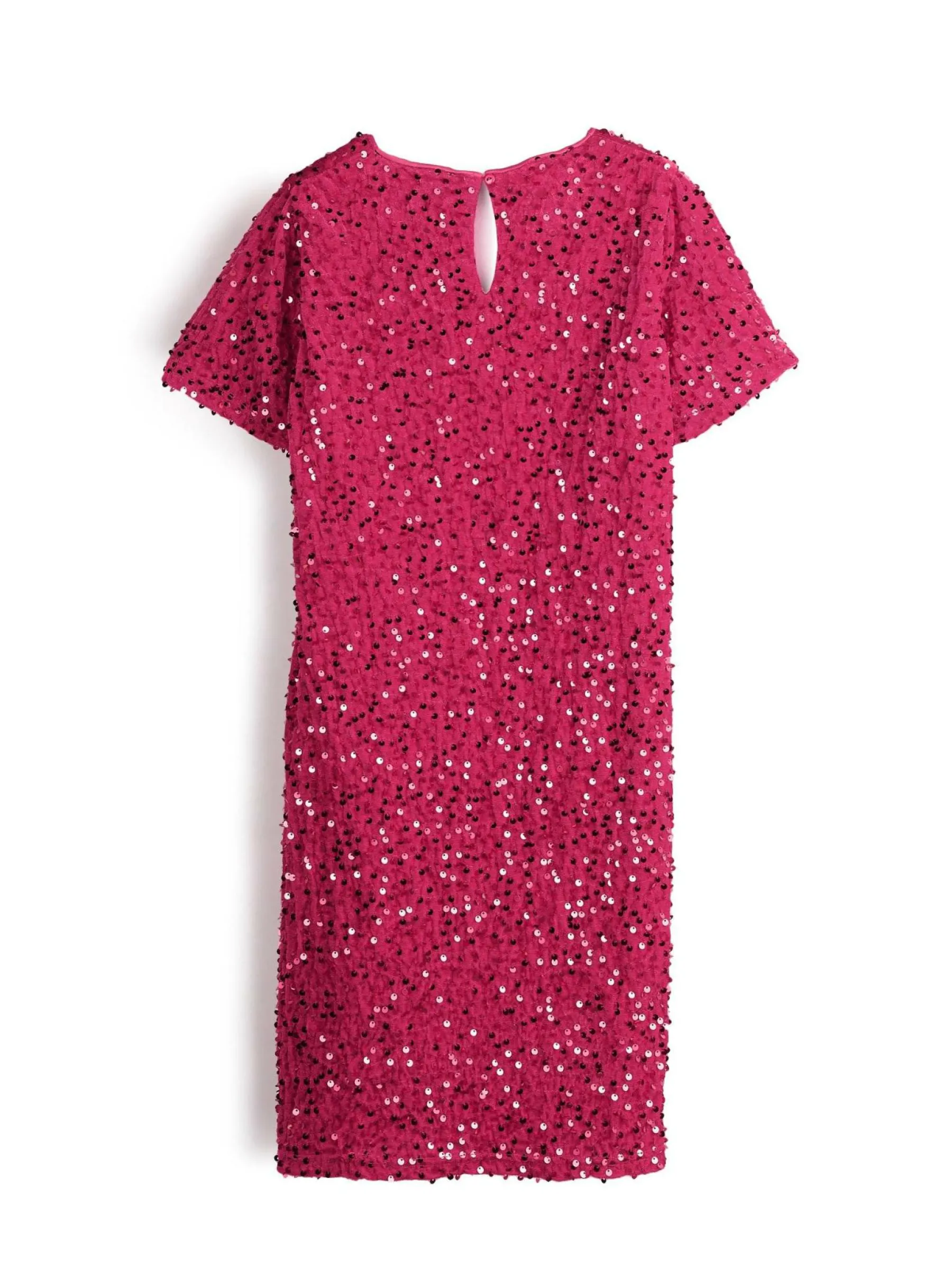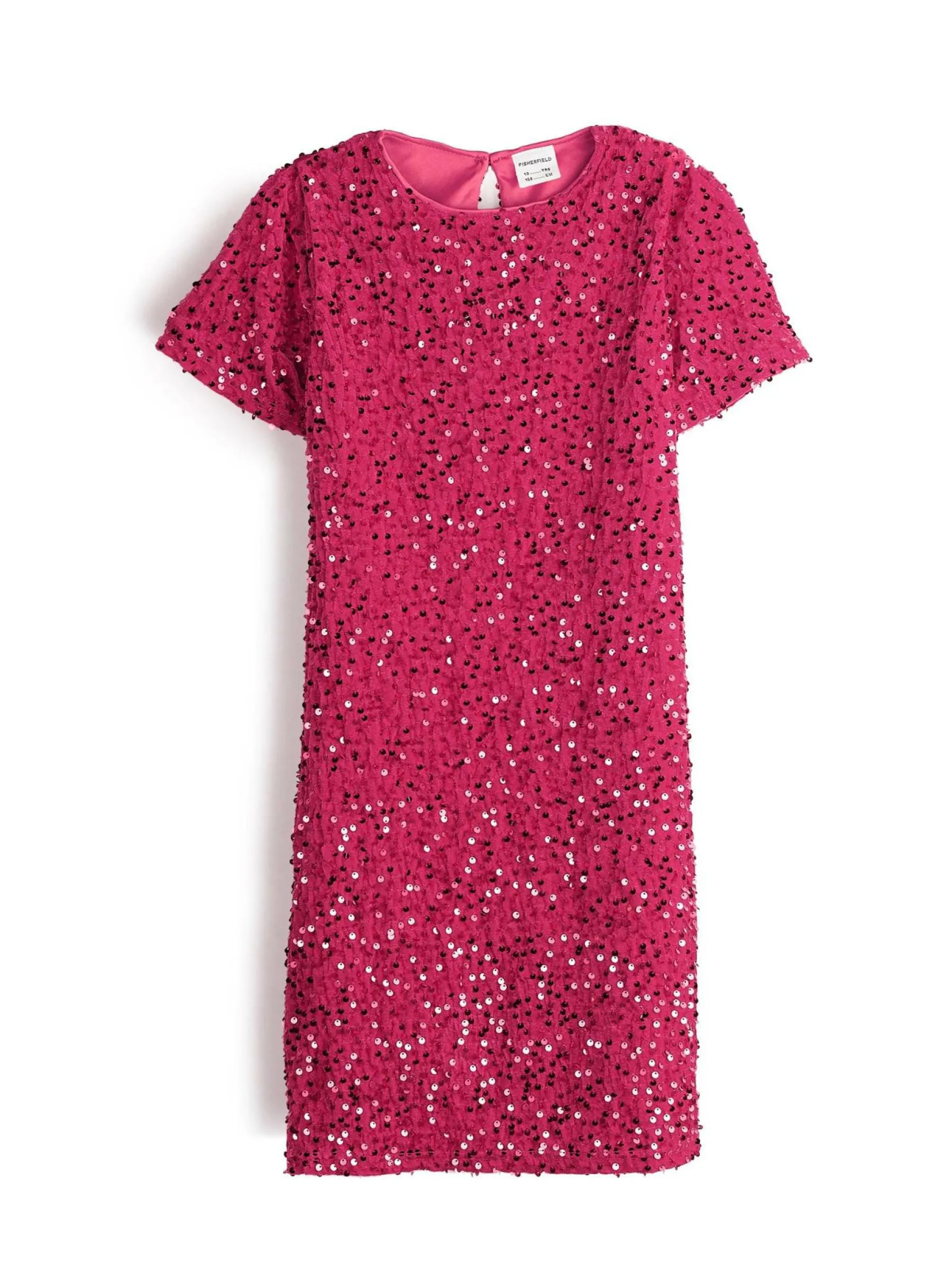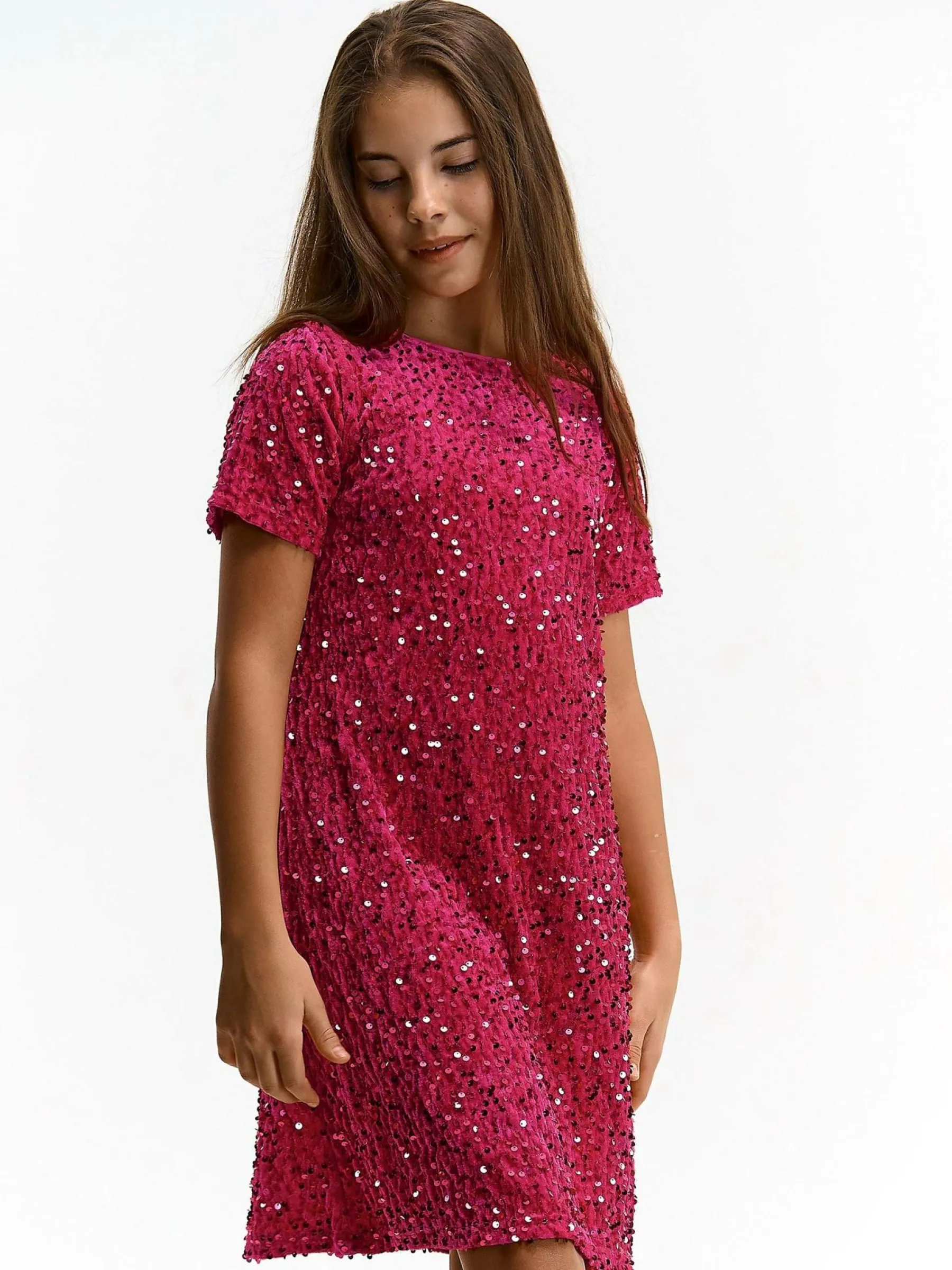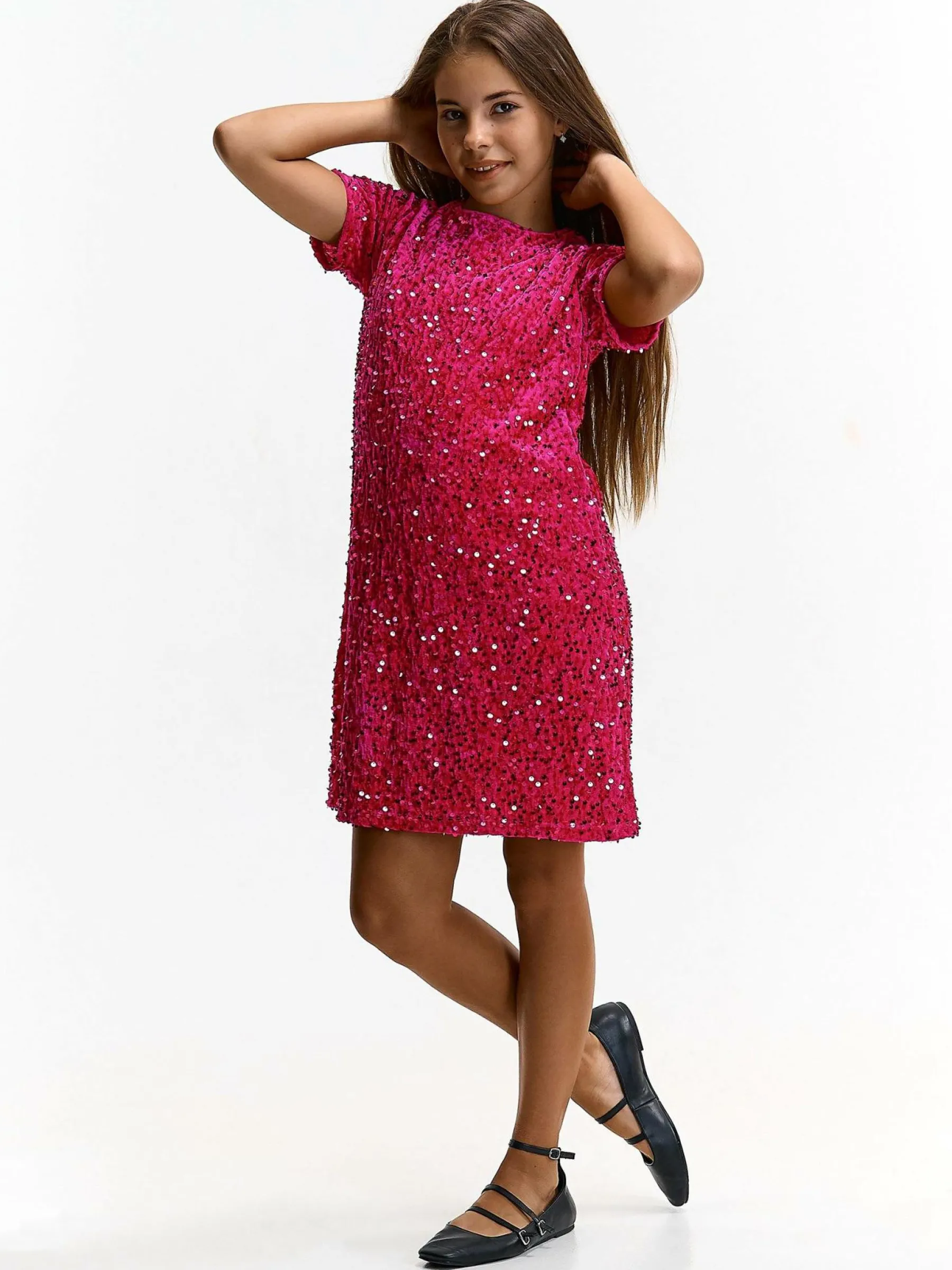 Kolor: różowyKrój: regularTyp: sukienkaRekaw: krótki rękawDługość: miniPattern style: pojedynczy kolor, z cekina…