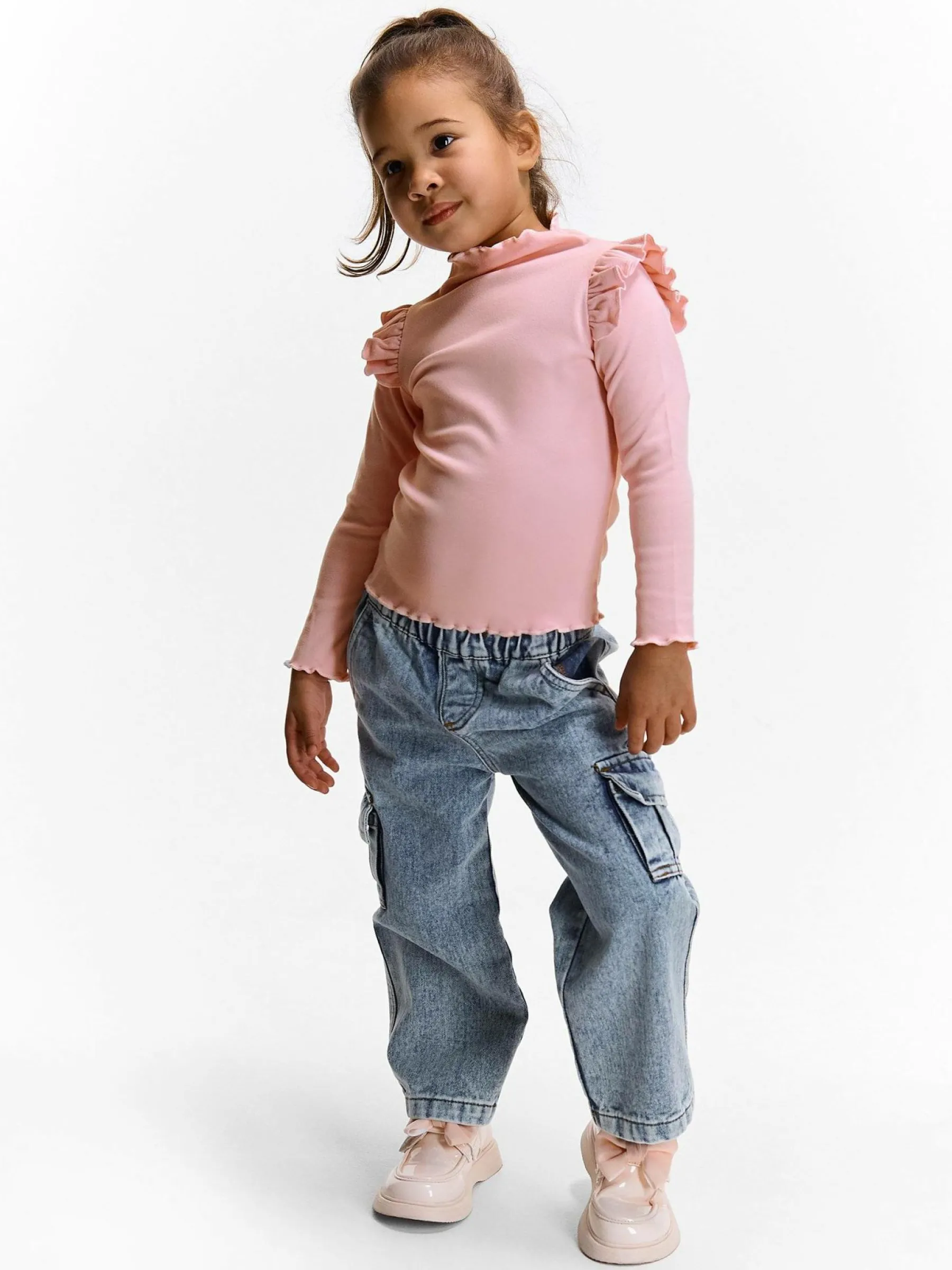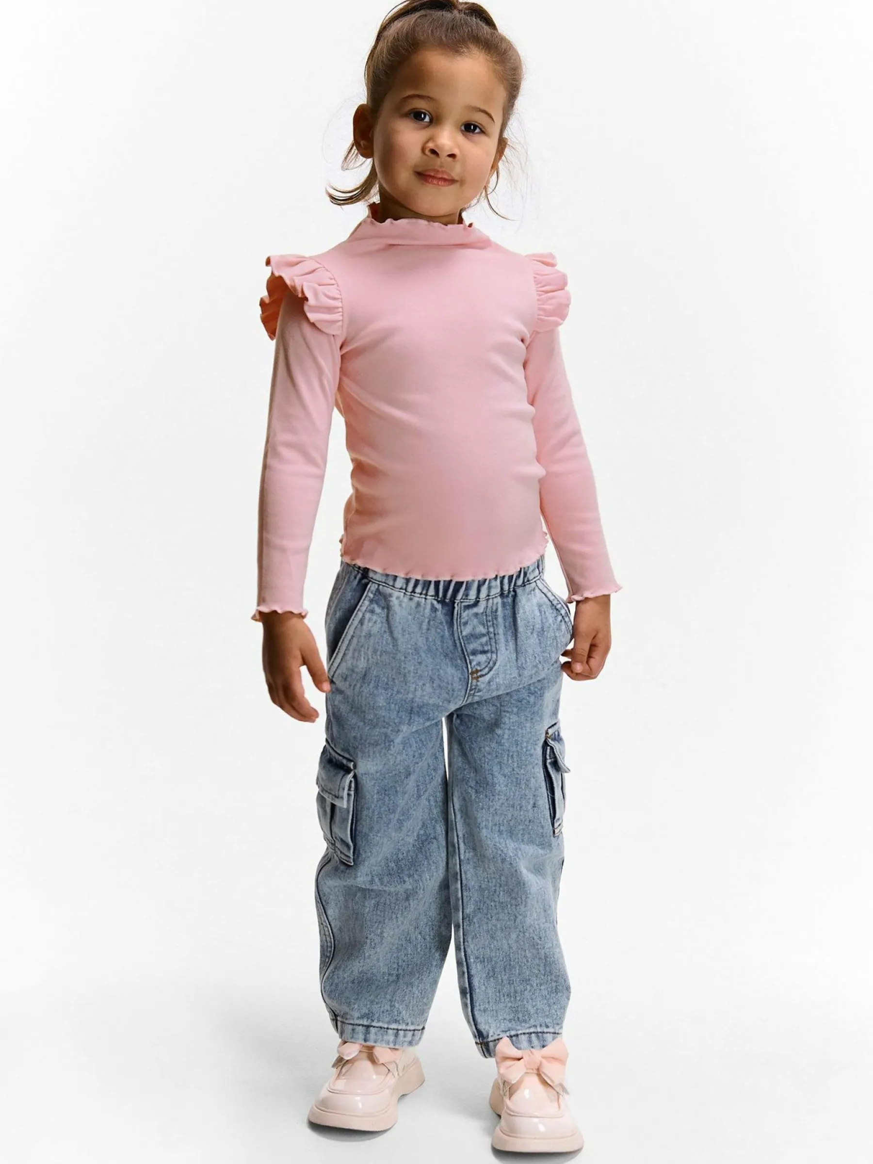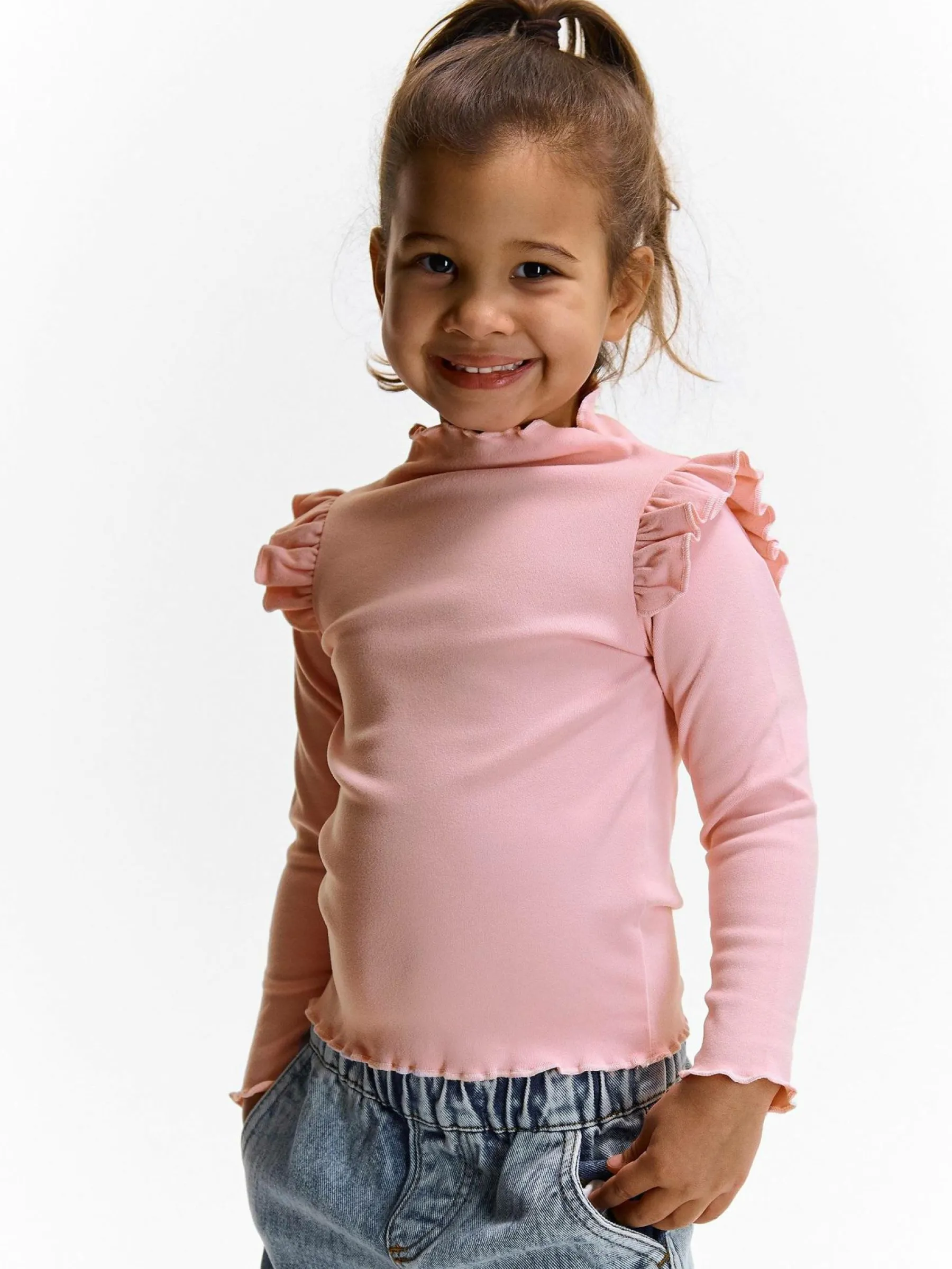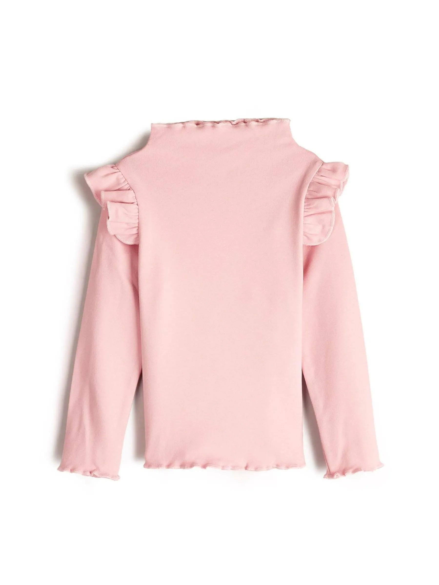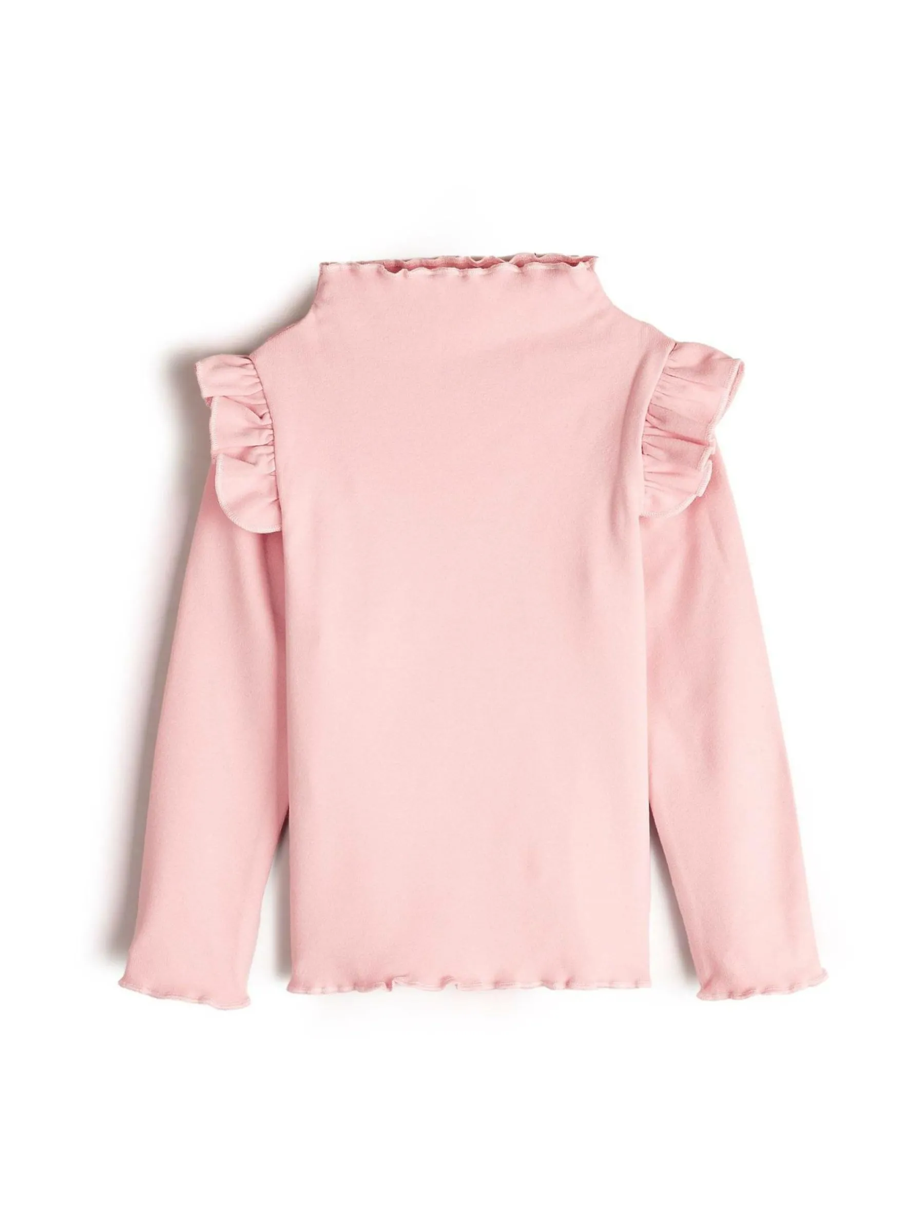 Kolor: różowyKrój: z falbanąTyp: koszulkaRekaw: długi rękawDługość: krótkiPattern style: pojedynczy kolorDetal…