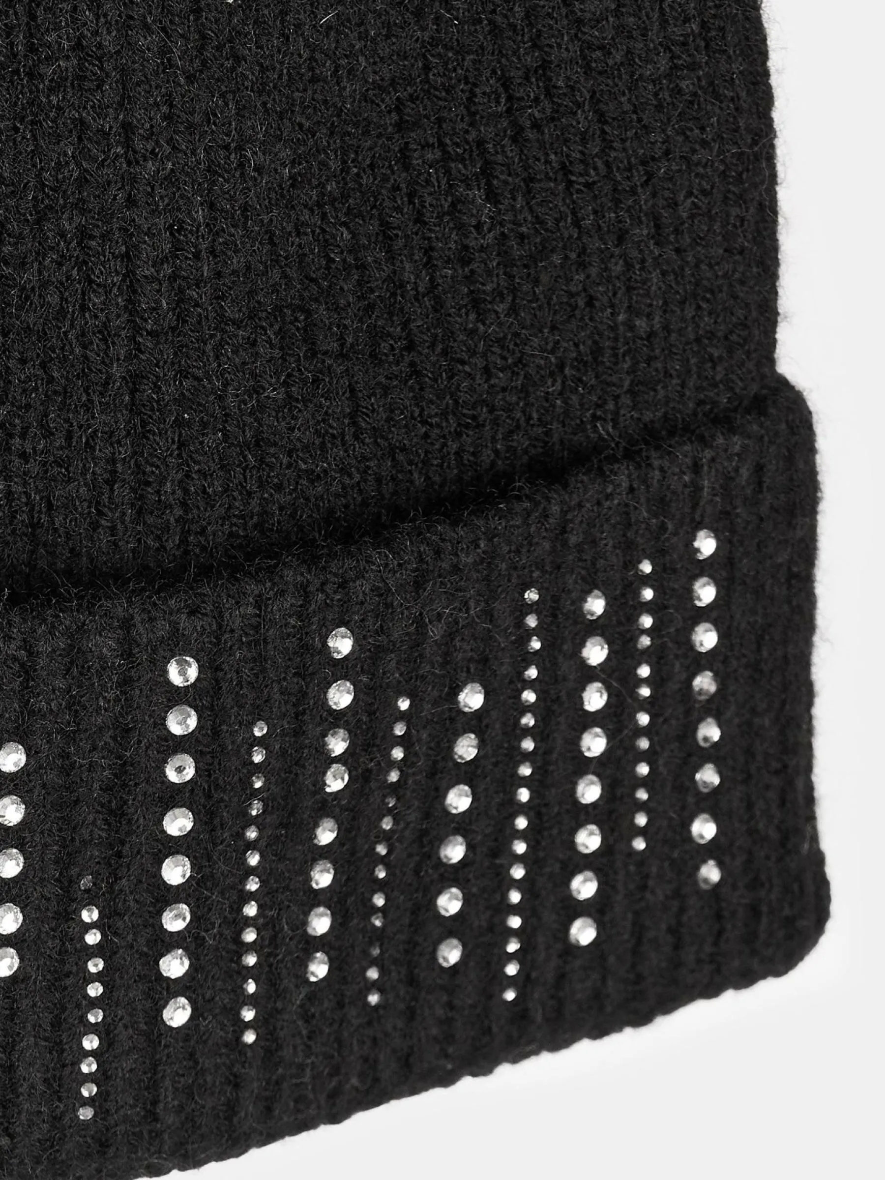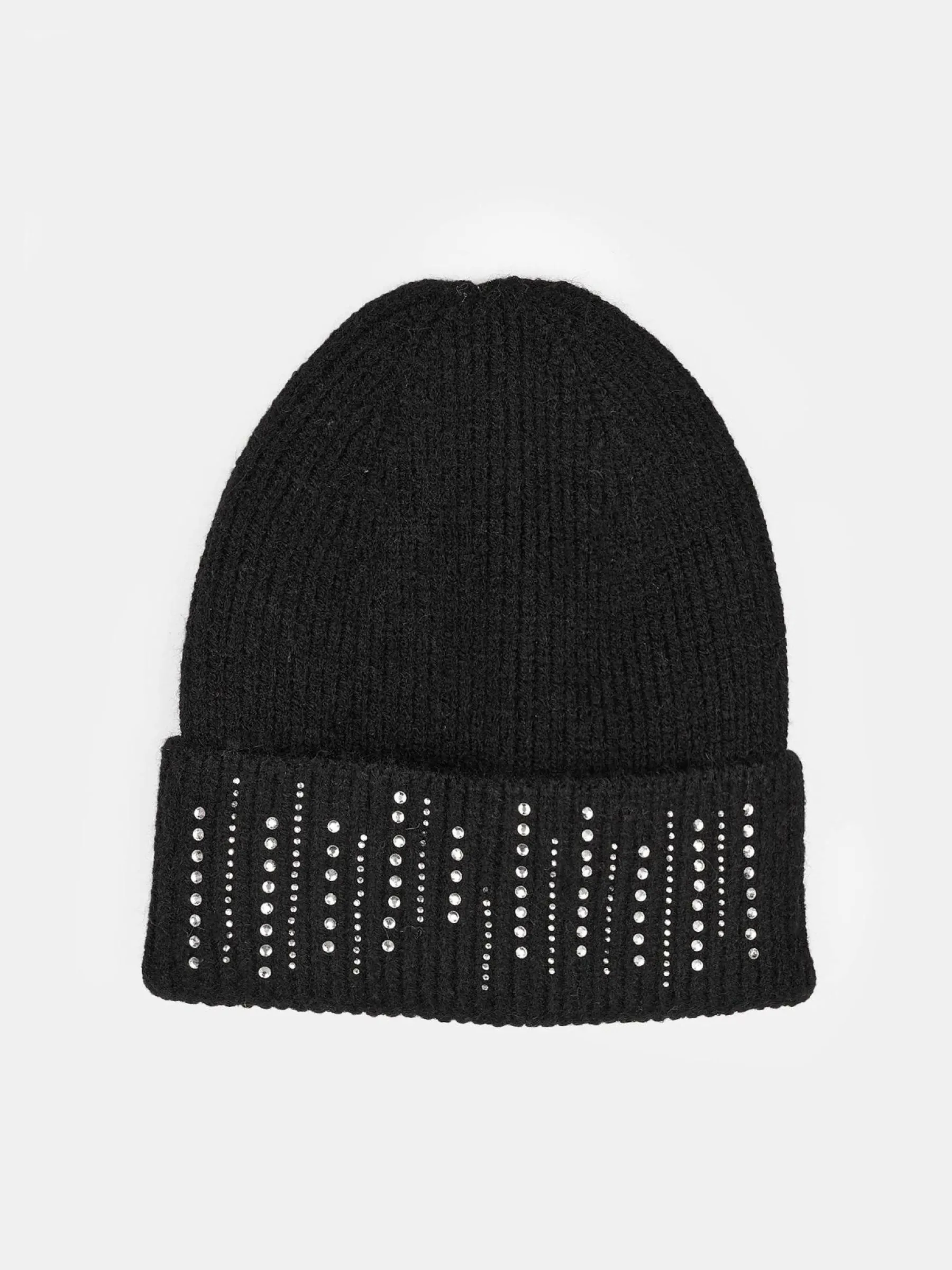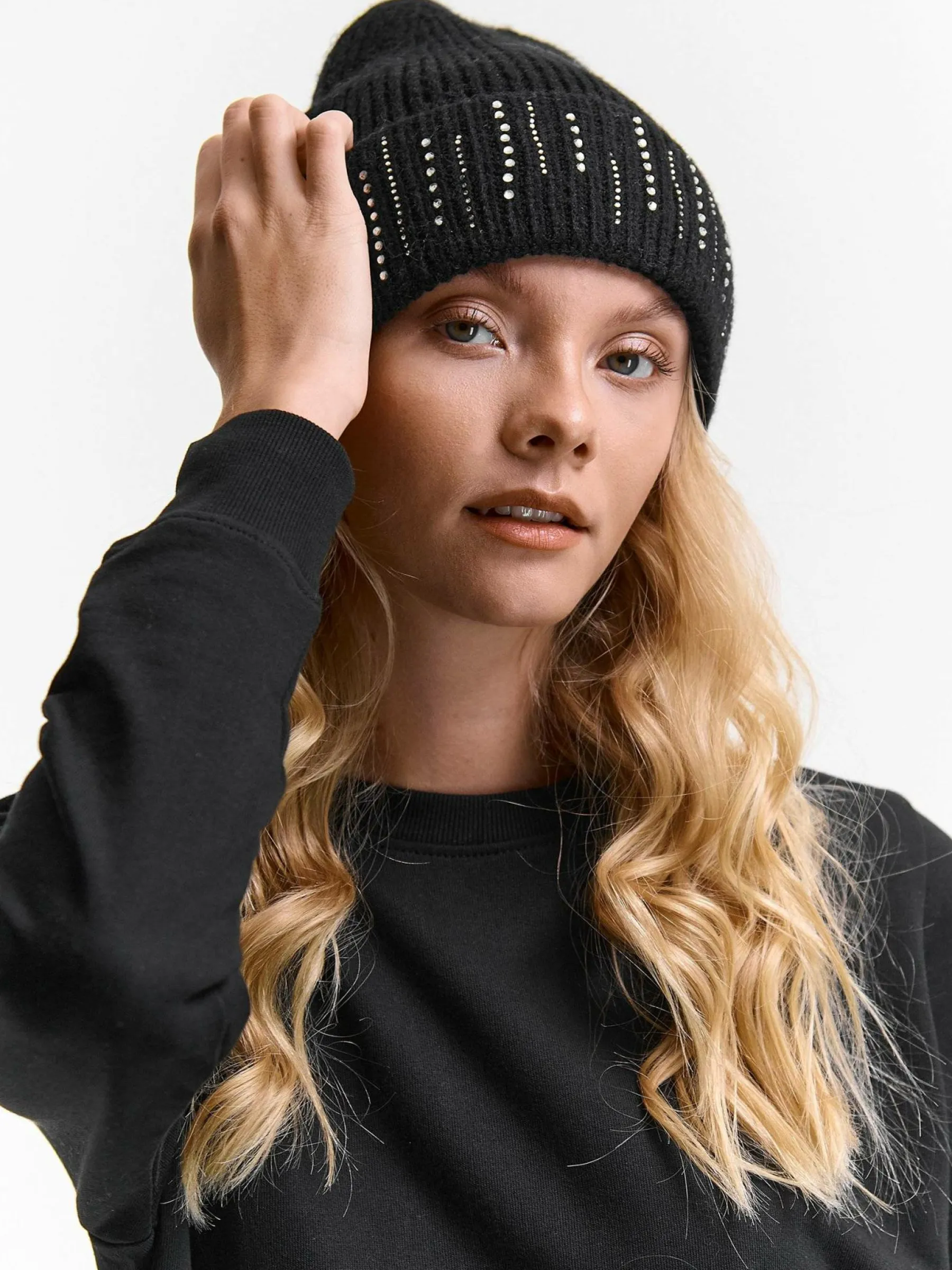 Kolor: czarnyKrój: podstawowyTyp: czapkaPattern style: pojedynczy kolorDetal: z kamieniamiMateriał: trykotowyPłeć: k…