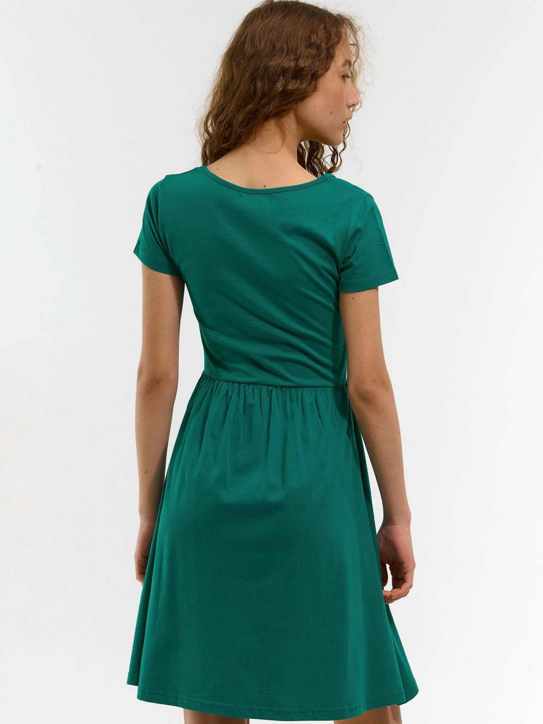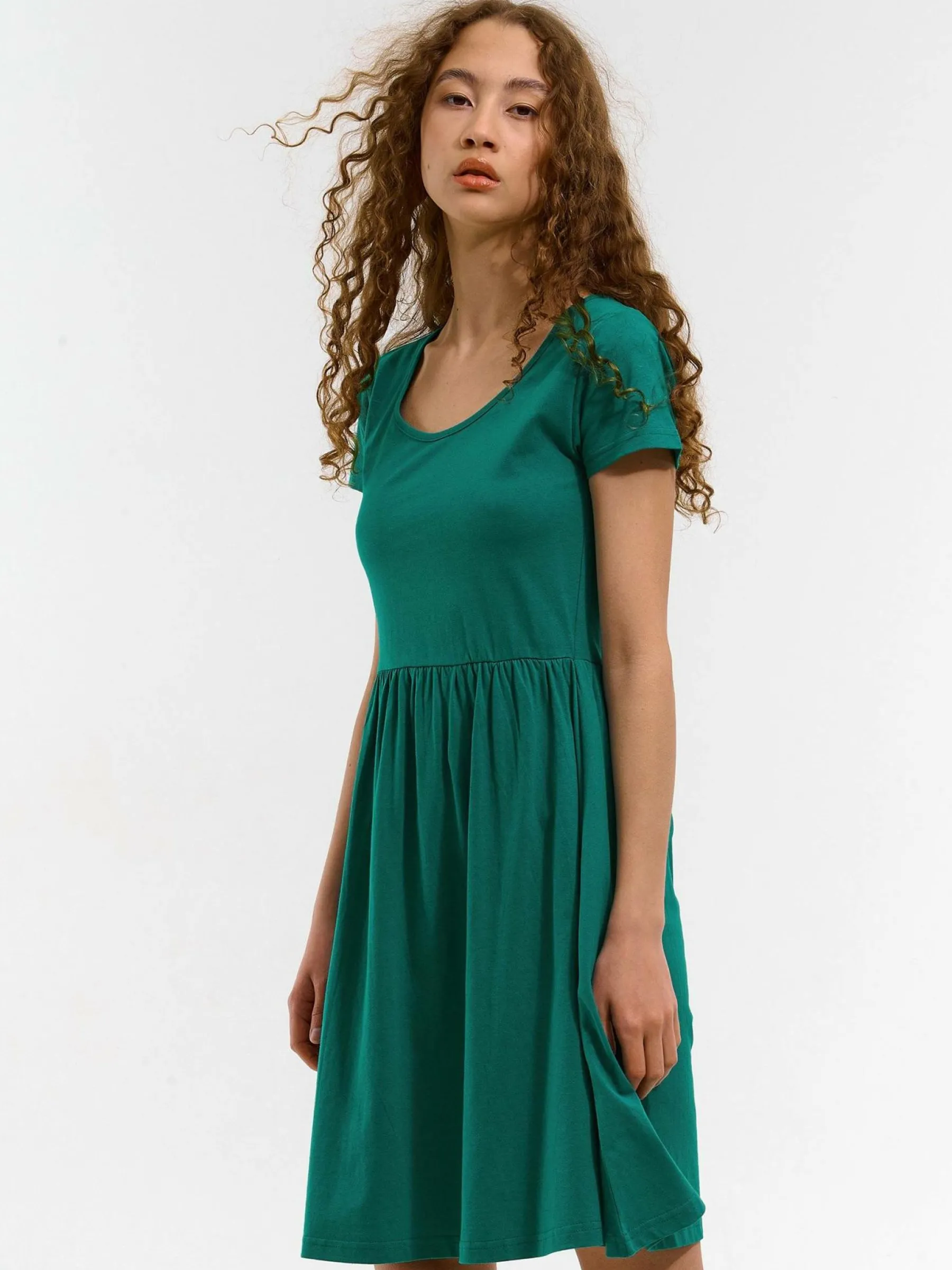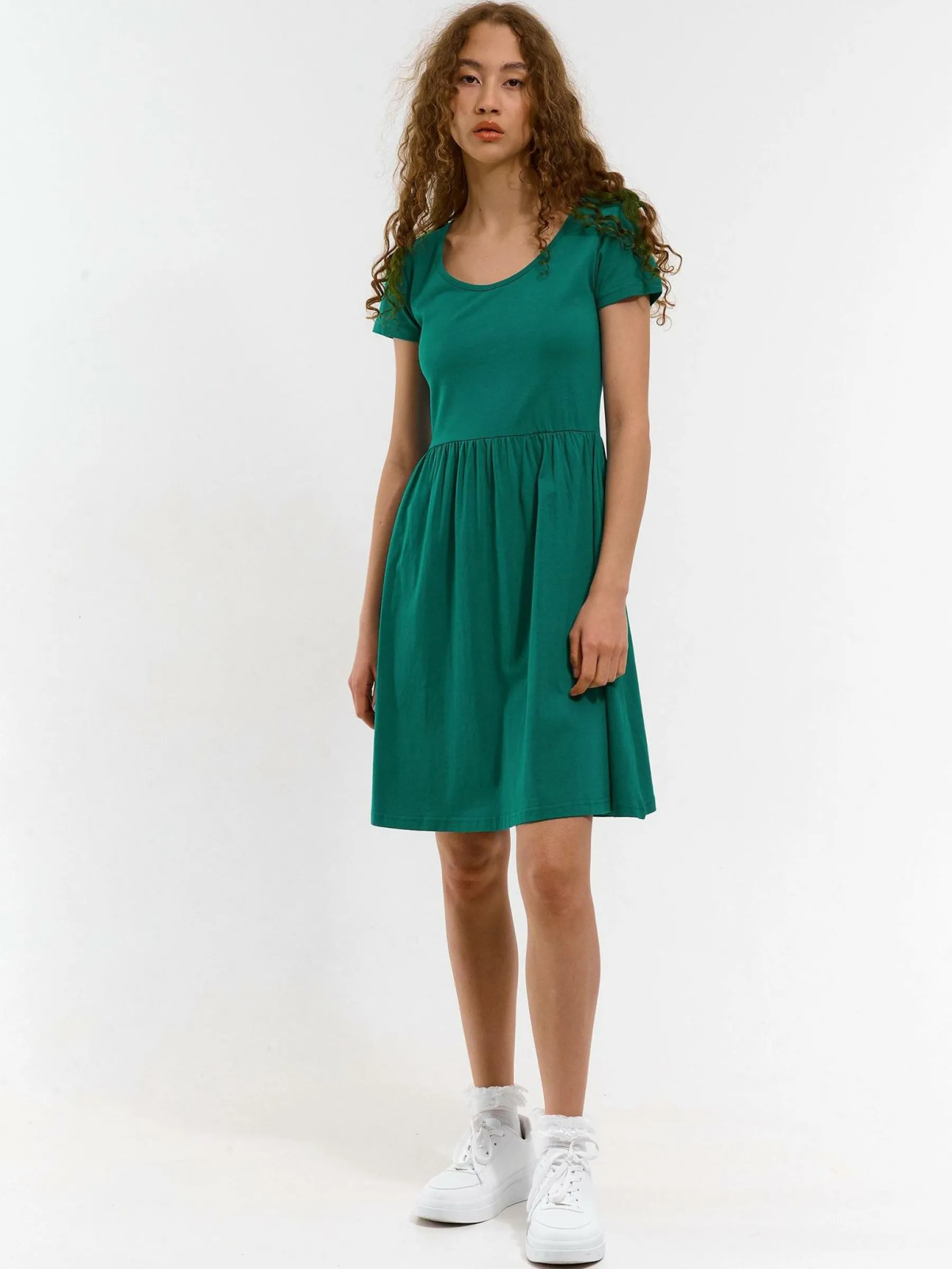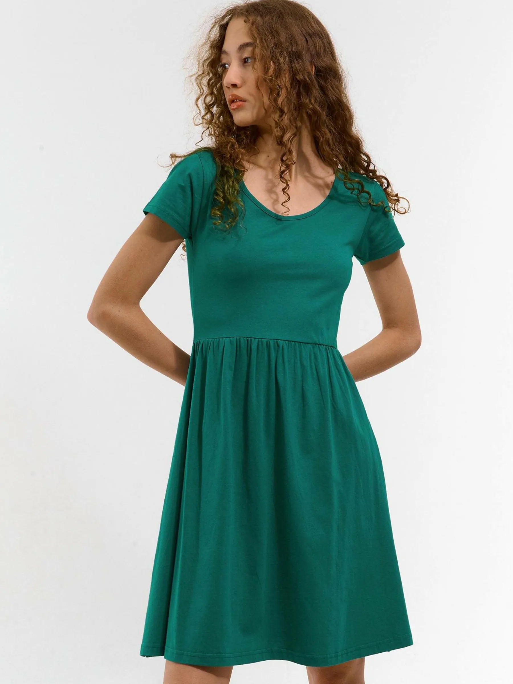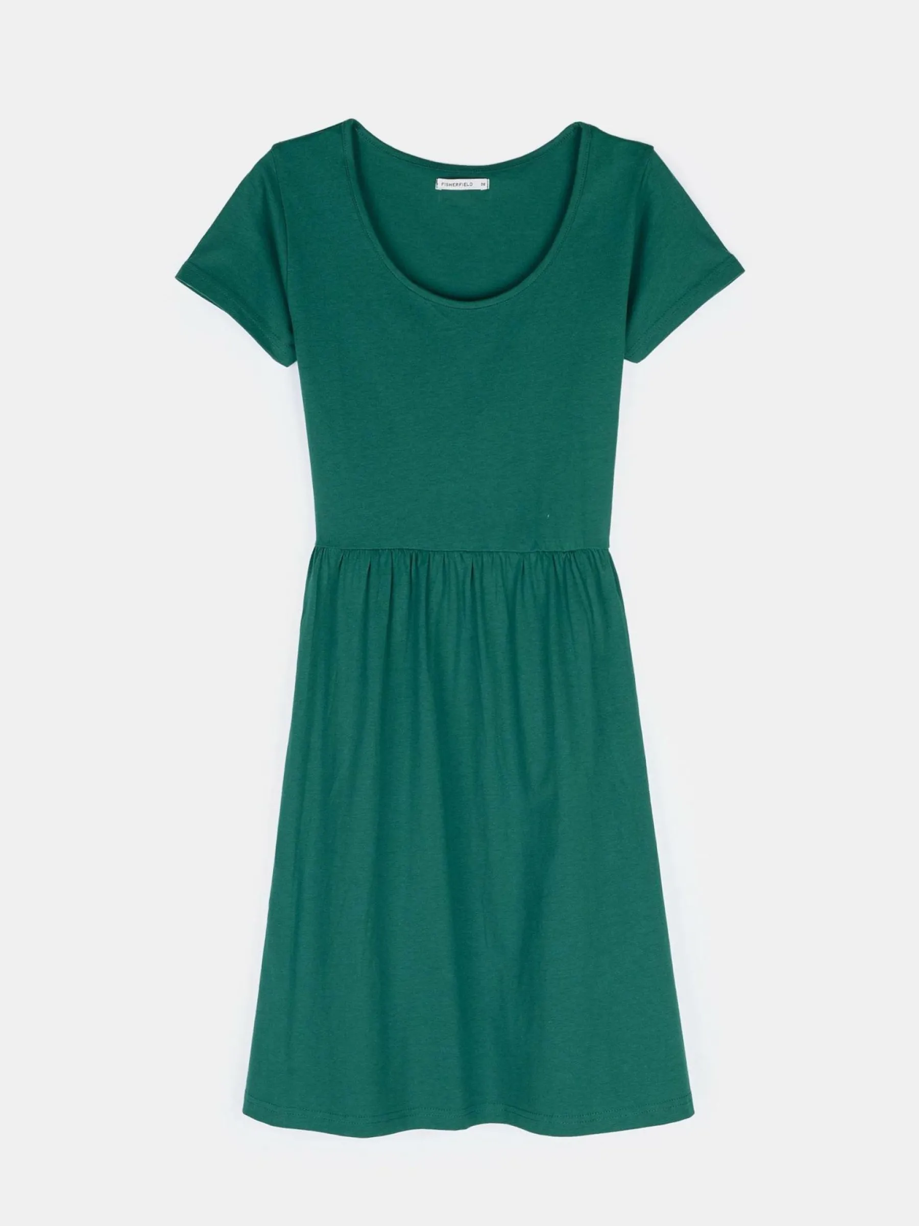 Kolor: zielonyKrój: asyTyp: sukienkaRekaw: krótki rękawDługość: miniPattern style: pojedynczy kolorDetal: nad gło…