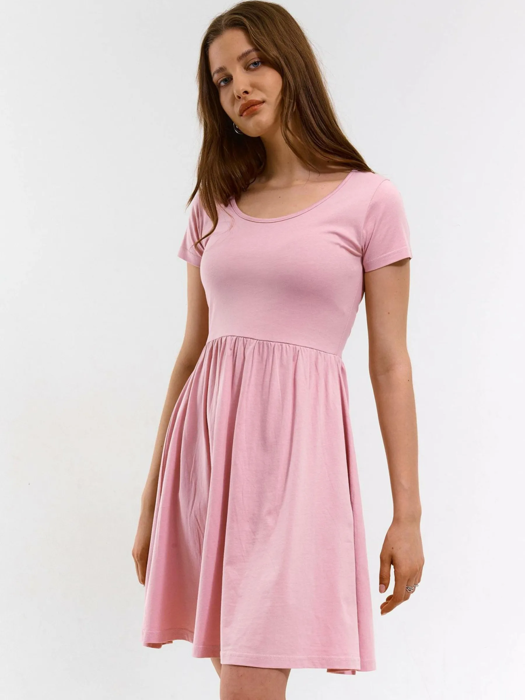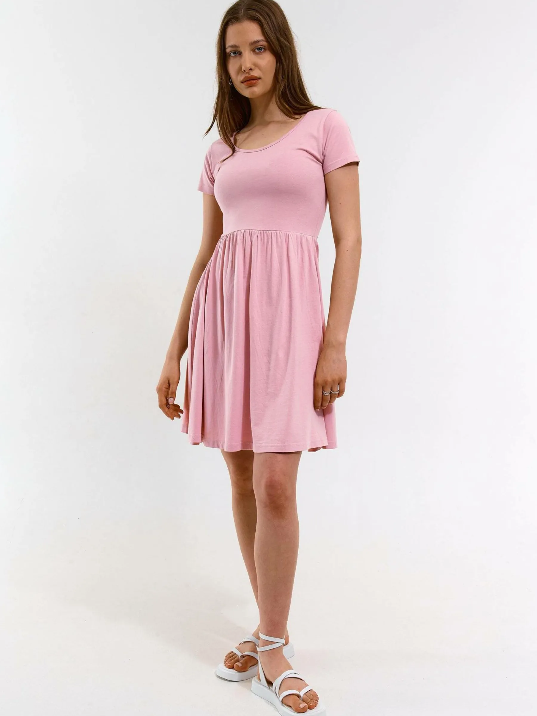 Kolor: różowyKrój: asyTyp: sukienkaRekaw: krótki rękawDługość: miniPattern style: pojedynczy kolorDetal: nad gł…