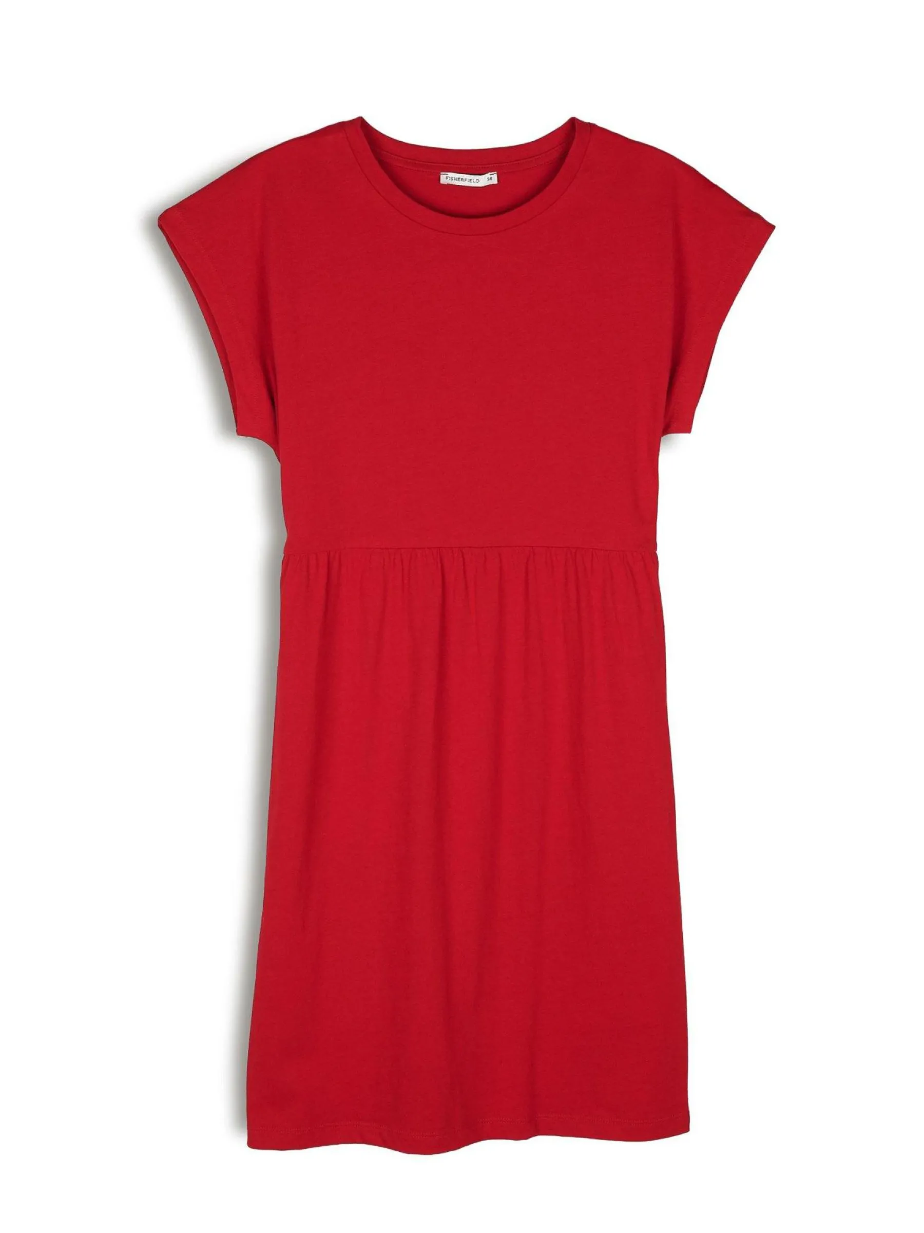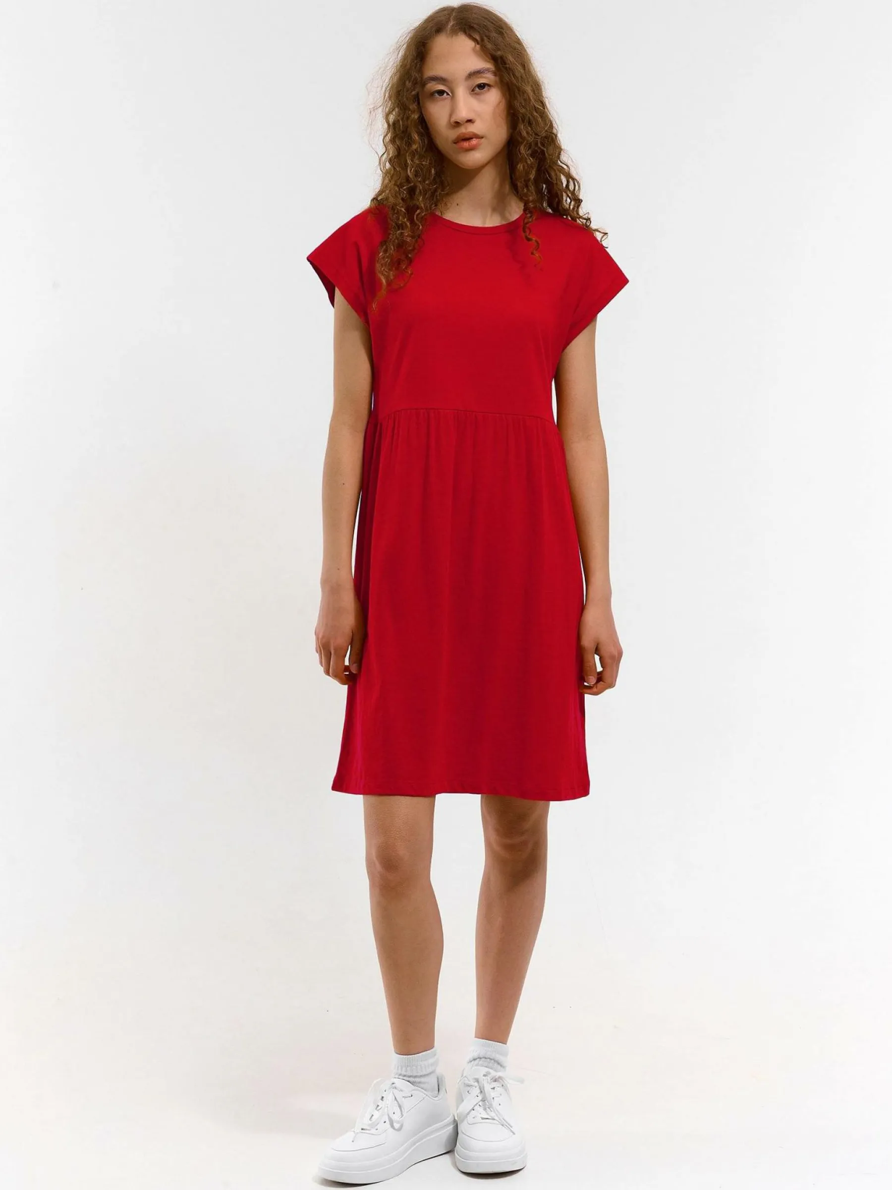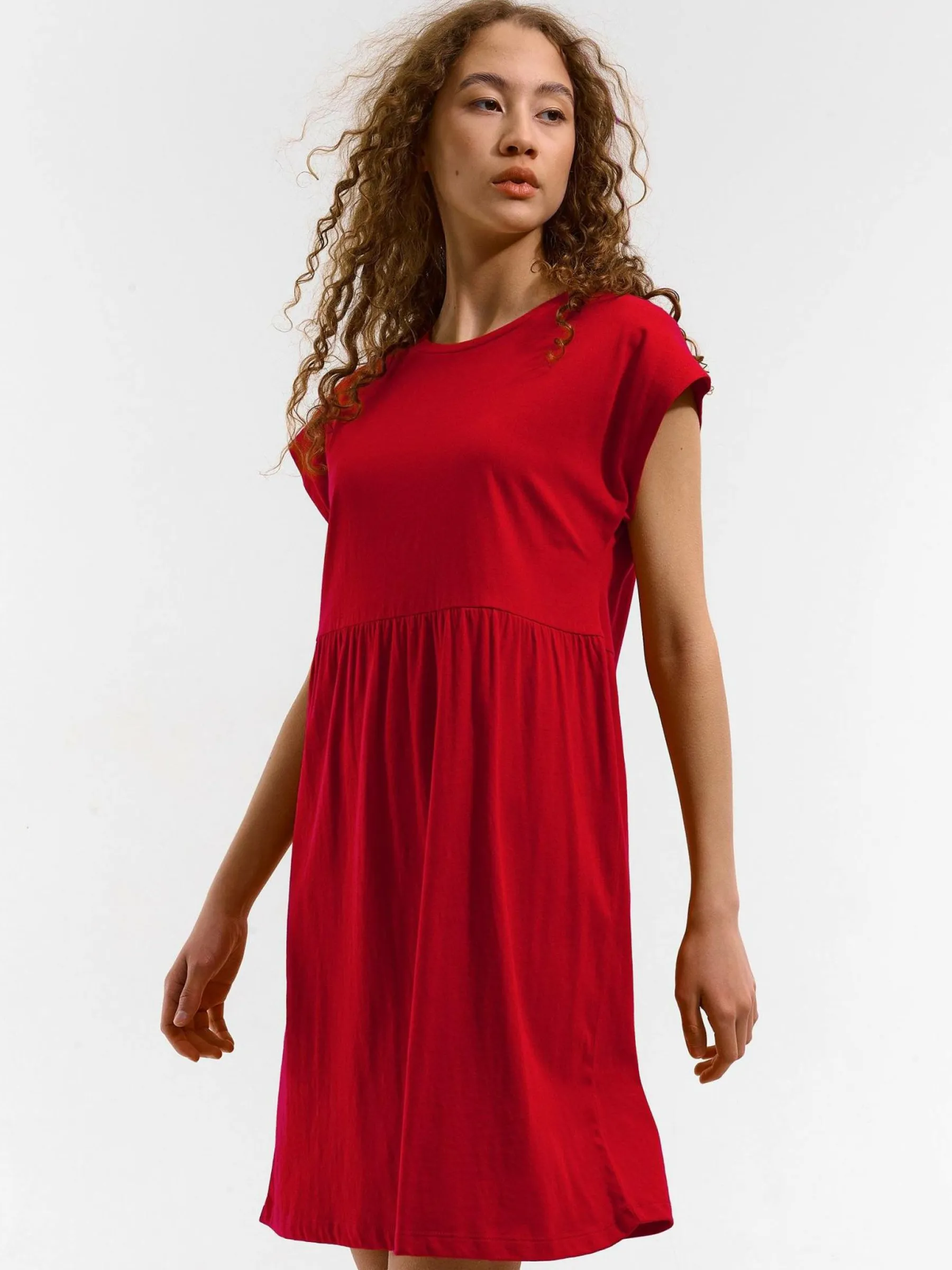 Kolor: czerwonyKrój: asyTyp: sukienkaRekaw: krótki rękawDługość: miniPattern style: pojedynczy kolorDetal: nad gł…