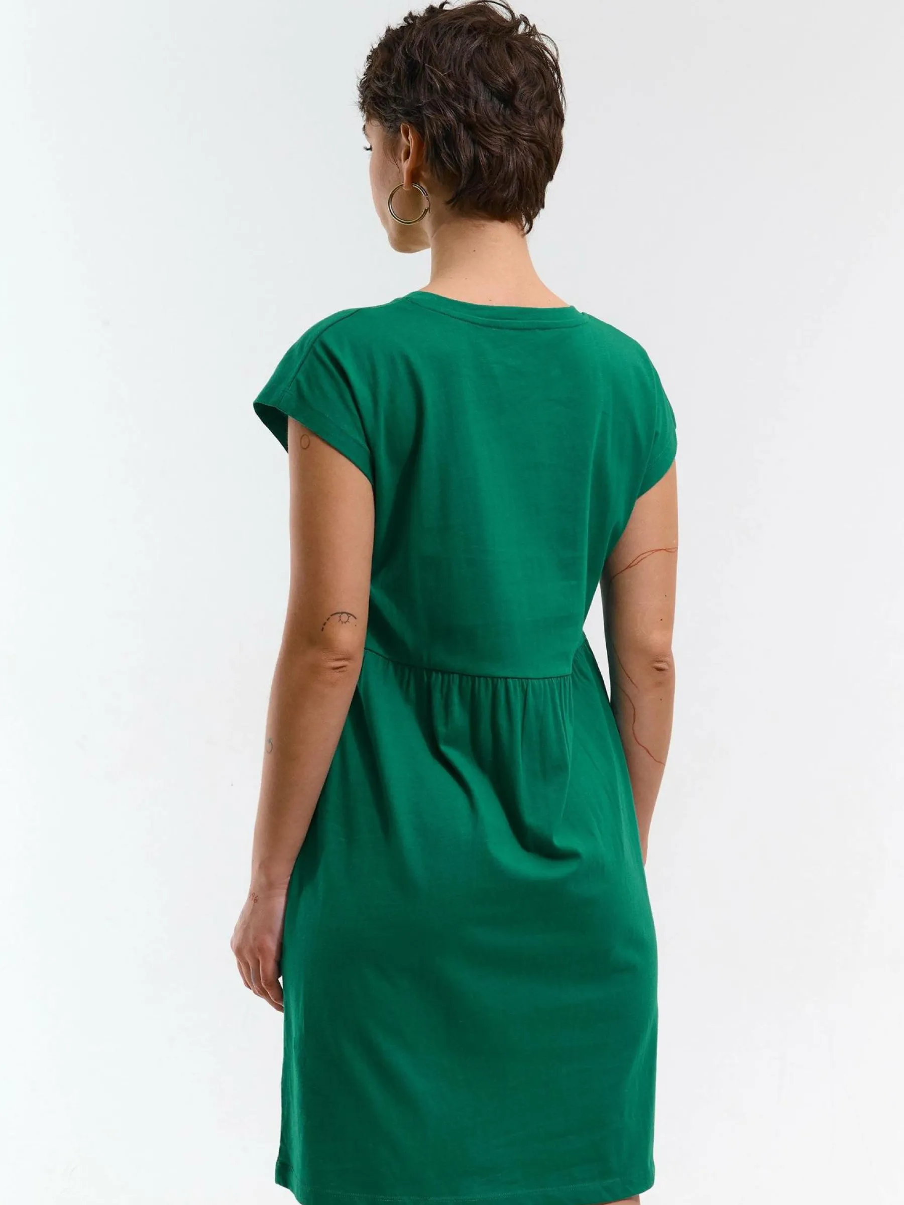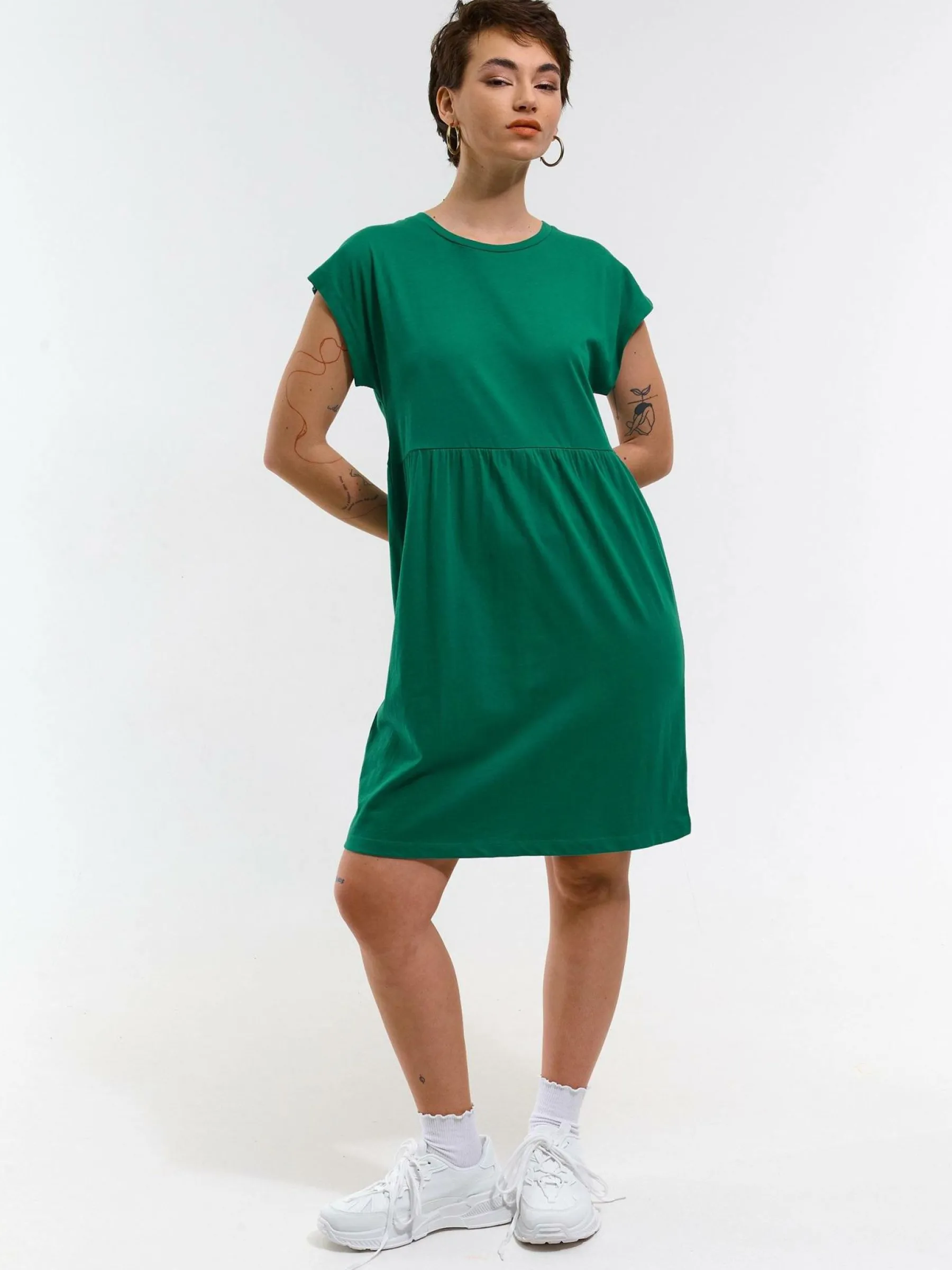 Kolor: zielonyKrój: asyTyp: sukienkaRekaw: krótki rękawDługość: miniPattern style: pojedynczy kolorMateriał: bawe…
