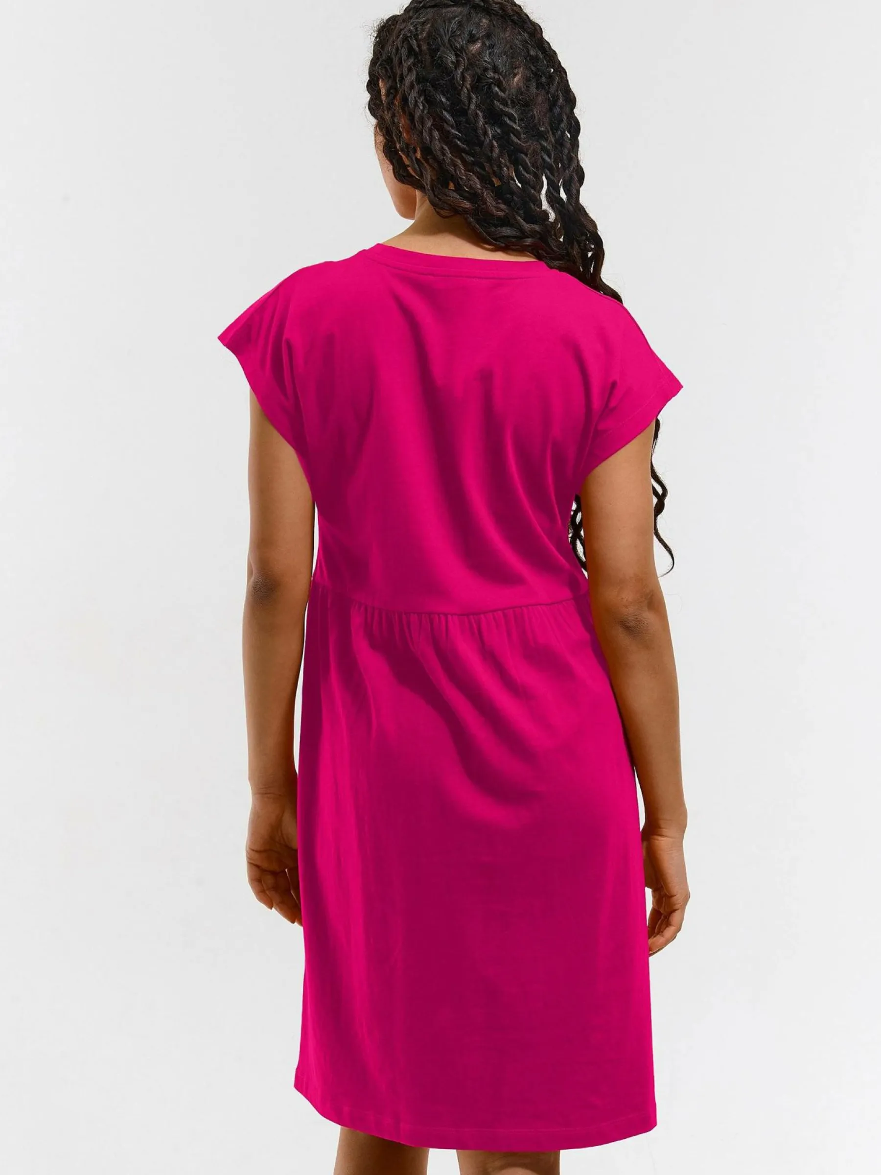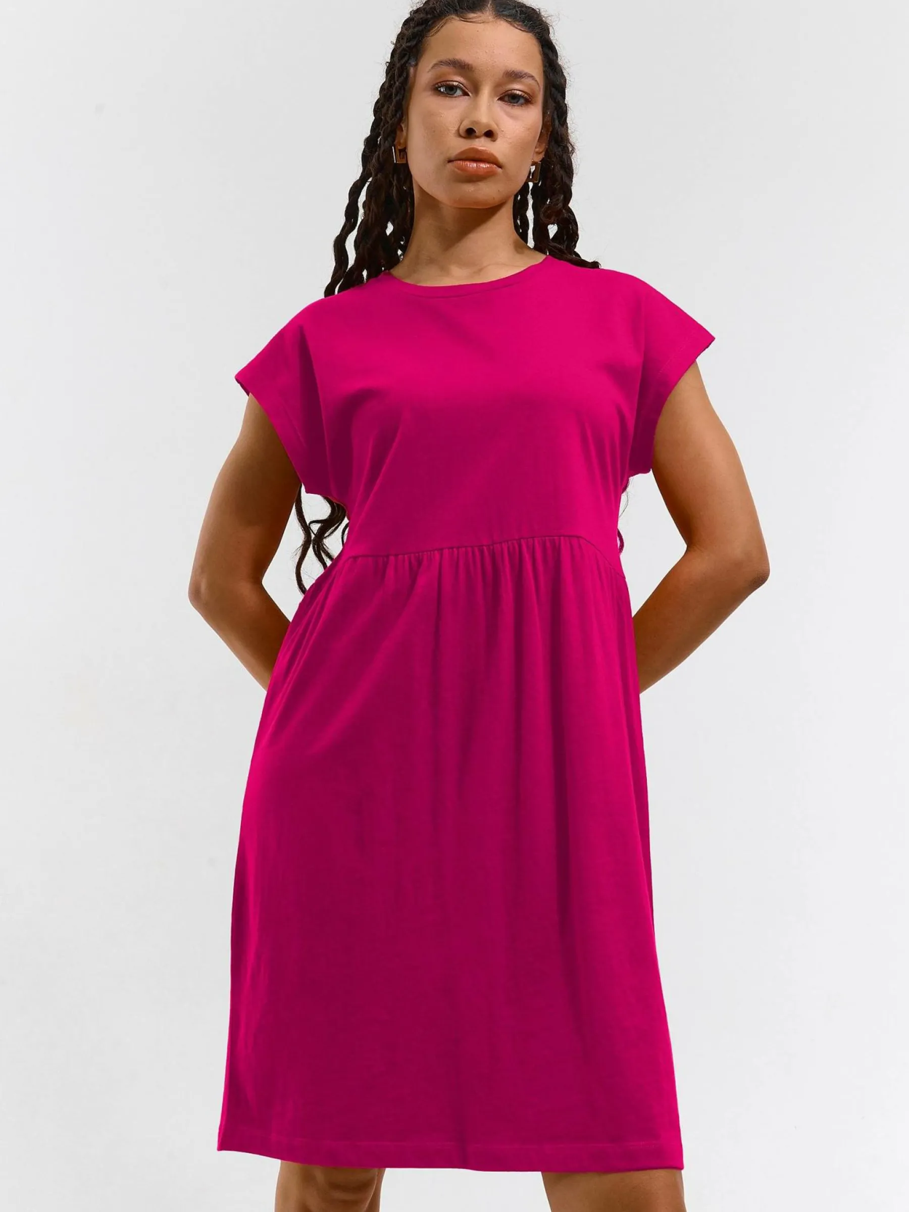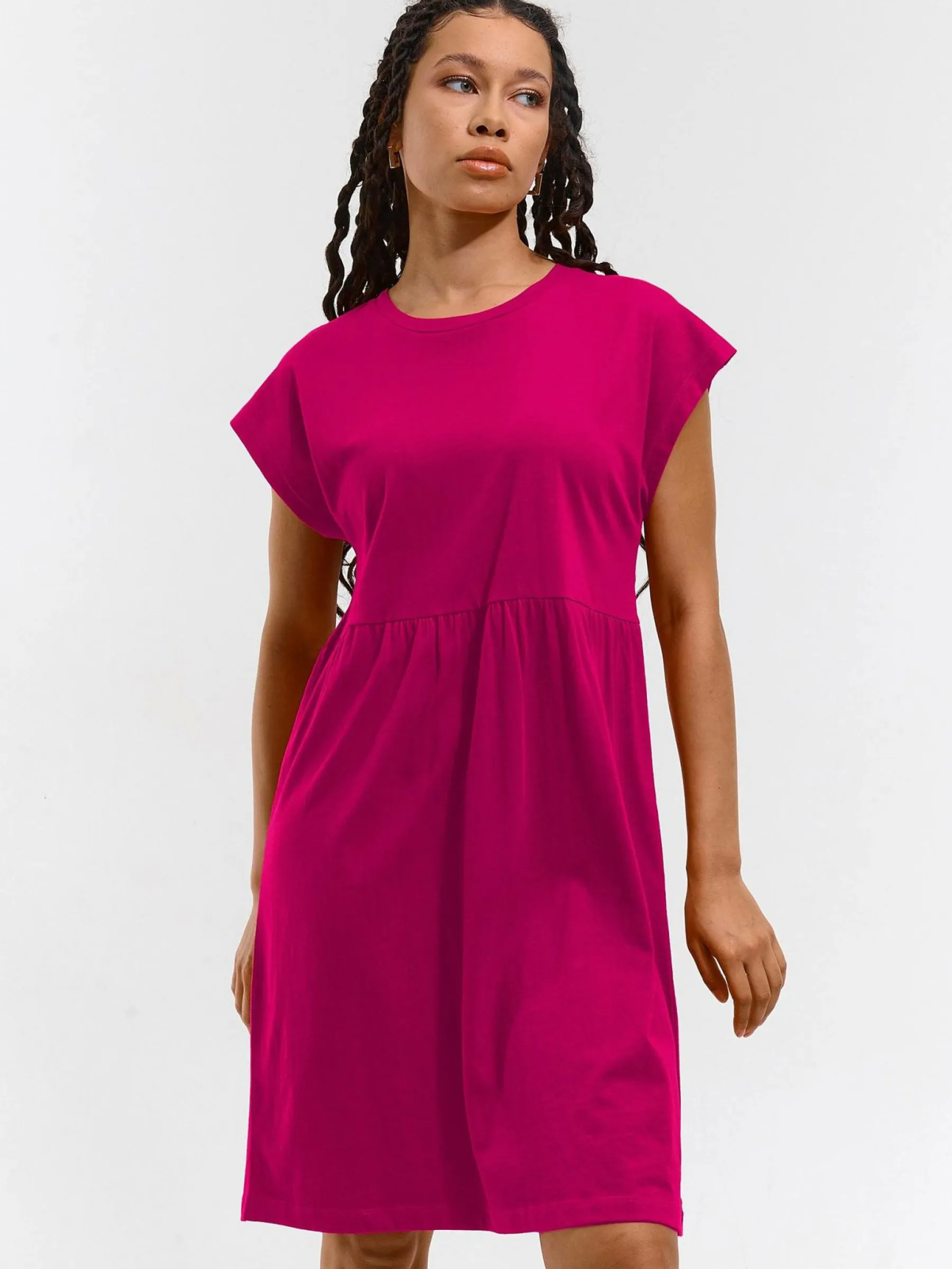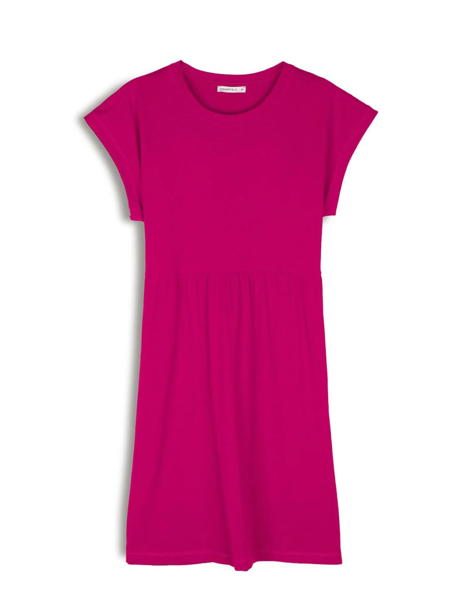 Kolor: różowyKrój: asyTyp: sukienkaRekaw: krótki rękawDługość: miniPattern style: pojedynczy kolorDetal: nad gł…