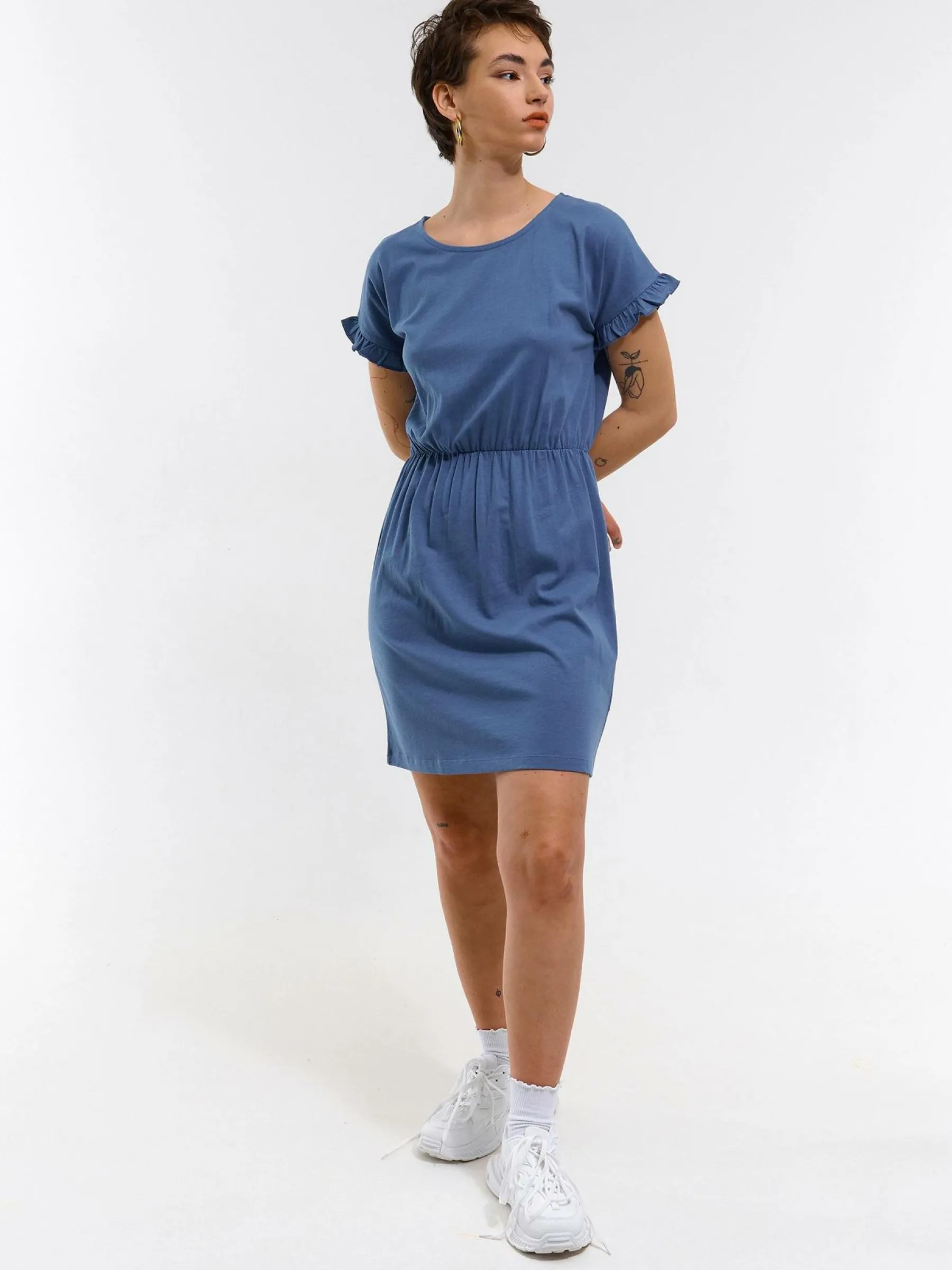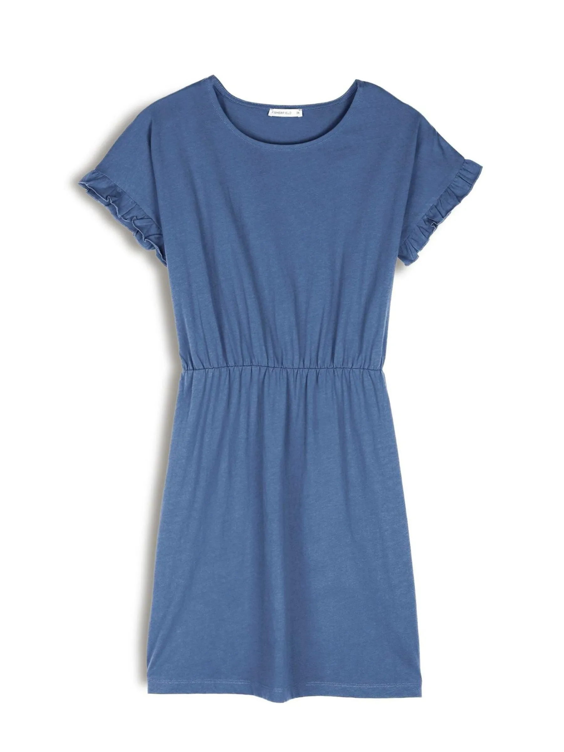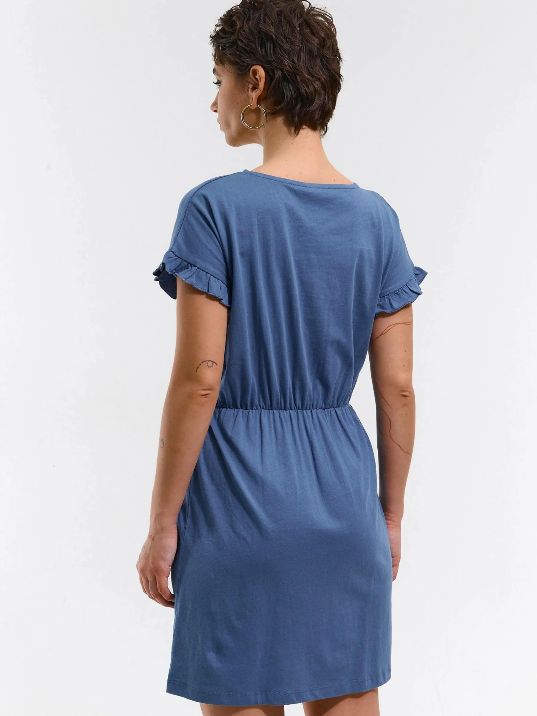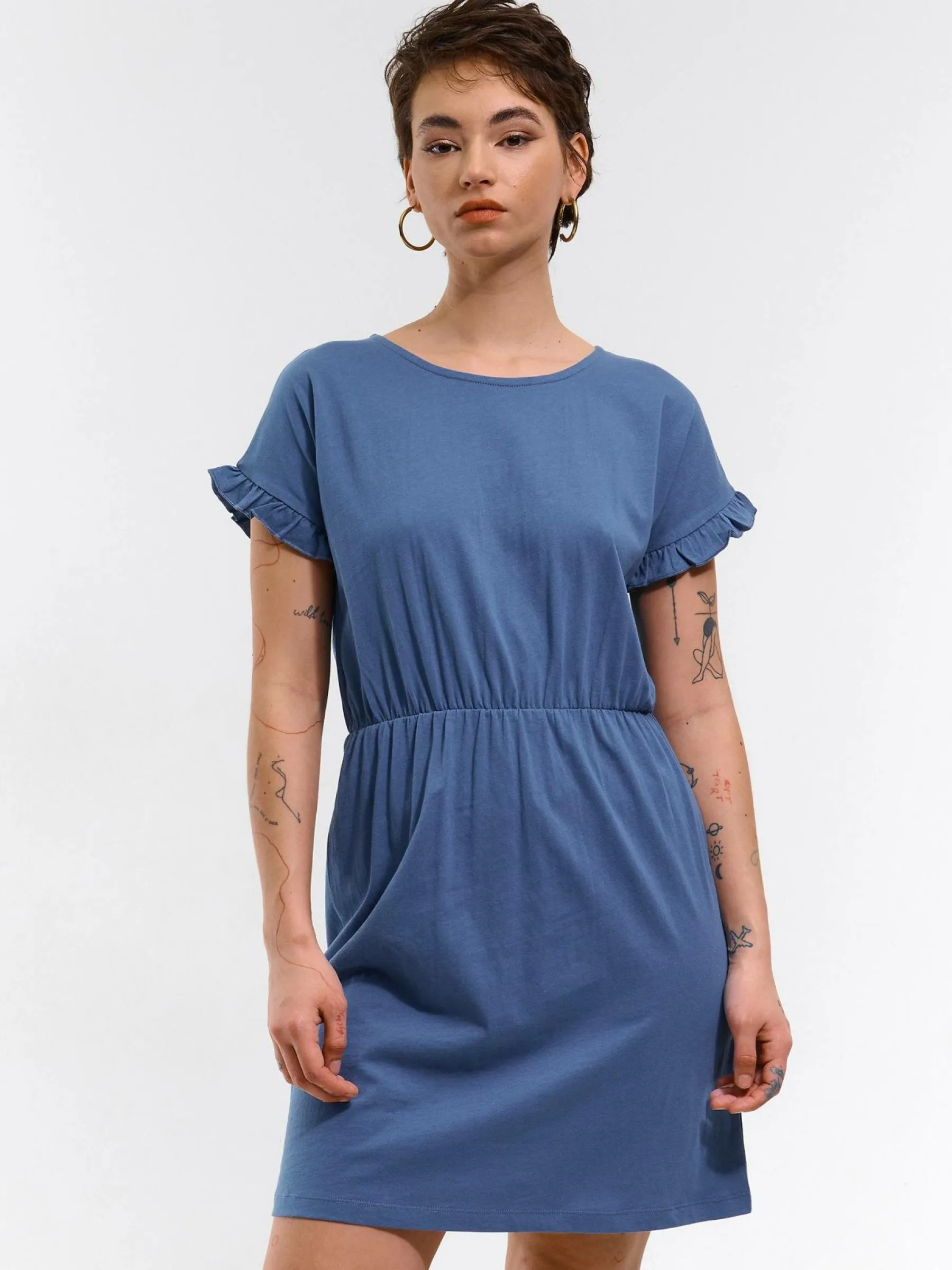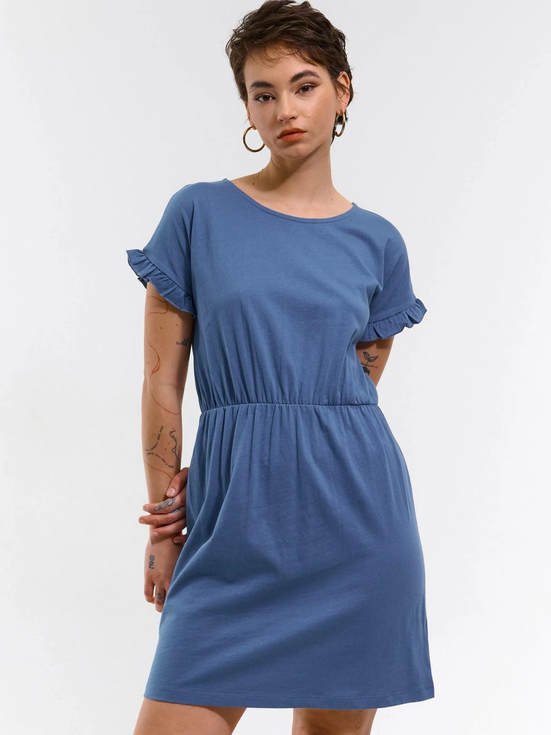 Kolor: niebieskiKrój: asy, z marszczeniemTyp: sukienkaRekaw: krótki rękawDługość: miniPattern style: pojedynczy ko…