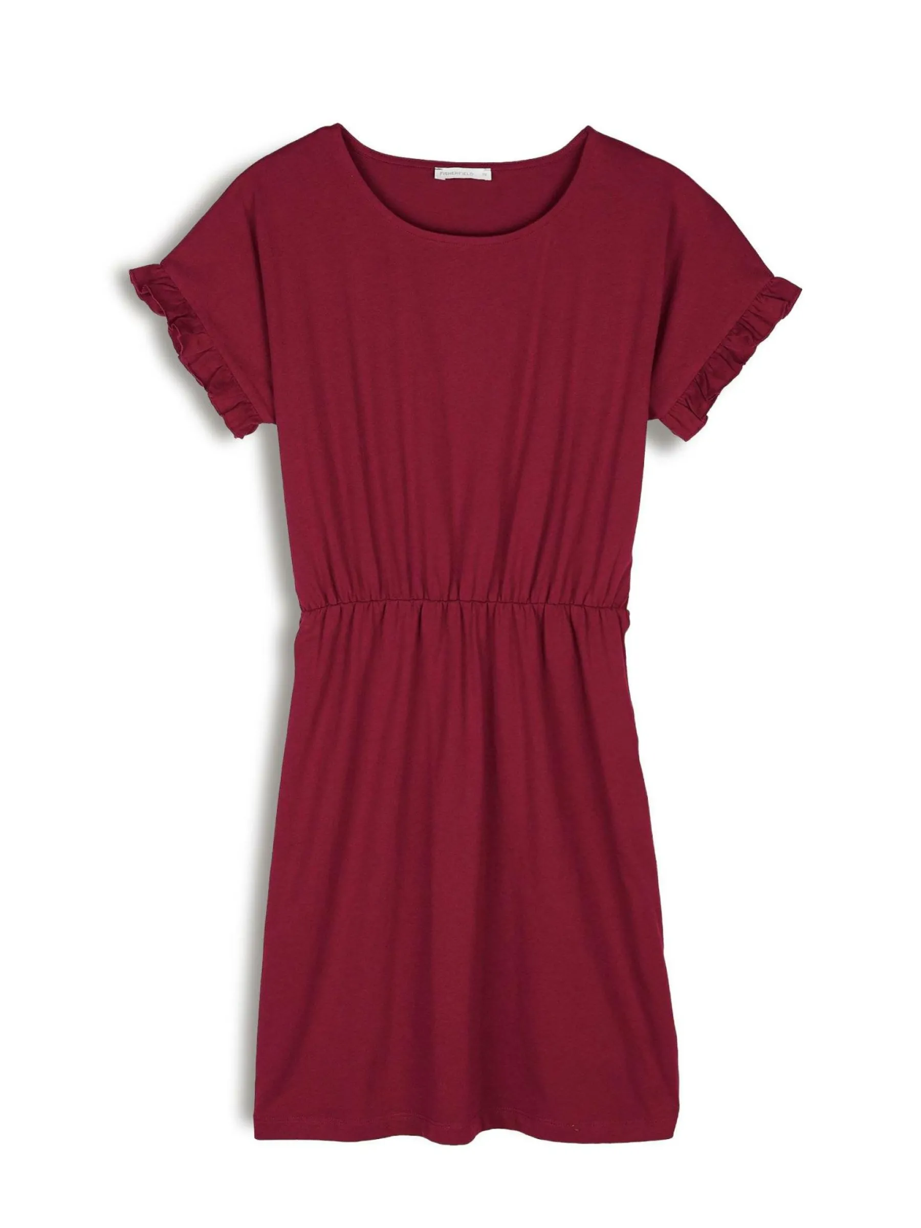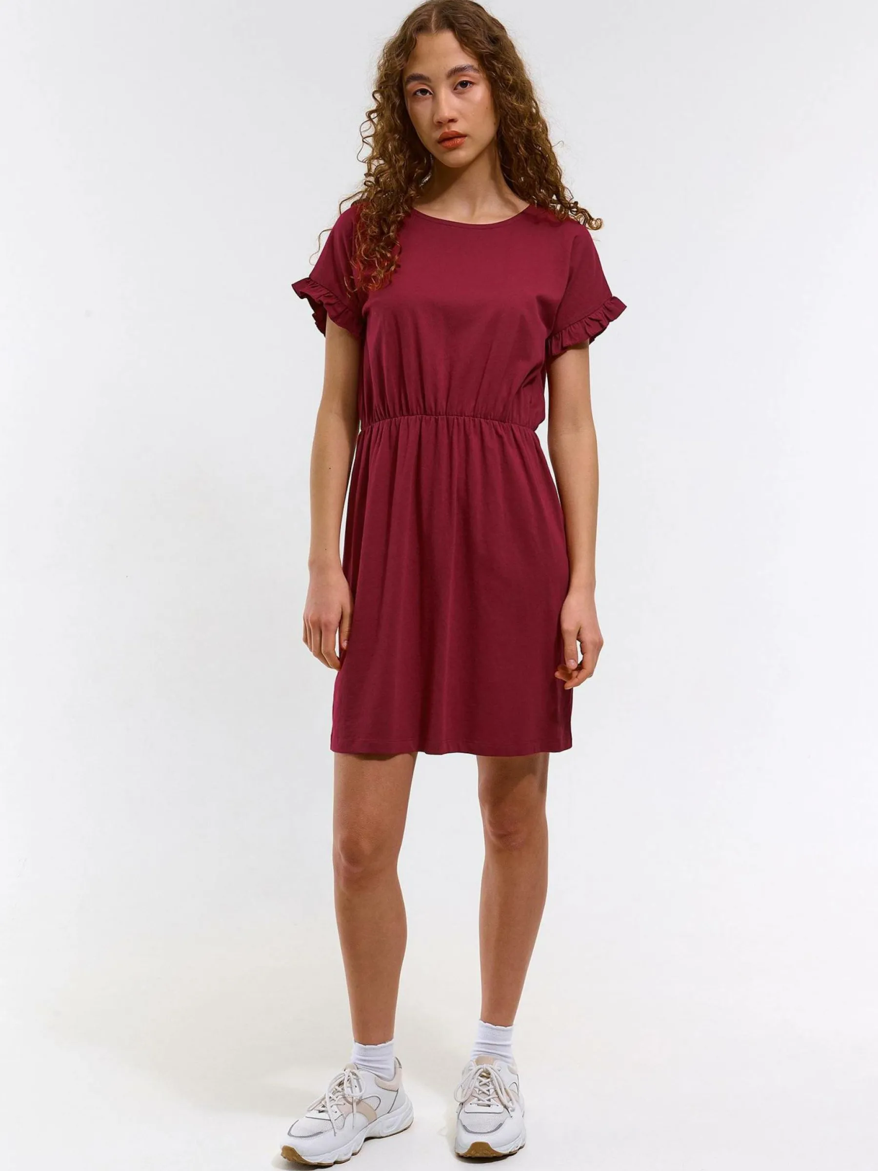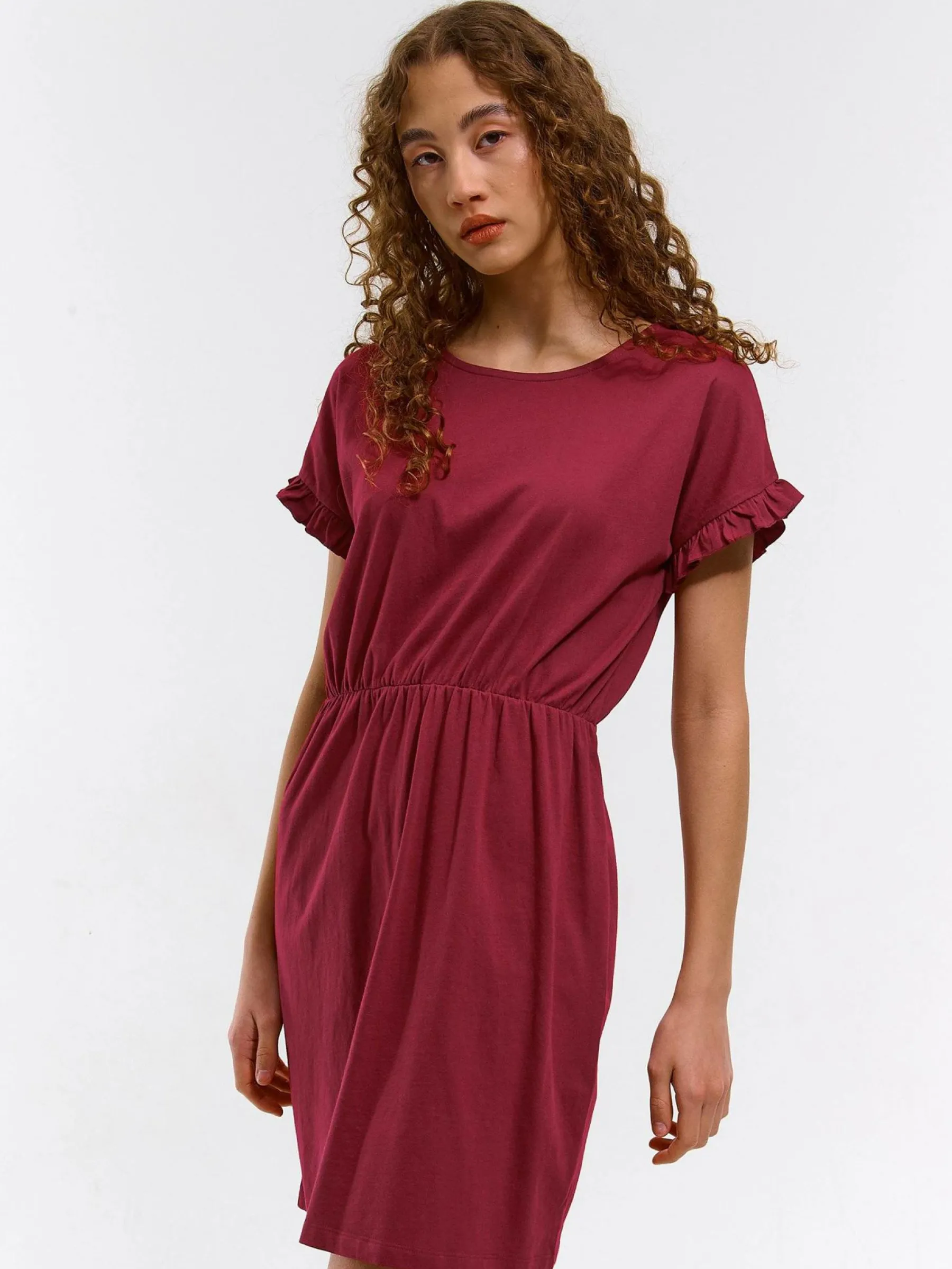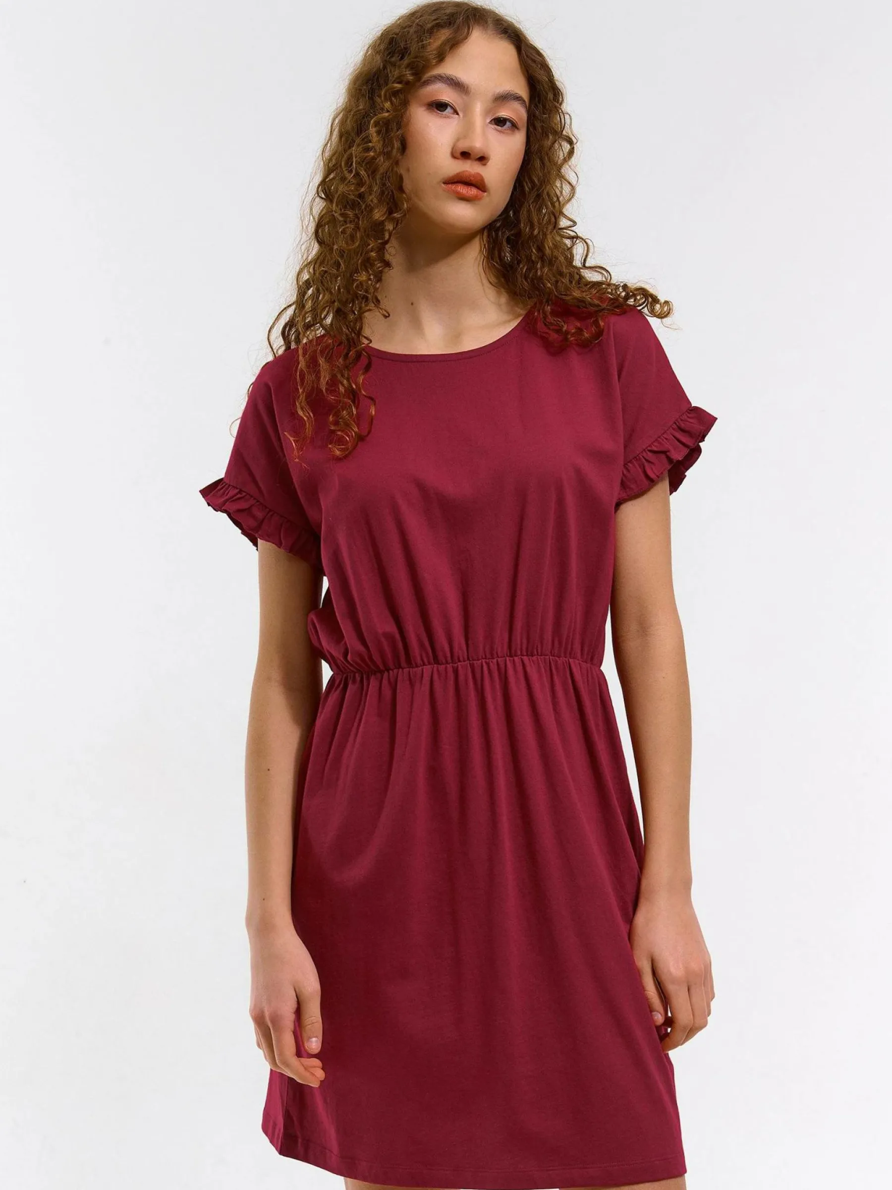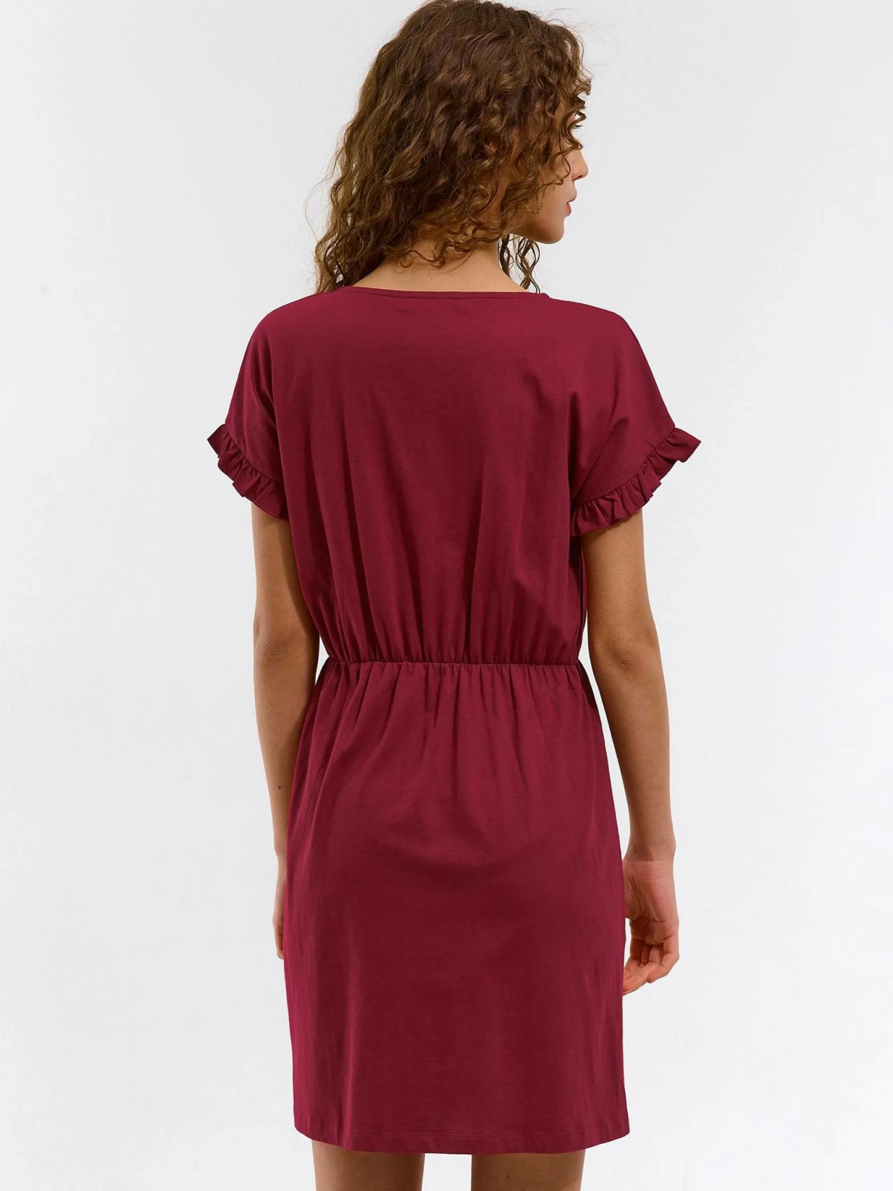 Kolor: burgundyKrój: asyTyp: sukienkaRekaw: krótki rękawDługość: miniPattern style: pojedynczy kolorDetal: nad gł…