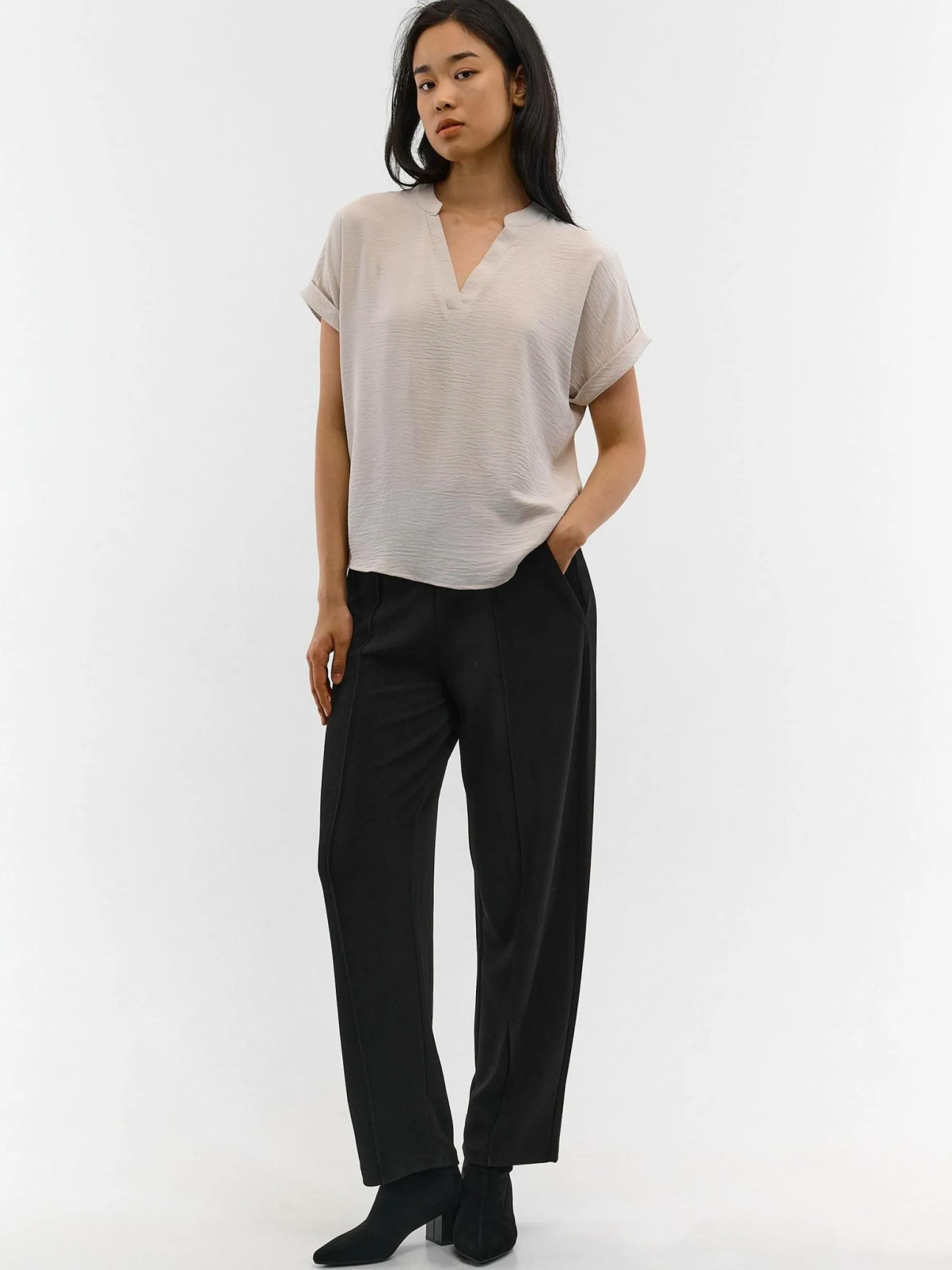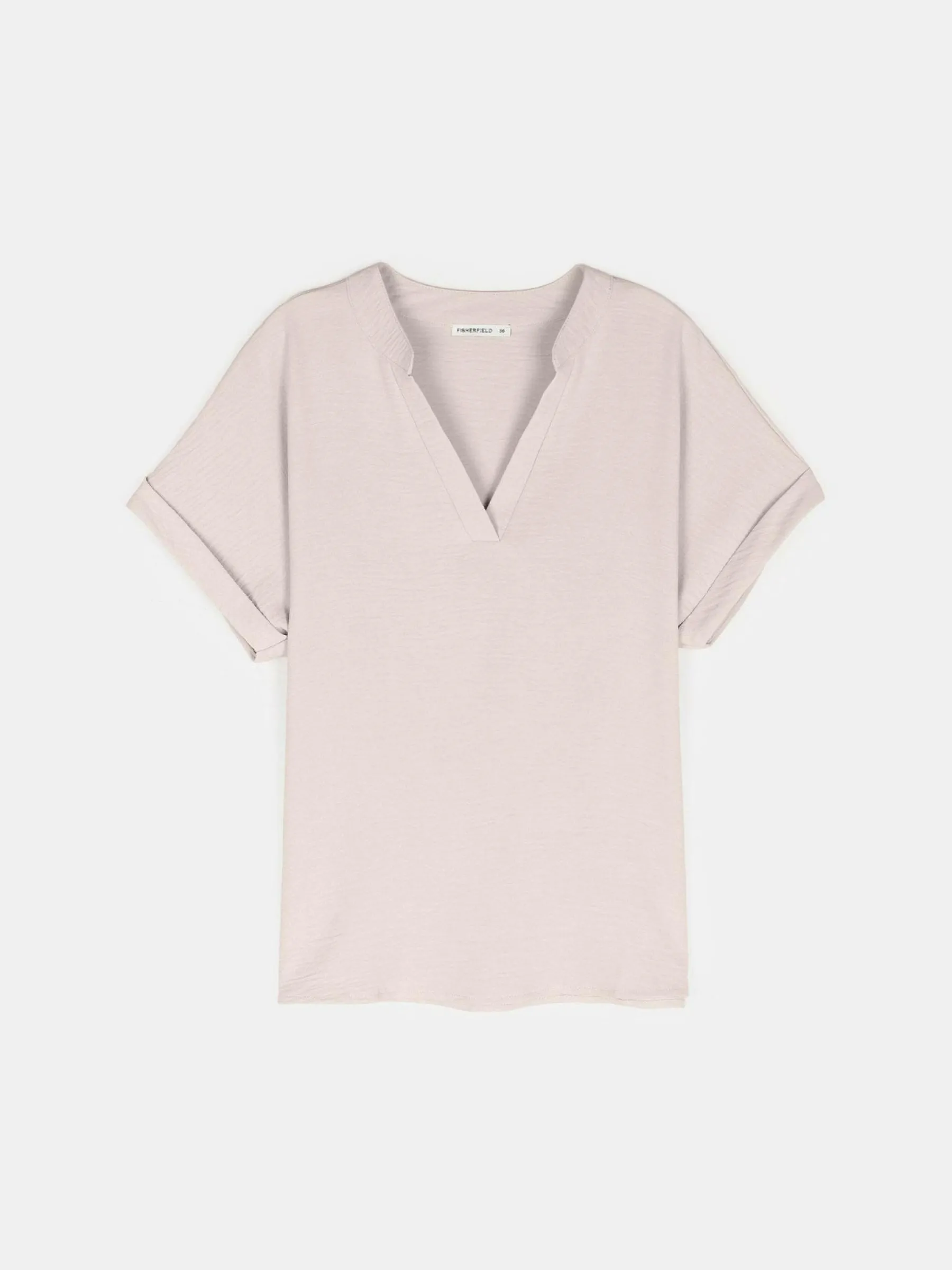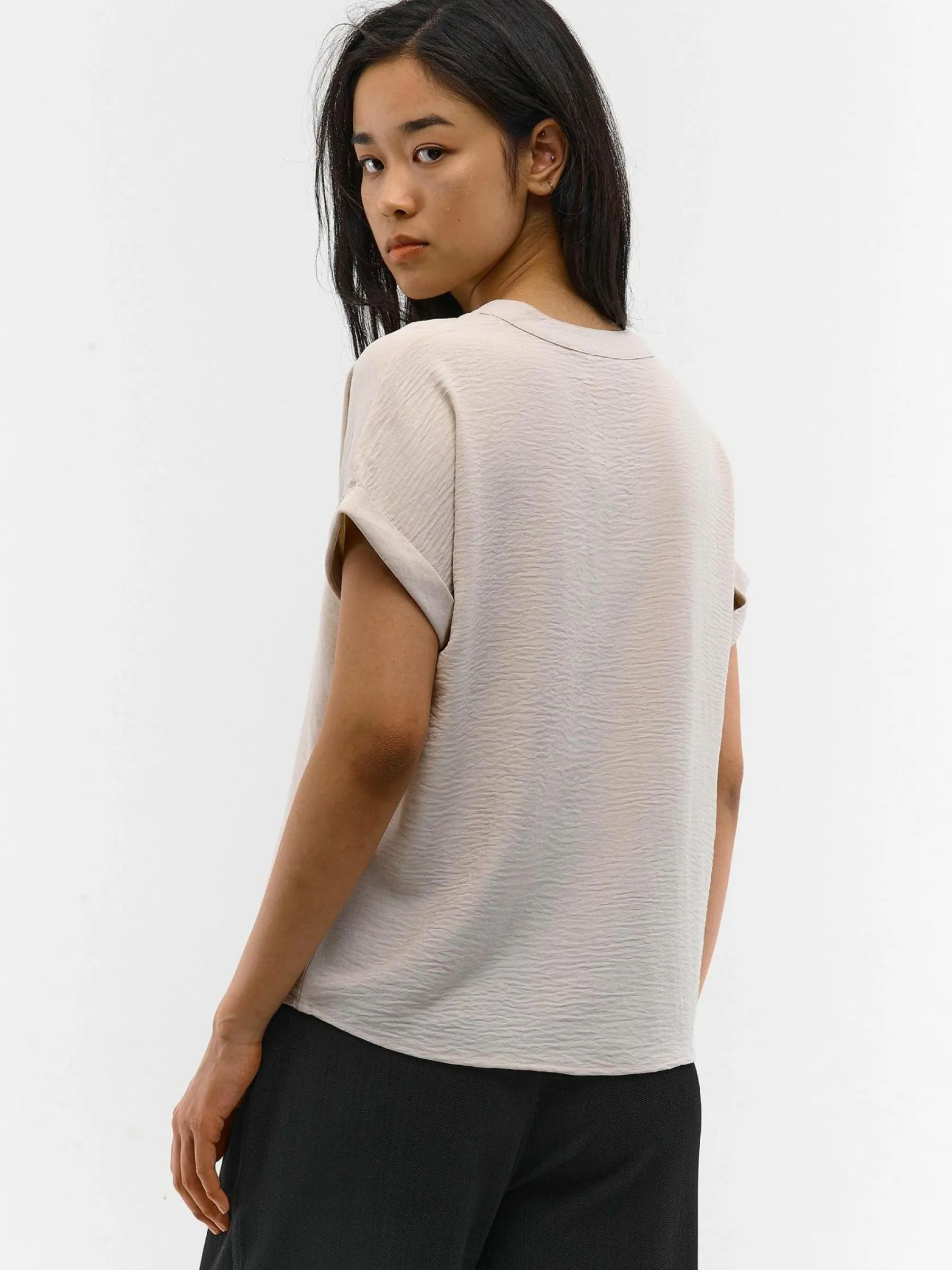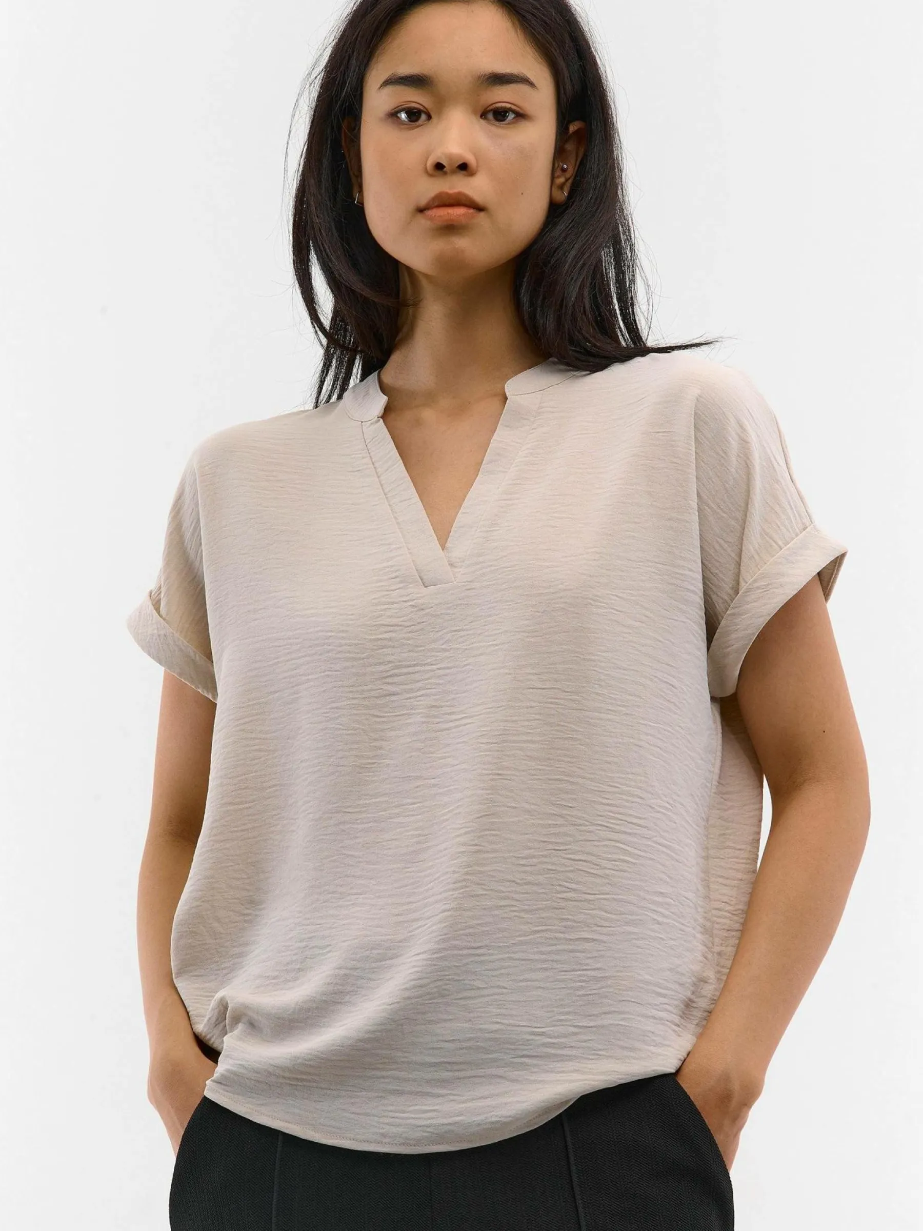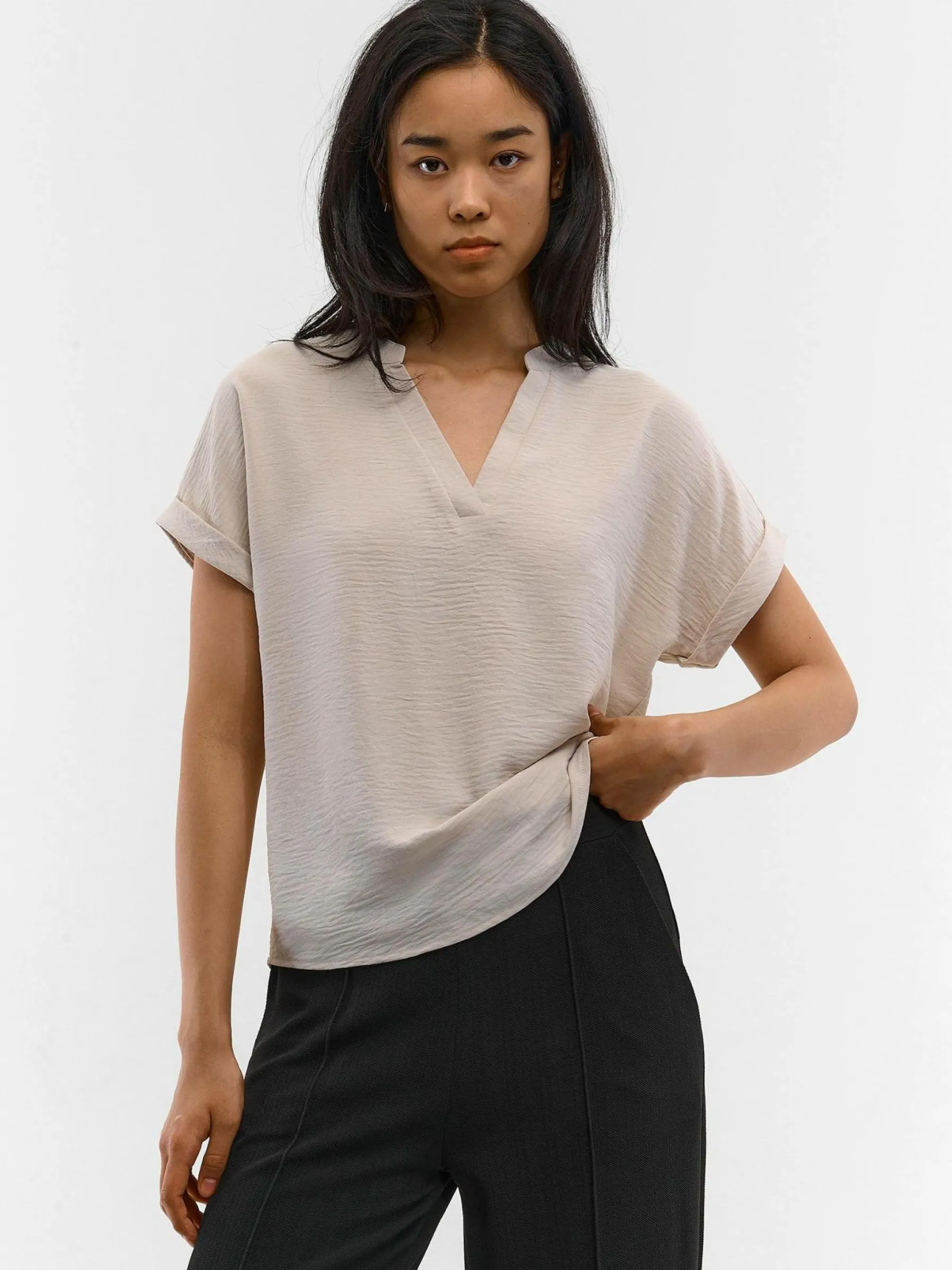 Kolor: beżowyKrój: regularTyp: bluzkaRekaw: krótki rękawDługość: krótkiPattern style: pojedynczy kolorDetal: v-n…