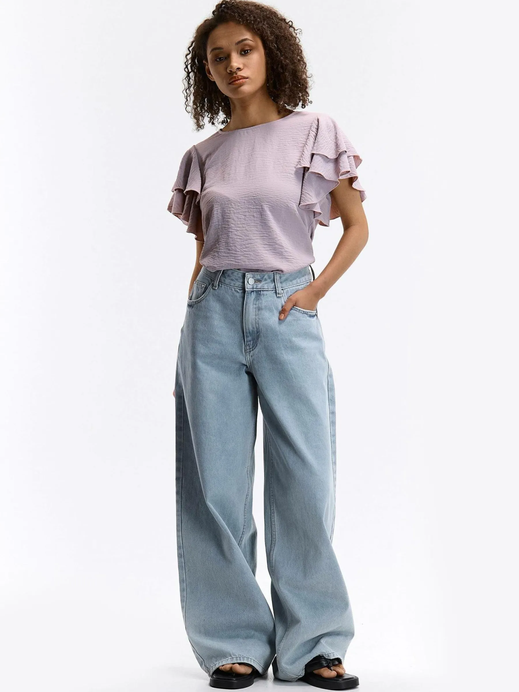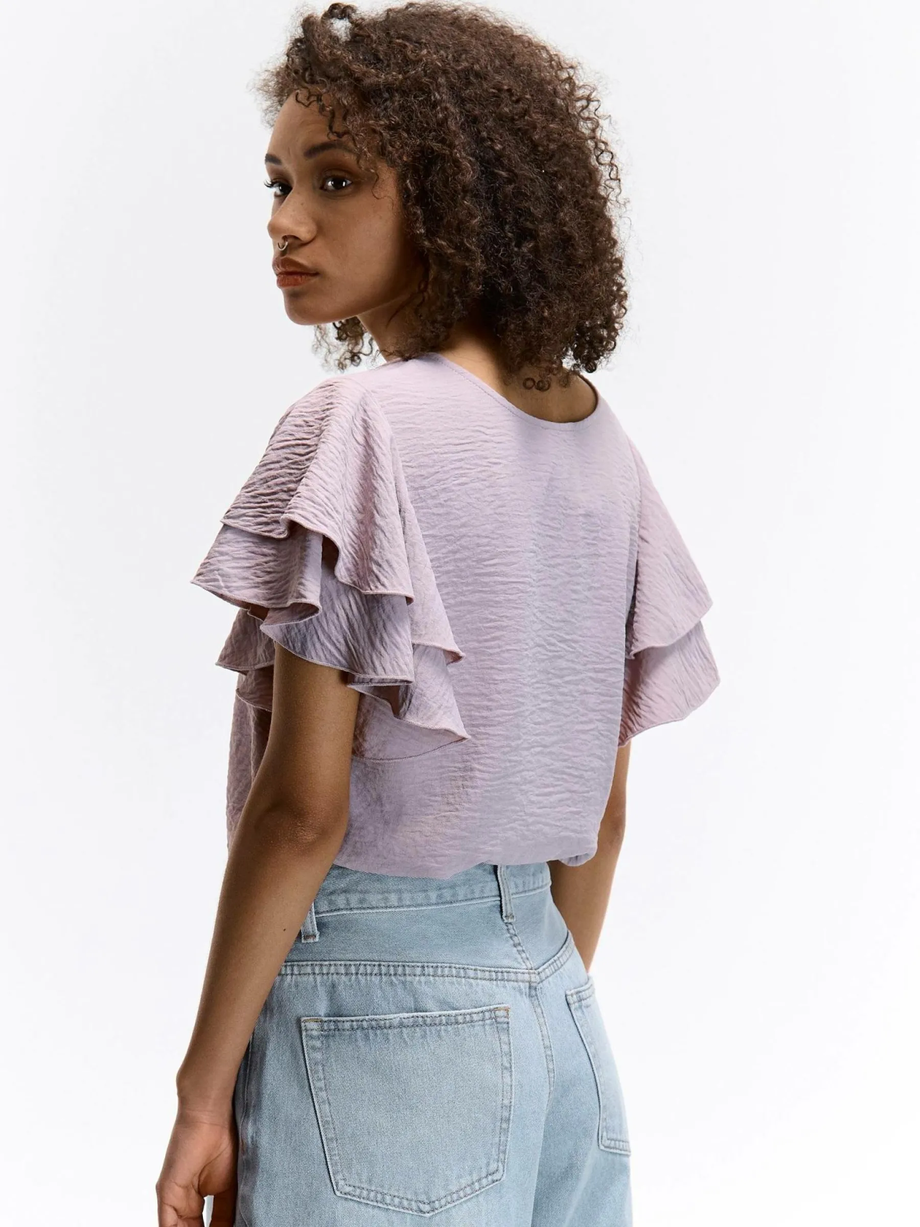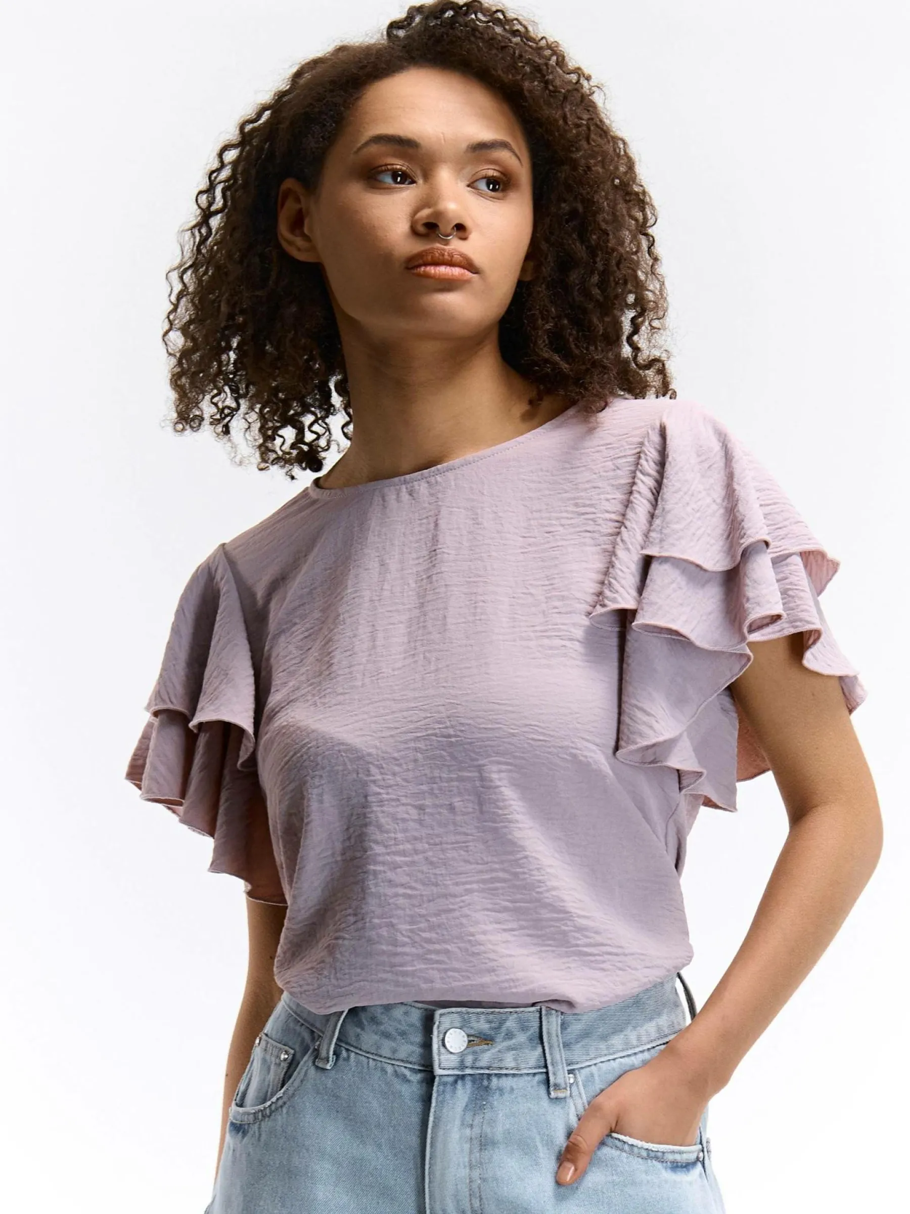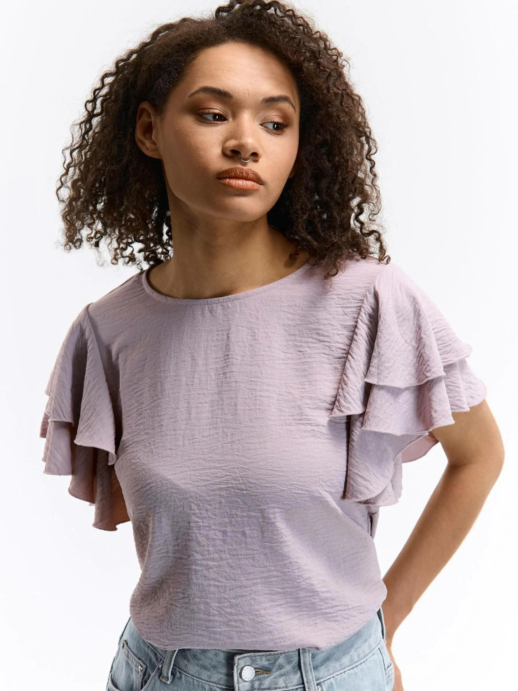 Kolor: purpurowyKrój: z falbanąTyp: topRekaw: krótki rękawDługość: krótkiPattern style: pojedynczy kolorDetal: n…