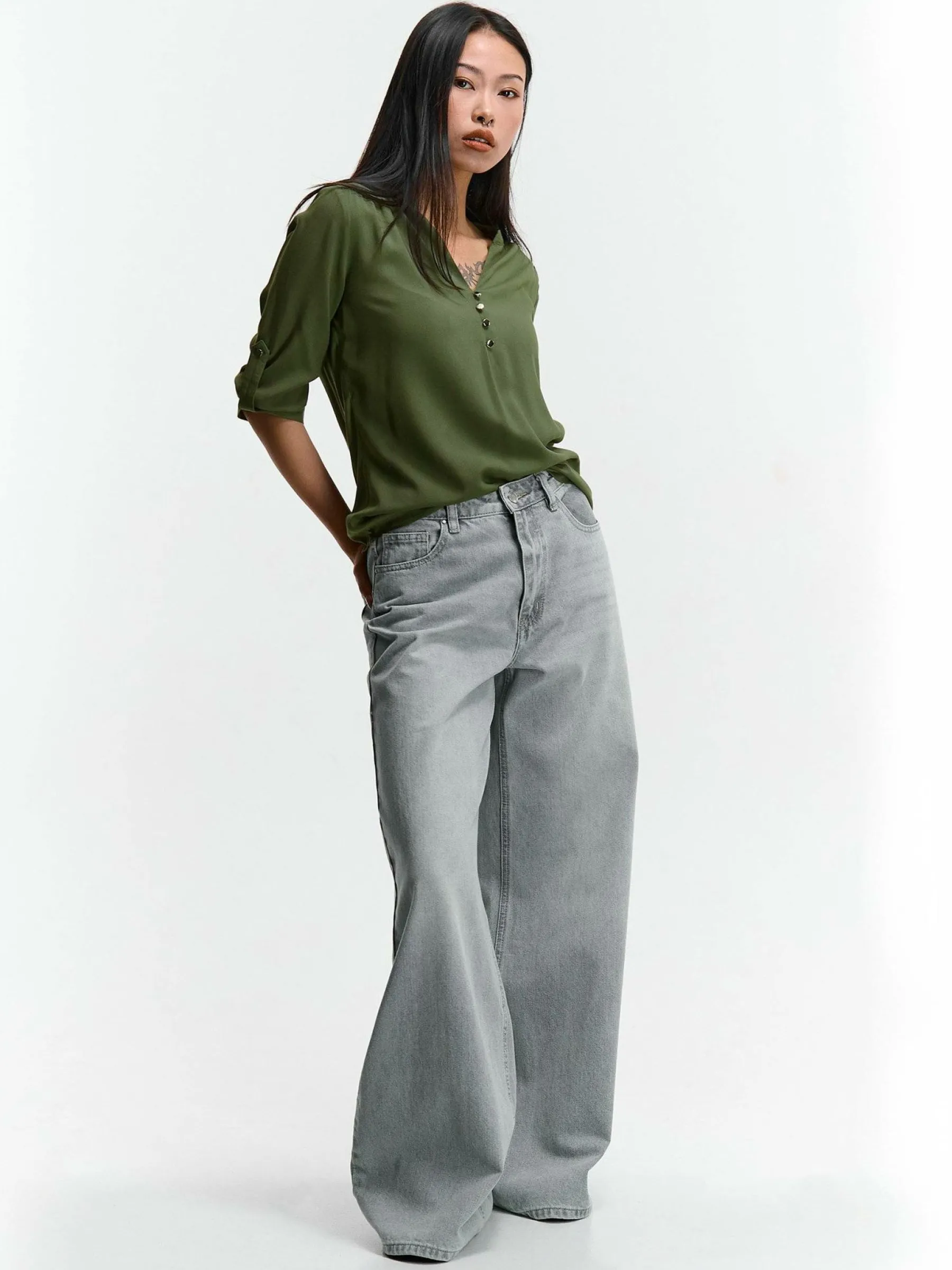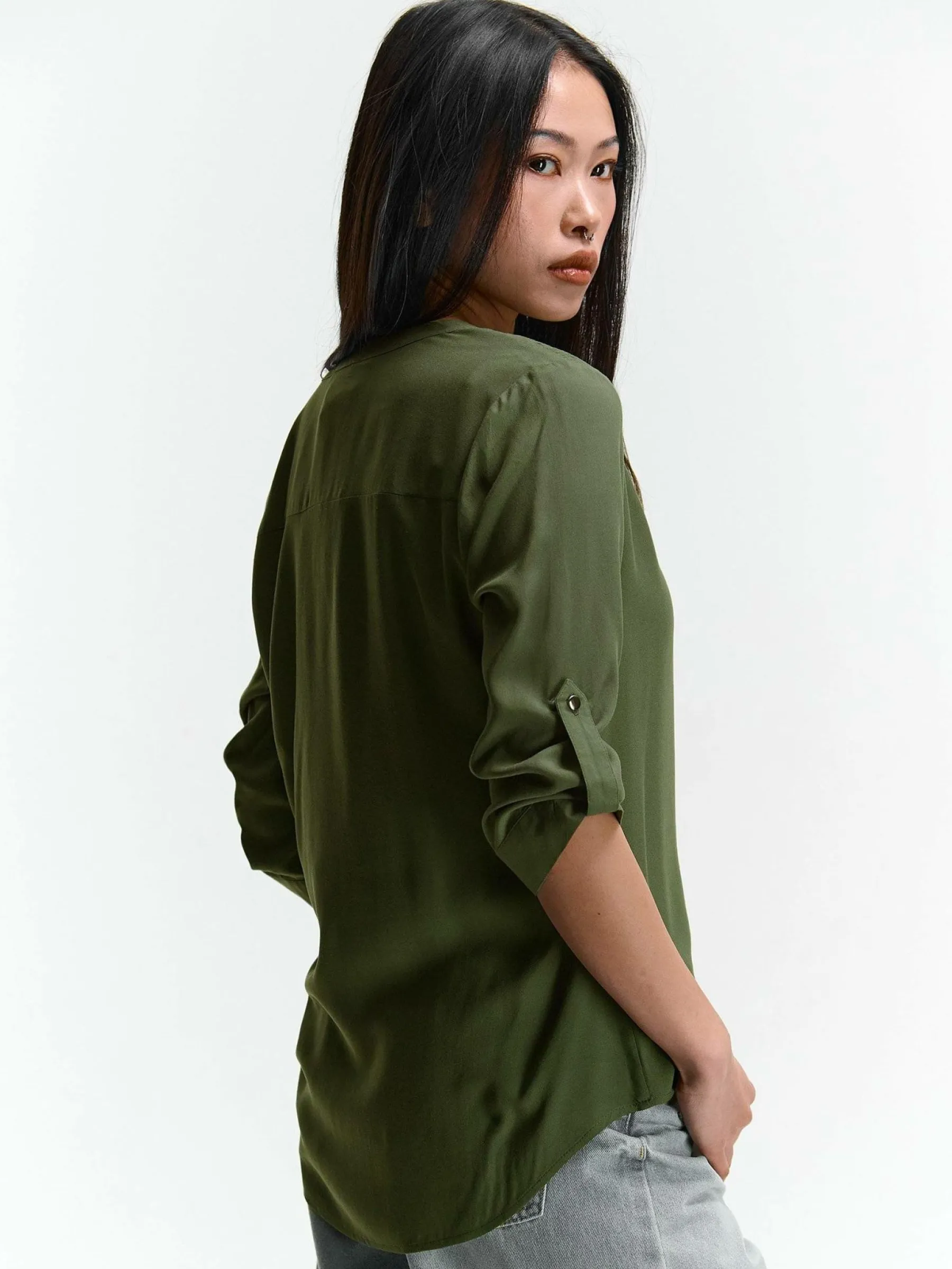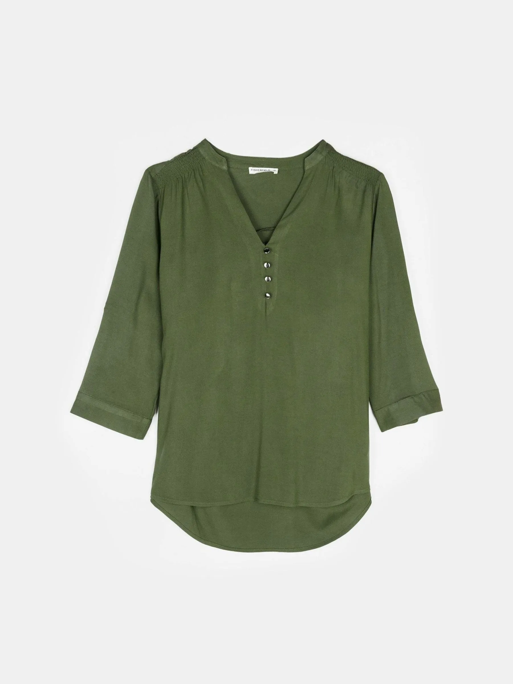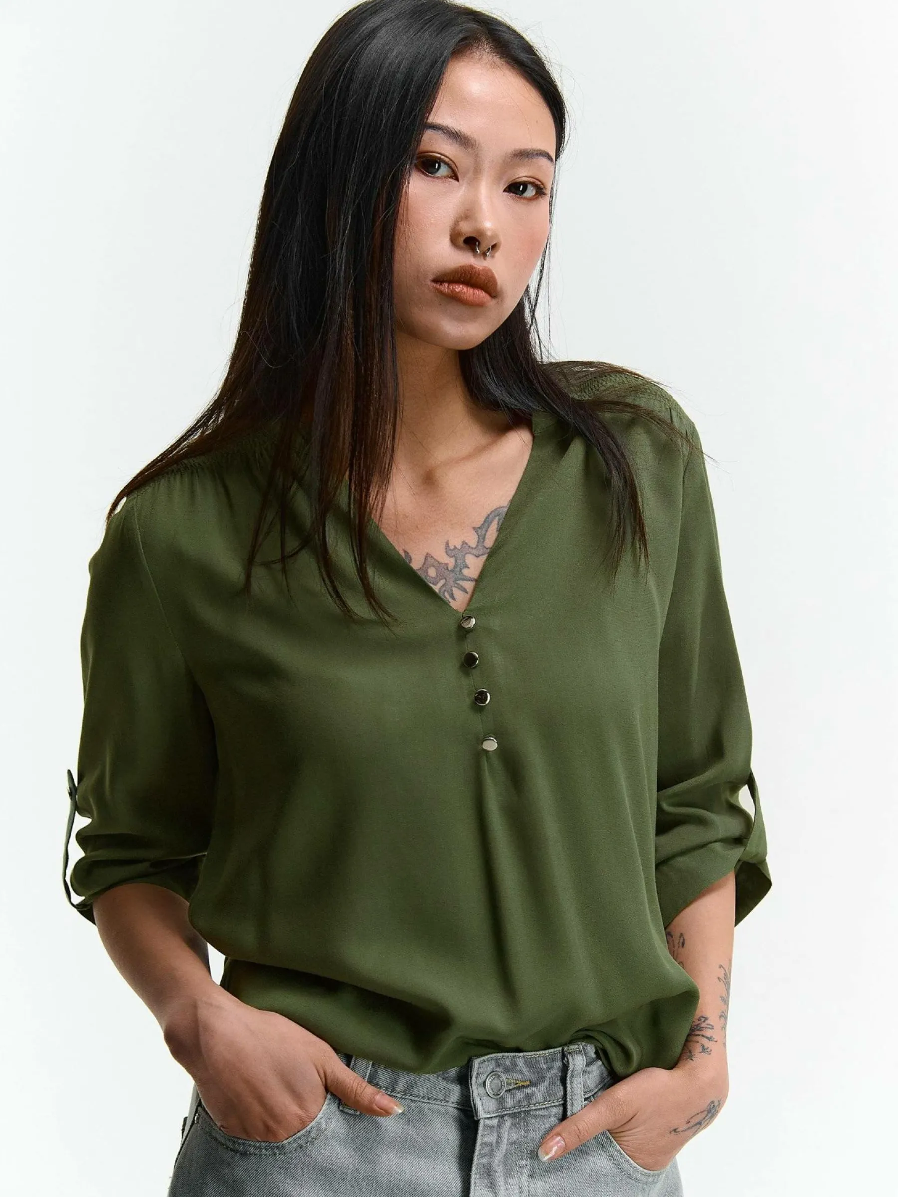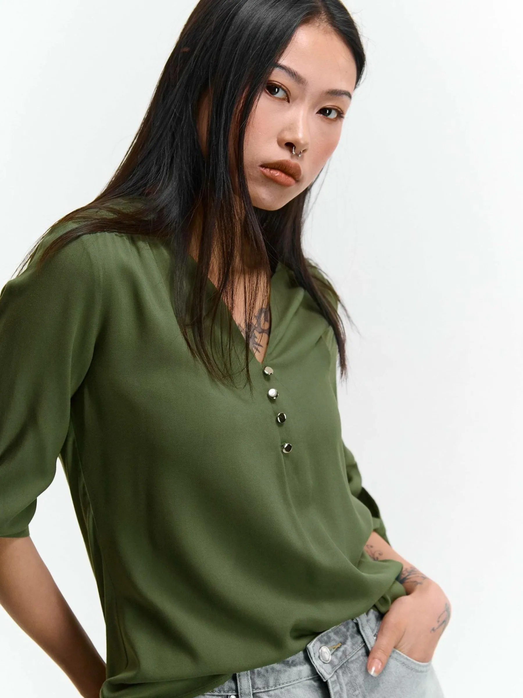 Kolor: zielonyKrój: asymetryczne, regularTyp: bluzkaRekaw: rękaw 3/4Długość: krótkiPattern style: pojedynczy kolor…