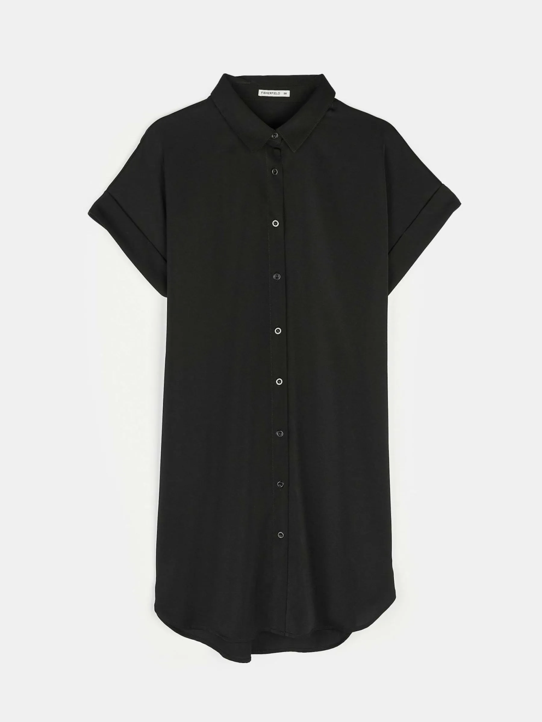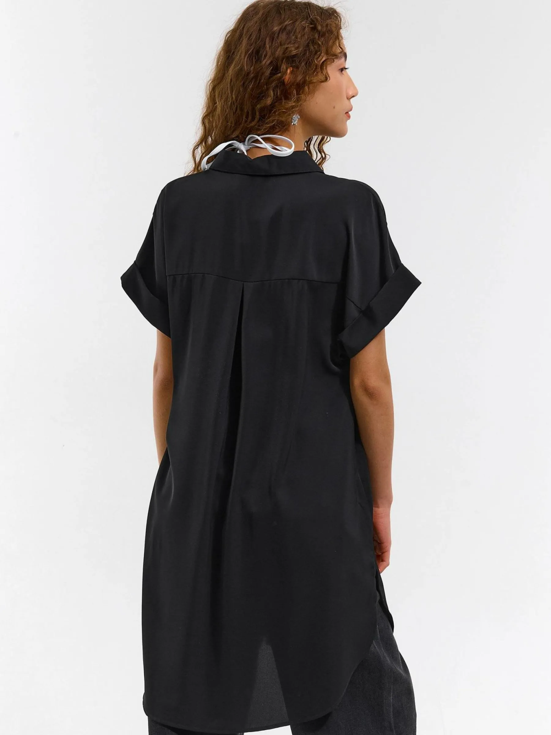 Kolor: czarnyKrój: asymetryczne, koszuloweTyp: bluzkaRekaw: krótki rękawDługość: dlugiePattern style: pojedynczy k…