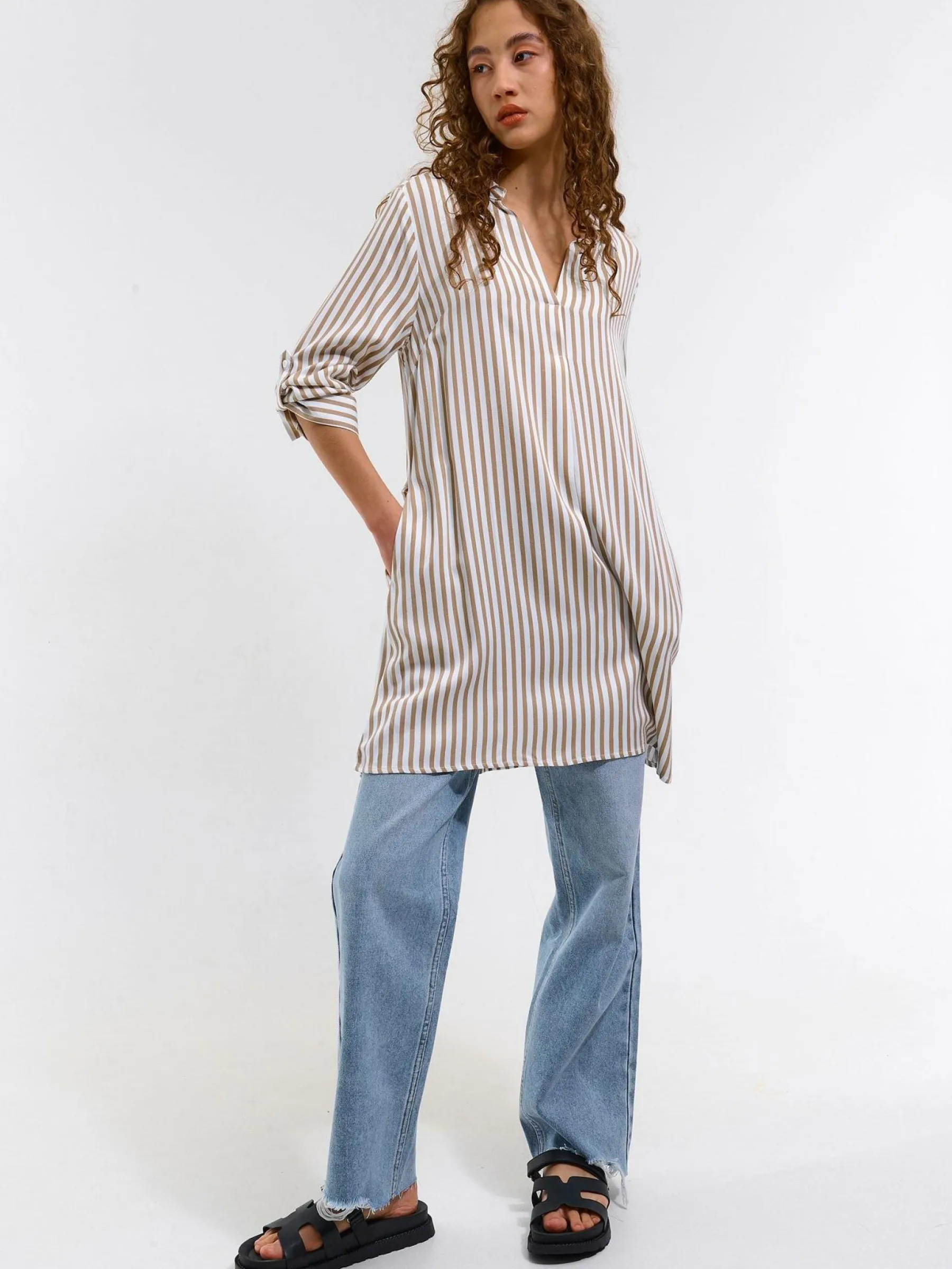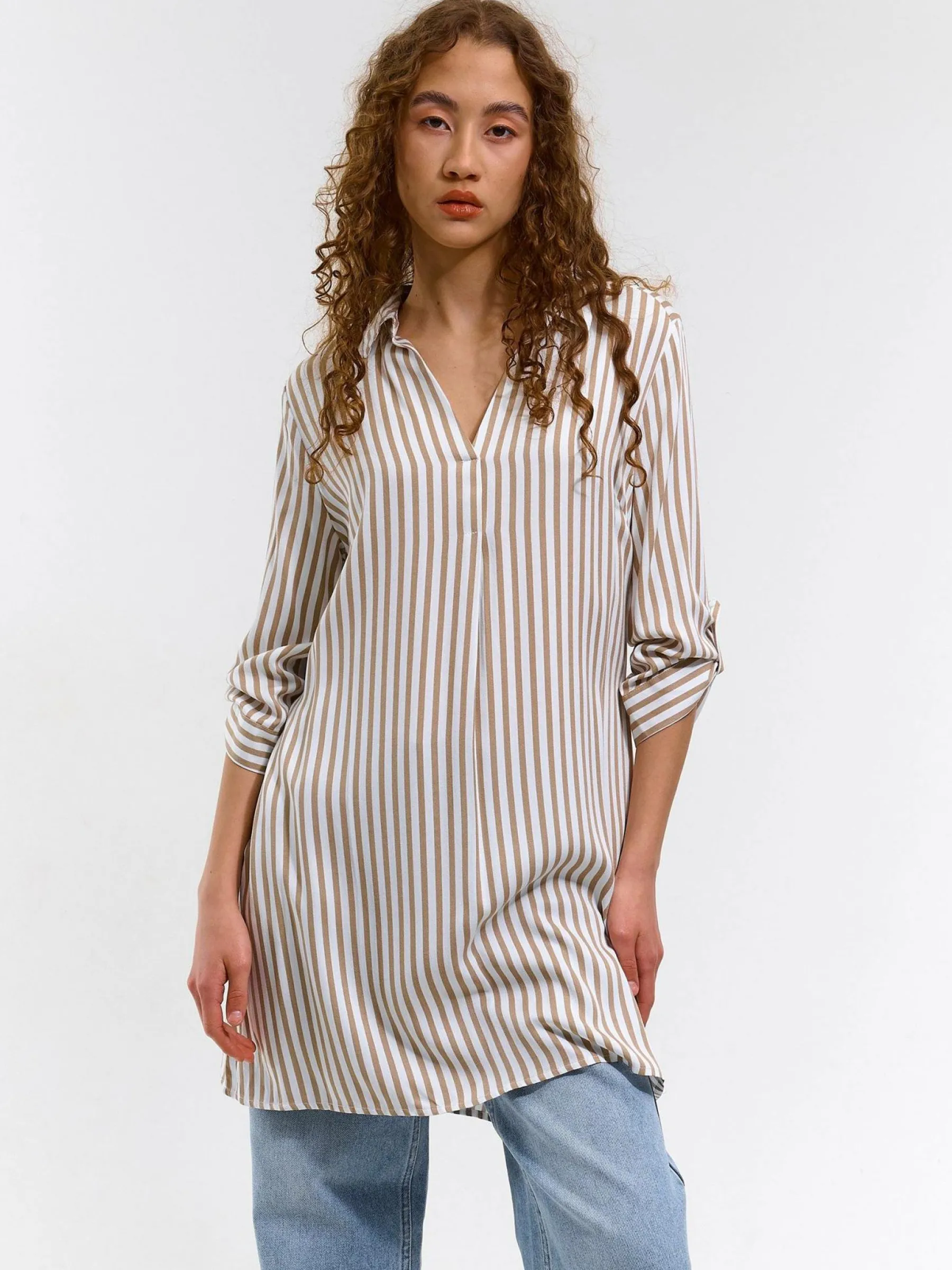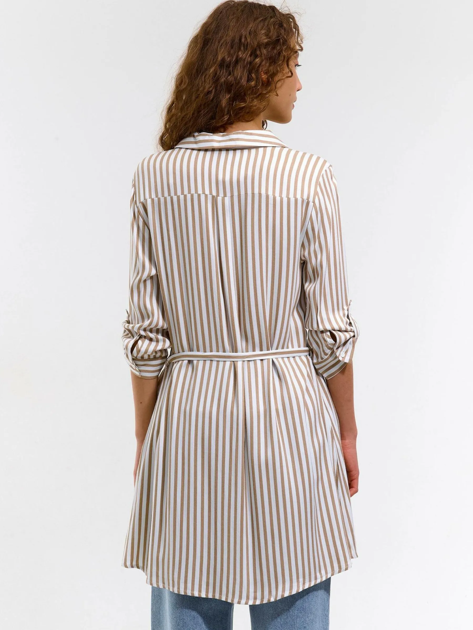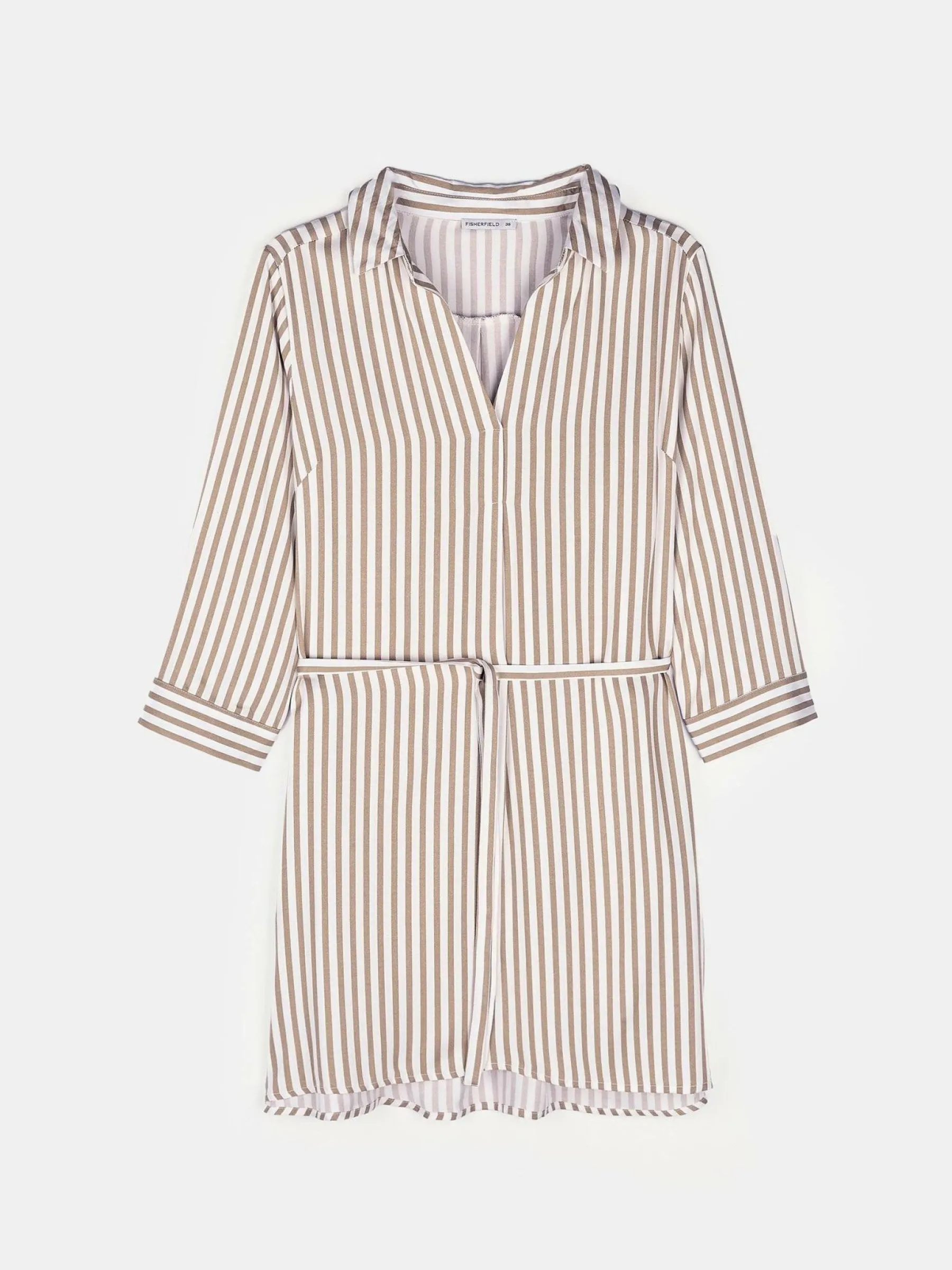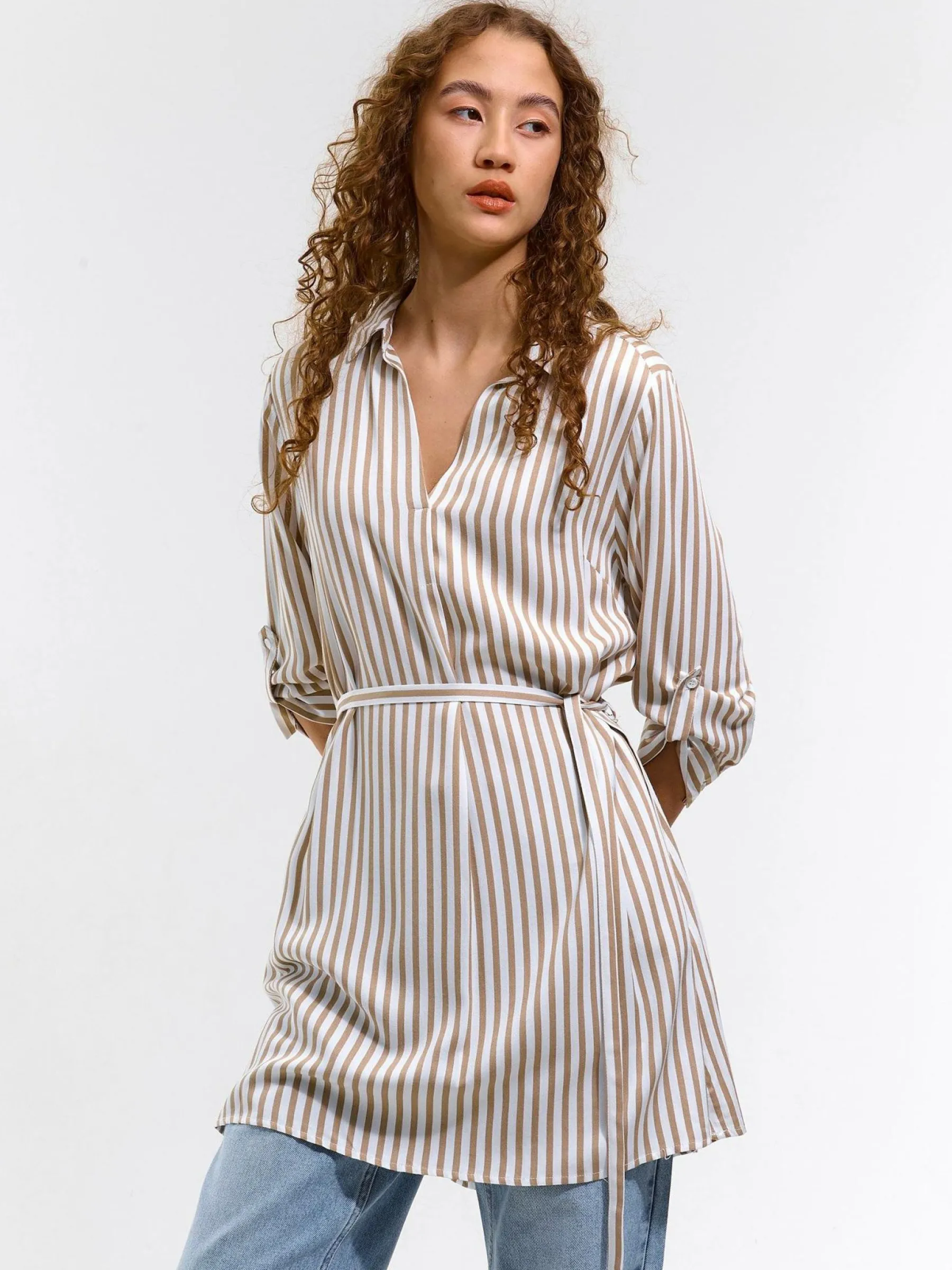 Kolor: białyKrój: regularTyp: bluzkaRekaw: rękaw 3/4Długość: krótkiPattern style: w prążkiDetal: z paskiemMater…