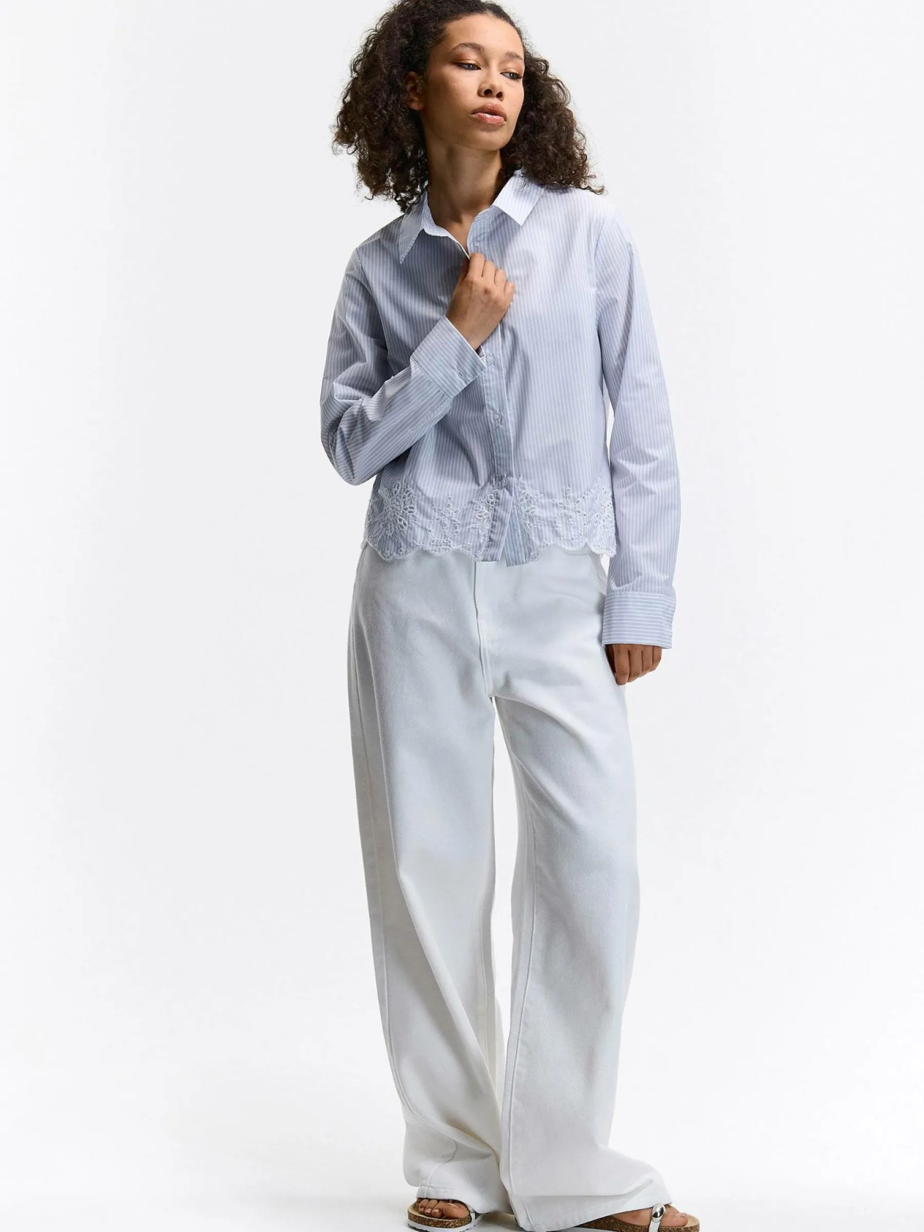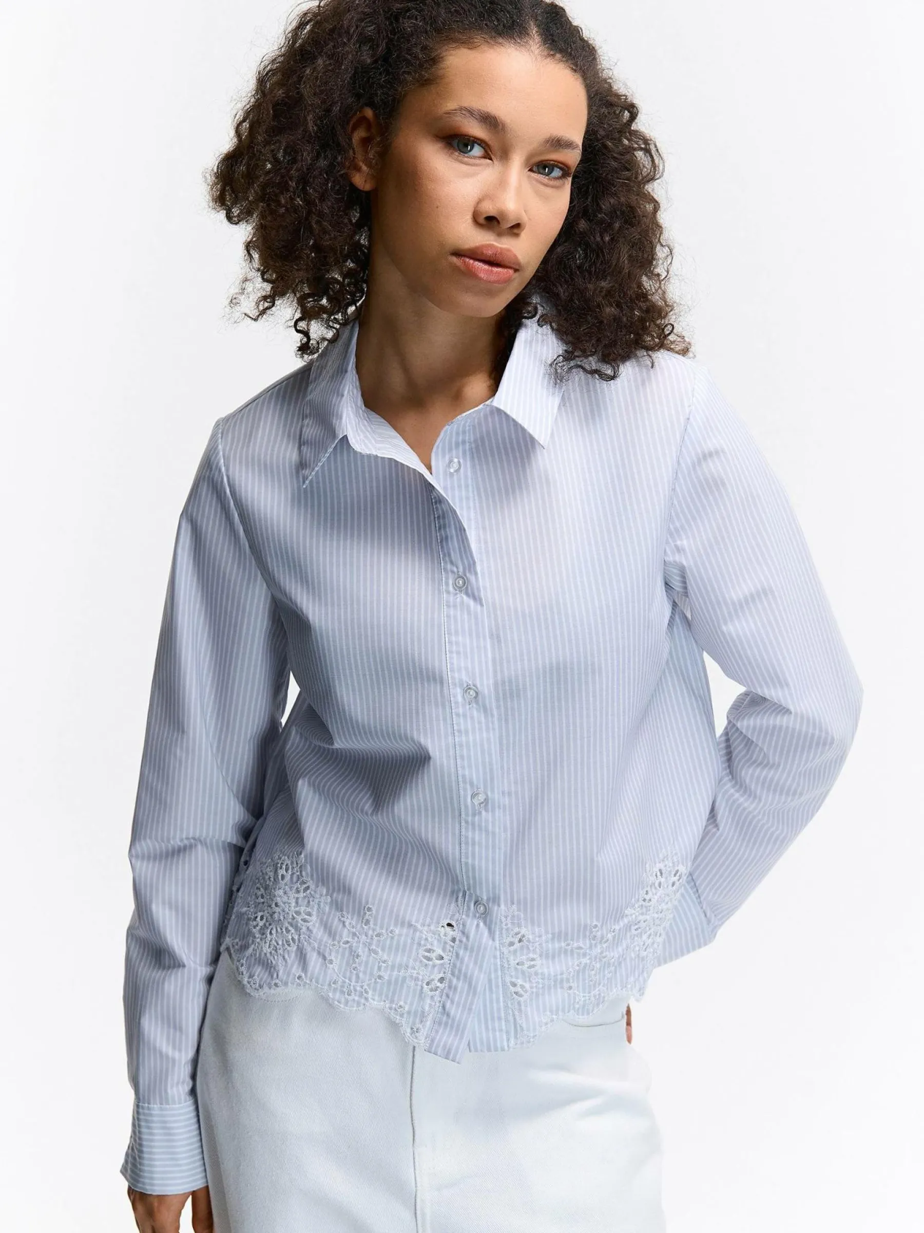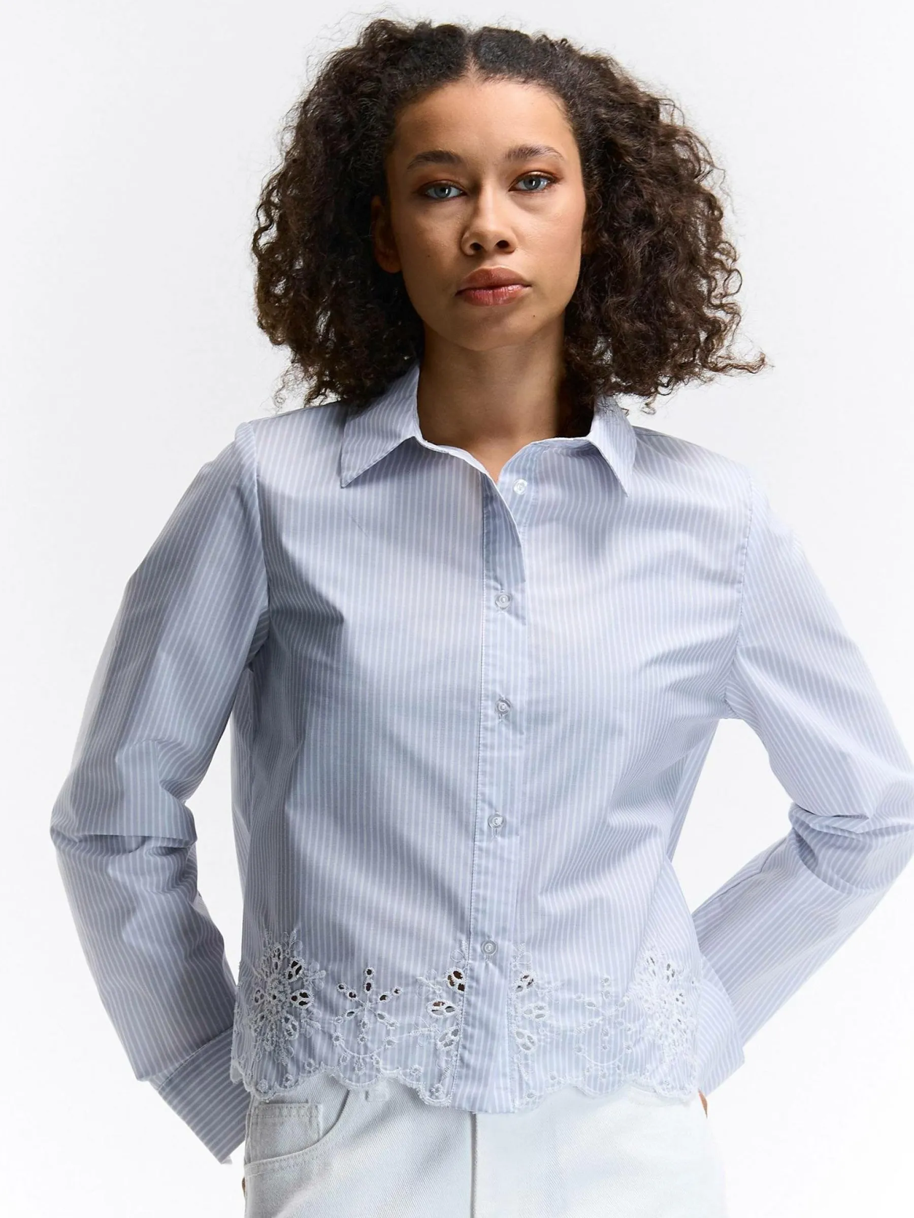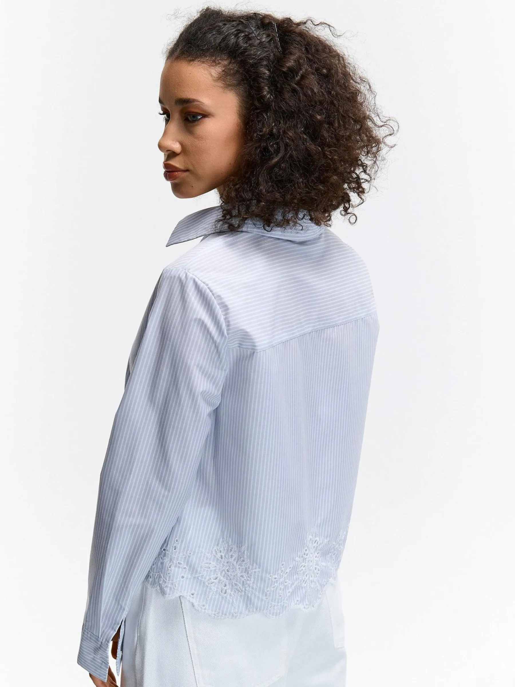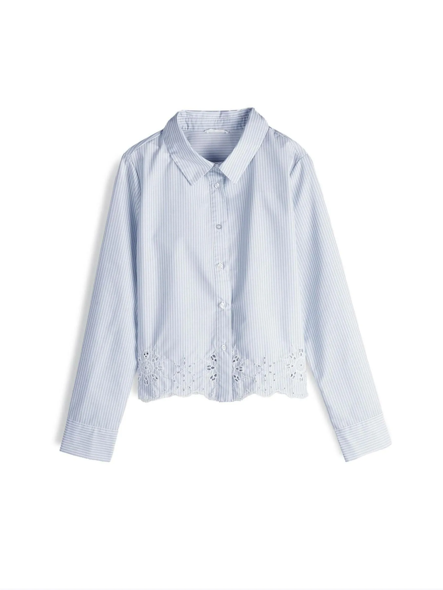 Kolor: niebieskiKrój: regularTyp: bluzkaRekaw: długi rękawDługość: krótkiPattern style: w prążkiDetal: na guzik…