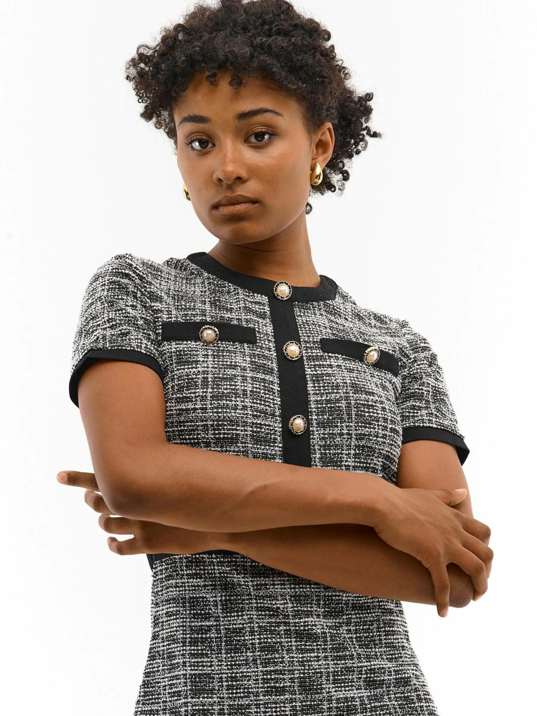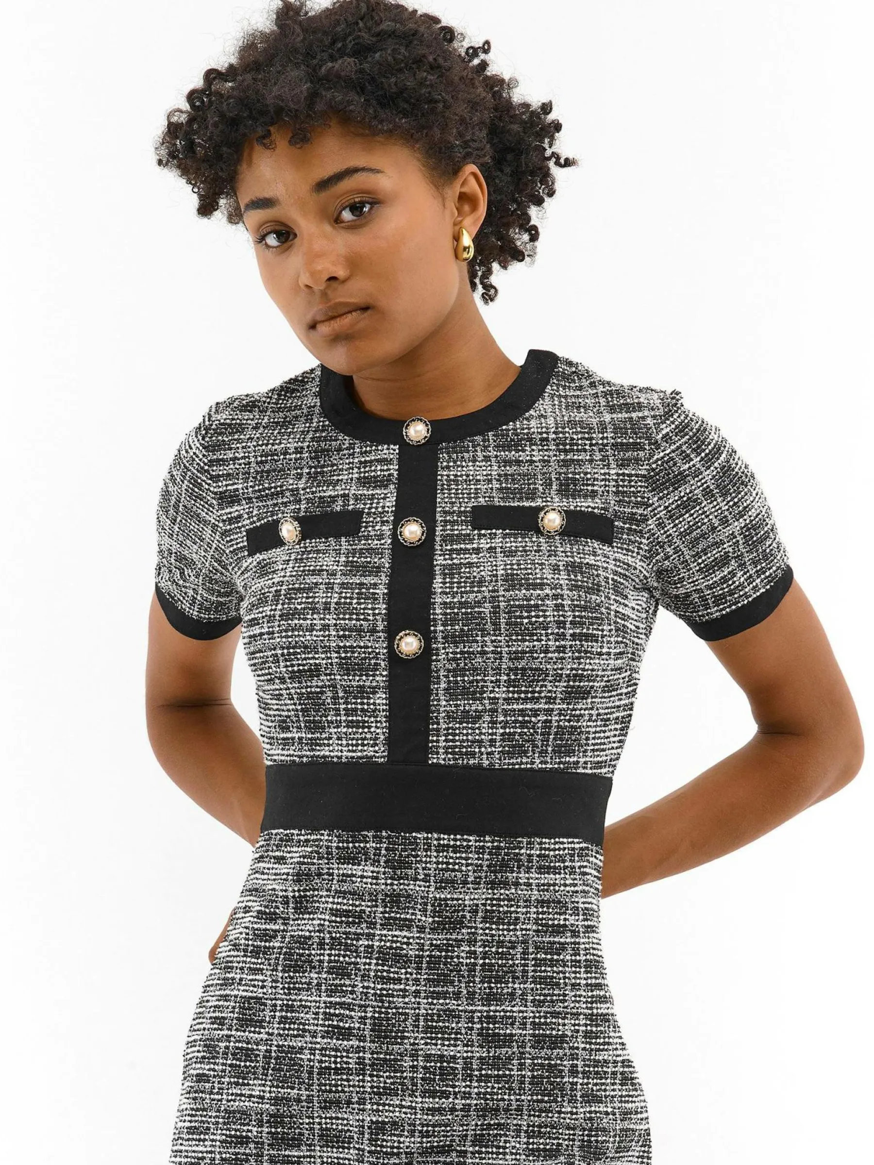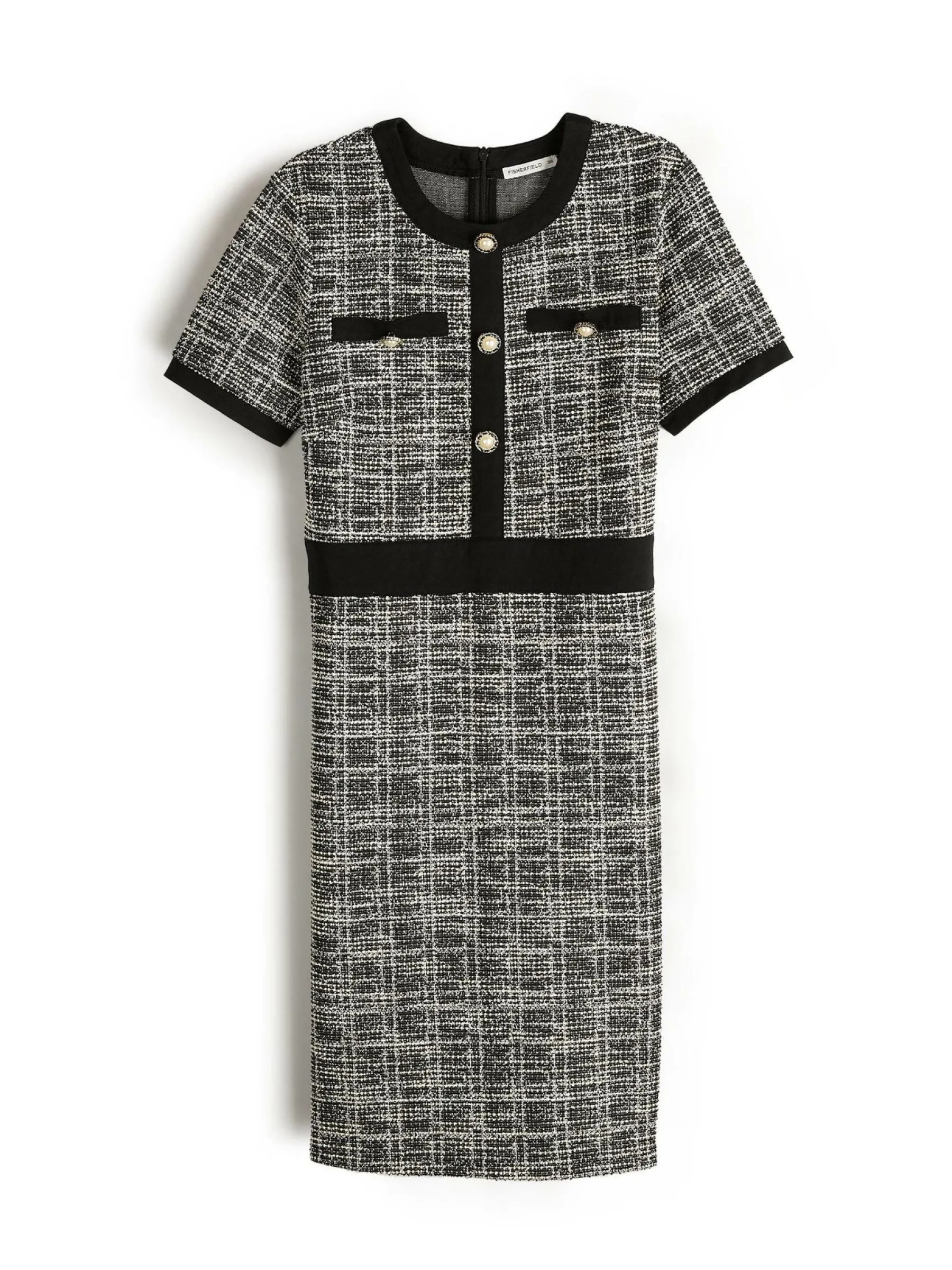 Kolor: czarnyKrój: ołówkoweTyp: sukienkaRekaw: krótki rękawDługość: miniPattern style: z włóknem metalicznymDe…