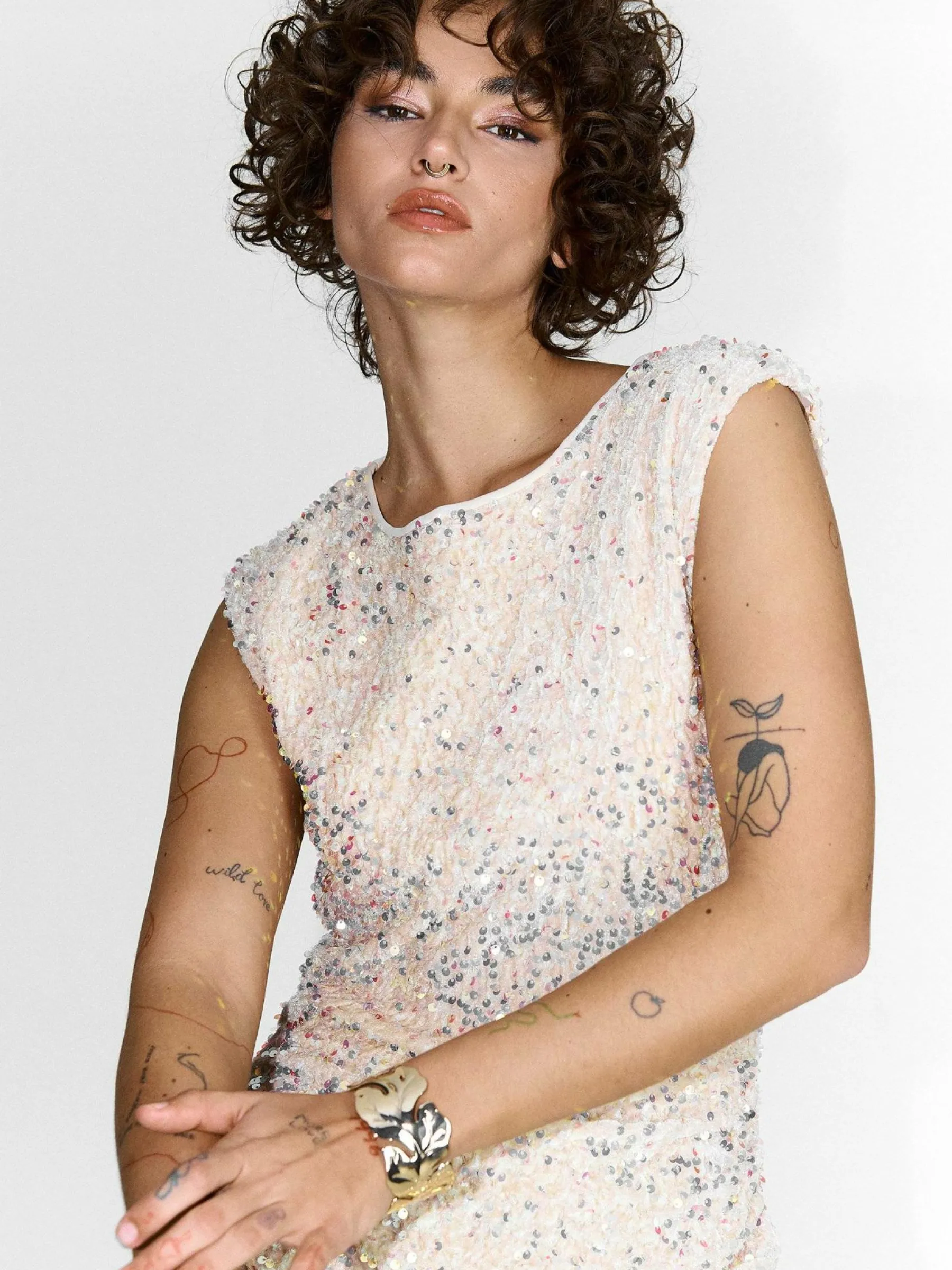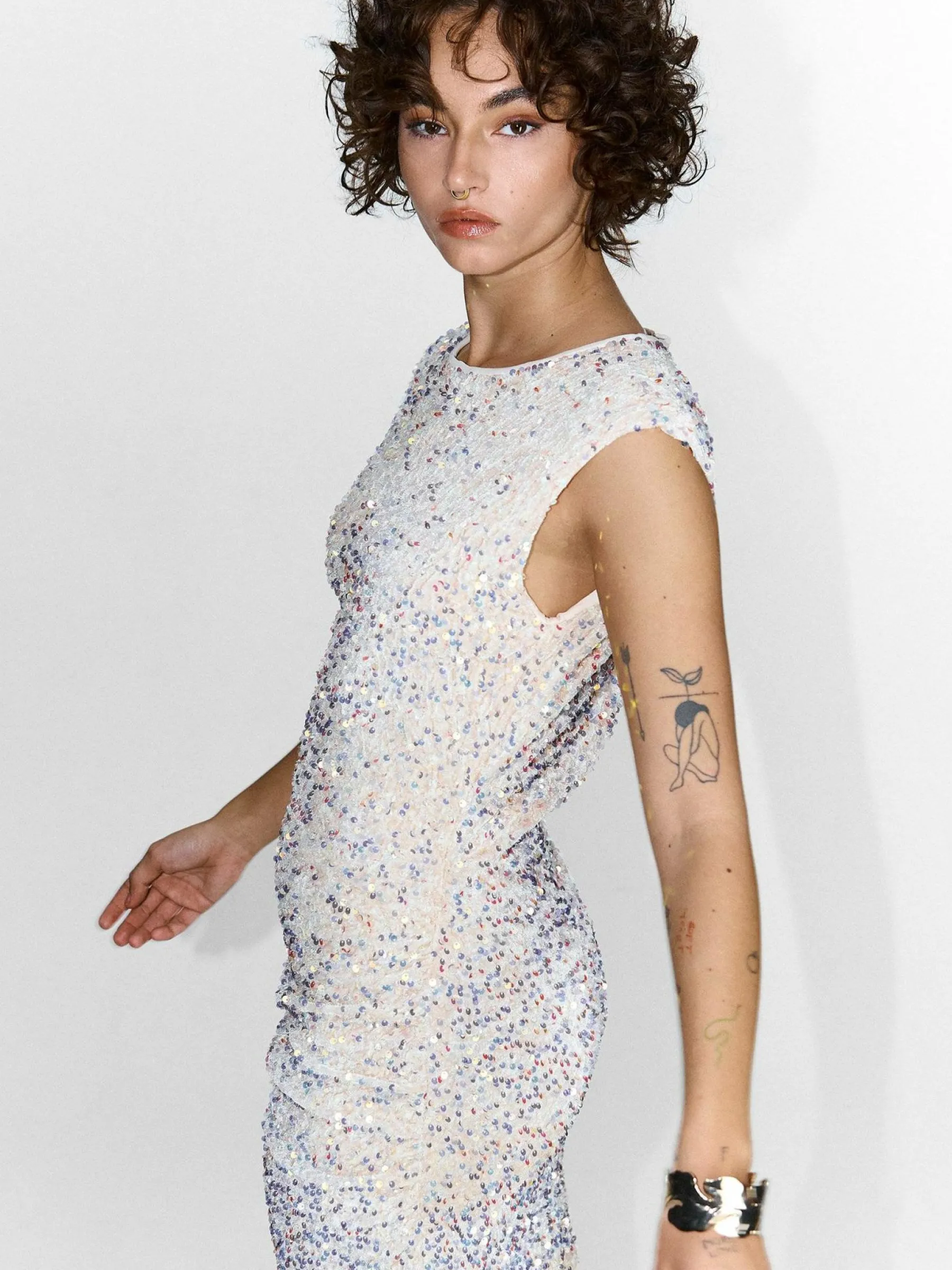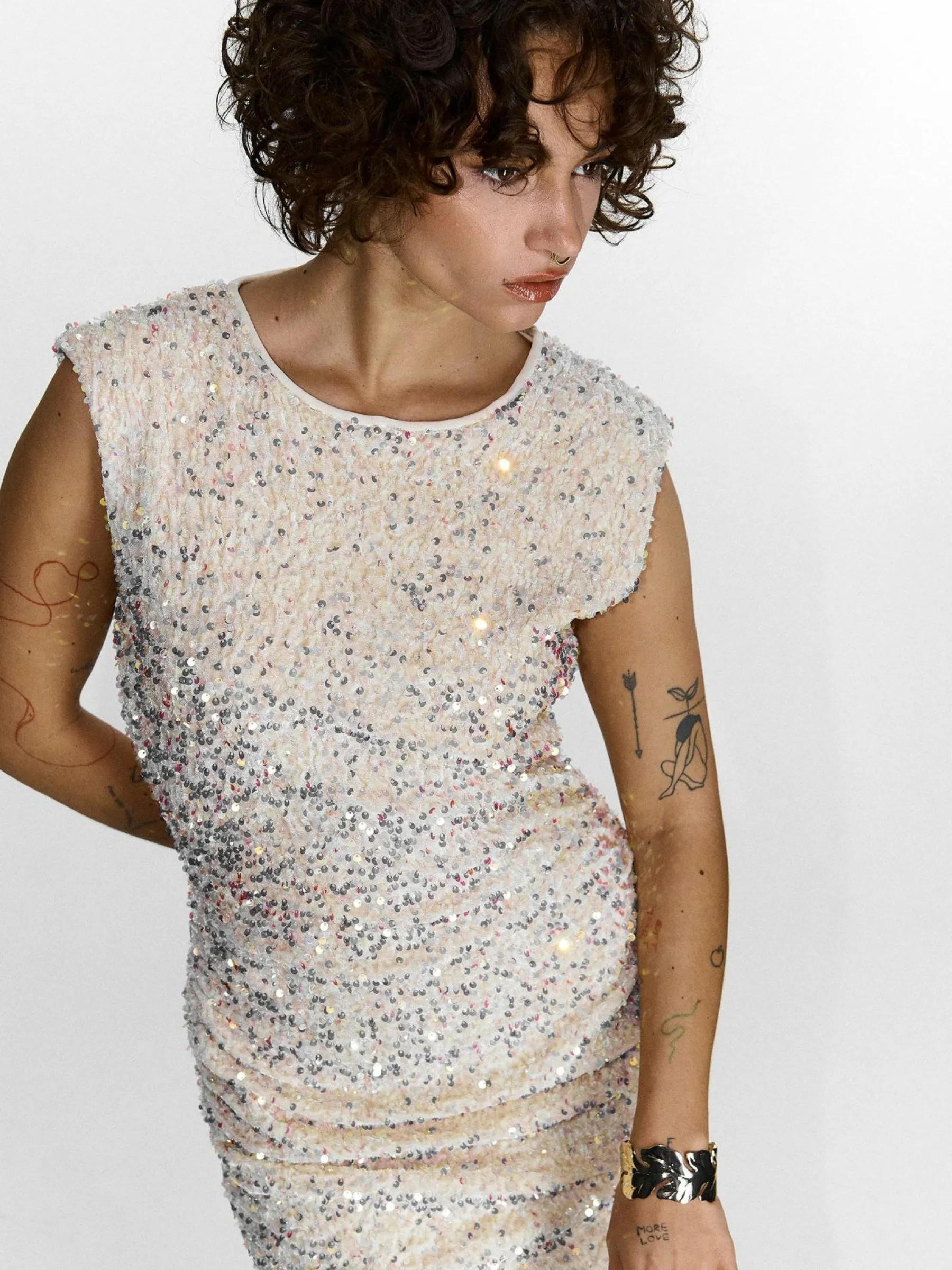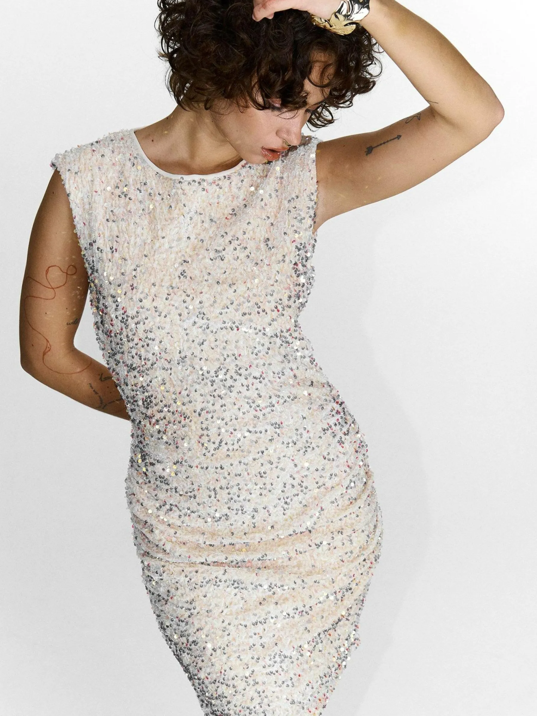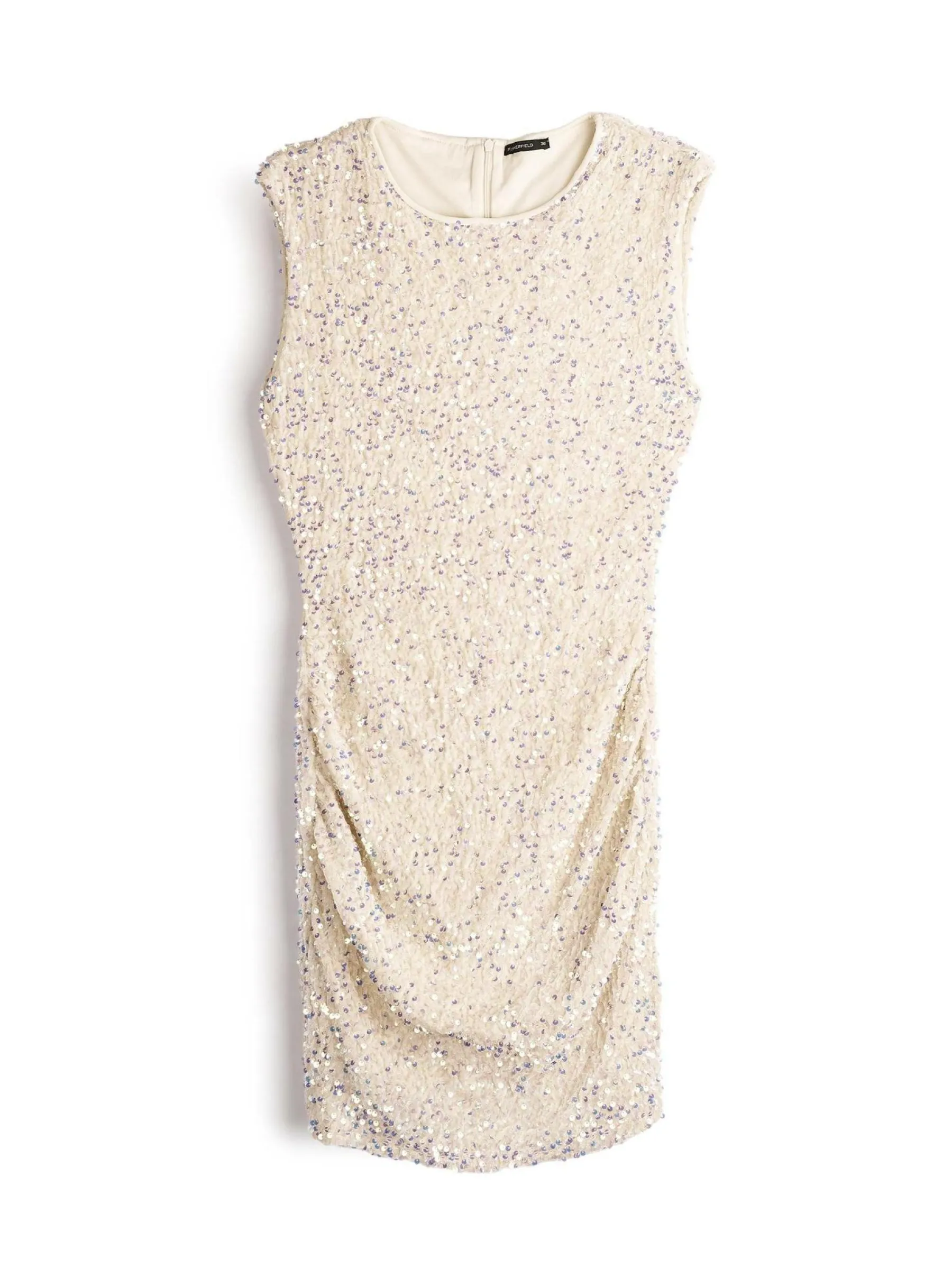 Kolor: beżowyKrój: z marszczeniemTyp: sukienkaRekaw: bez rękawówDługość: miniPattern style: pojedynczy kolor, z c…